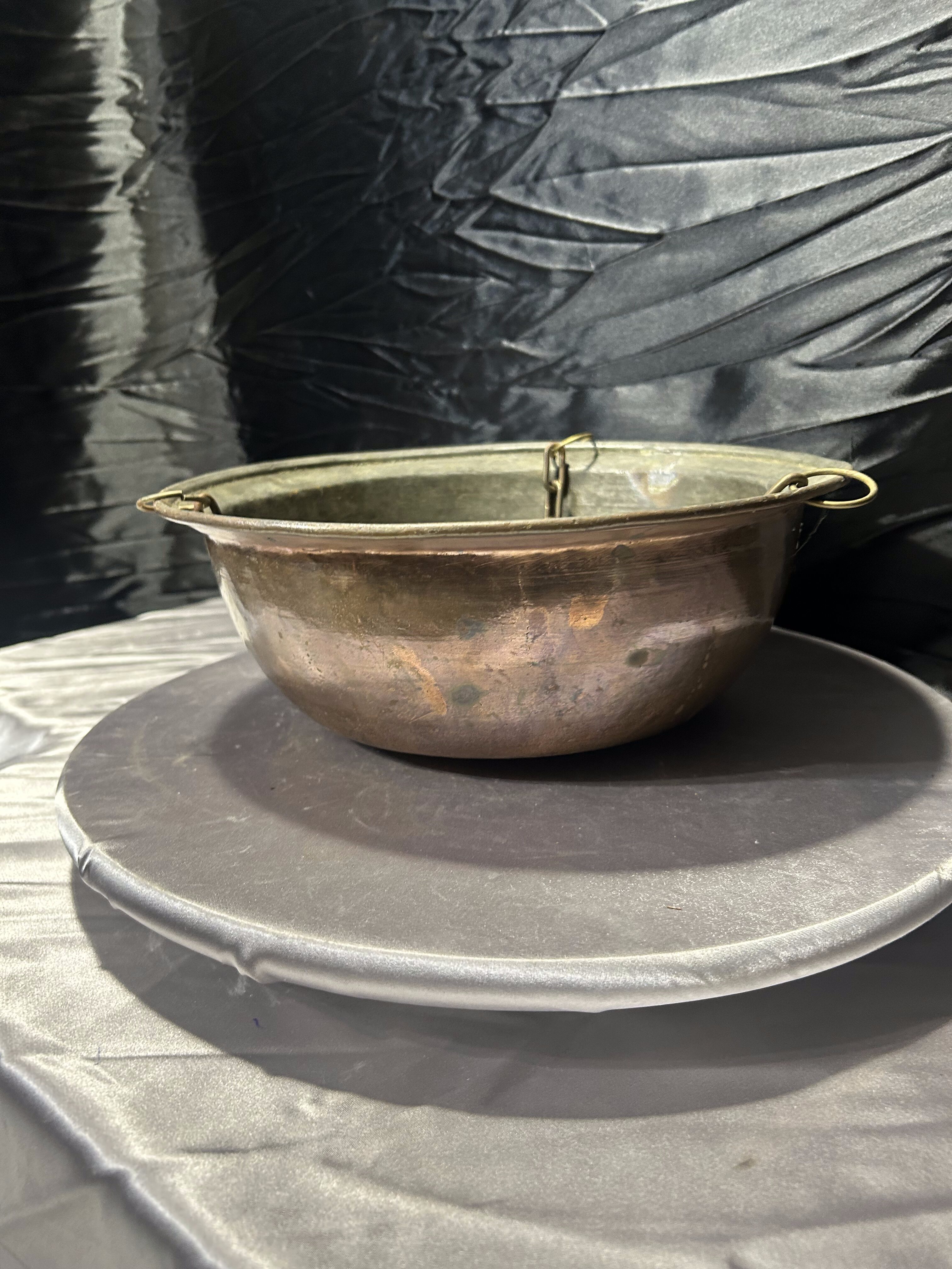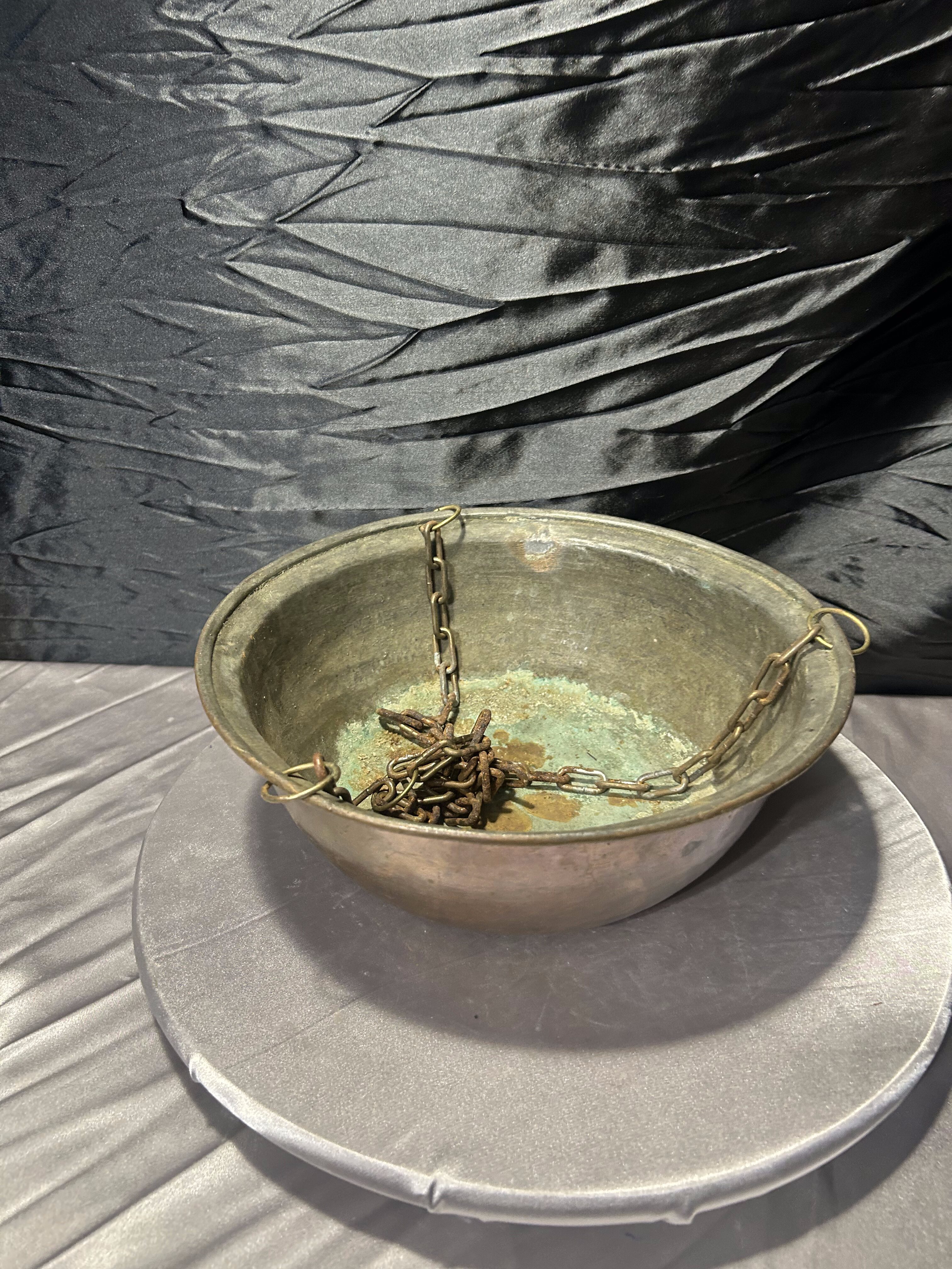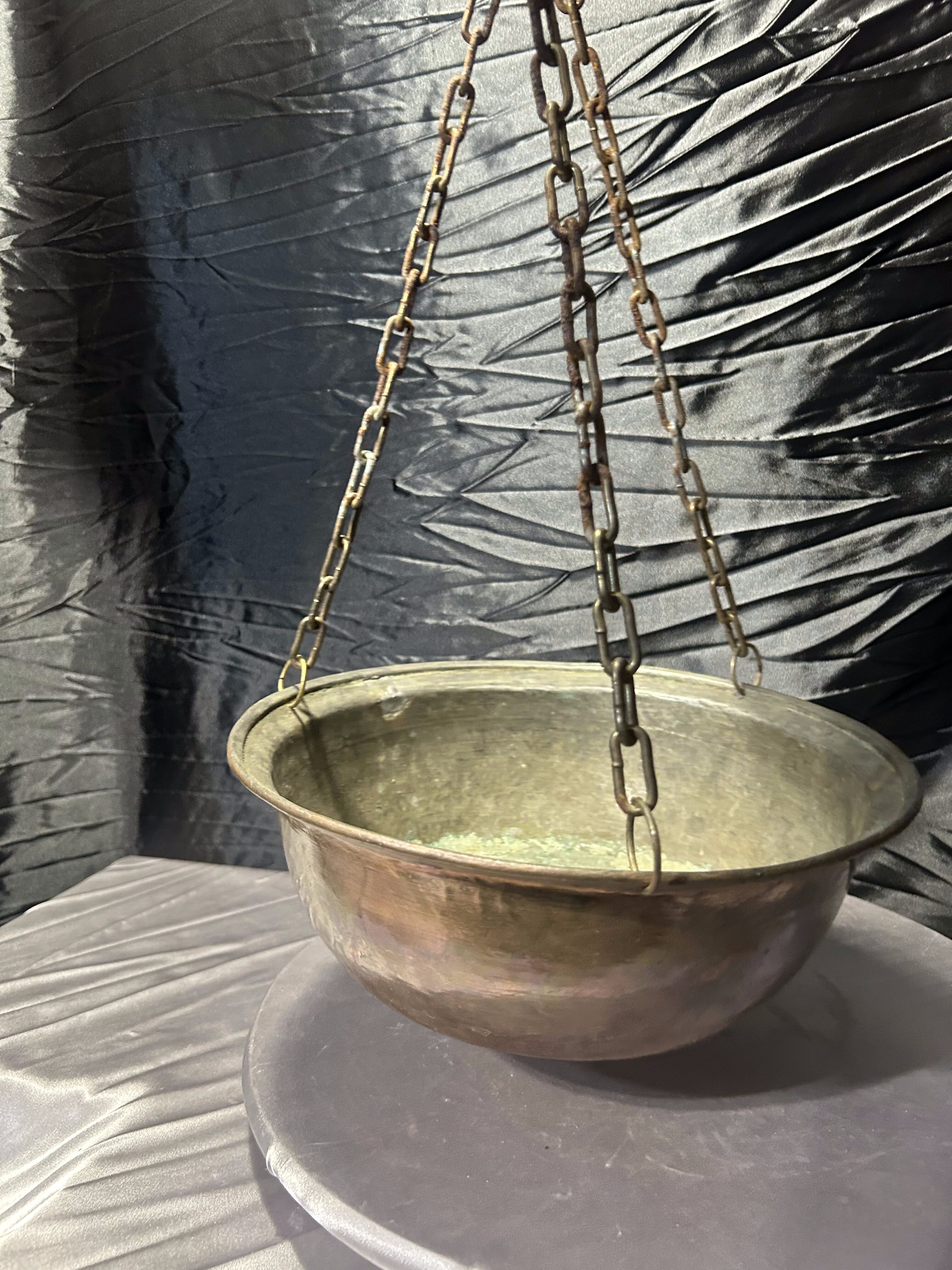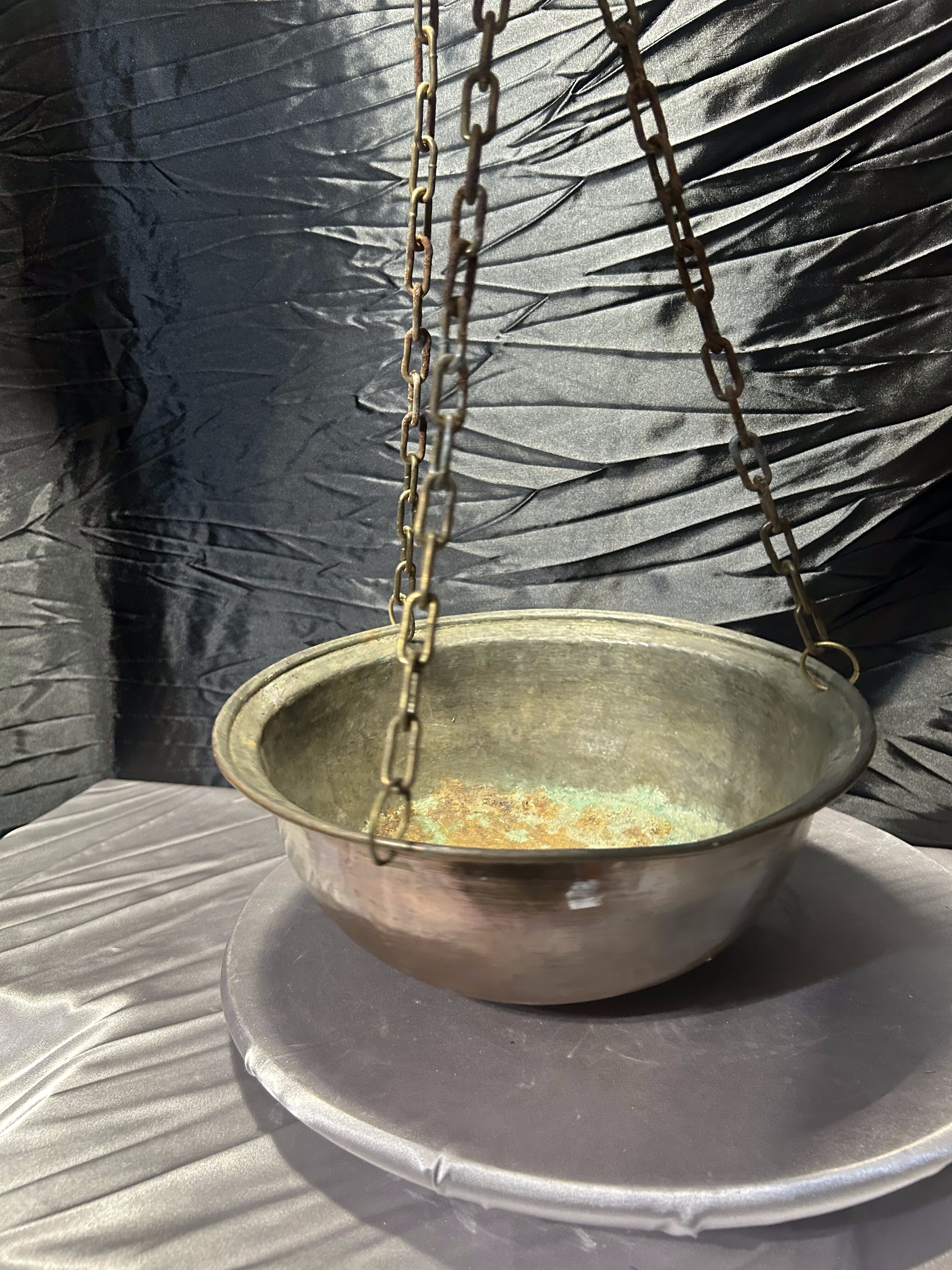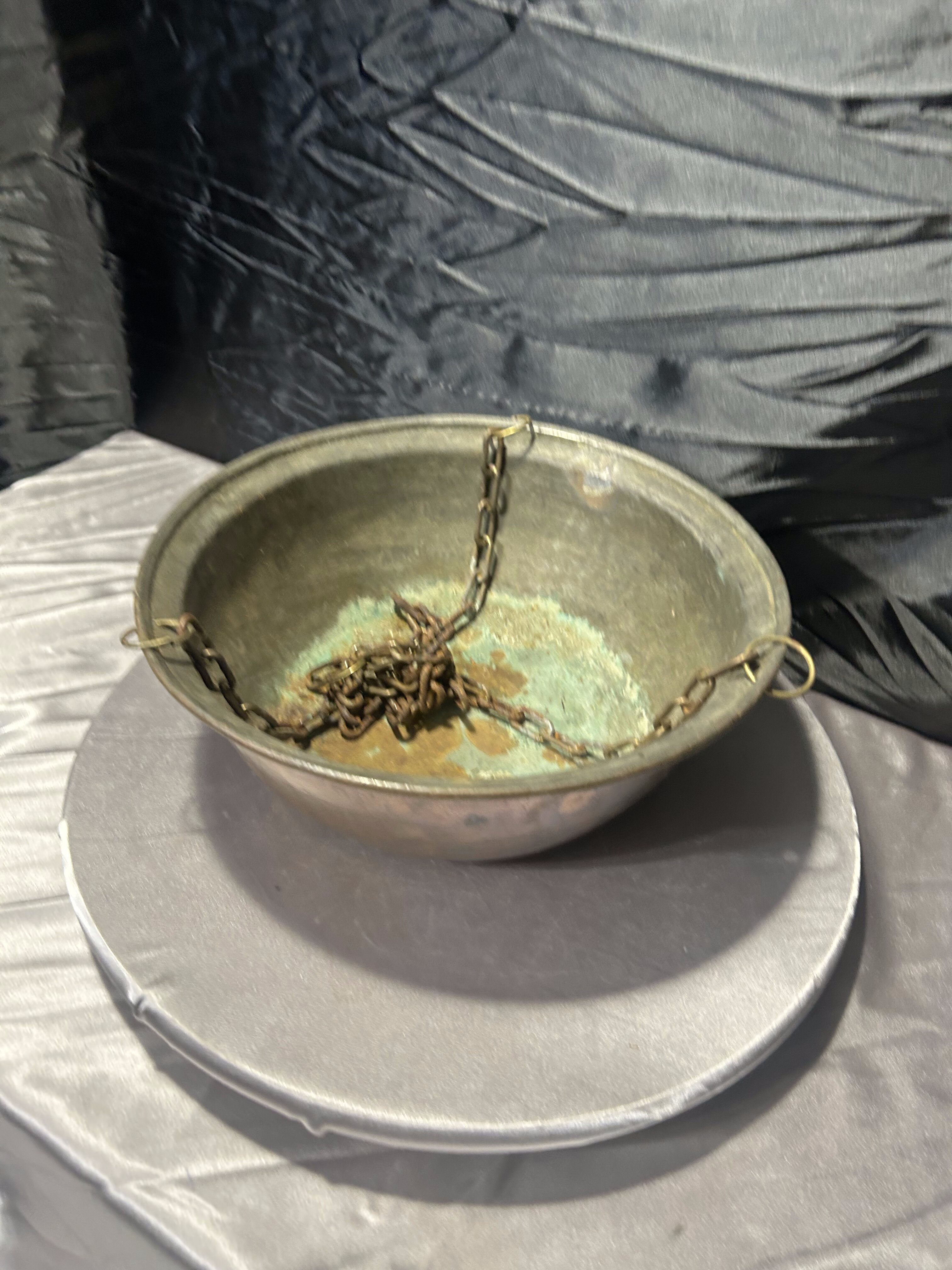 Przedmiotem oferty jest wyjątkowy, wiszący kwietnik wykonany z naturalnej miedzi, zawieszony na trzech solidnych, metalowych łańcuchach łączących się u góry. Kwietnik ma formę głębokiej misy o szerokiej średnicy, co czyni go niezwykle praktycznym rozwiązaniem dla większych i rozłożystych roślin doniczkowych. Miedź z biegiem czasu nabiera szlachetnej patyny, co dodaje przedmiotowi autentycznego charakteru vintage. To idealny element dekoracyjny do wnętrz w stylu loftowym, industrialnym, a także do ogrodów zimowych czy na tarasy, gdzie rośliny mogą swobodnie piąć się i zwisać z wysokości.