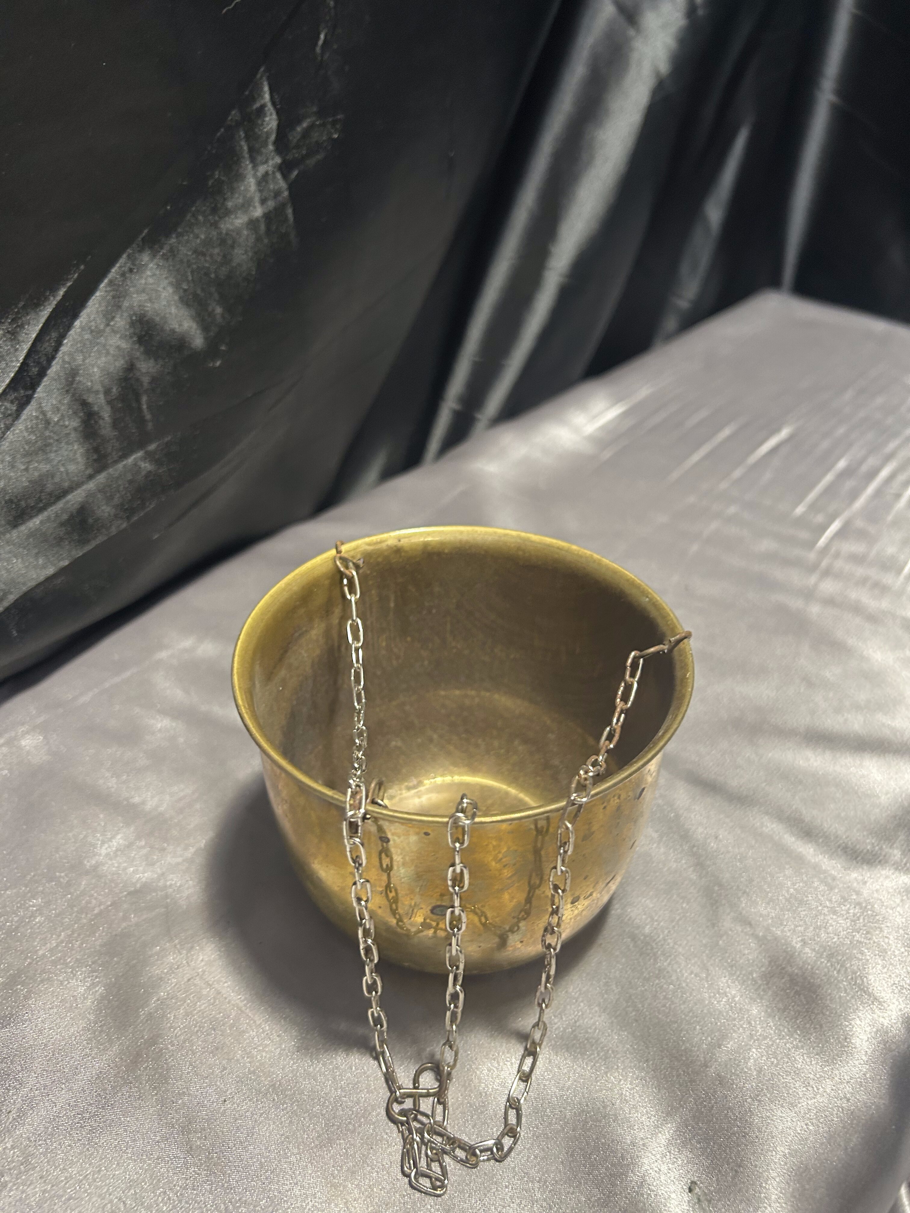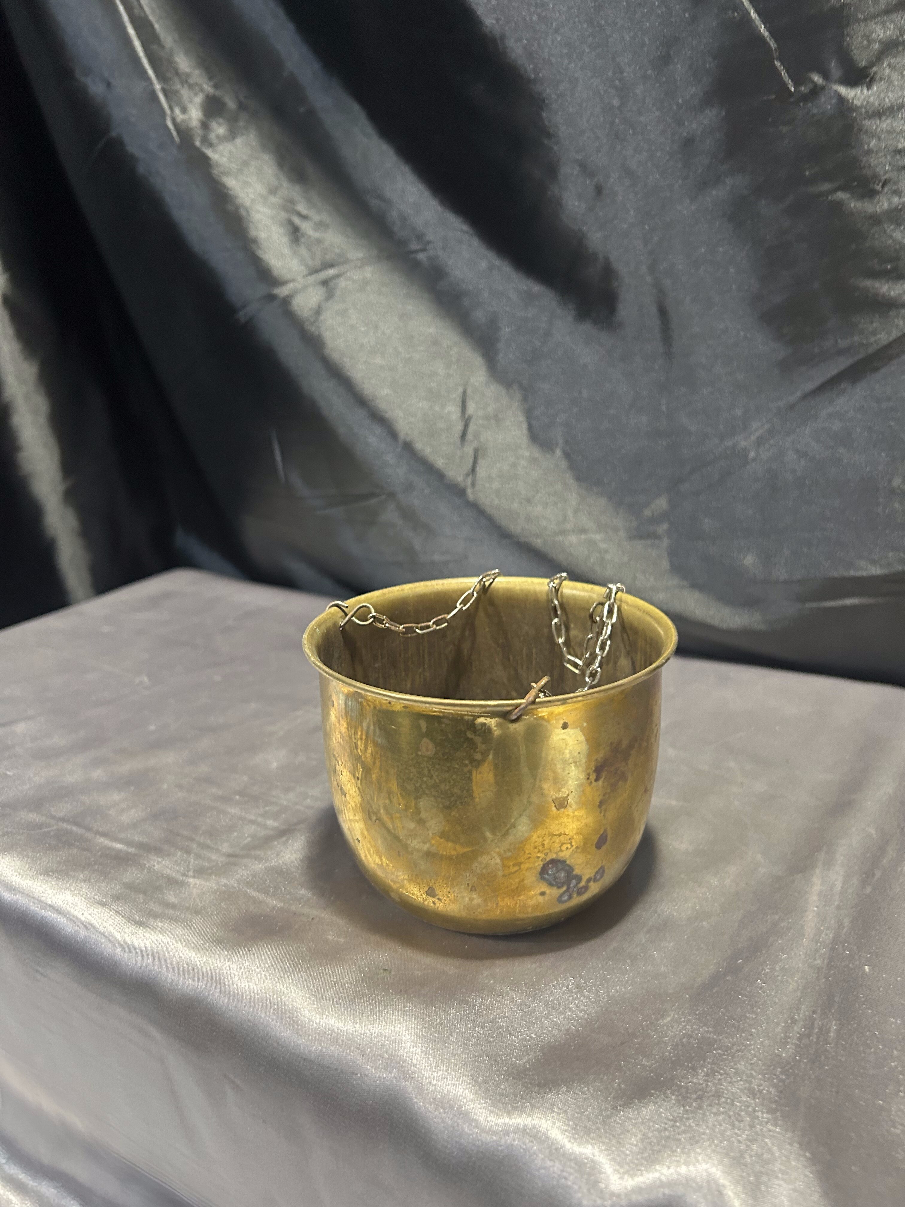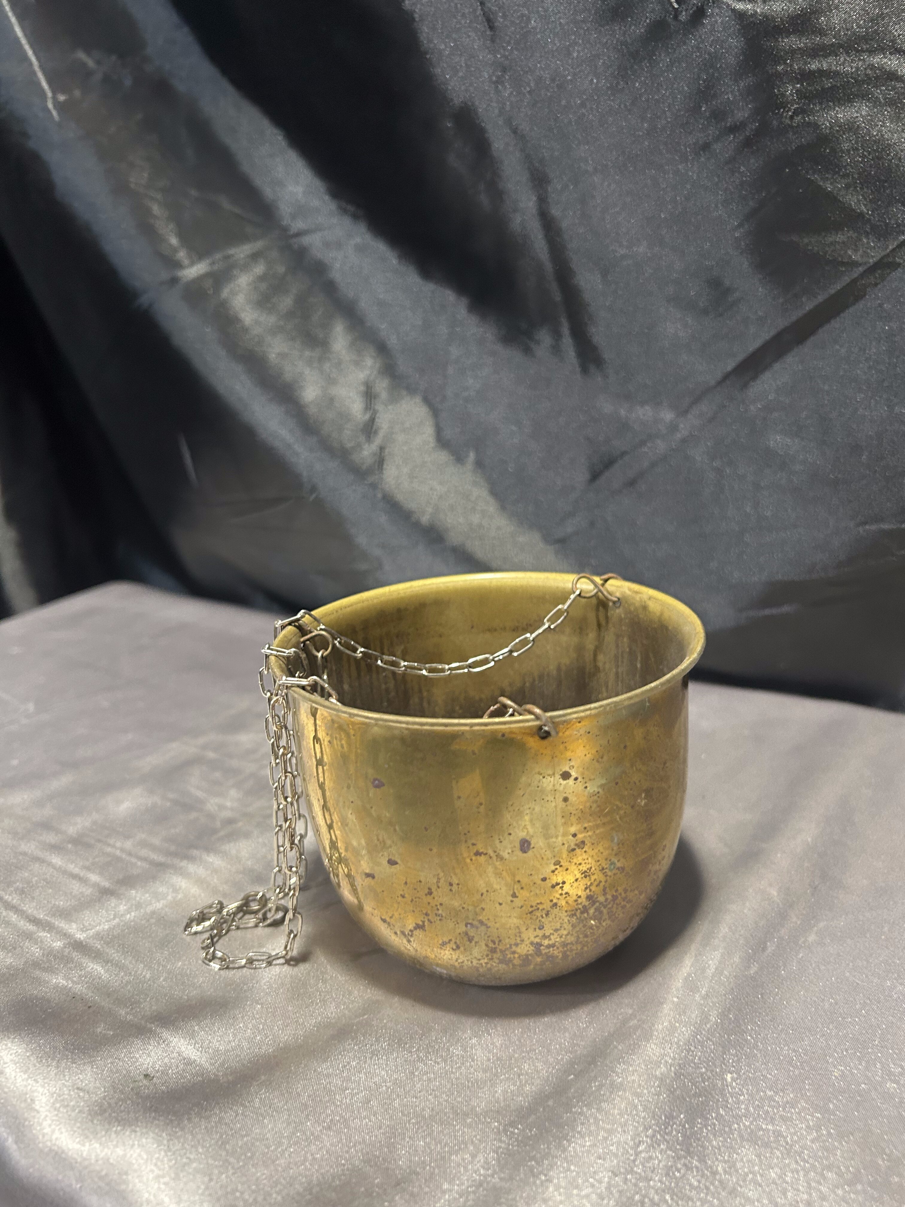 Delikatny, a zarazem elegancki wiszący kwietnik wykonany z mosiądzu, zawieszony na trzech ozdobnych łańcuszkach. Jego klasyczna, zaokrąglona forma i ciepły odcień metalu sprawiają, że idealnie odnajduje się w aranżacjach w stylu vintage, boho czy rustykalnym.