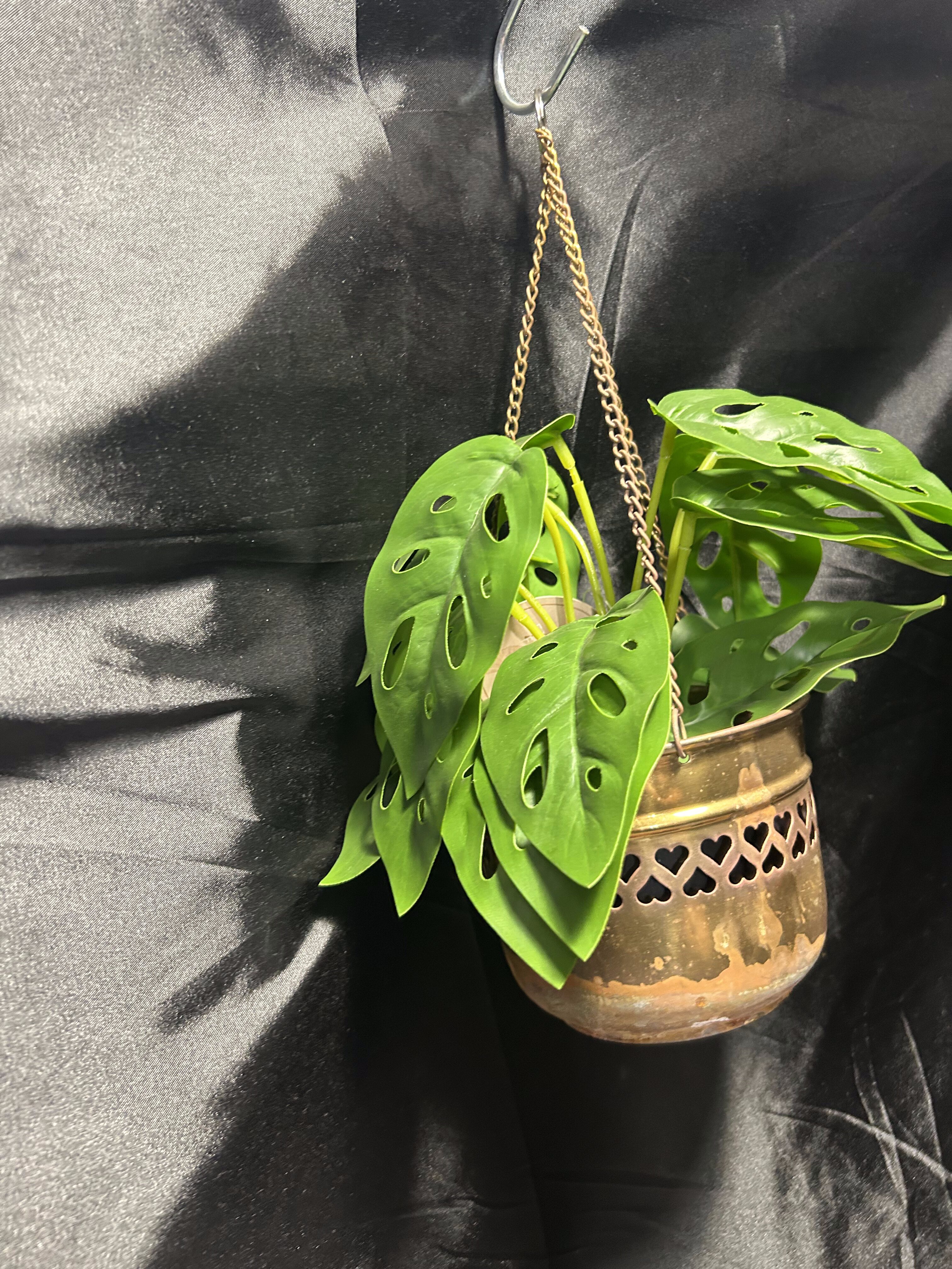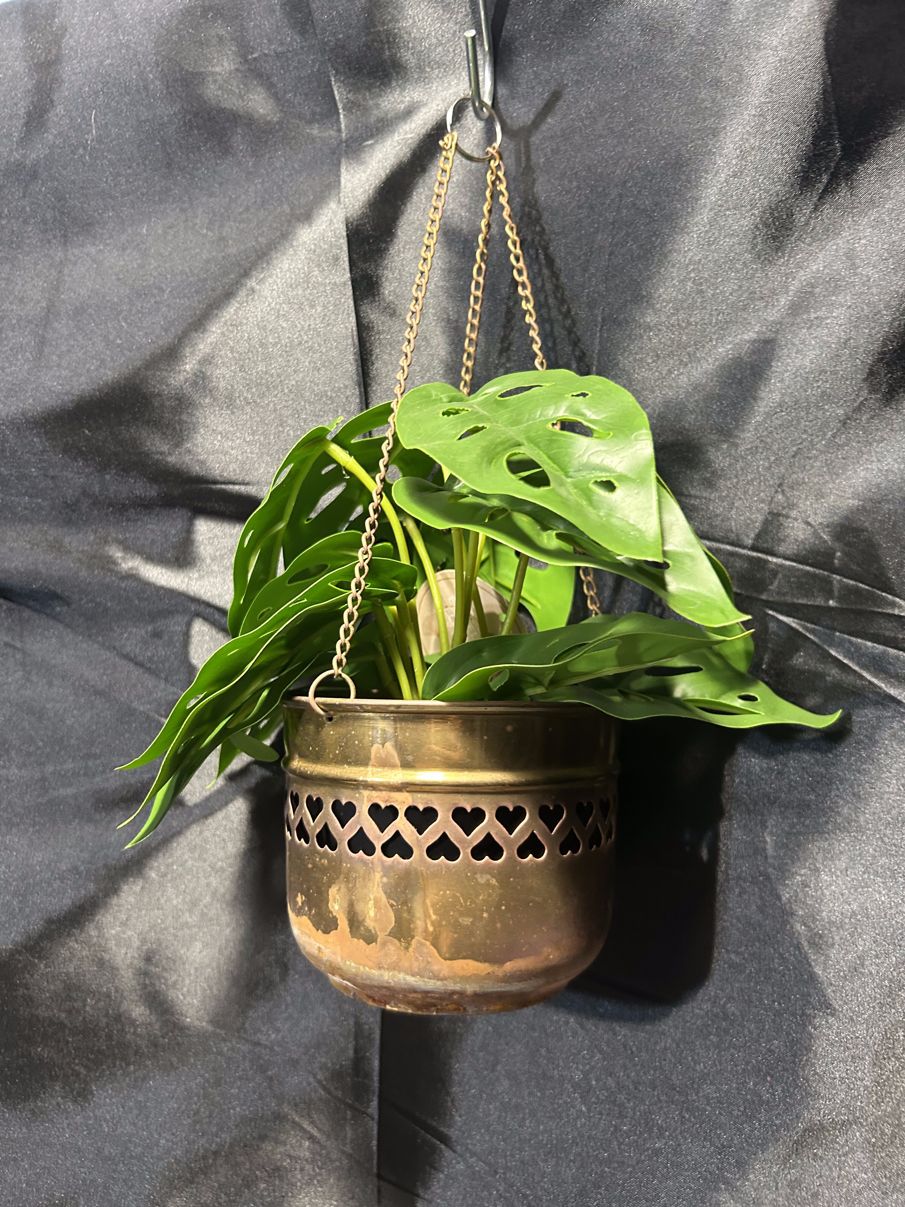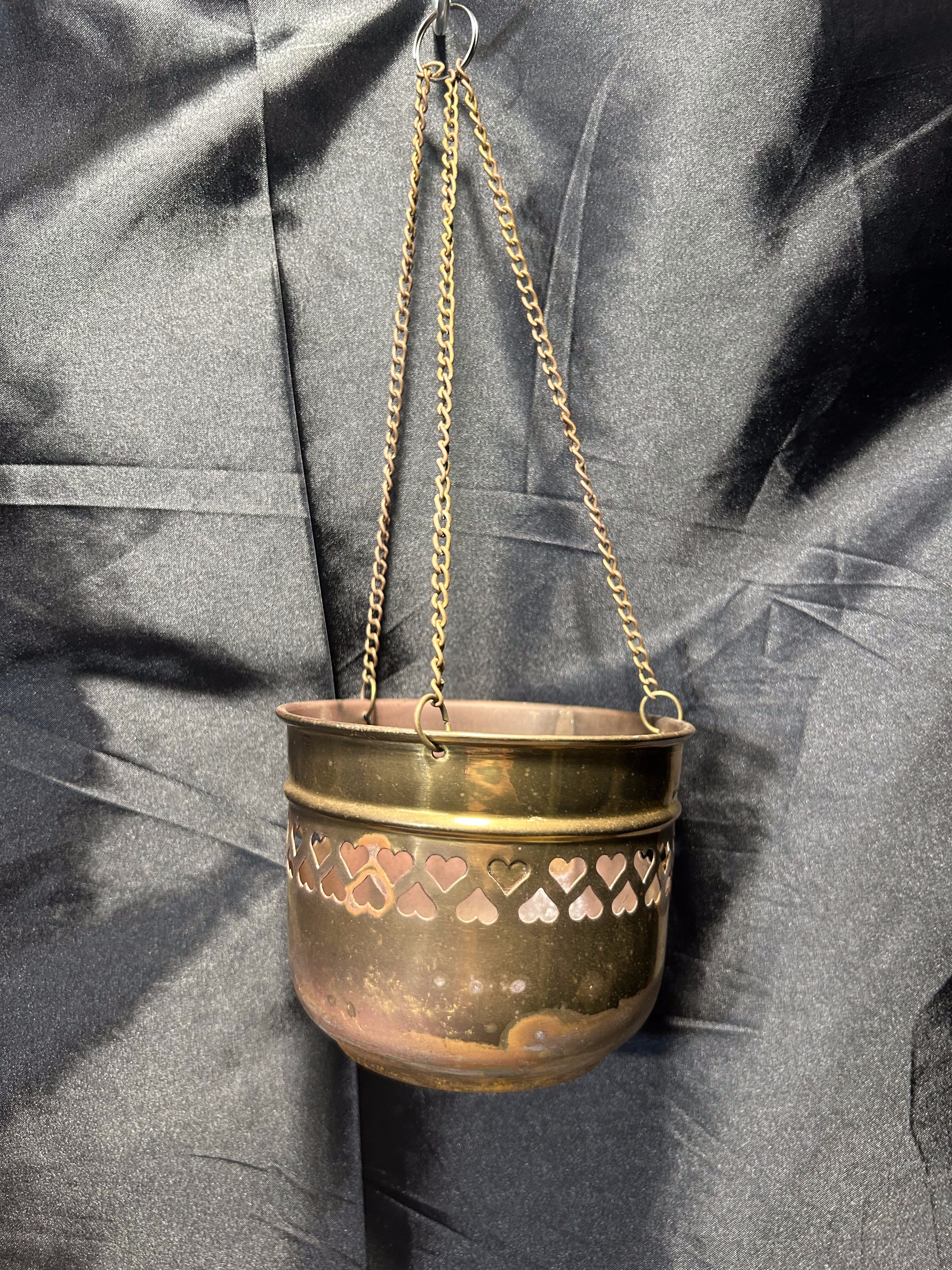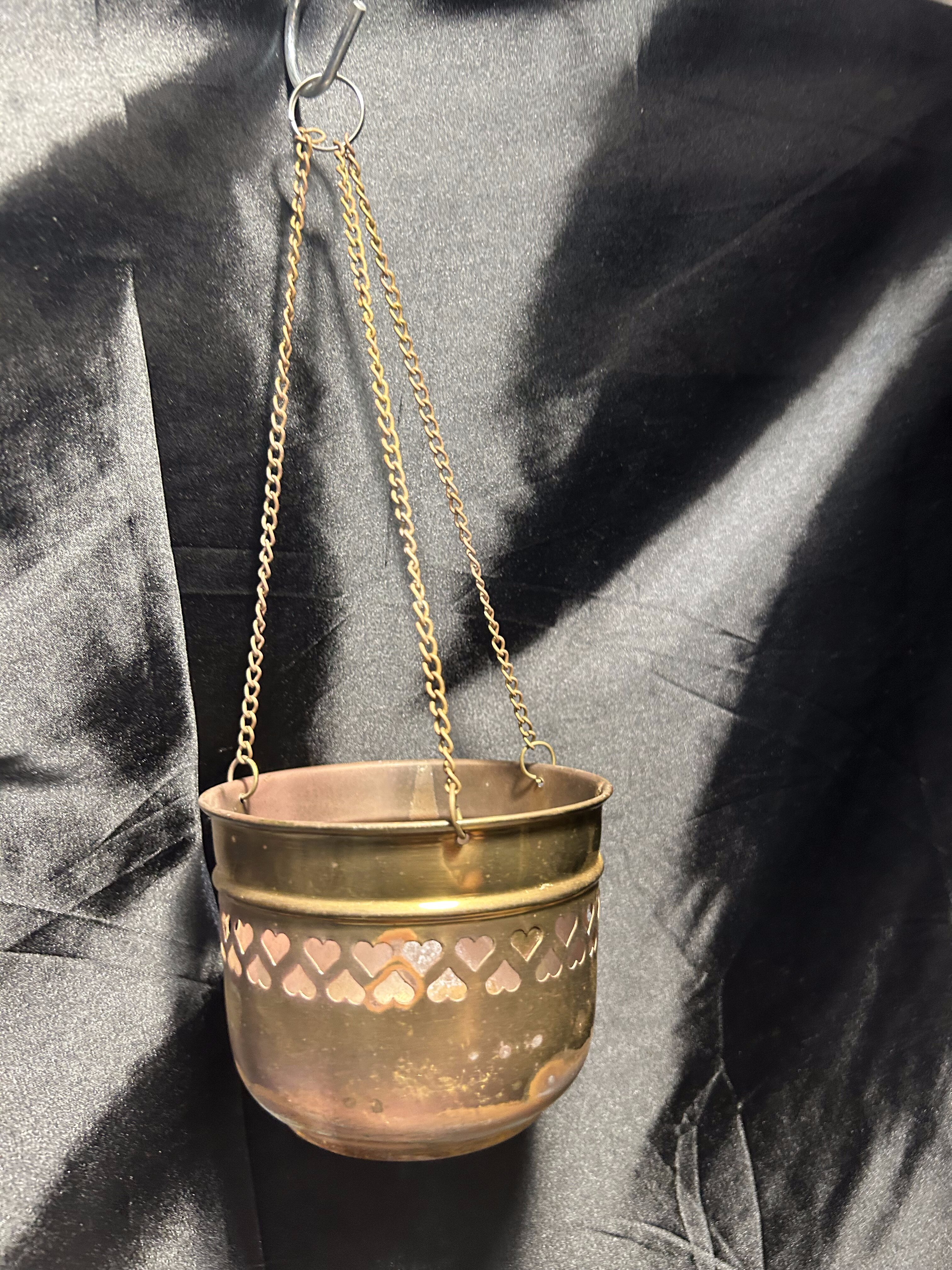 Na sprzedaż mosiężny wiszący kwietnik, zawieszony na trzech łańcuszkach, ozdobiony wyciętymi ażurowymi sercami, które nadają mu wyjątkowego uroku. Dzięki dekoracyjnym wycięciom może pełnić także funkcję wiszącego świecznika, tworząc nastrojowe światło.