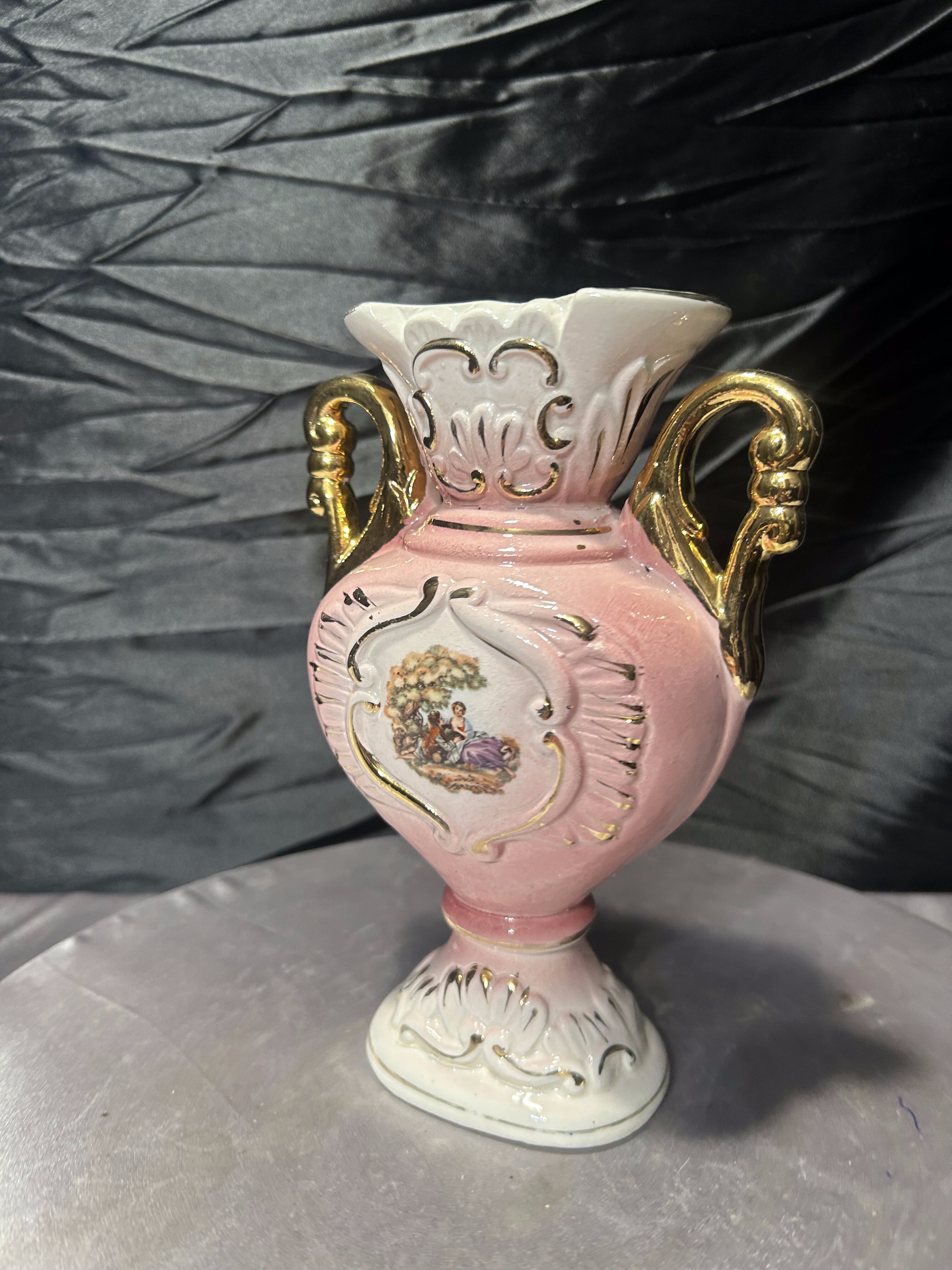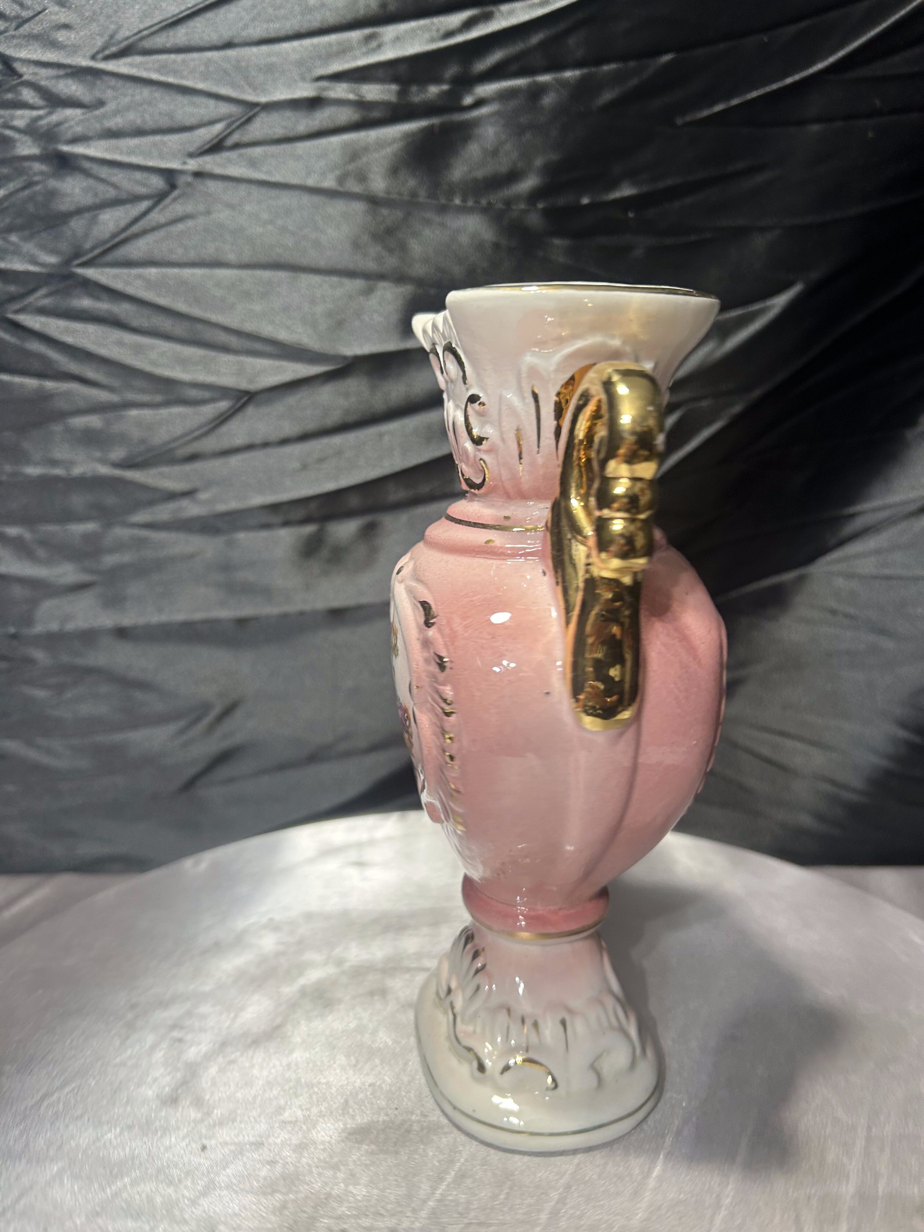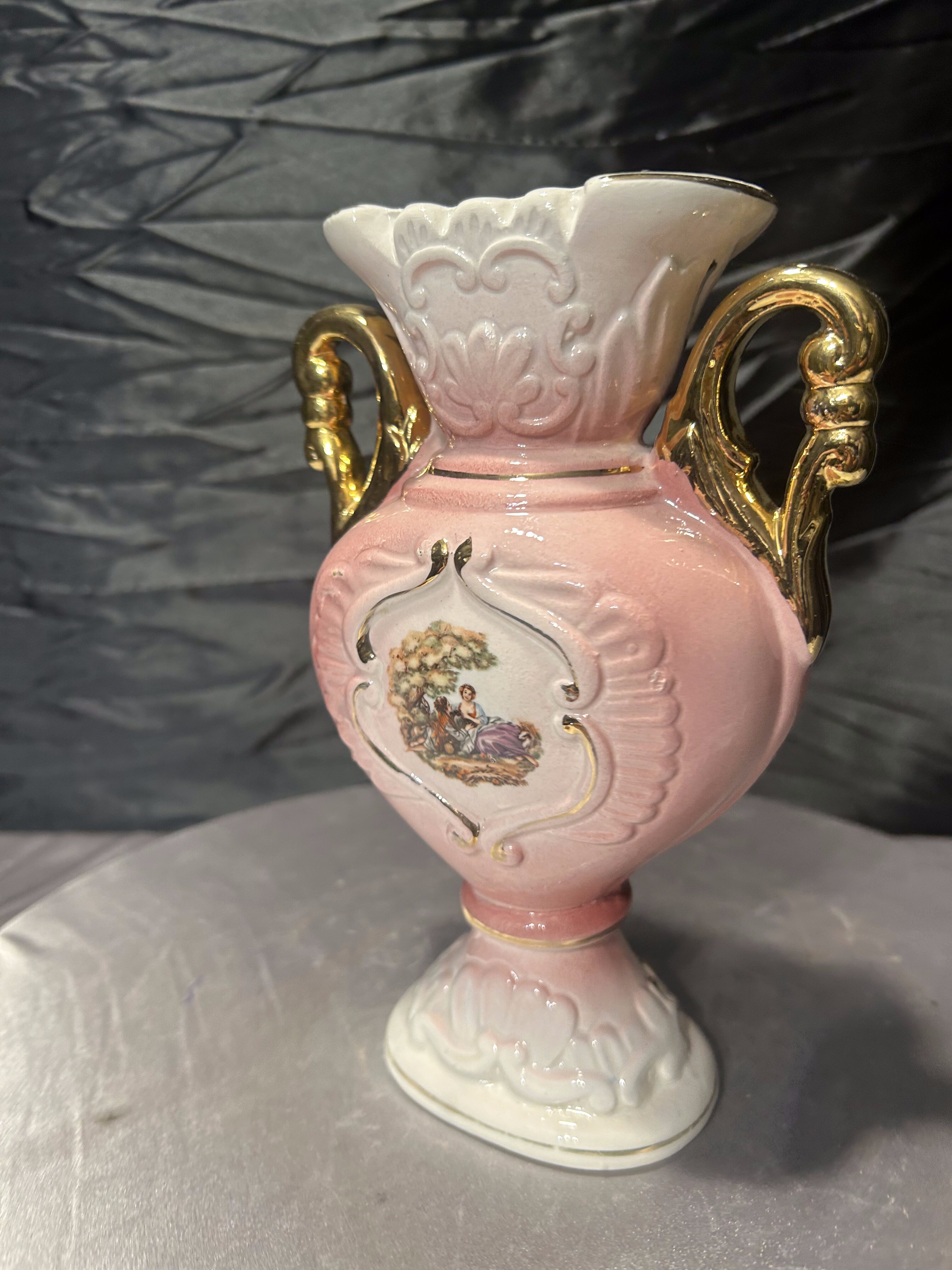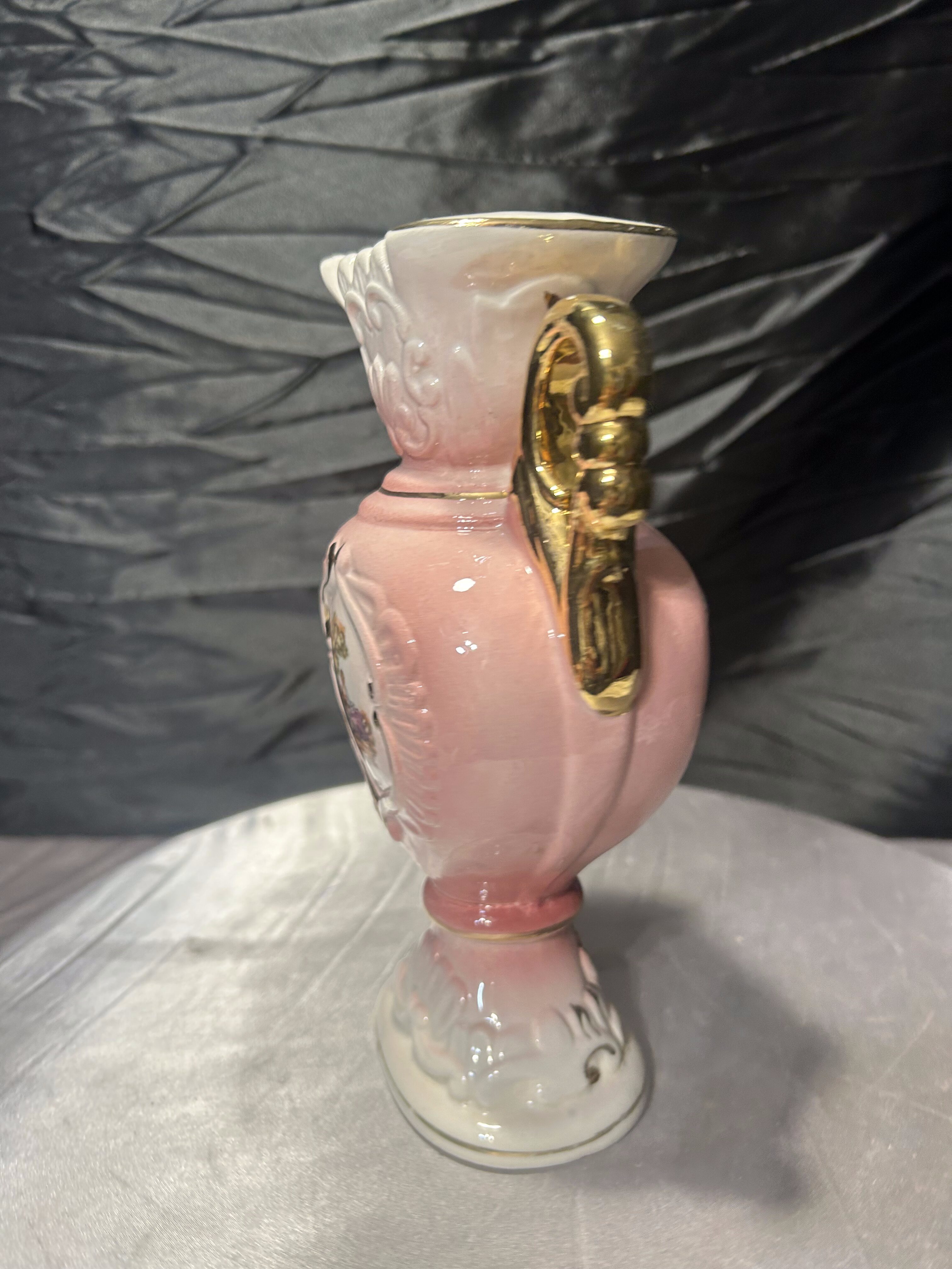 Piękna waza dekoracyjna w stylu wiejskim, utrzymana w delikatnej różowo-złotej kolorystyce, wykonana z włoskiej ceramiki. Forma inspirowana klasycznym wzornictwem rustykalnym, z dekoracyjnymi uchwytami, reliefami oraz subtelną scenką figuralną na froncie. Całość wykończona złoceniami, które dodają elegancji i ciepłego charakteru.