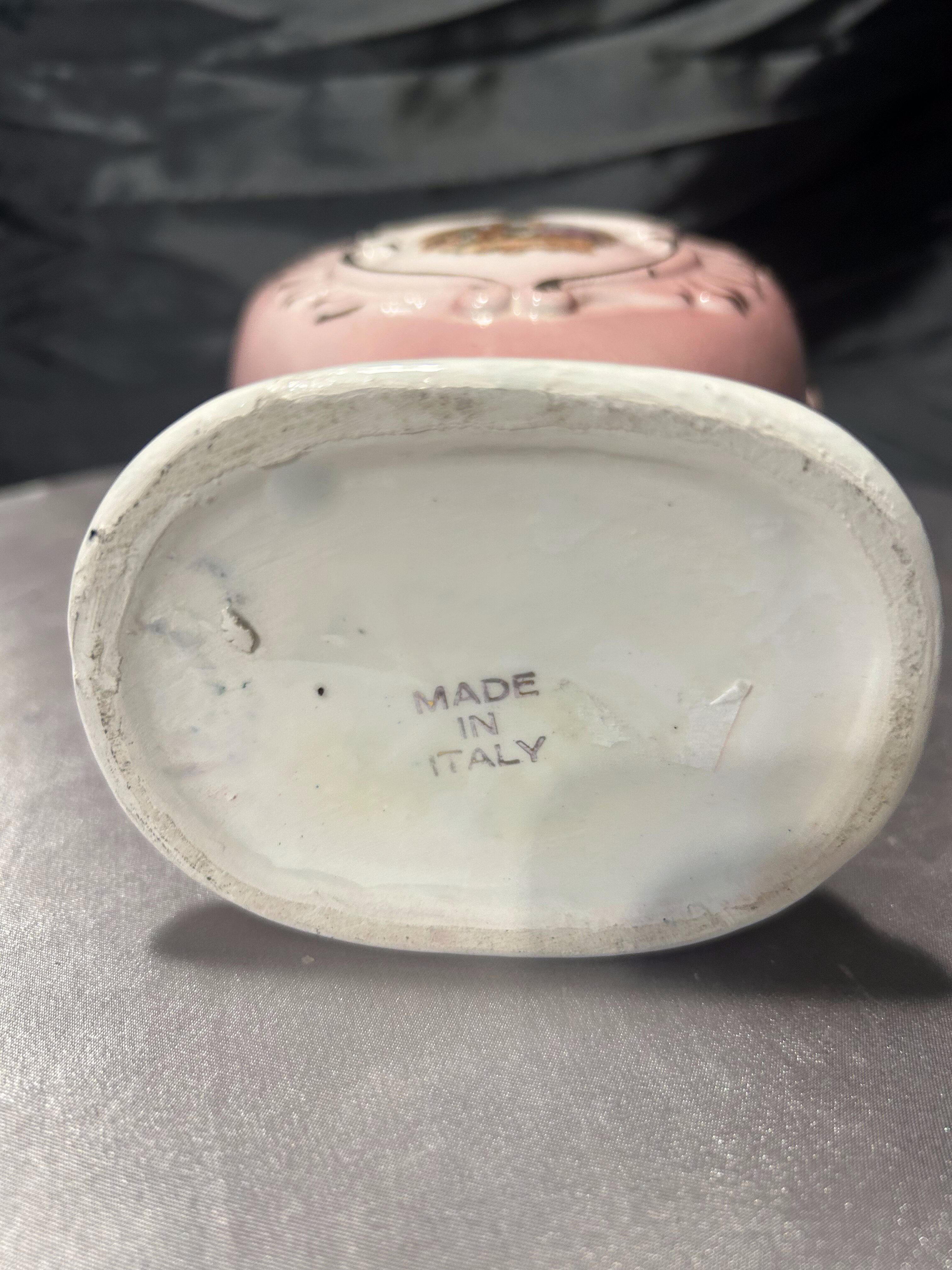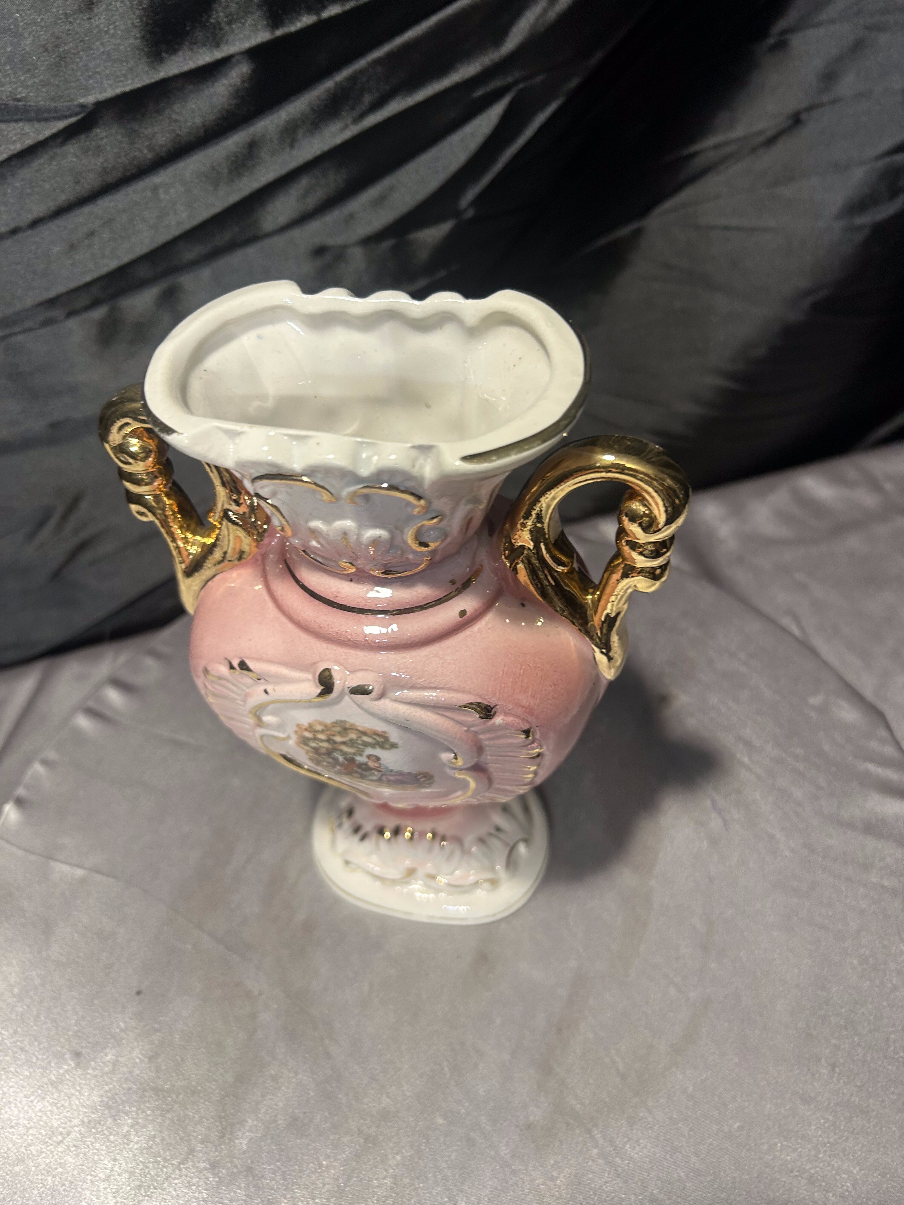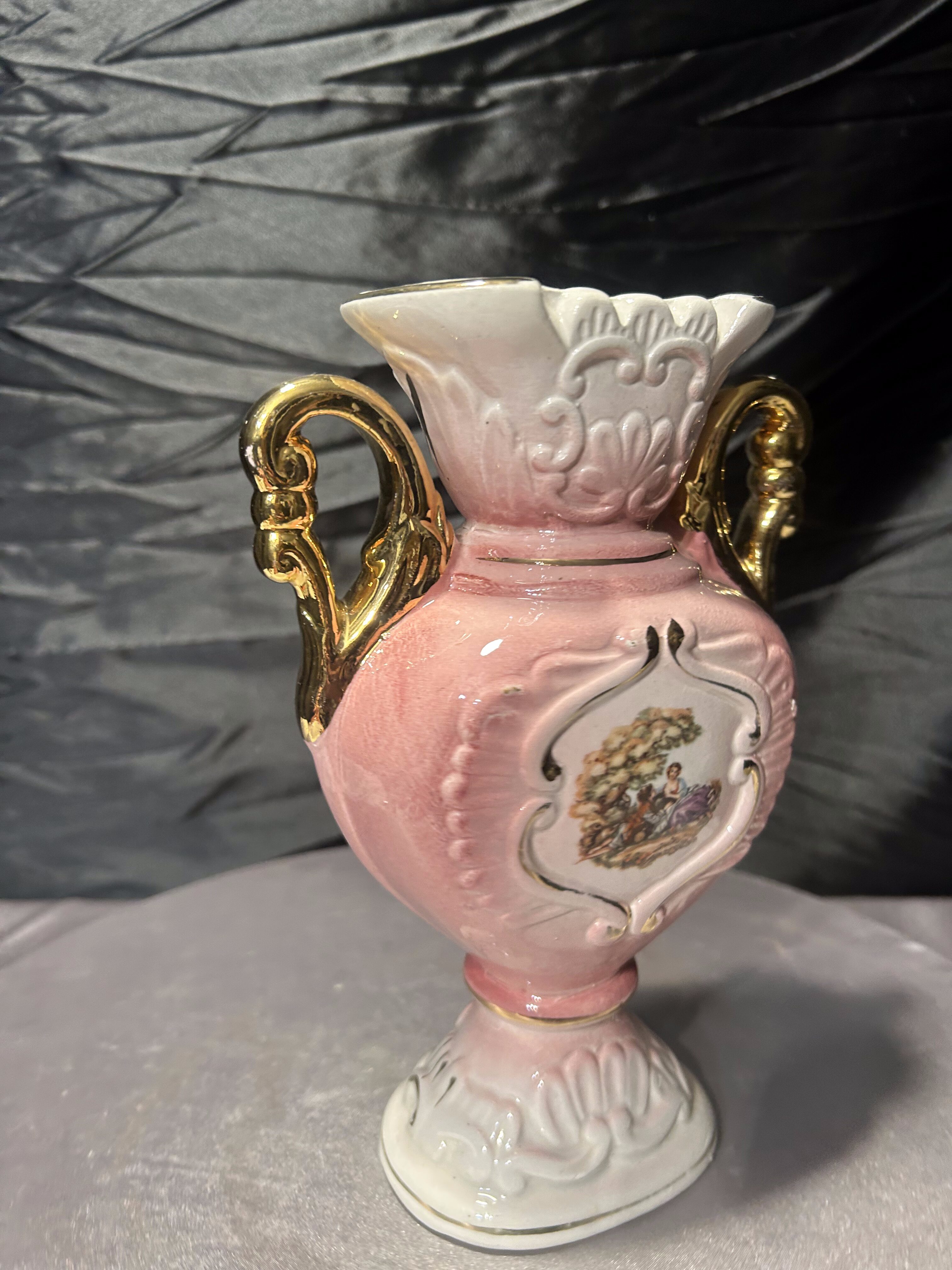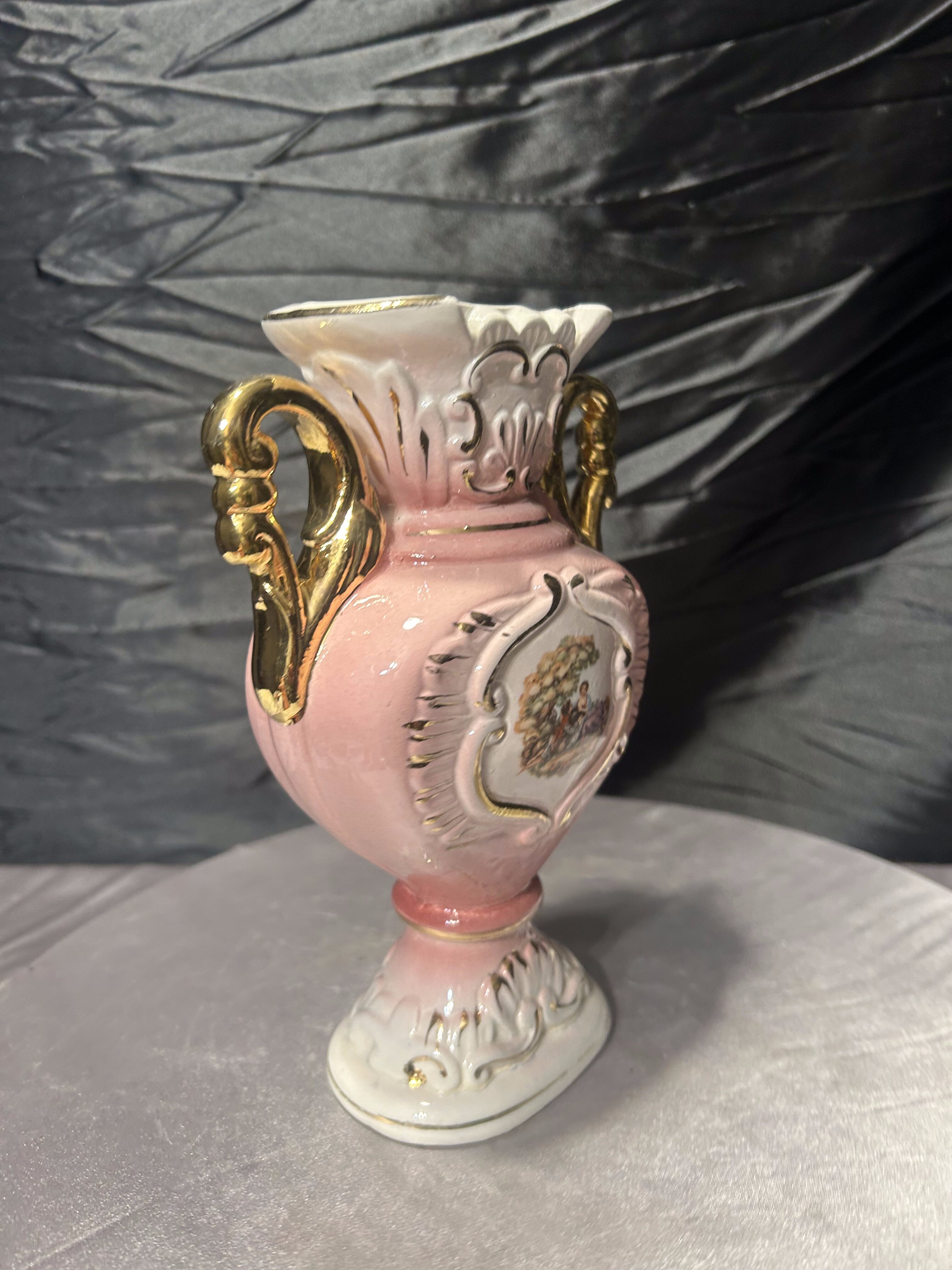 Piękna waza dekoracyjna w stylu wiejskim, utrzymana w delikatnej różowo-złotej kolorystyce, wykonana z włoskiej ceramiki. Forma inspirowana klasycznym wzornictwem rustykalnym, z dekoracyjnymi uchwytami, reliefami oraz subtelną scenką figuralną na froncie. Całość wykończona złoceniami, które dodają elegancji i ciepłego charakteru.