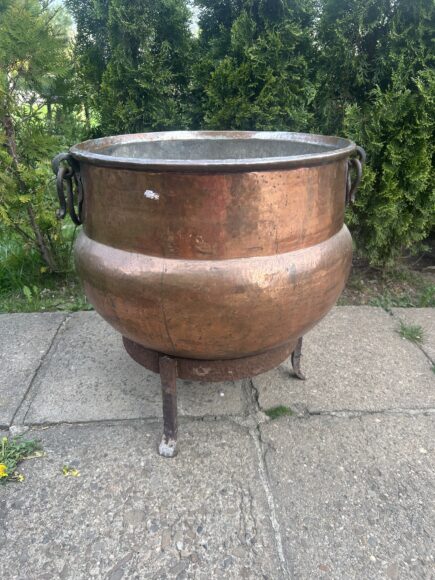 Ogromny miedziany garnek – z kutymi uchwytami i podstawą – rzadki egzemplarz