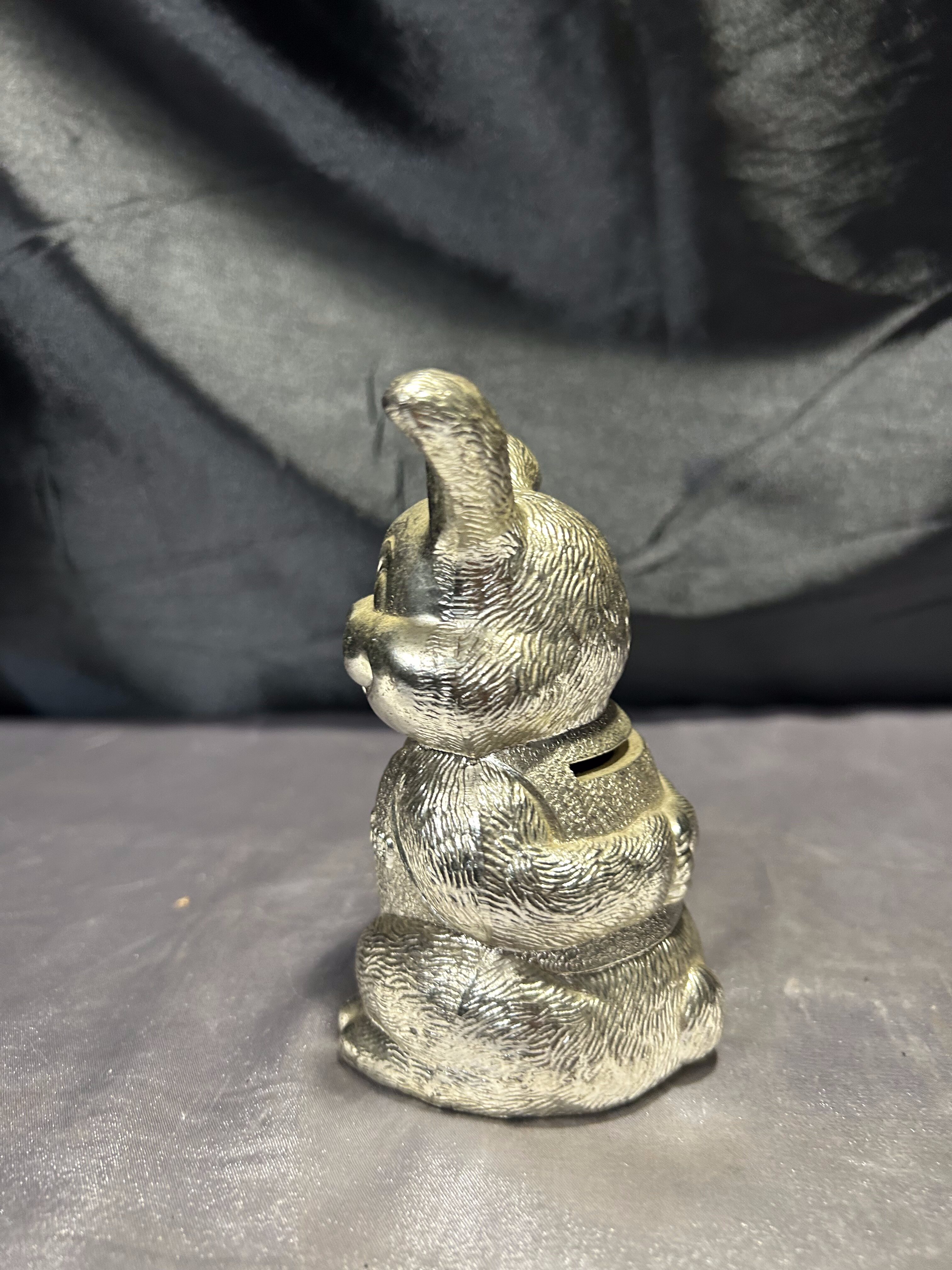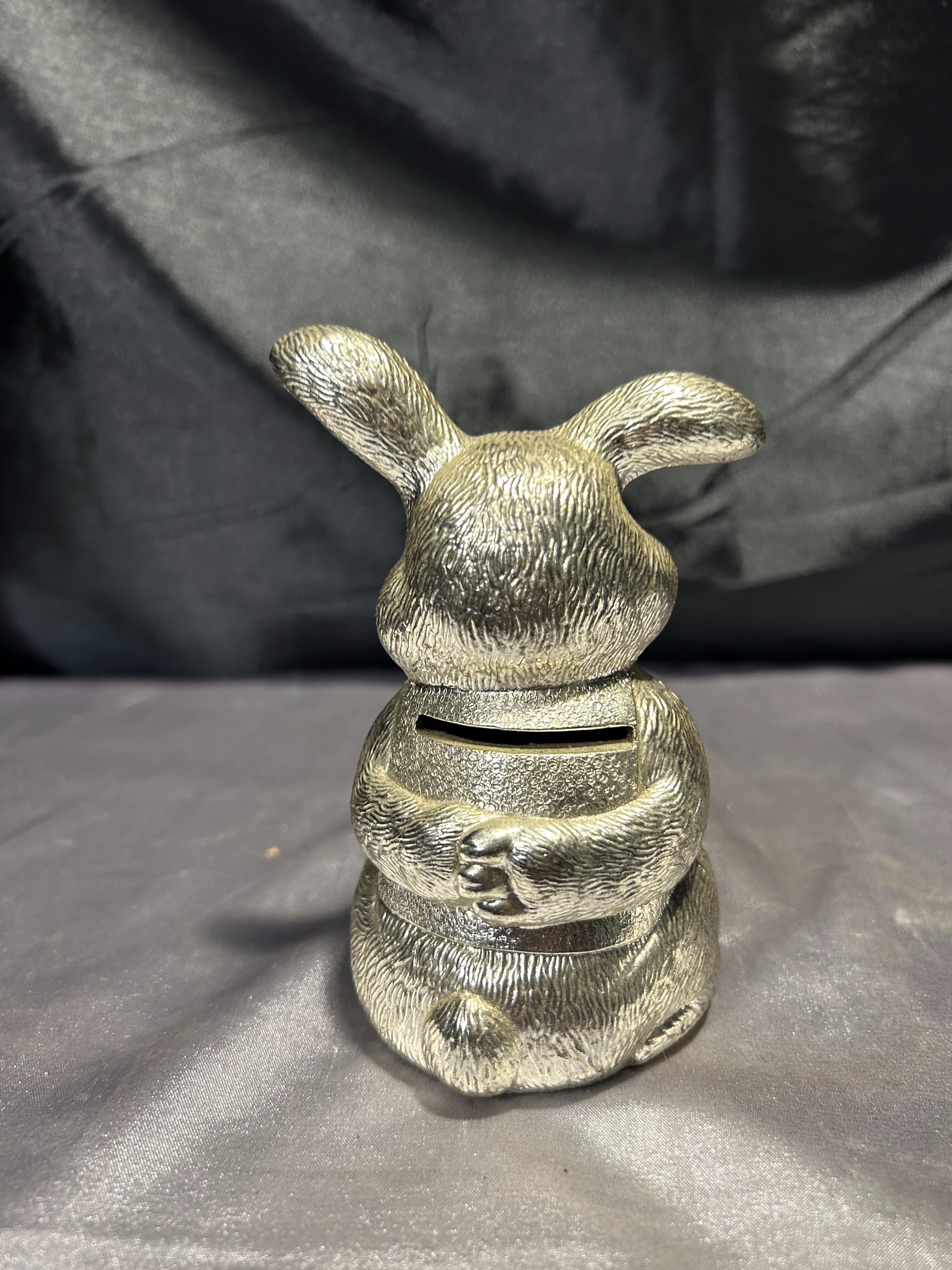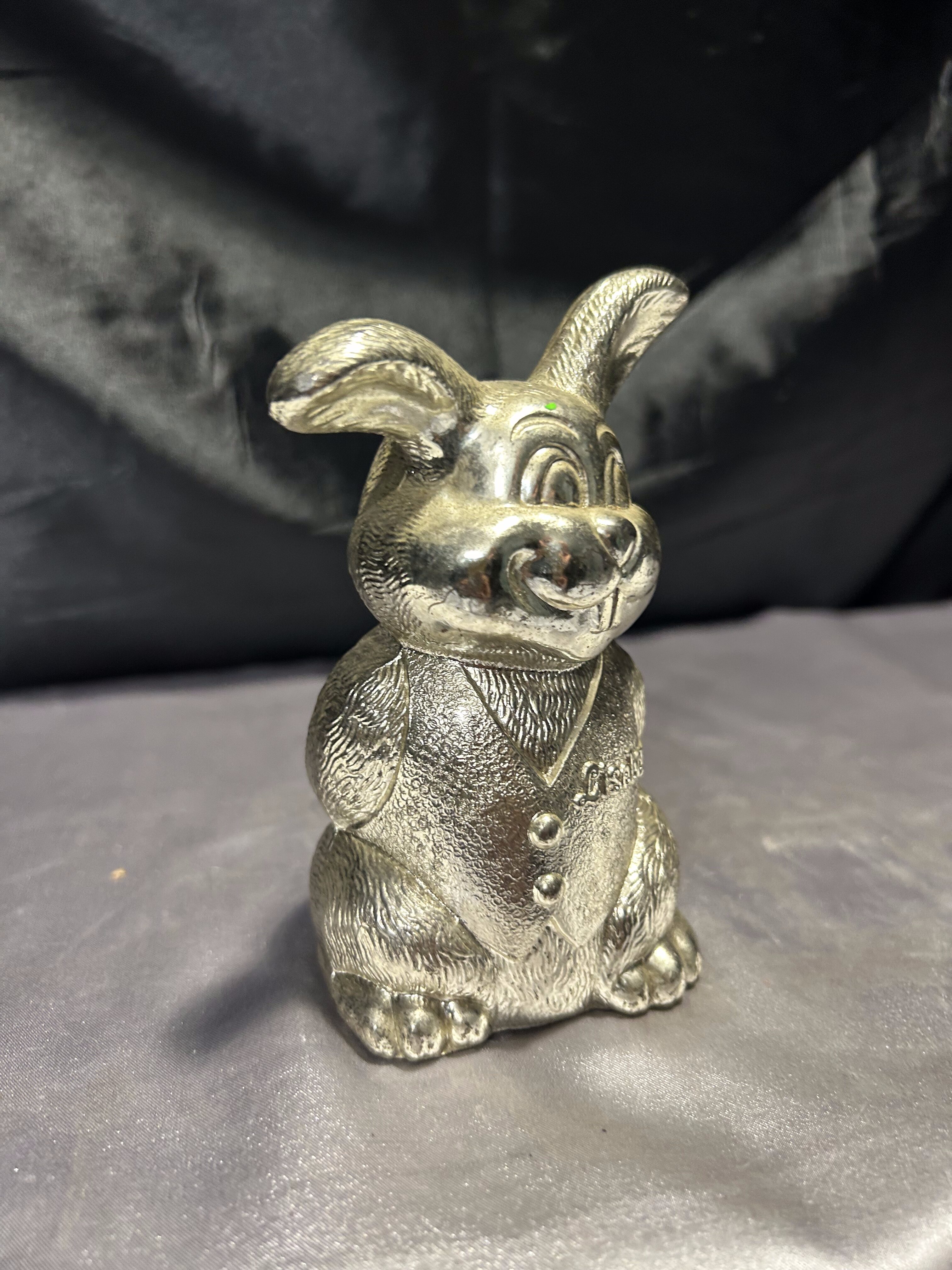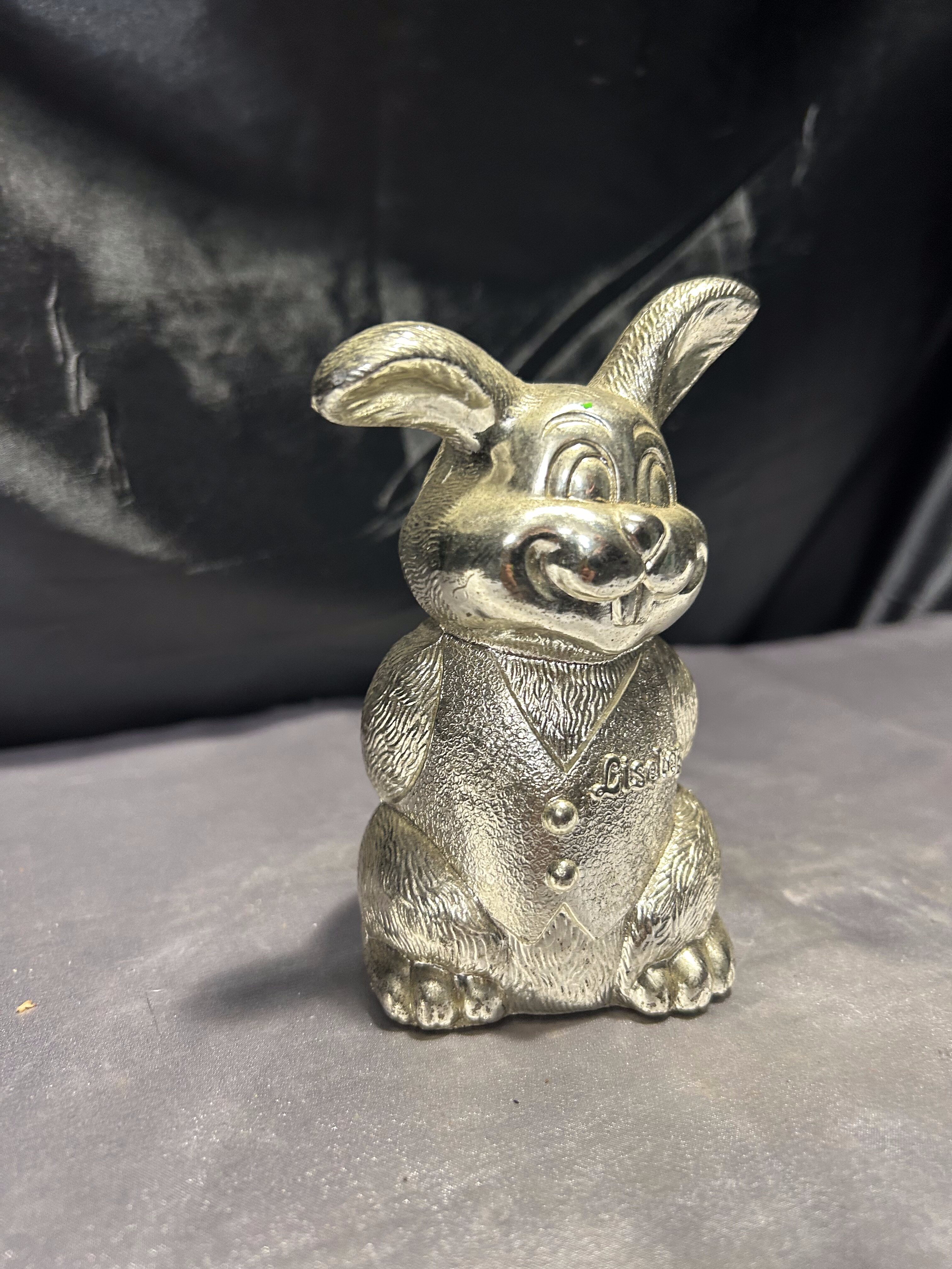 Przedstawiam uroczą skarbonkę w kształcie uśmiechniętego zająca, wykonaną z mosiądzu pobiał.