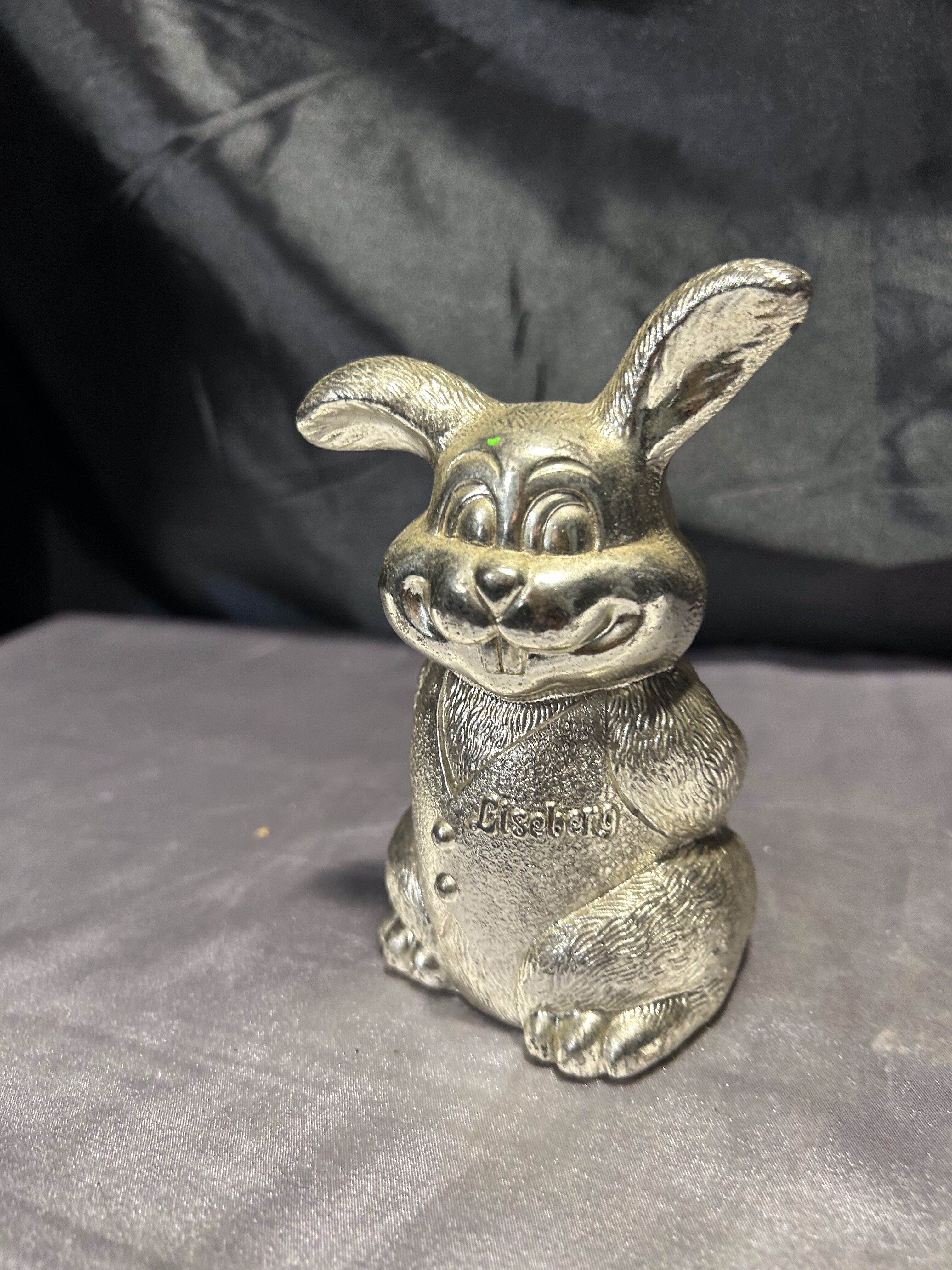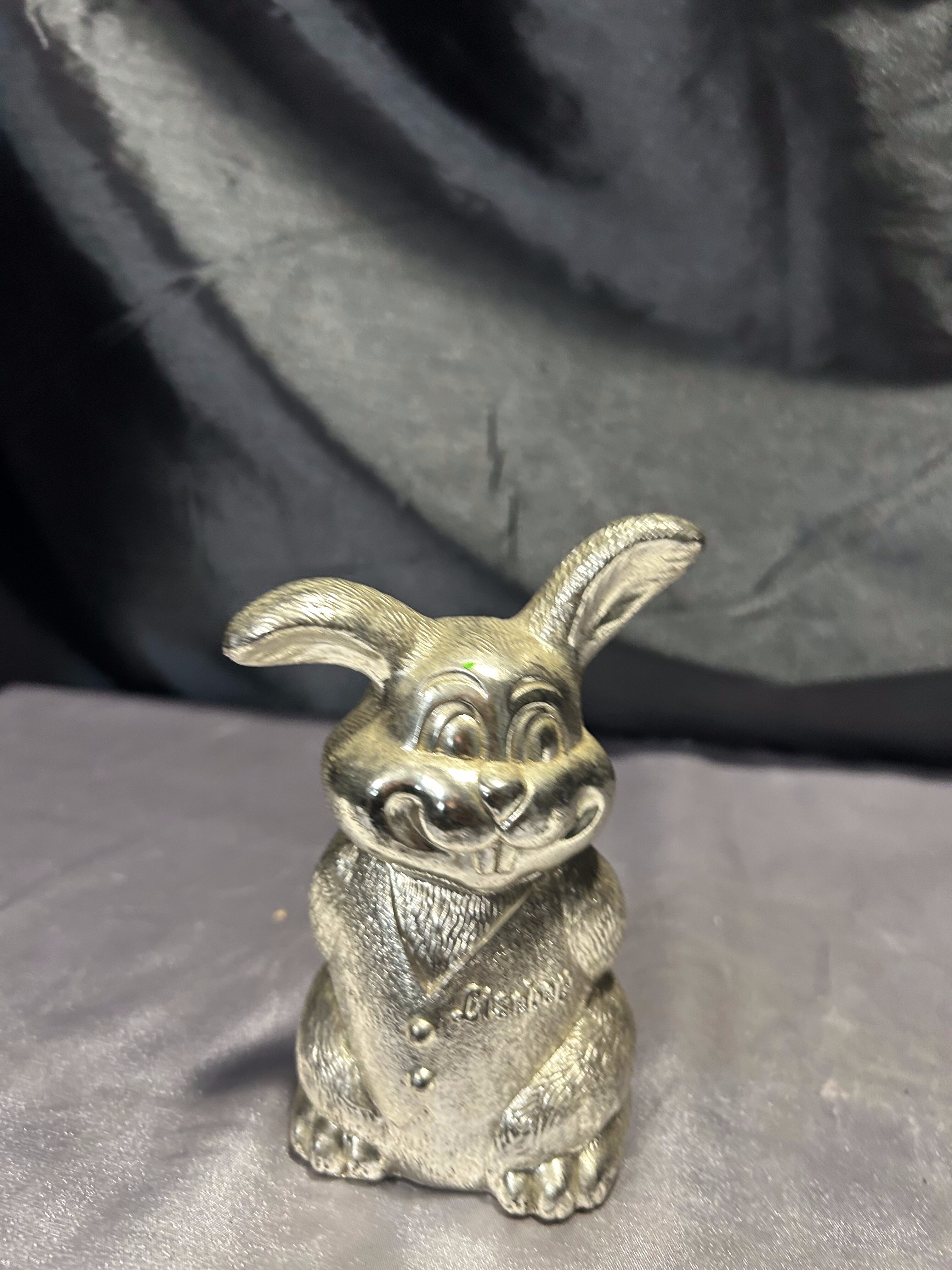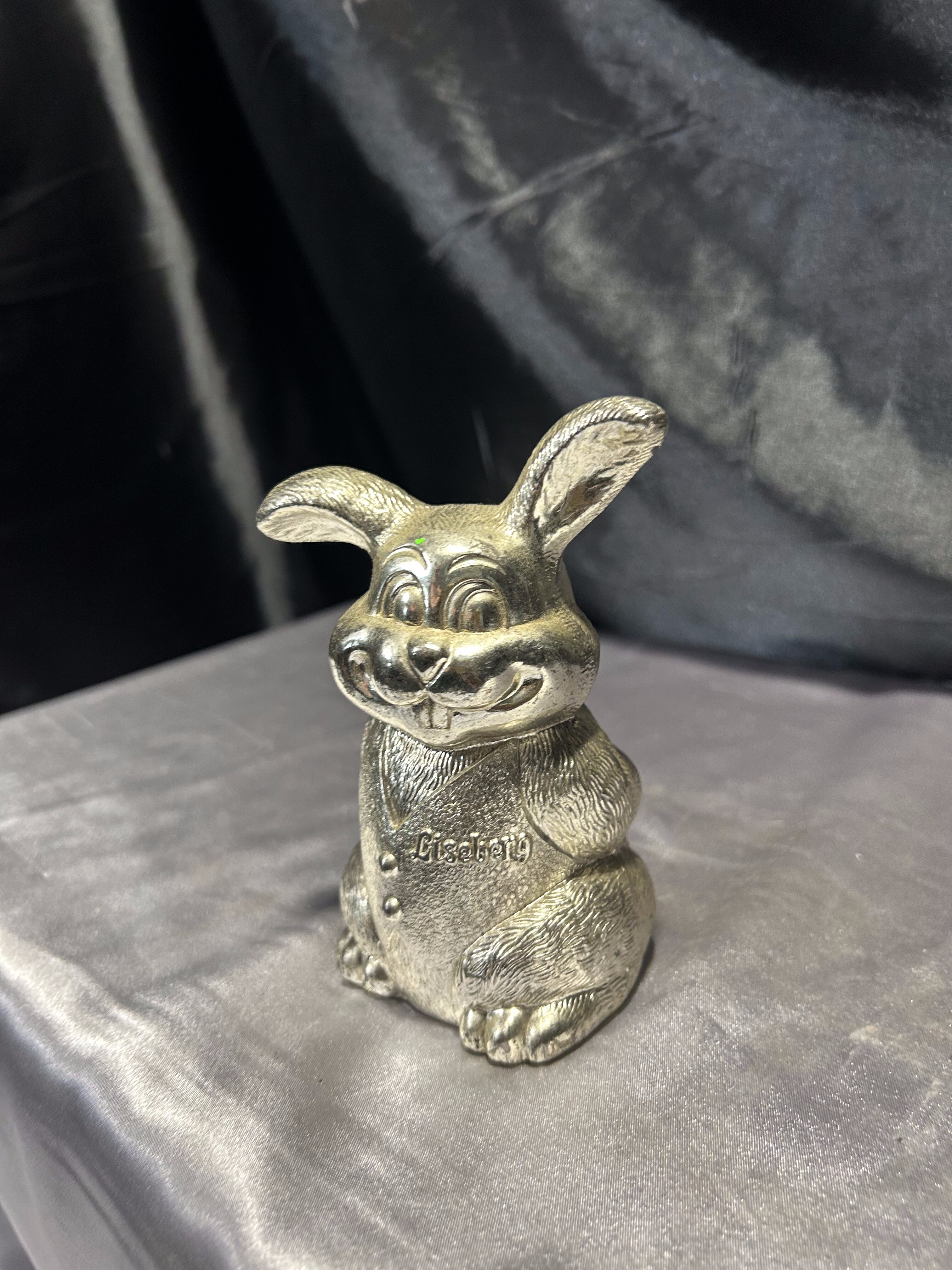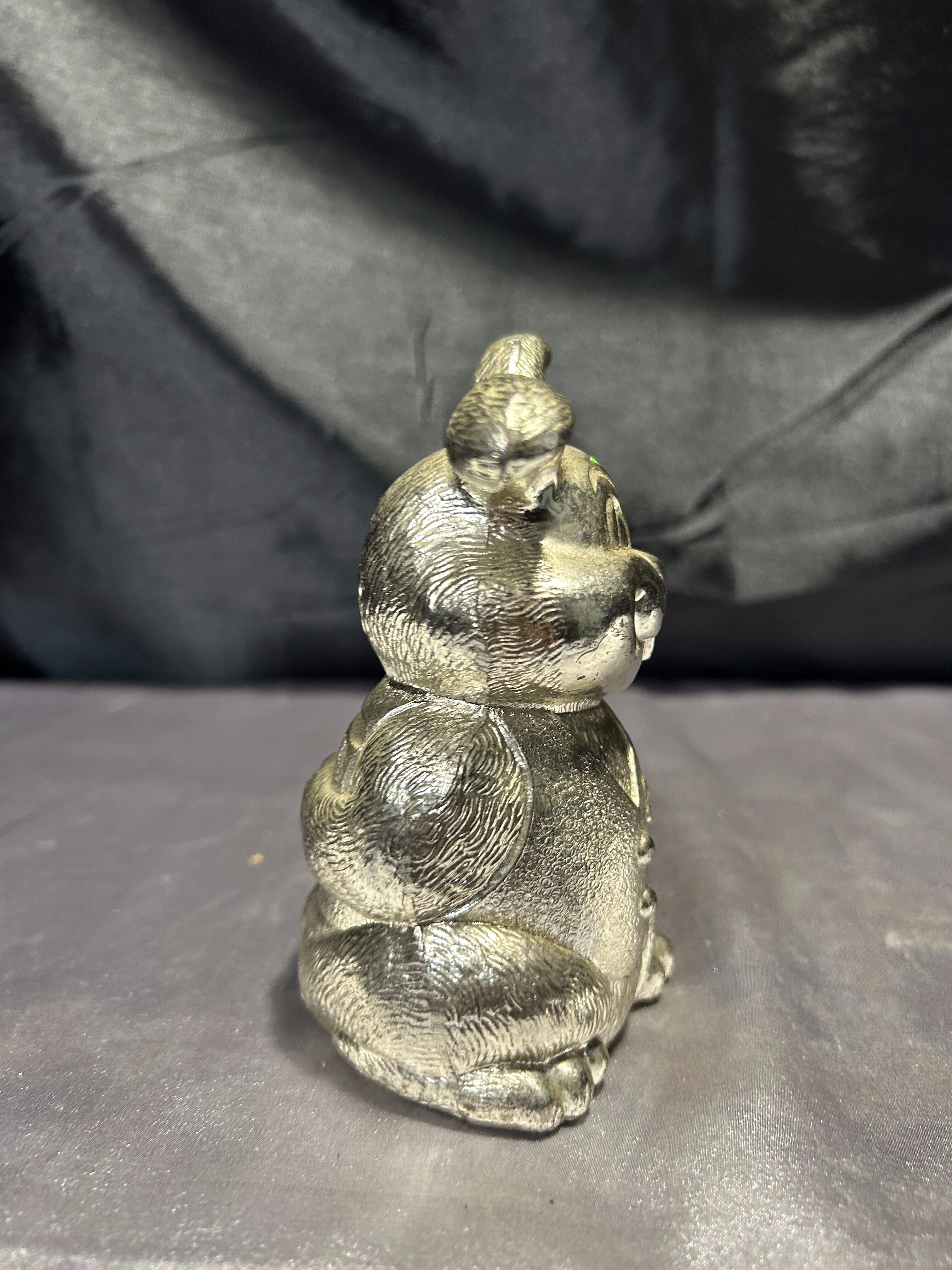 Przedstawiam uroczą skarbonkę w kształcie uśmiechniętego zająca, wykonaną z mosiądzu pobiał.
