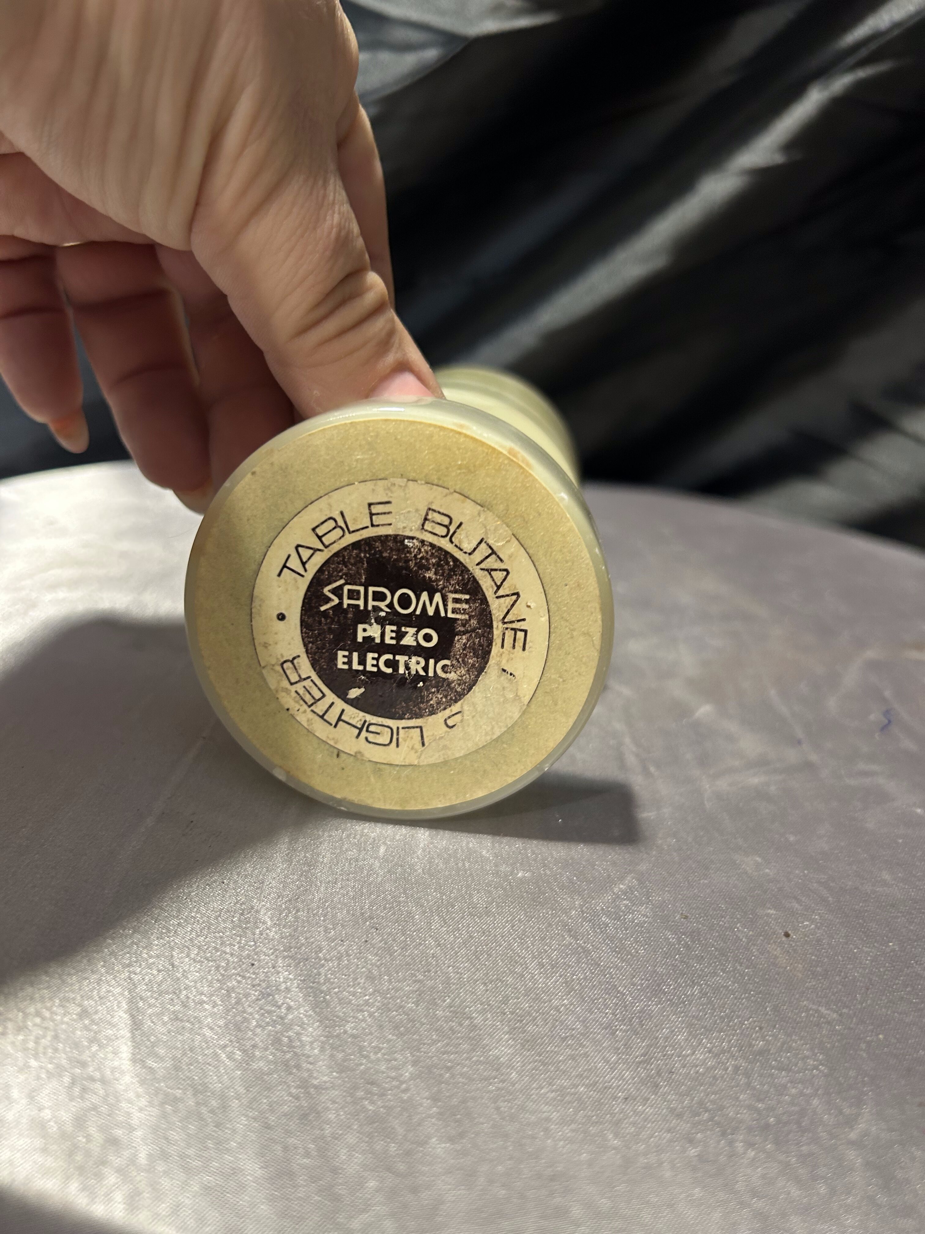 Elegancka zapalniczka stołowa z lat 60.–70., wykonana z naturalnego onyksu i wyposażona w mechanizm piezoelektryczny marki Sarome. Onyks o subtelnych, warstwowych przejściach barw tworzy wyjątkową, luksusową formę, charakterystyczną dla designerskich wyrobów z połowy XX wieku.