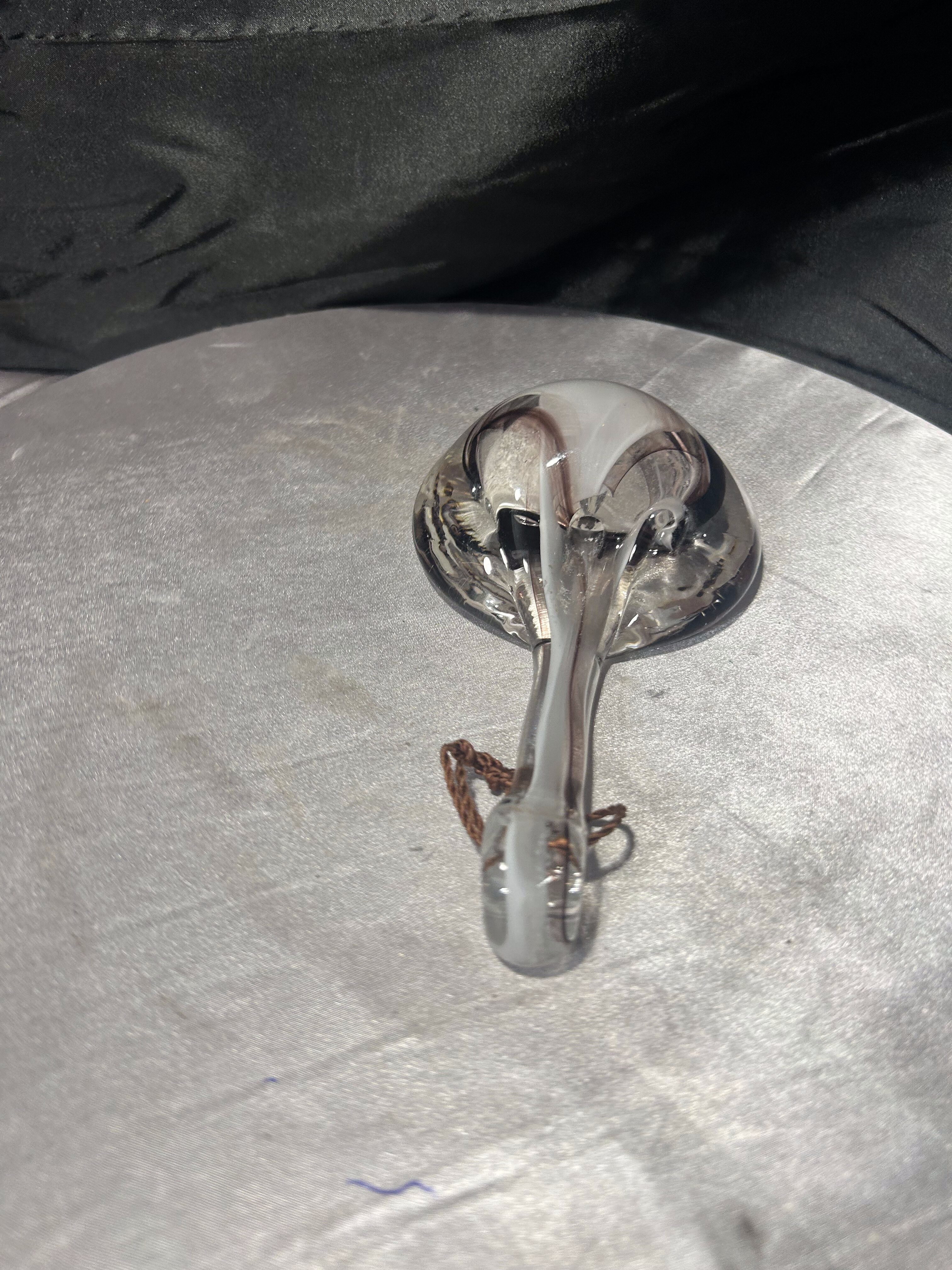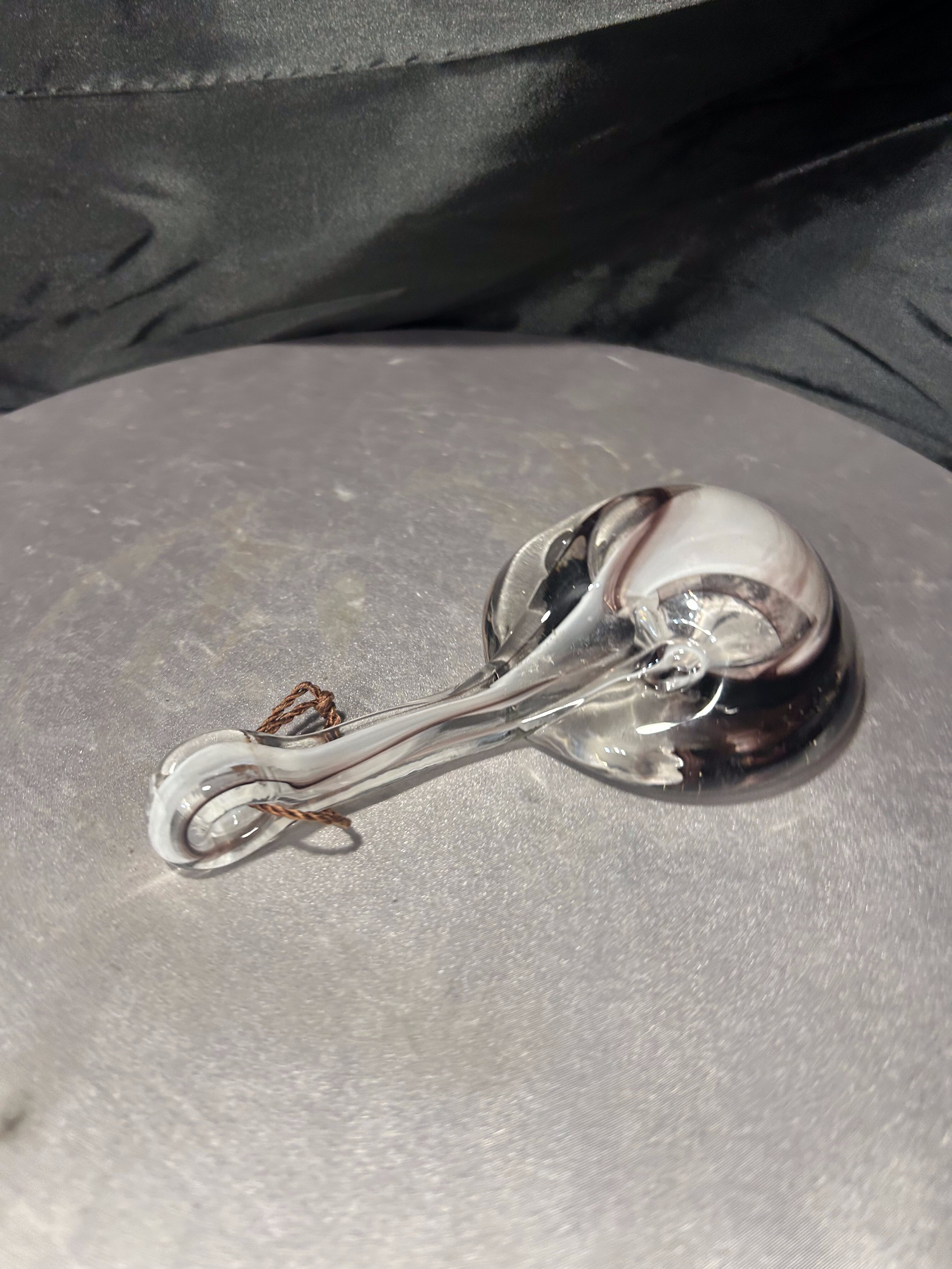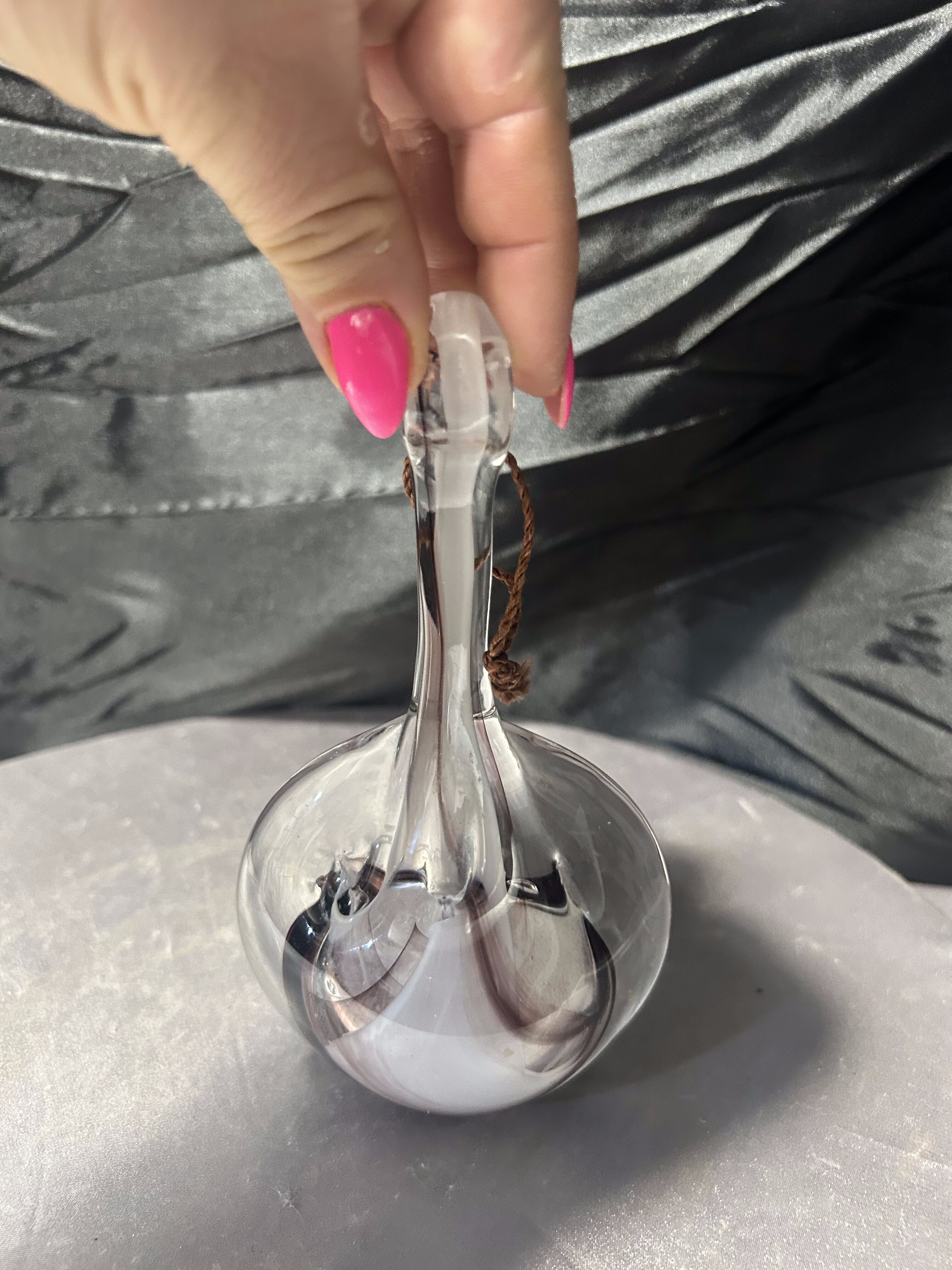 Dekoracyjna zawieszka ścienna wykonana ze szkła artystycznego, o organicznej, rzeźbiarskiej formie. Przedmiot łączy w sobie walory użytkowe i dekoracyjne – może pełnić funkcję świecznika na cienką świeczkę lub subtelnego stojaka na kadzidełko. Transparentne szkło z mlecznymi i przydymionymi akcentami tworzy efekt głębi i światła, charakterystyczny dla ręcznie formowanego szkła artystycznego.