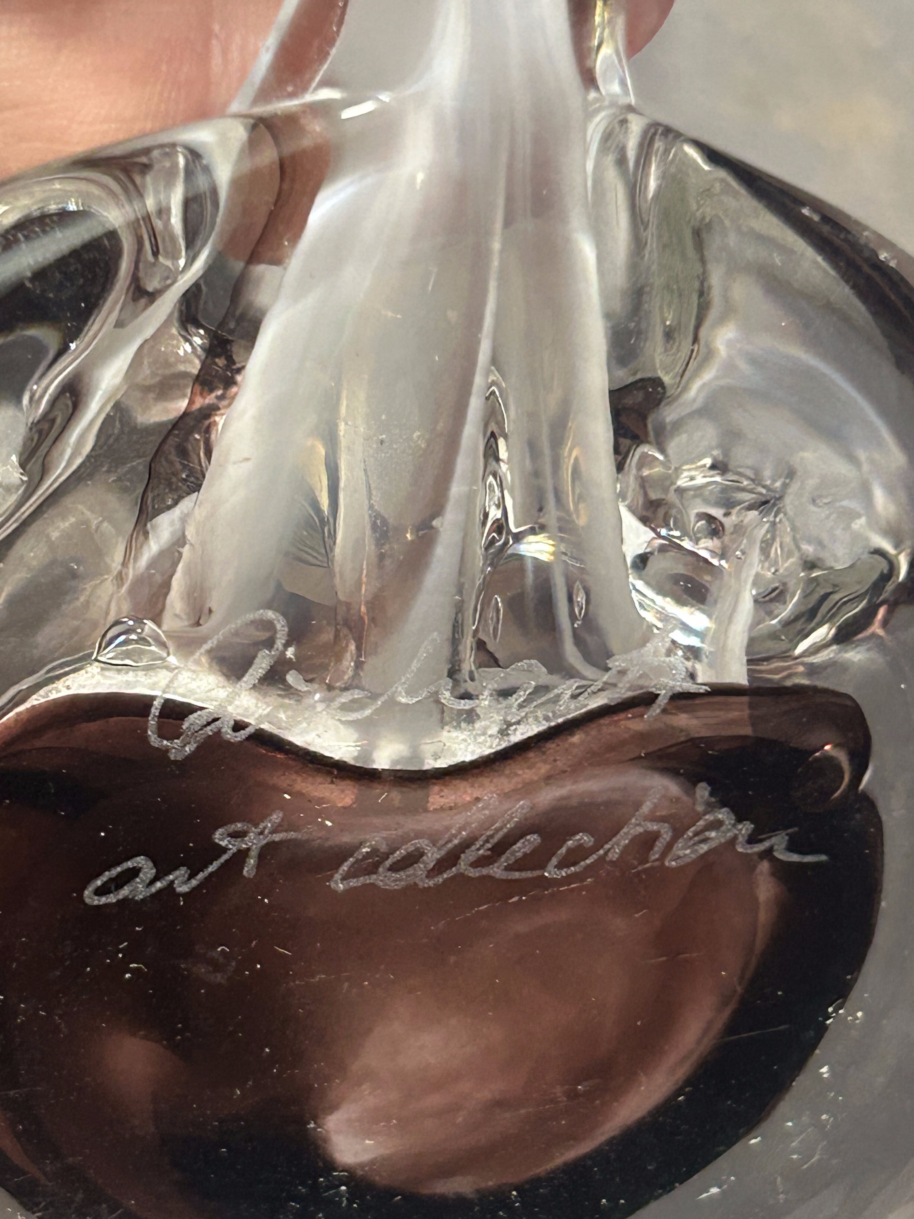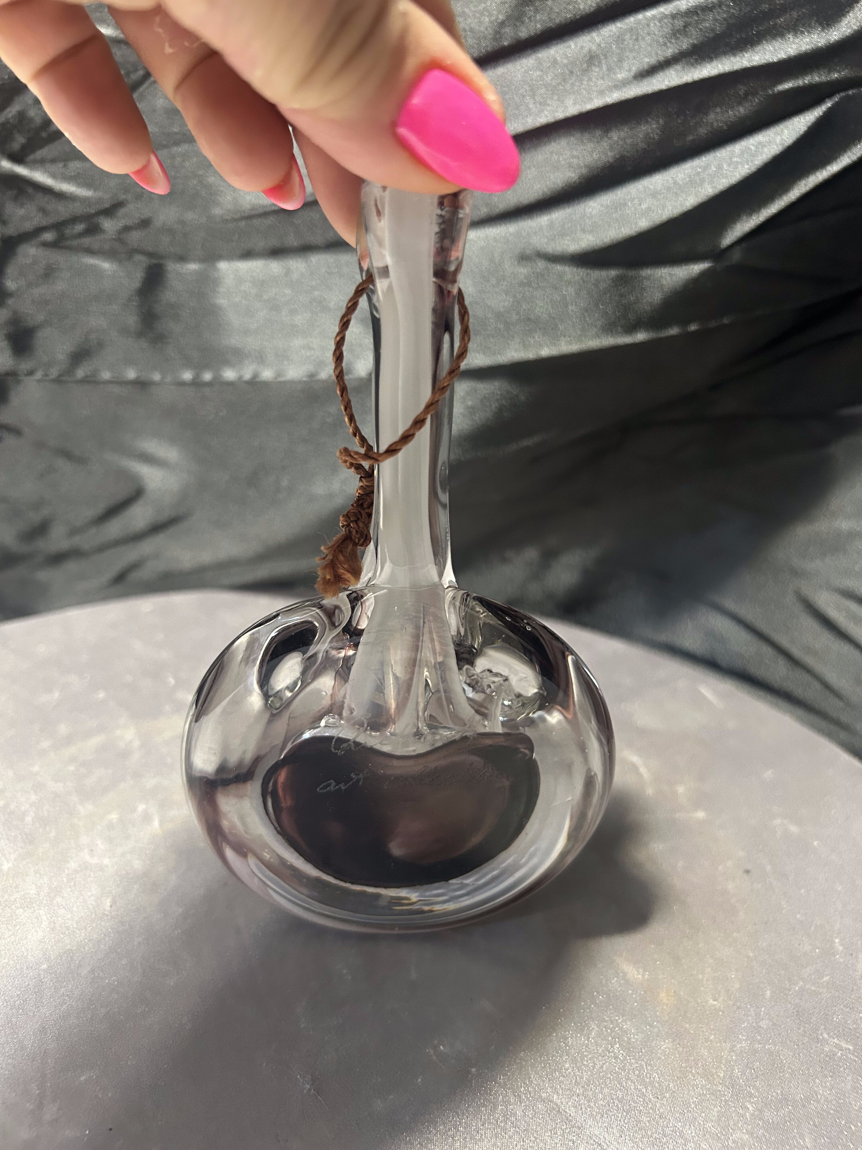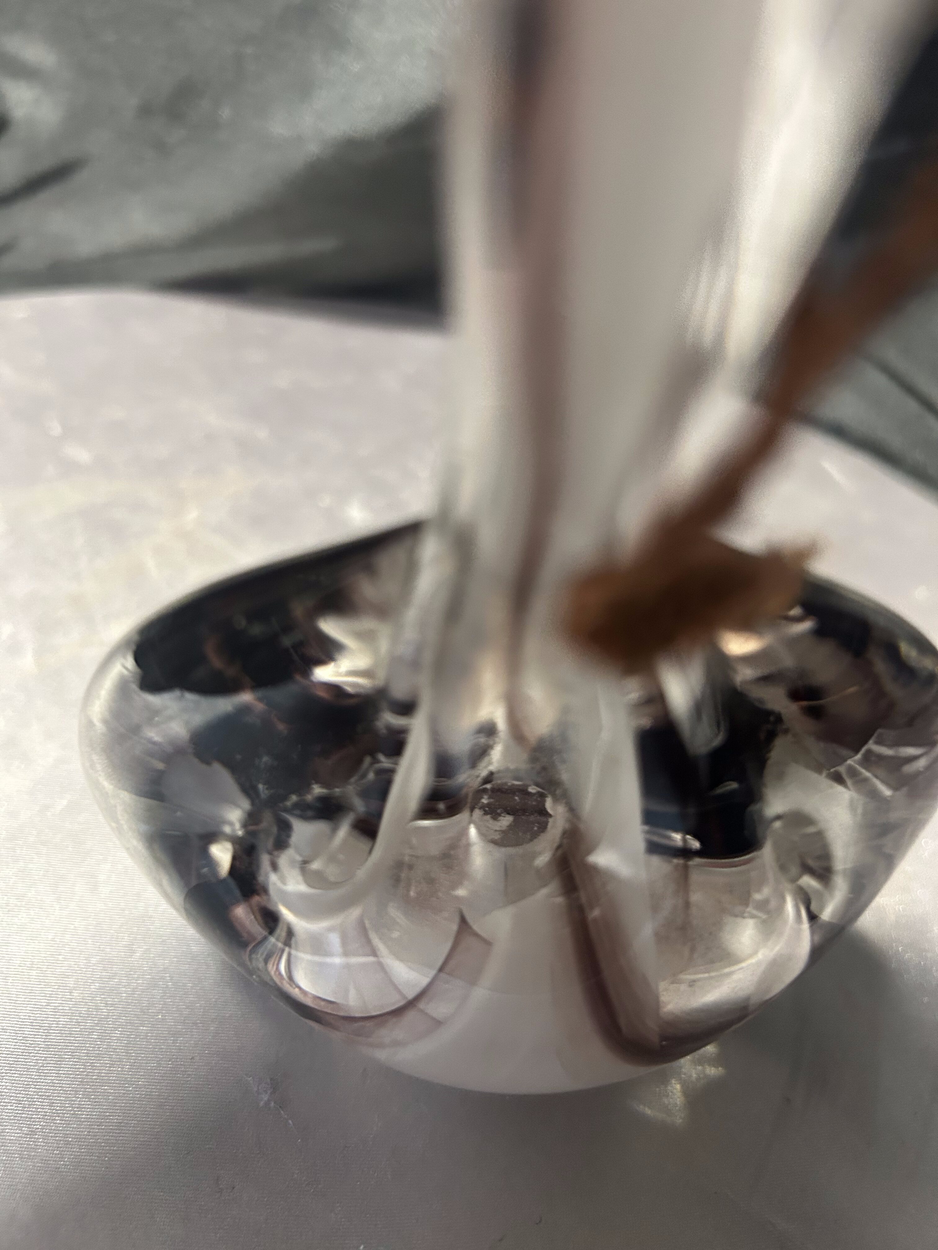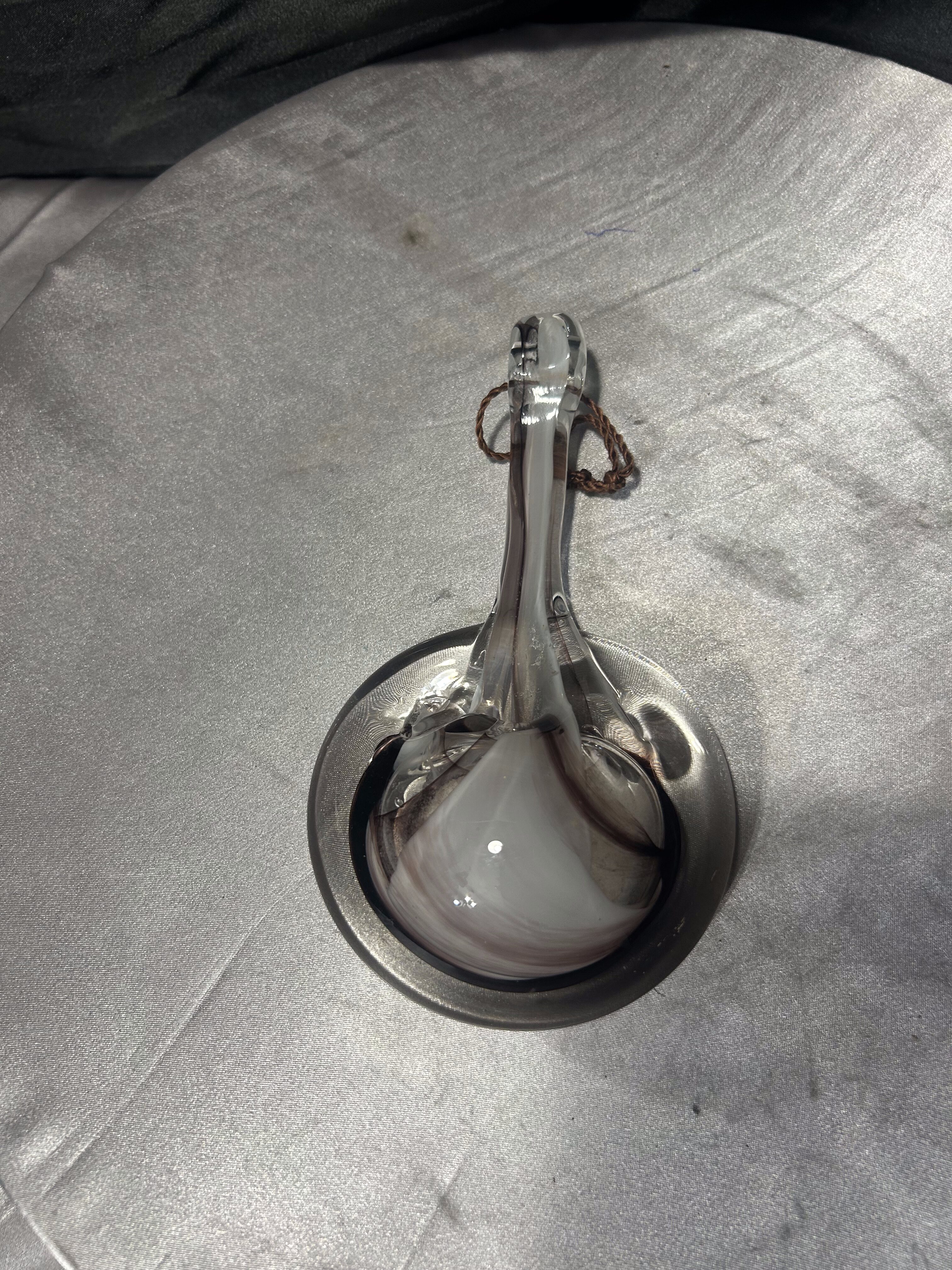 Dekoracyjna zawieszka ścienna wykonana ze szkła artystycznego, o organicznej, rzeźbiarskiej formie. Przedmiot łączy w sobie walory użytkowe i dekoracyjne – może pełnić funkcję świecznika na cienką świeczkę lub subtelnego stojaka na kadzidełko. Transparentne szkło z mlecznymi i przydymionymi akcentami tworzy efekt głębi i światła, charakterystyczny dla ręcznie formowanego szkła artystycznego.