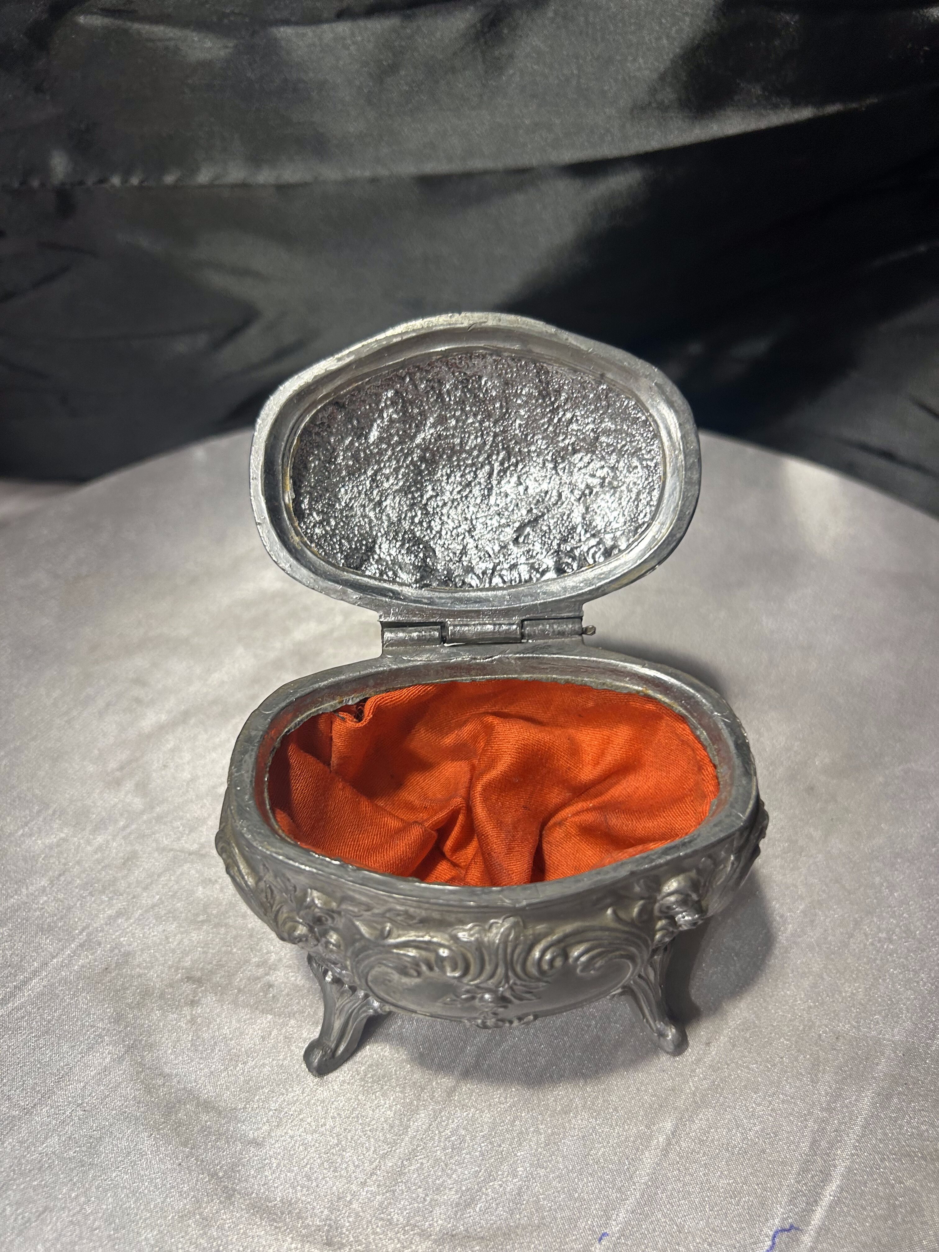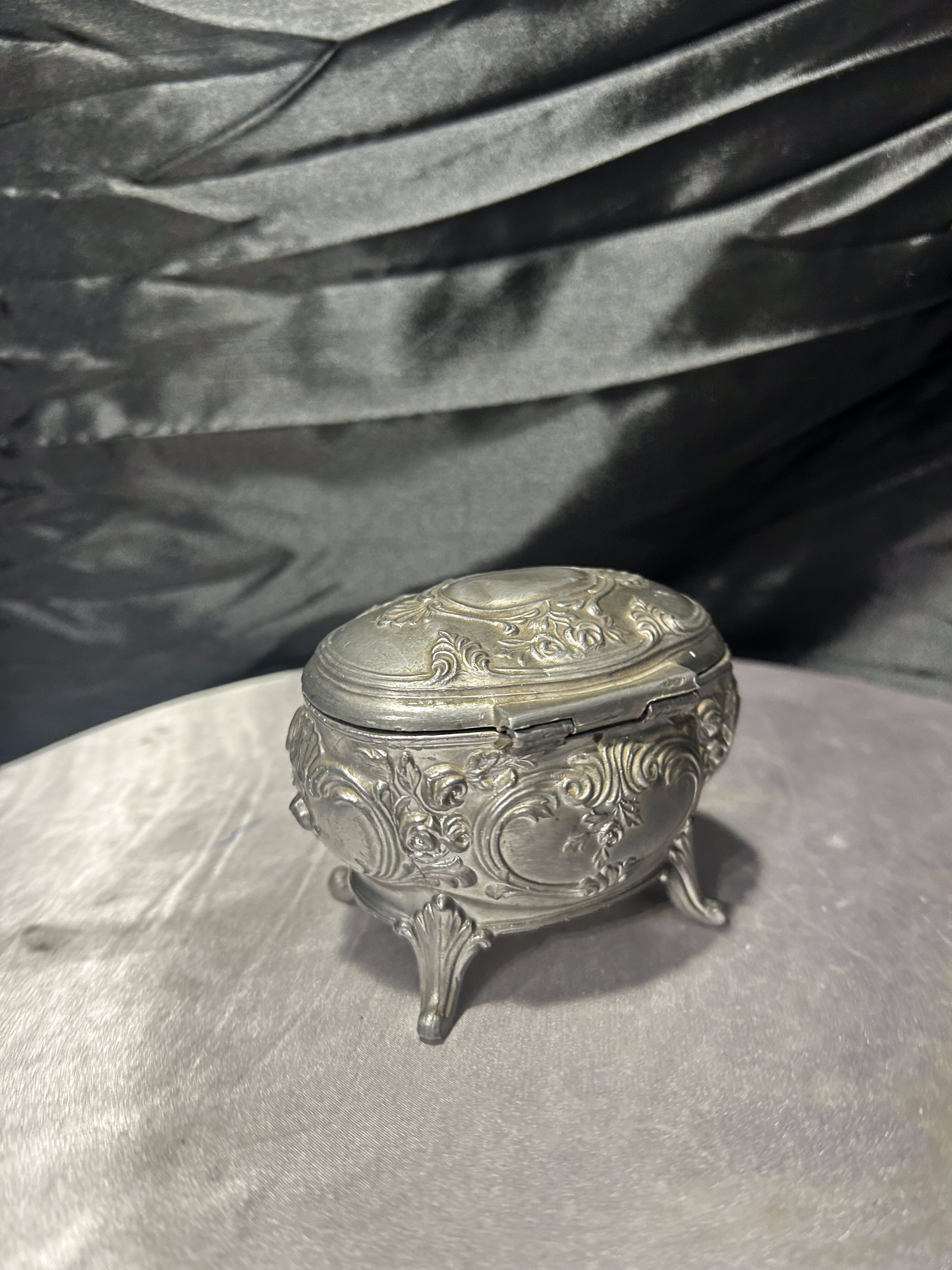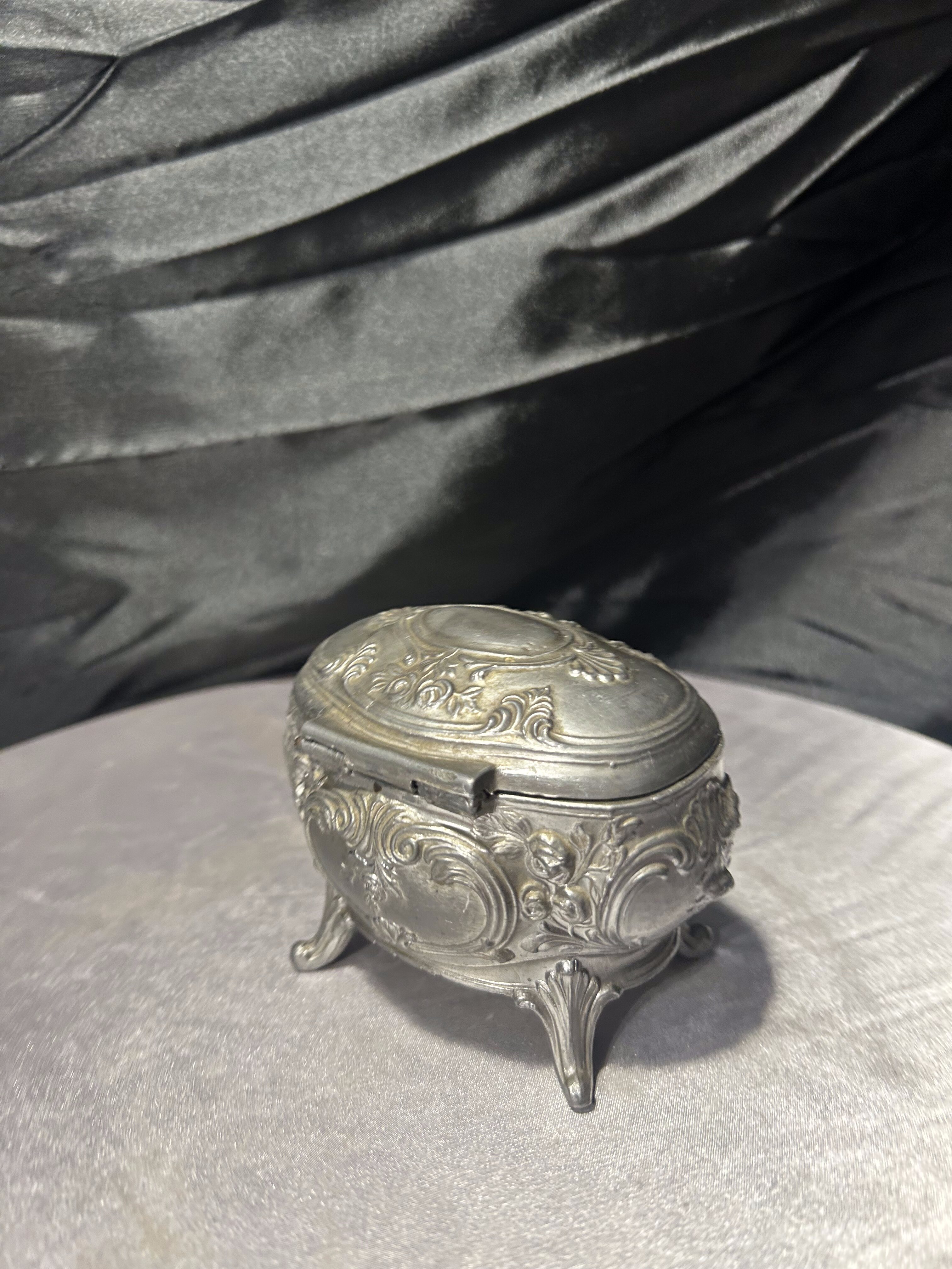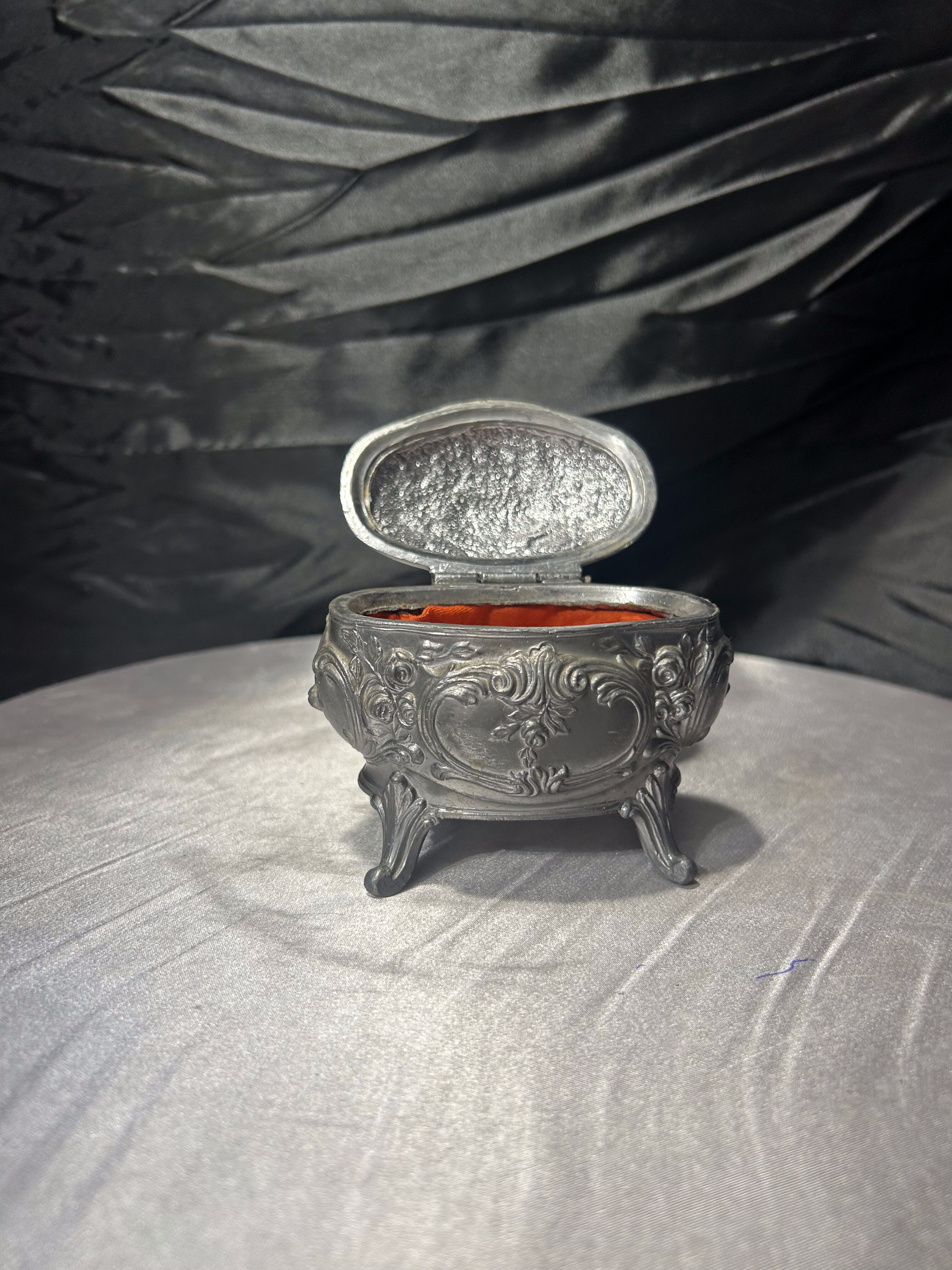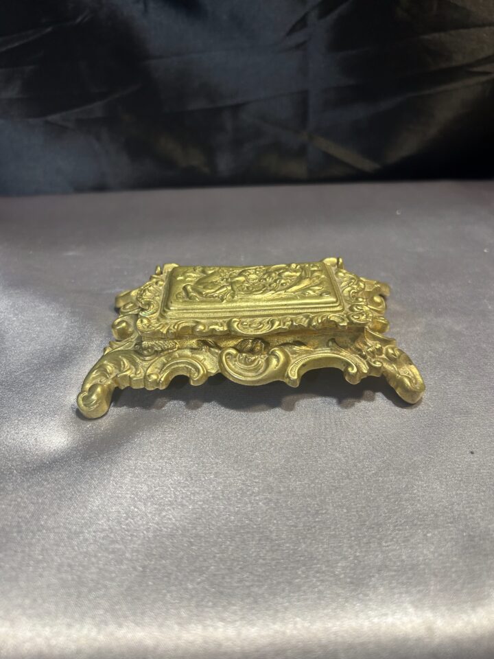 Elegancka, zdobiona szkatułka o dekoracyjnej formie inspirowanej klasycznym wzornictwem. Korpus osadzony na czterech delikatnych nóżkach, bogato ornamentowany motywami roślinnymi, prezentuje się szlachetnie i ponadczasowo. Wnętrze zostało wyłożone miękkim materiałem, dzięki czemu szkatułka świetnie sprawdzi się do przechowywania biżuterii lub drobnych pamiątek. Wykonana prawdopodobnie z mosiądzu pobiał, co dodaje jej eleganckiego, „srebrzystego” wykończenia.