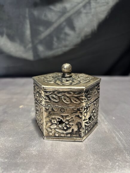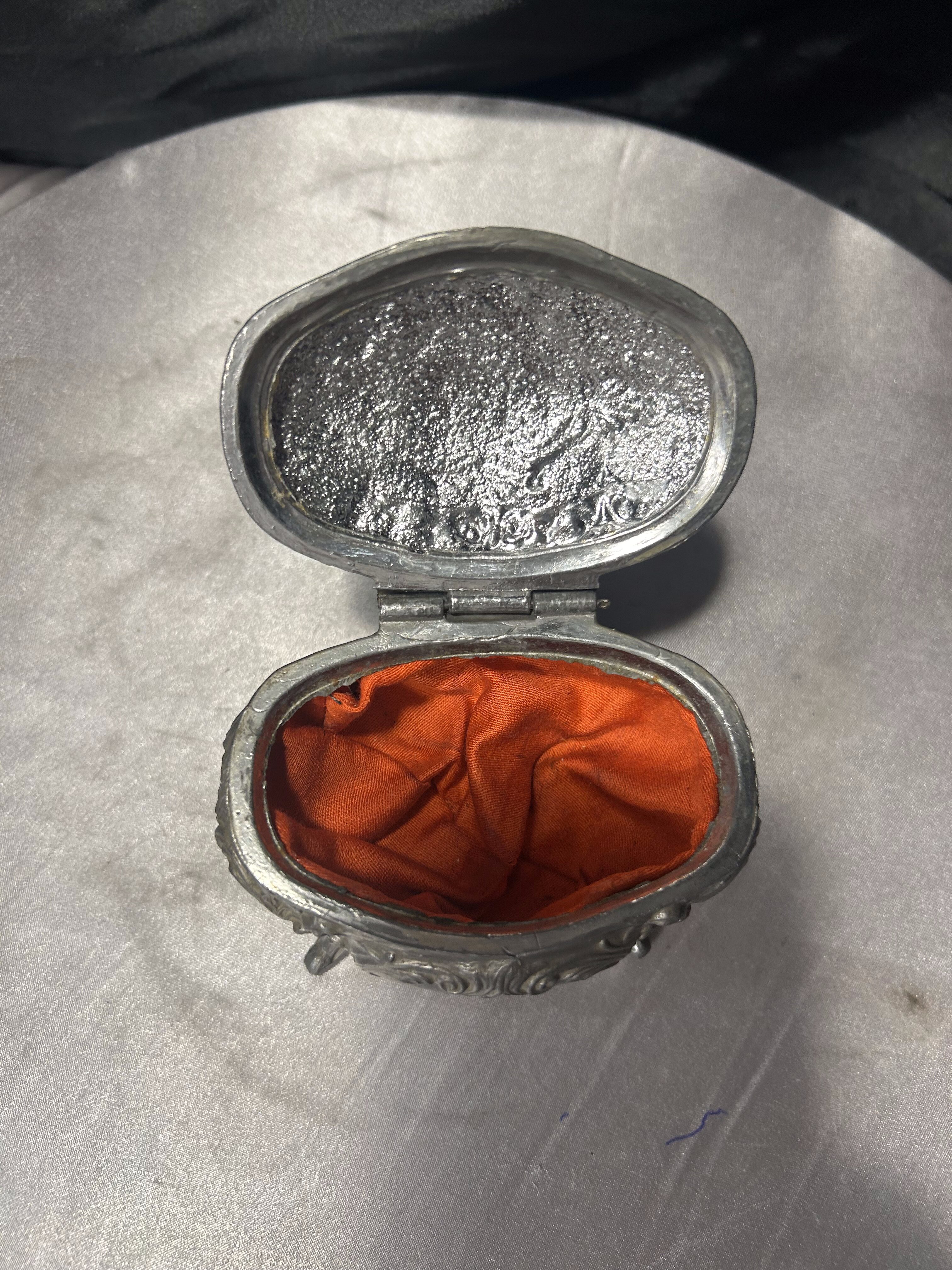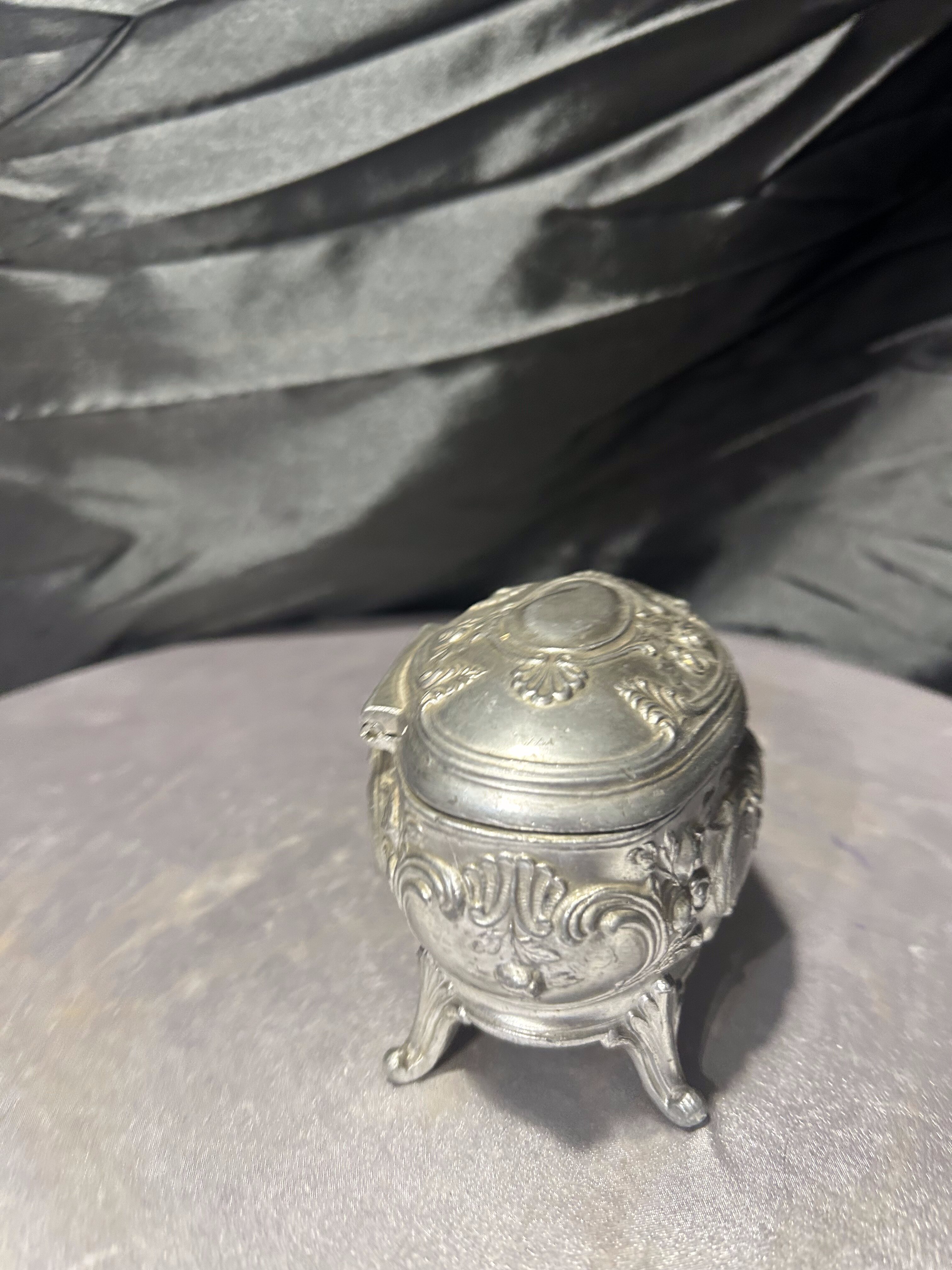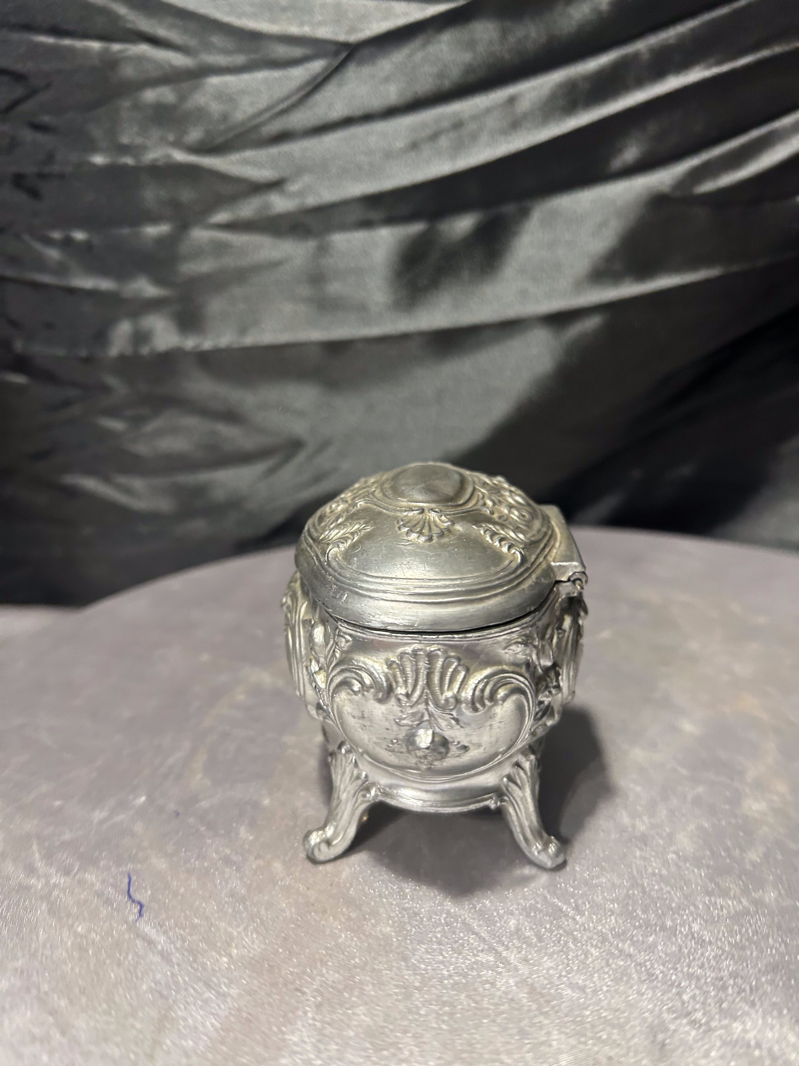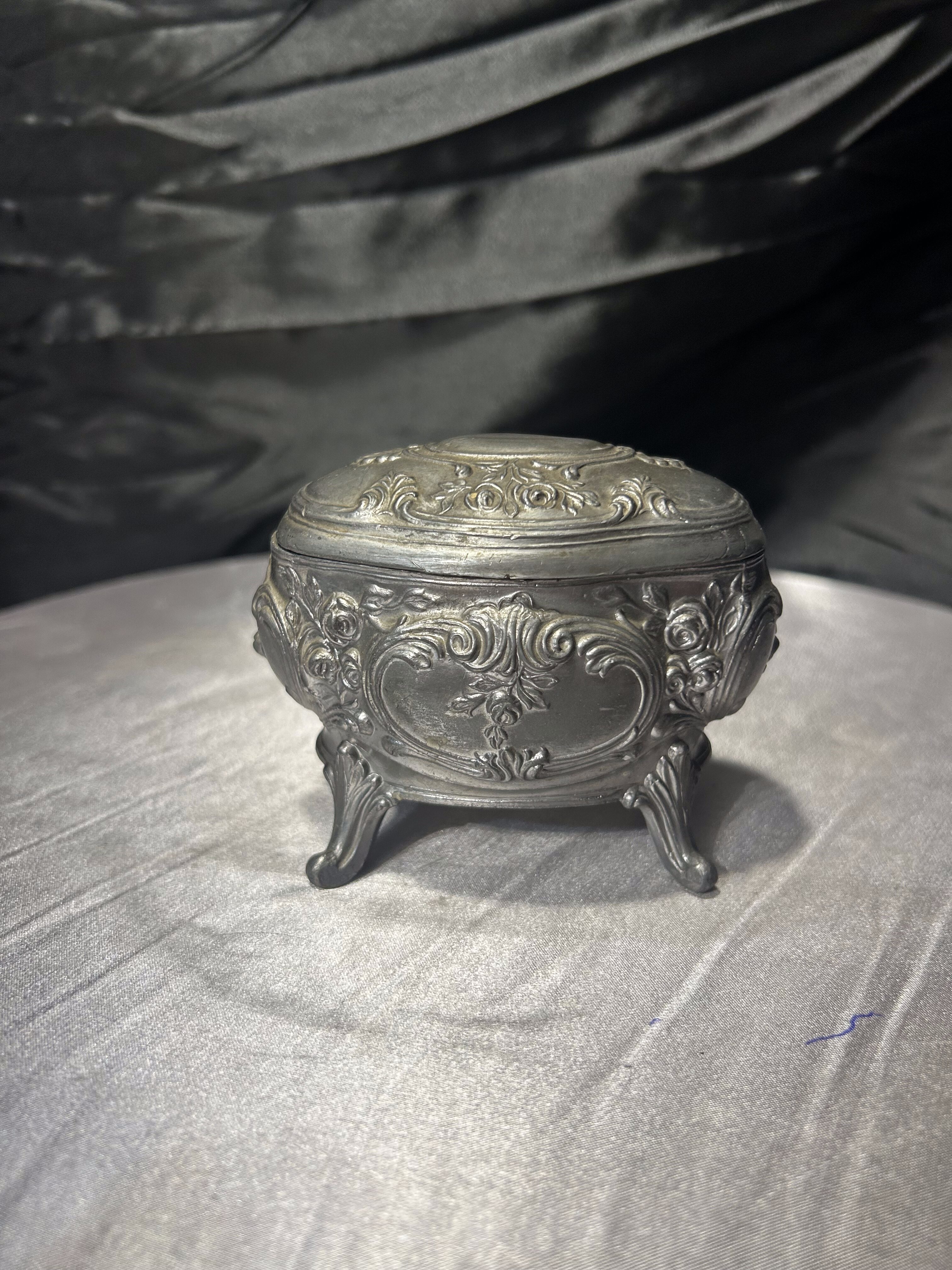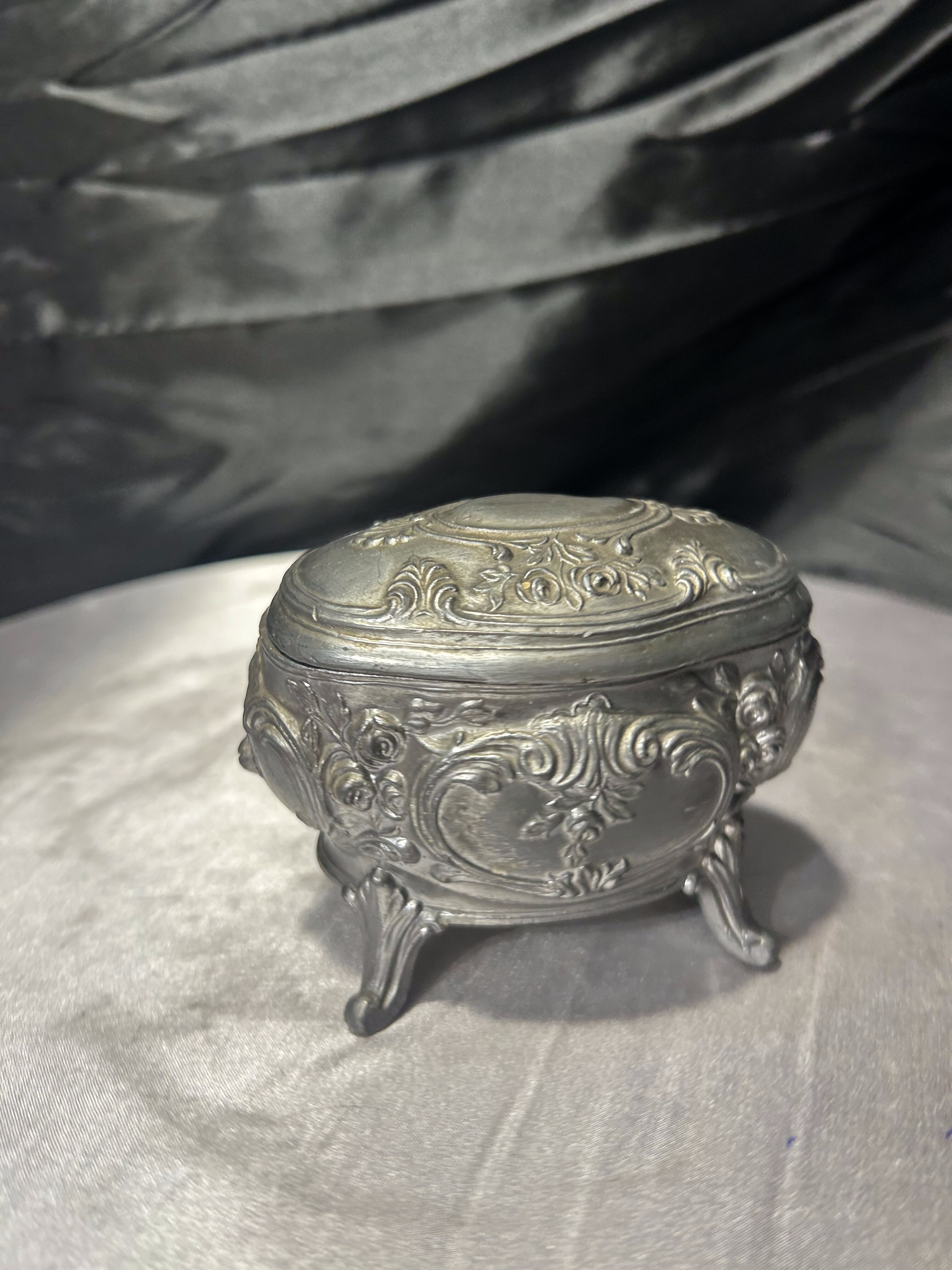 Elegancka, zdobiona szkatułka o dekoracyjnej formie inspirowanej klasycznym wzornictwem. Korpus osadzony na czterech delikatnych nóżkach, bogato ornamentowany motywami roślinnymi, prezentuje się szlachetnie i ponadczasowo. Wnętrze zostało wyłożone miękkim materiałem, dzięki czemu szkatułka świetnie sprawdzi się do przechowywania biżuterii lub drobnych pamiątek. Wykonana prawdopodobnie z mosiądzu pobiał, co dodaje jej eleganckiego, „srebrzystego” wykończenia.
