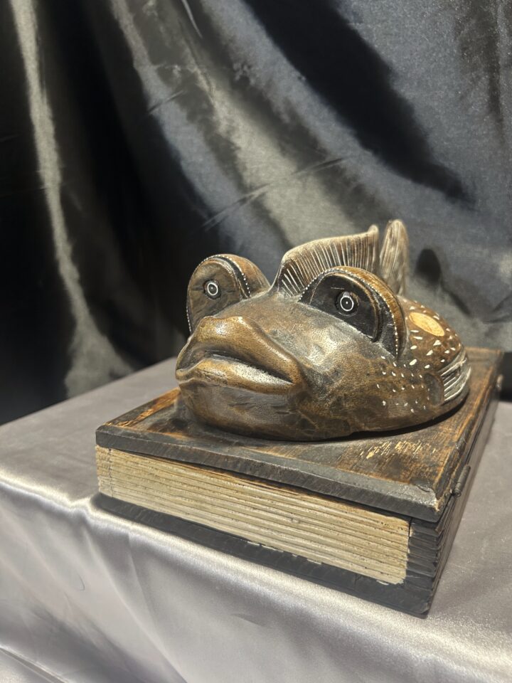 Drewniana szkatułka w formie książki z rybą – unikatowa ozdoba