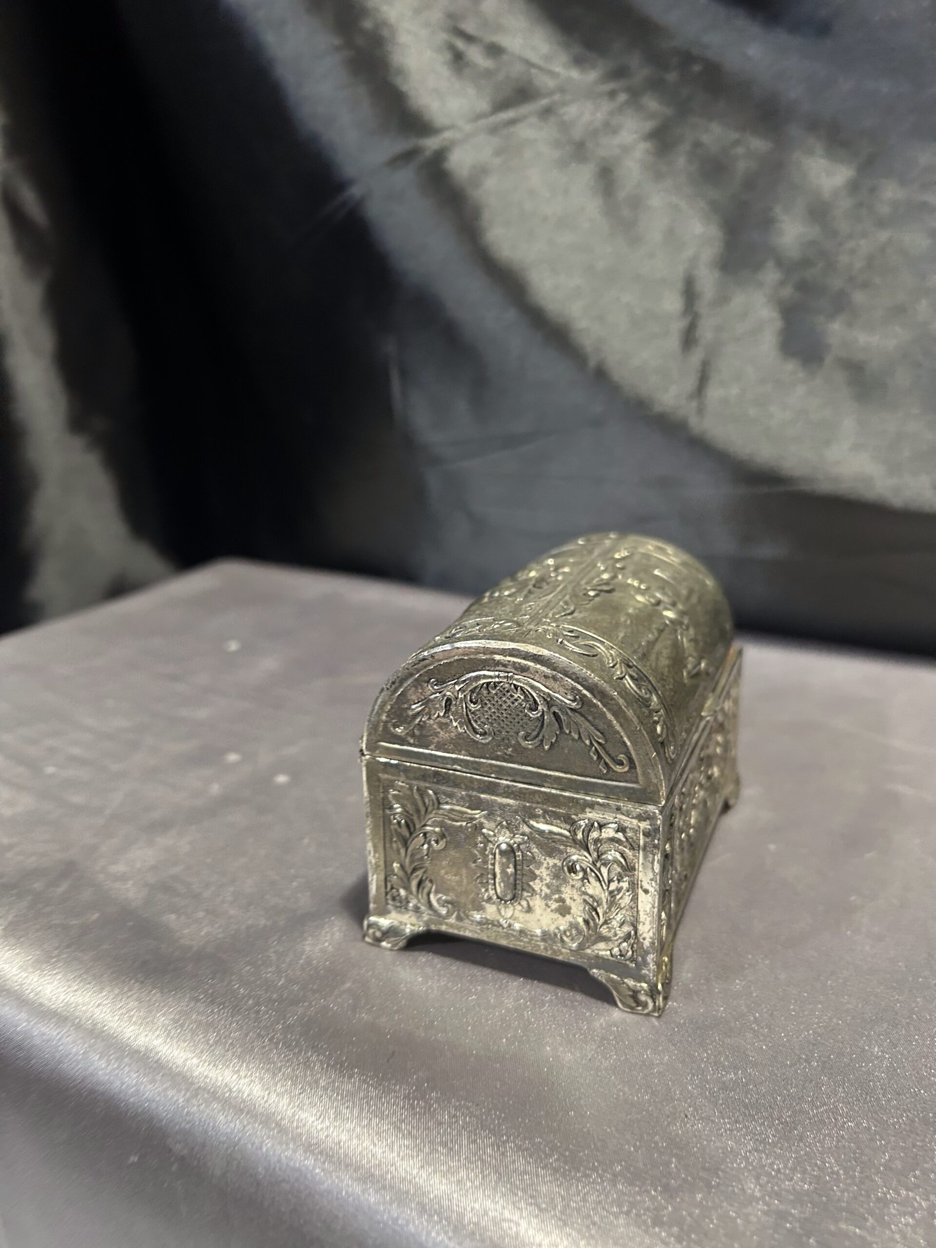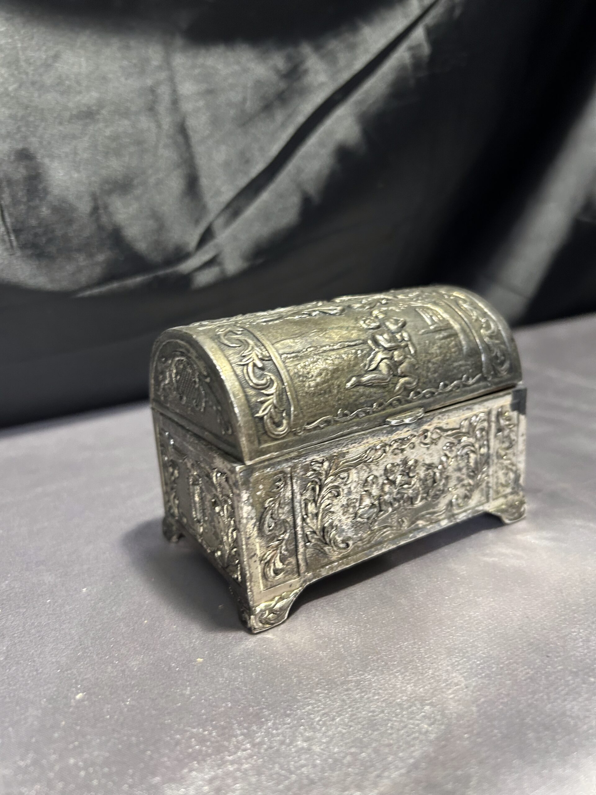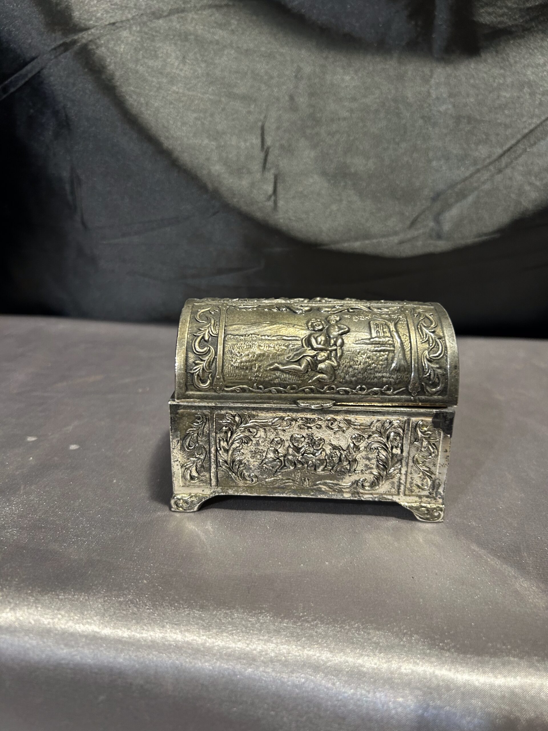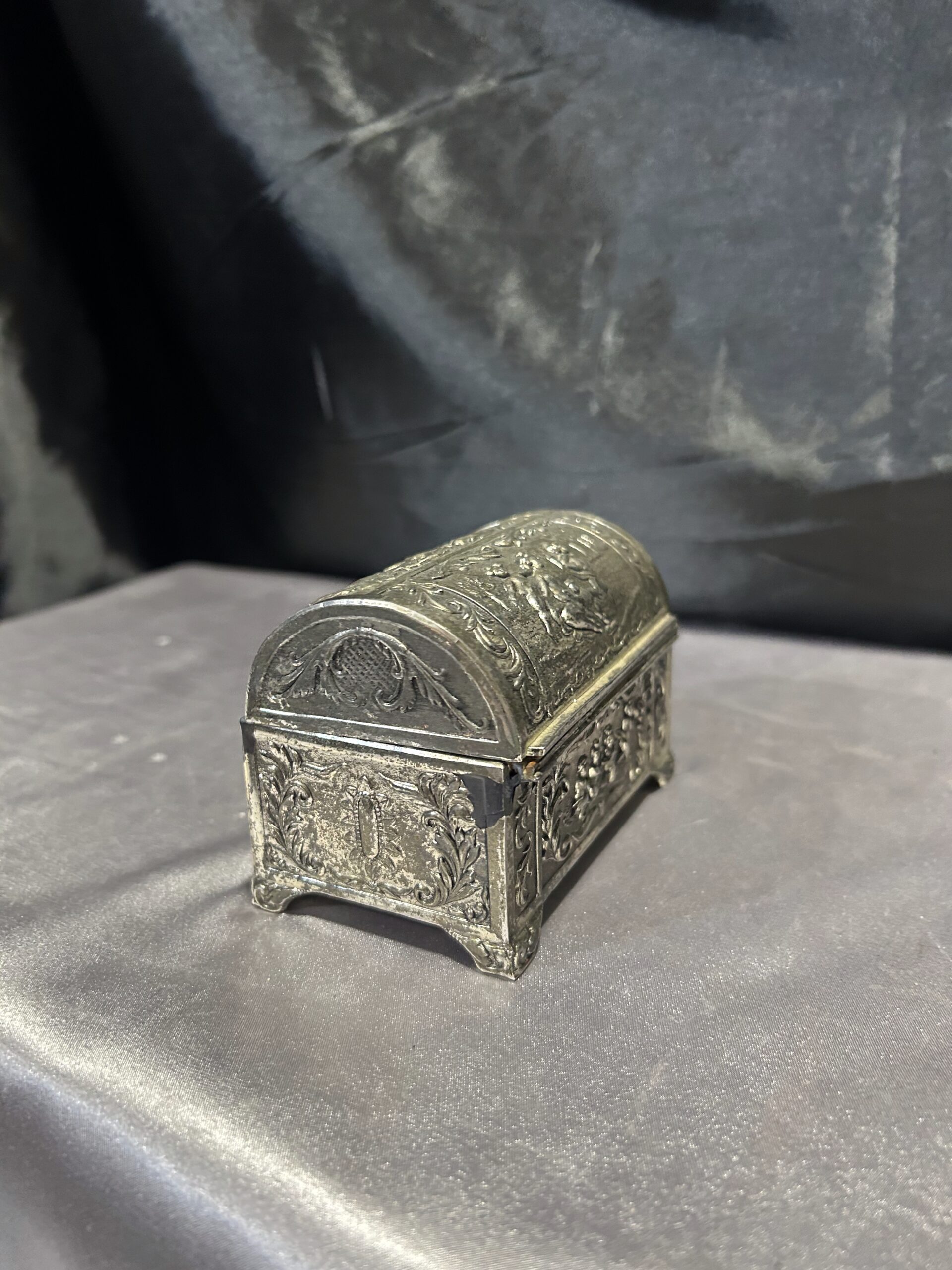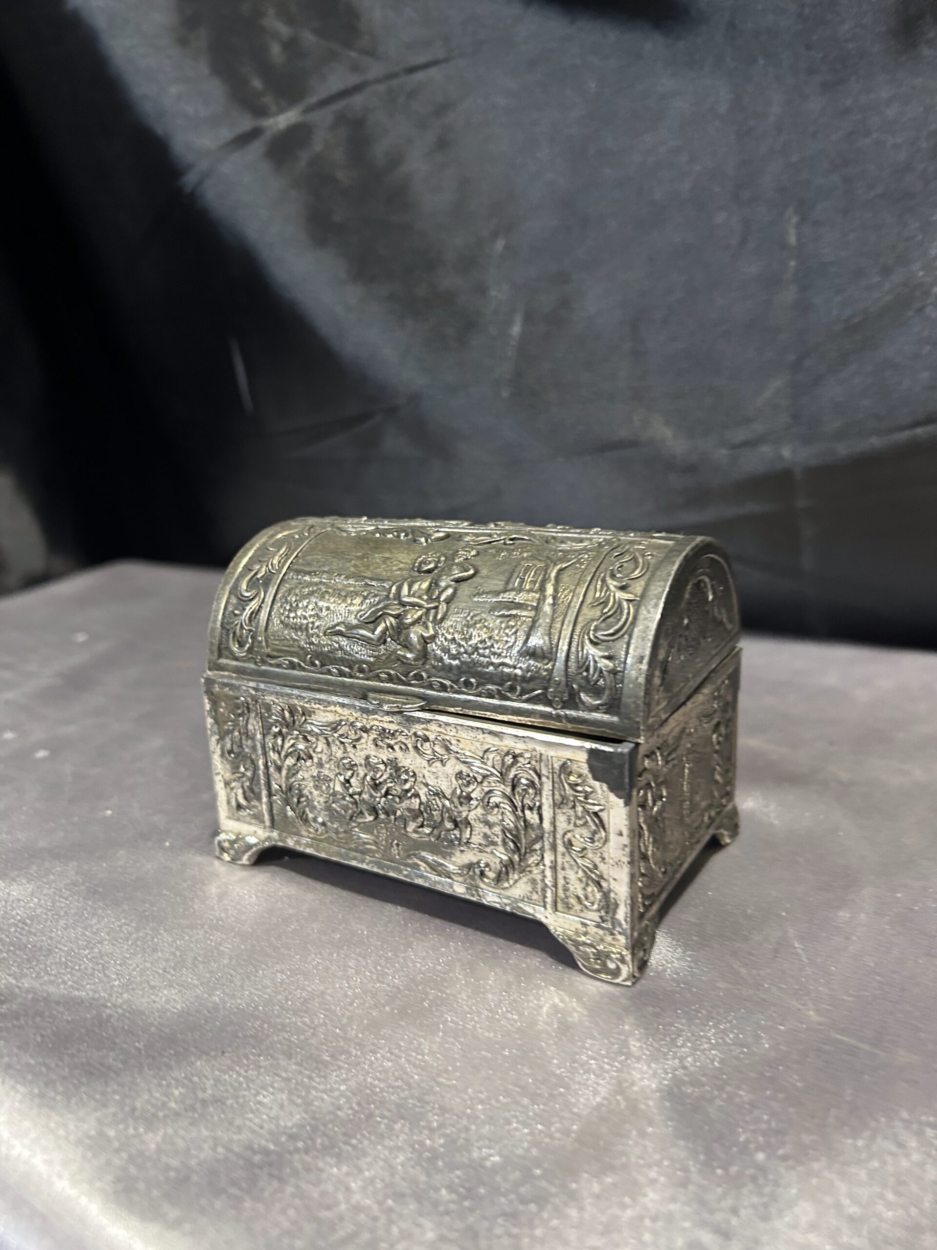 Tagi: dekoracyjna szkatułka, drewniane wnętrze, elegancka ozdoba, kolekcjonerski, mosiądz pobiał, motyw dzieci, nr 731/24, retro, styl vintage, szkatułka