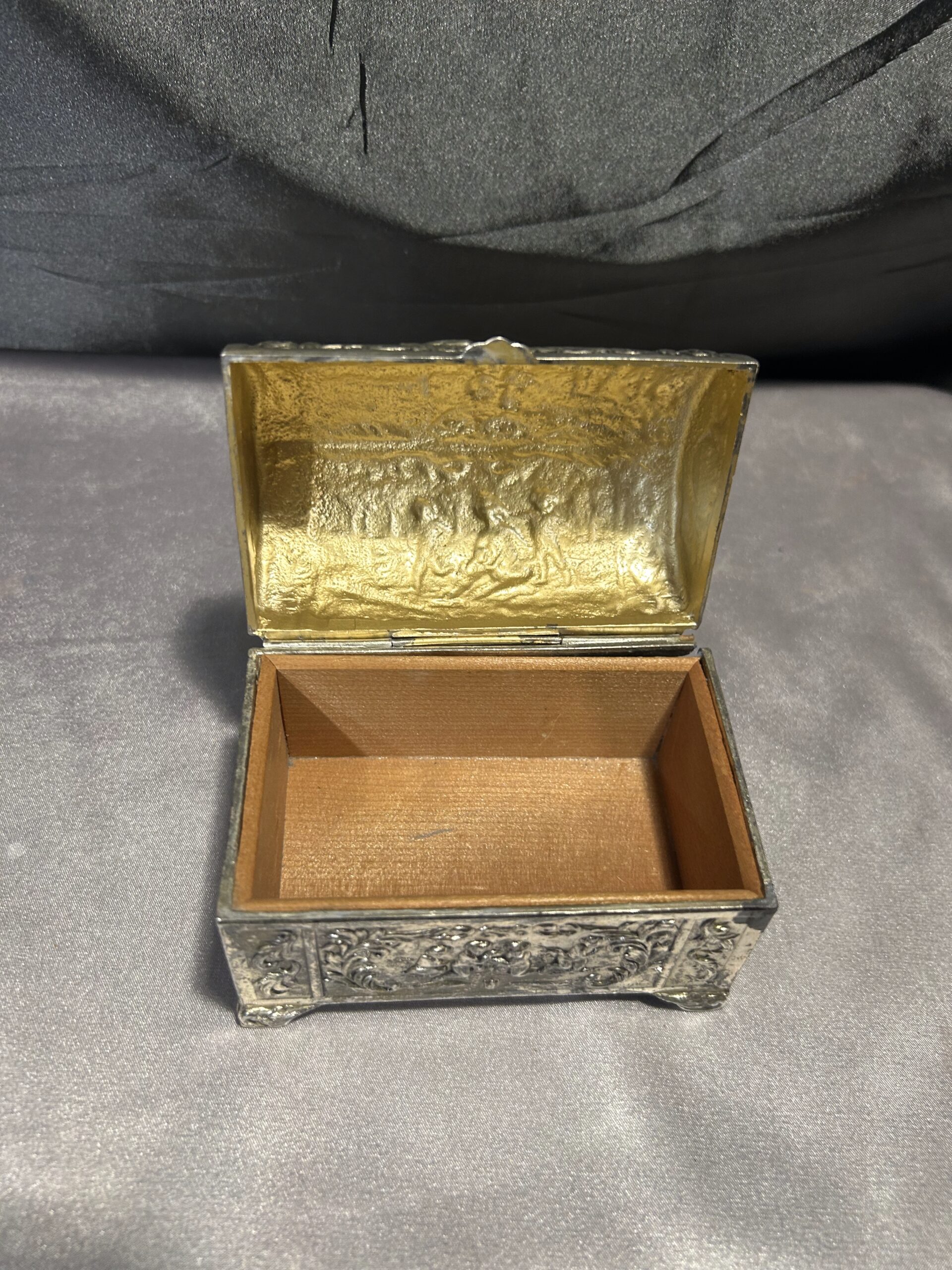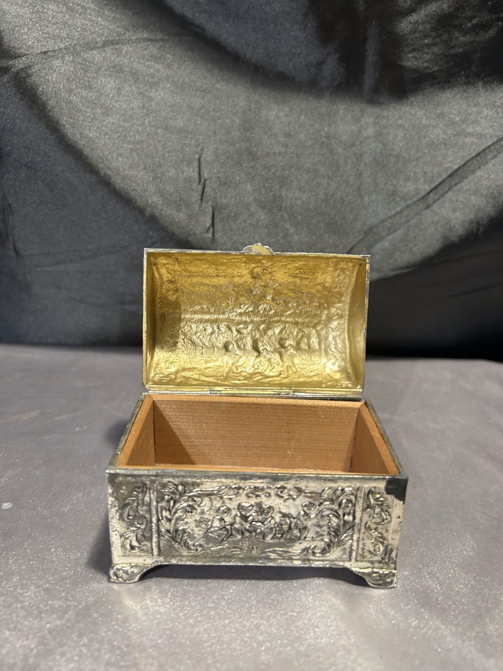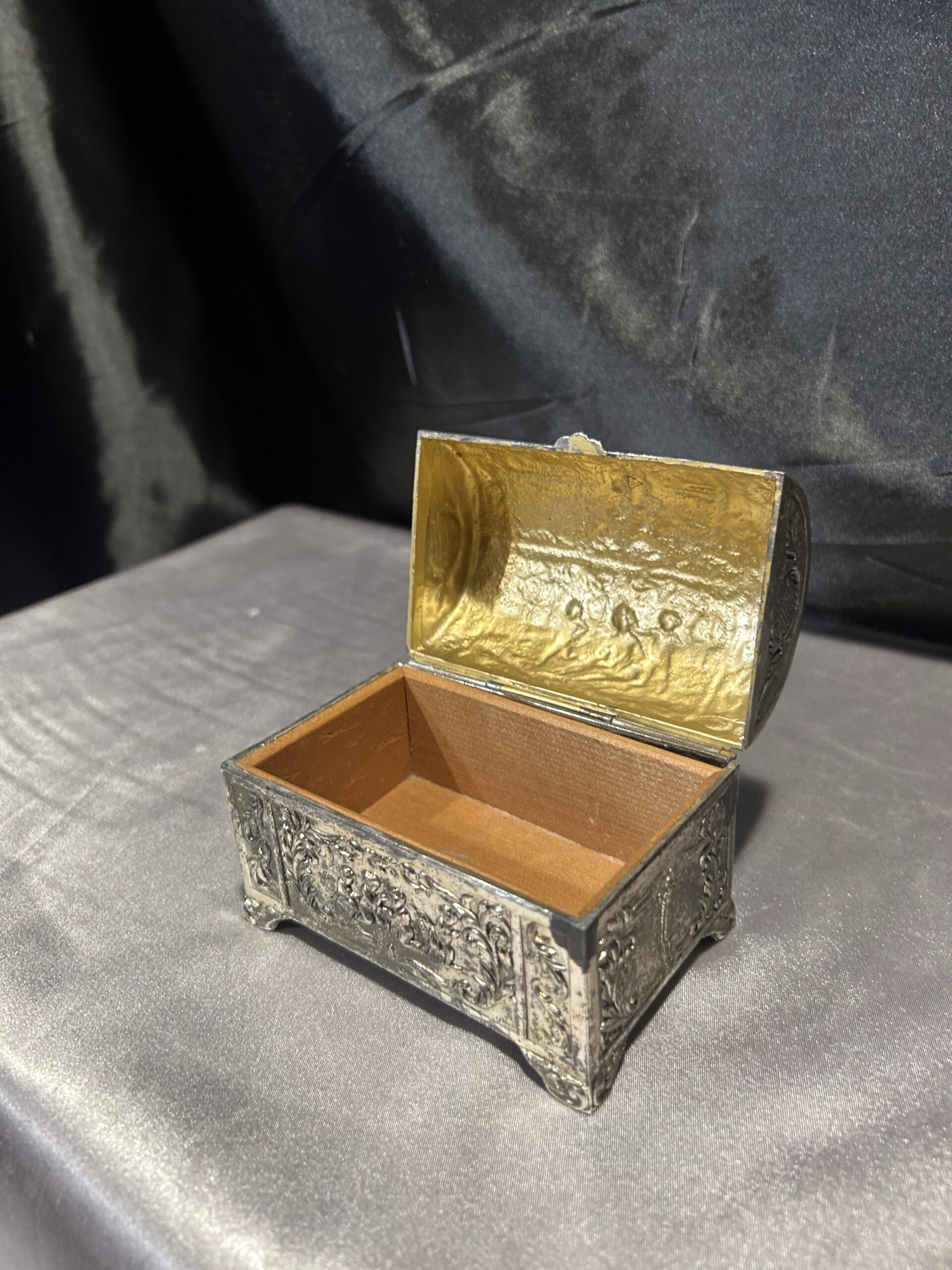 Przedmiotem oferty jest elegancka, zdobiona szkatułka, wykonana z mosiądzu pobiał, z wnętrzem wyłożonym drewnem. Jej wieczko ozdobione jest motywem dzieci, co nadaje jej wyjątkowego uroku i sentymentalnego charakteru. To piękny i funkcjonalny przedmiot, idealny do przechowywania biżuterii, drobiazgów lub jako element dekoracyjny.