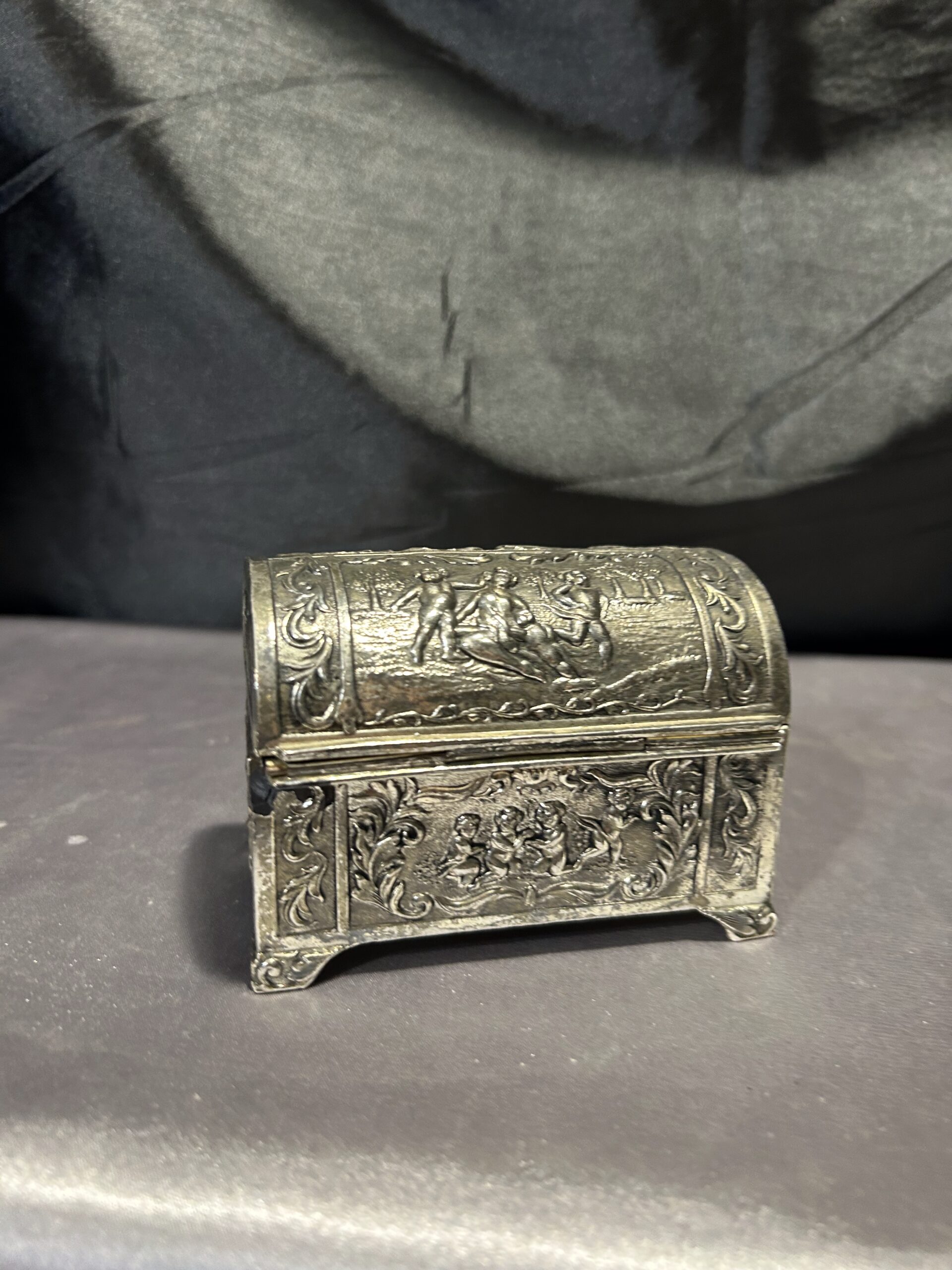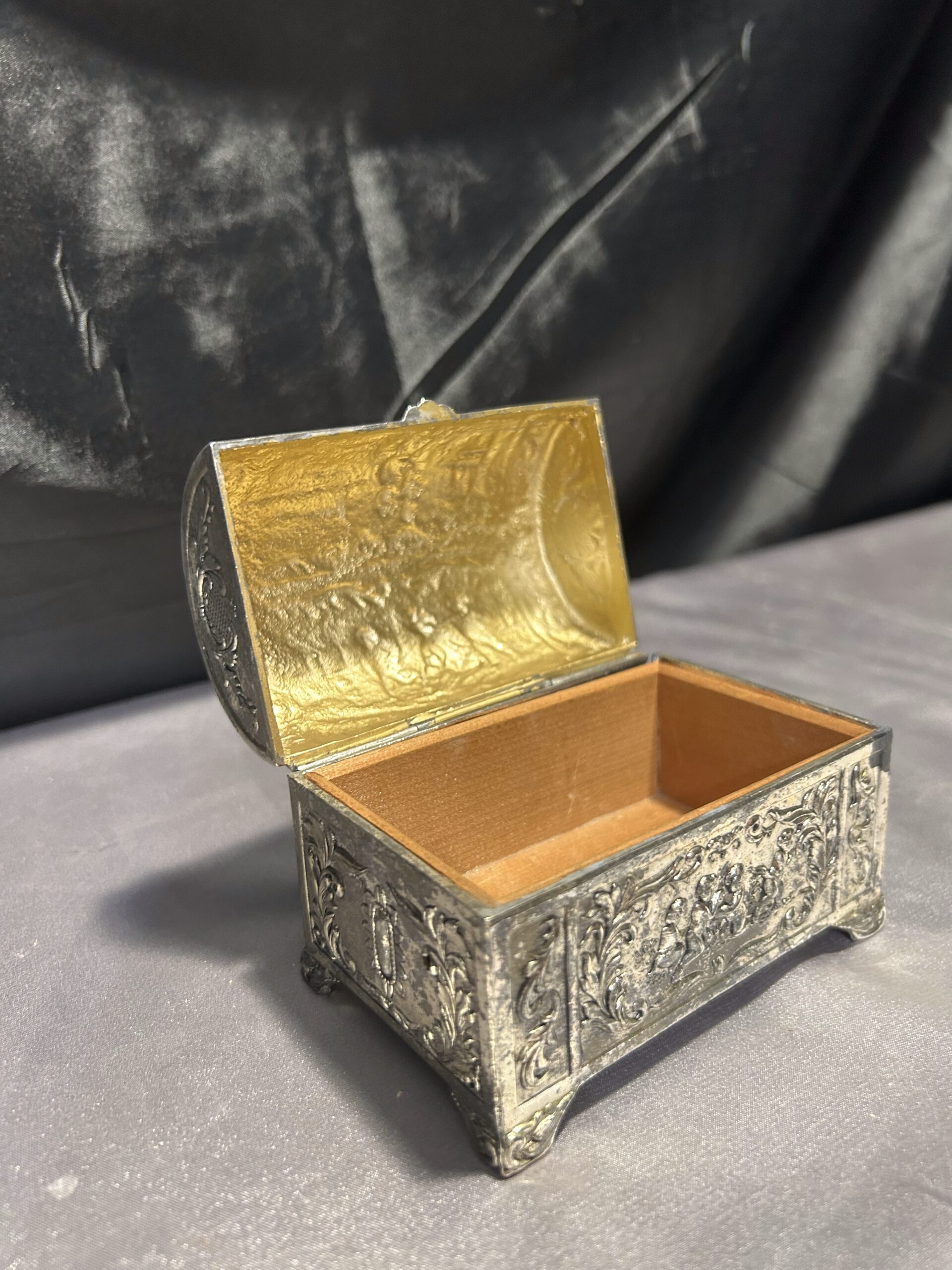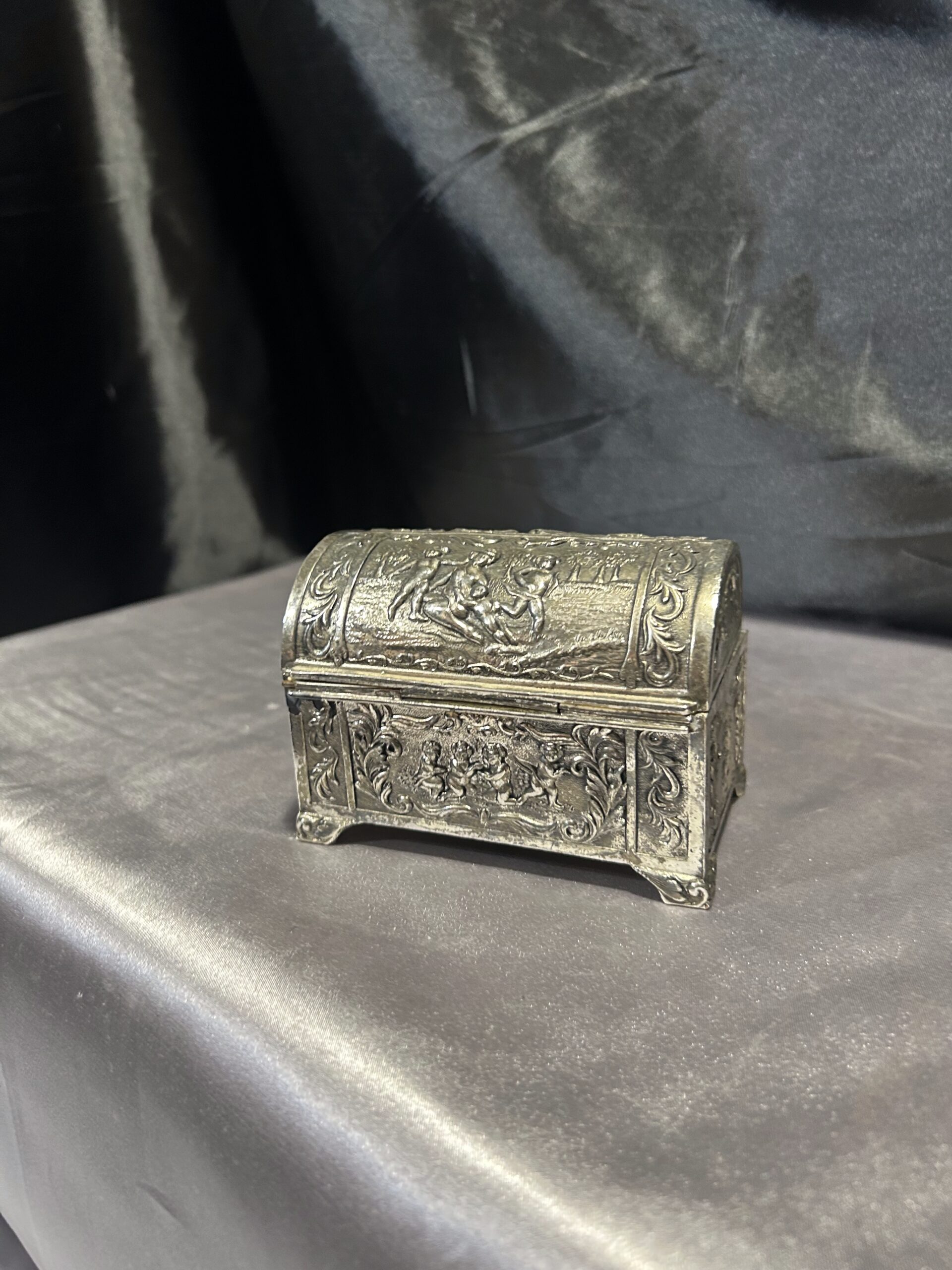Przedmiotem oferty jest elegancka, zdobiona szkatułka, wykonana z mosiądzu pobiał, z wnętrzem wyłożonym drewnem. Jej wieczko ozdobione jest motywem dzieci, co nadaje jej wyjątkowego uroku i sentymentalnego charakteru. To piękny i funkcjonalny przedmiot, idealny do przechowywania biżuterii, drobiazgów lub jako element dekoracyjny.