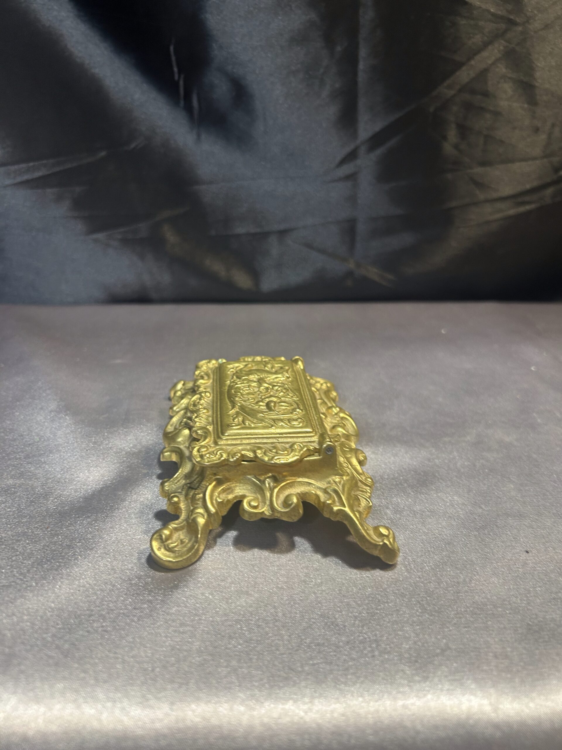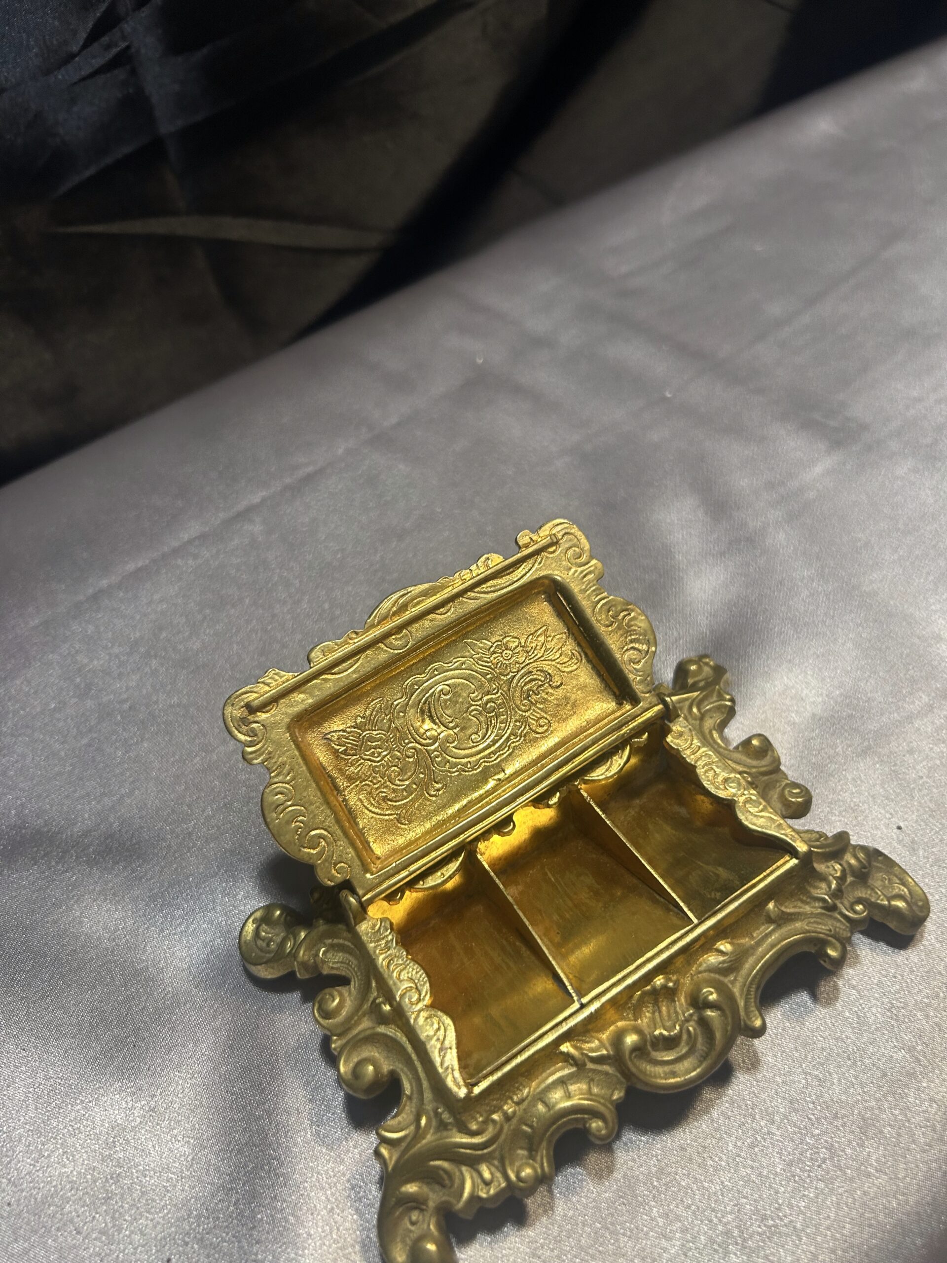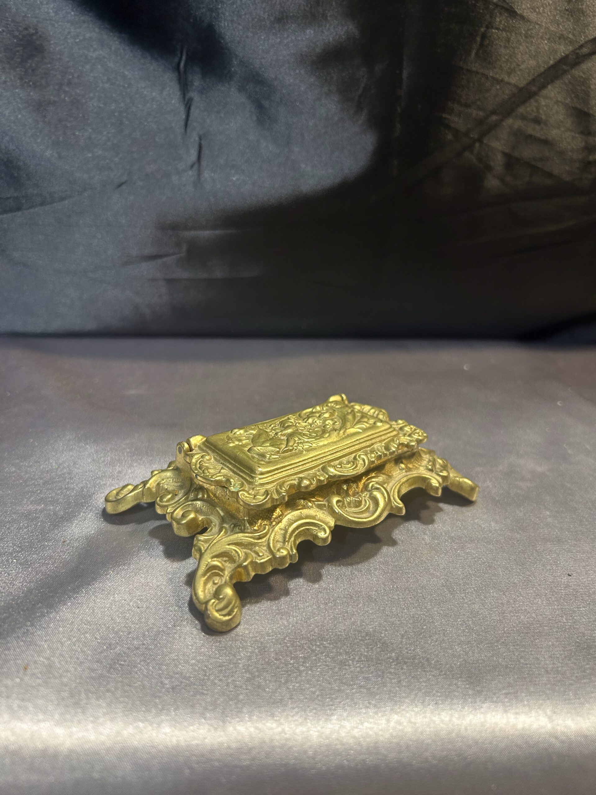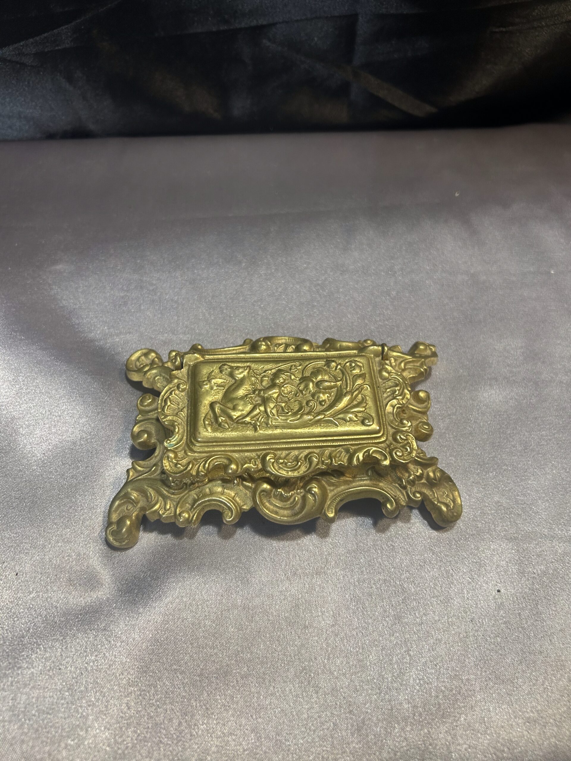 Przedstawiamy elegancką szkatułkę z mosiądzu, ozdobioną motywem konia na wieczku. Szkatułka jest zamykana i posiada trzy przegródki ustawione pod kątem, co pierwotnie czyniło ją pojemnikiem na znaczki pocztowe. Dzięki starannemu wykonaniu oraz bogatym zdobieniom, jest to unikalna i stylowa dekoracja.