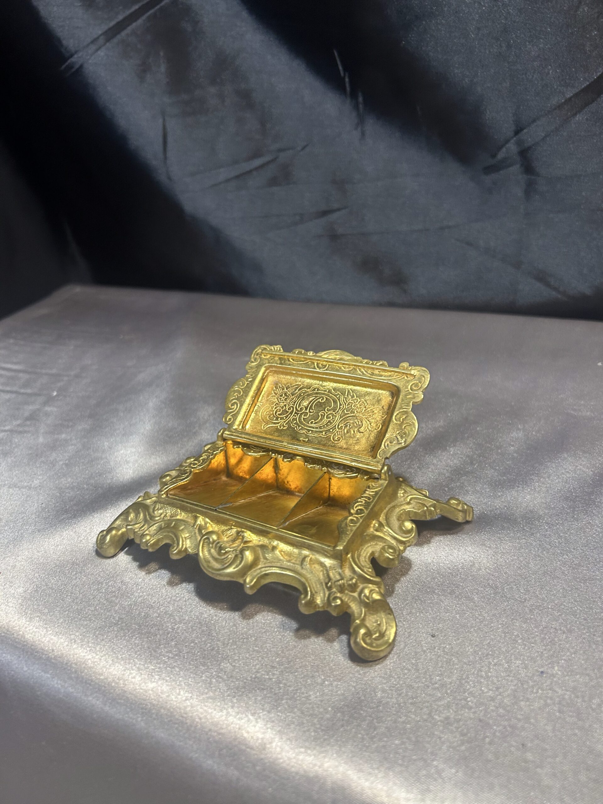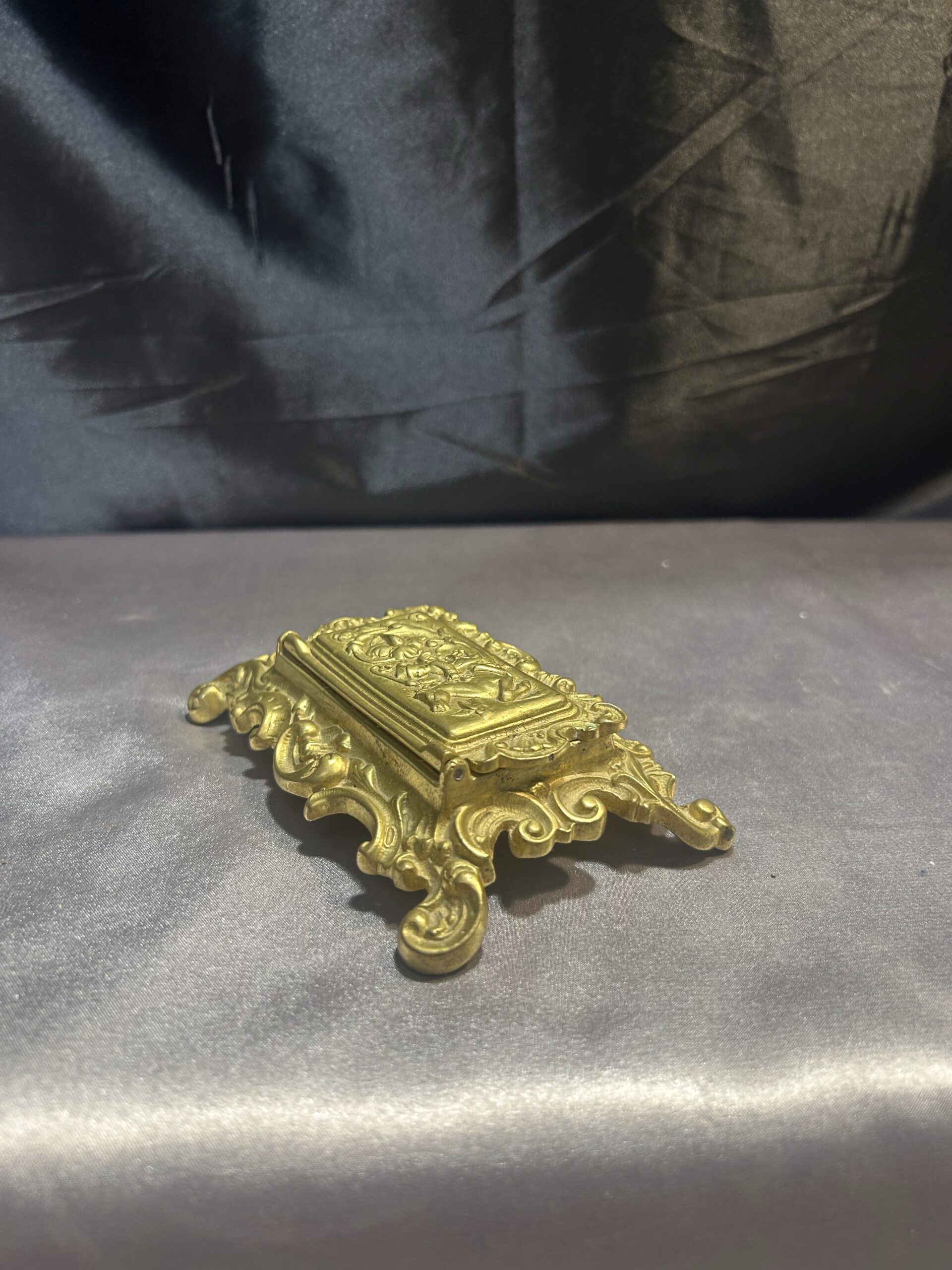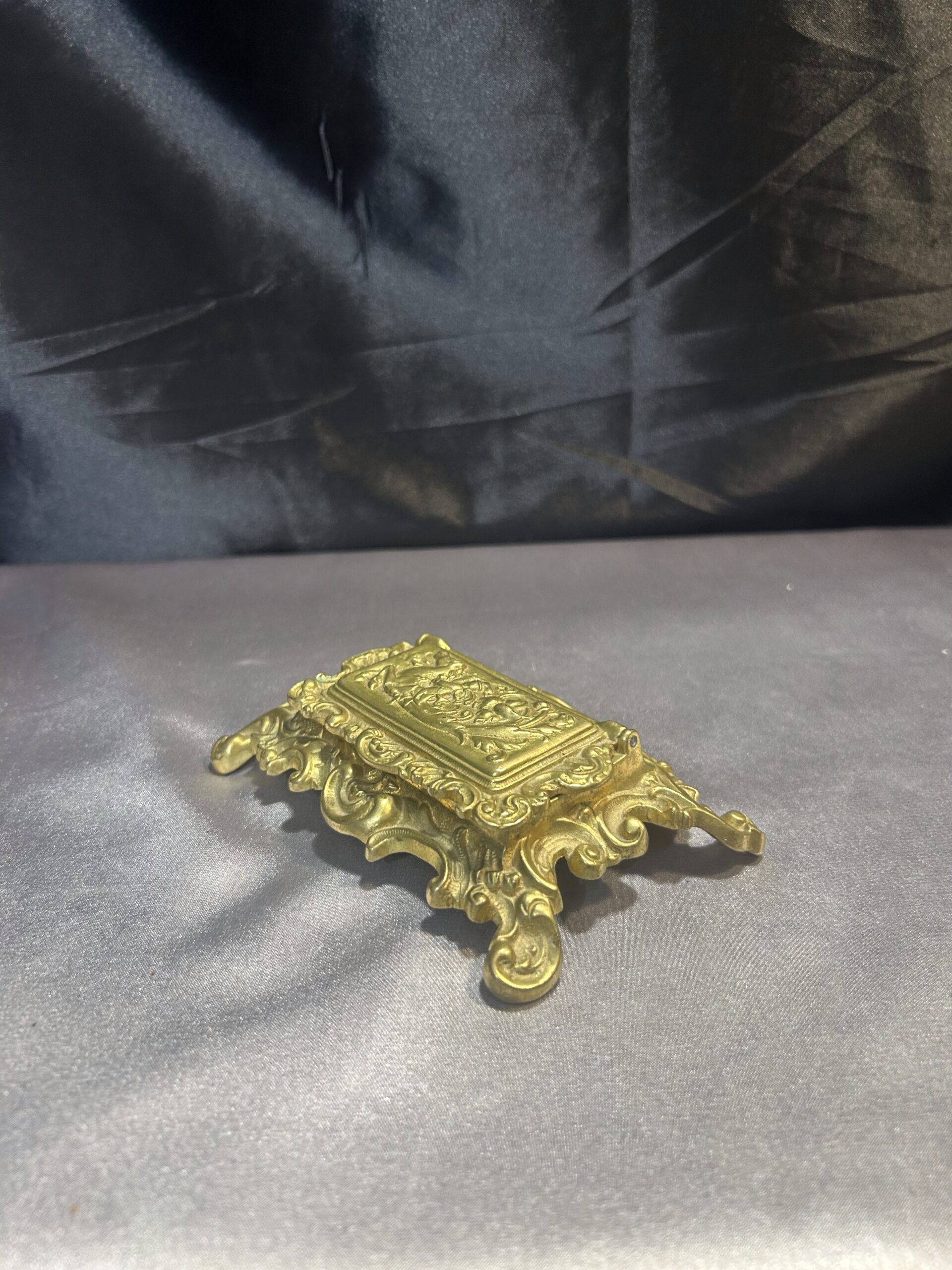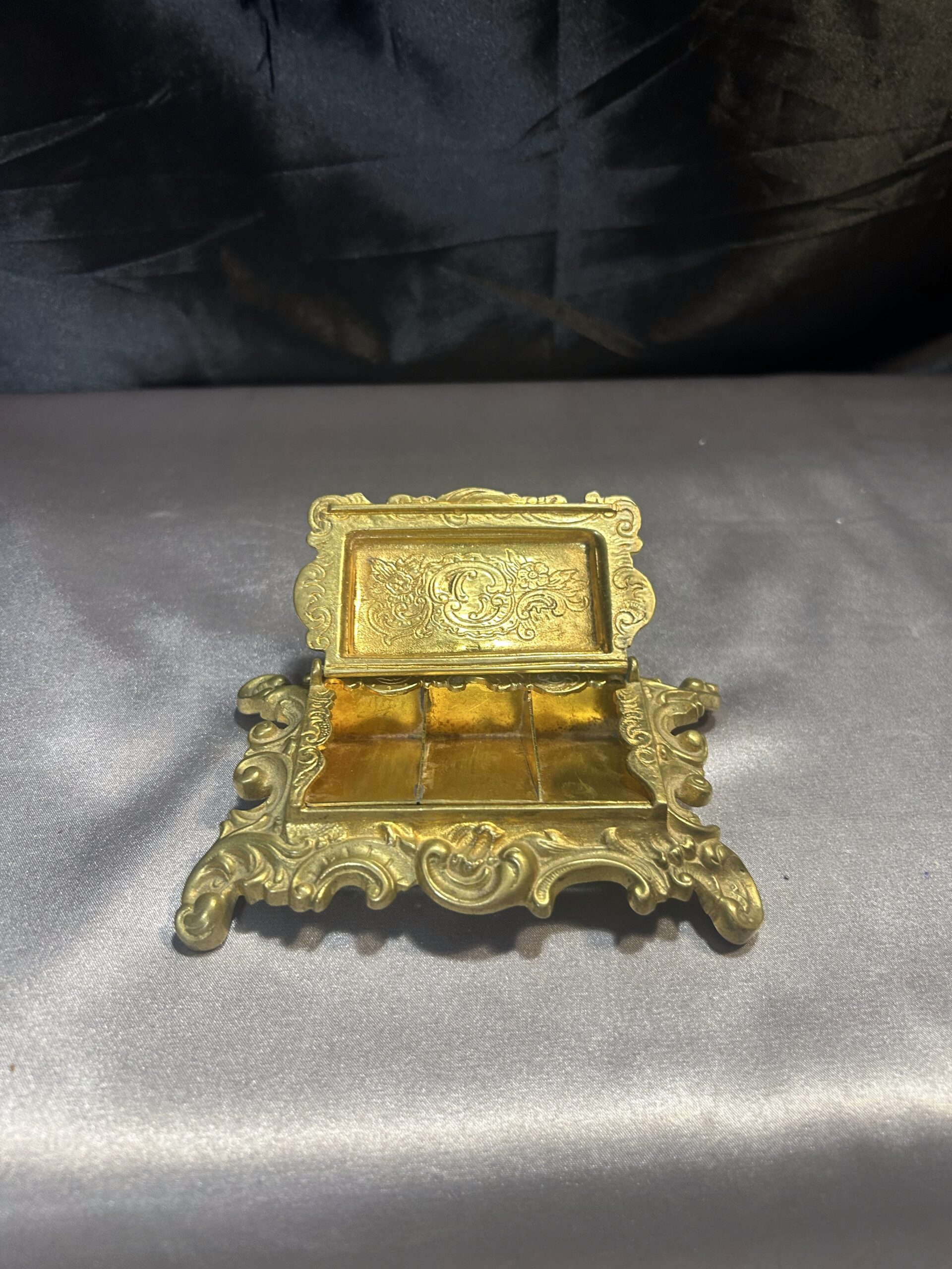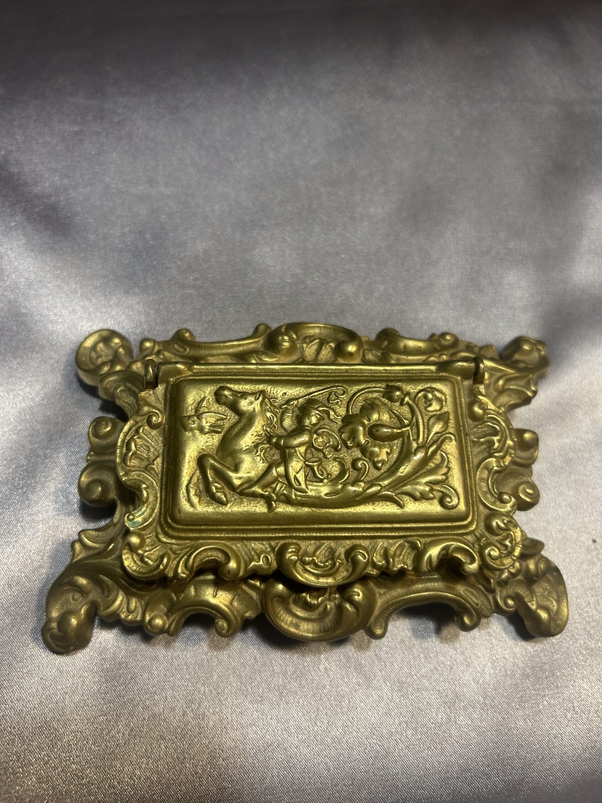 Przedstawiamy elegancką szkatułkę z mosiądzu, ozdobioną motywem konia na wieczku. Szkatułka jest zamykana i posiada trzy przegródki ustawione pod kątem, co pierwotnie czyniło ją pojemnikiem na znaczki pocztowe. Dzięki starannemu wykonaniu oraz bogatym zdobieniom, jest to unikalna i stylowa dekoracja.