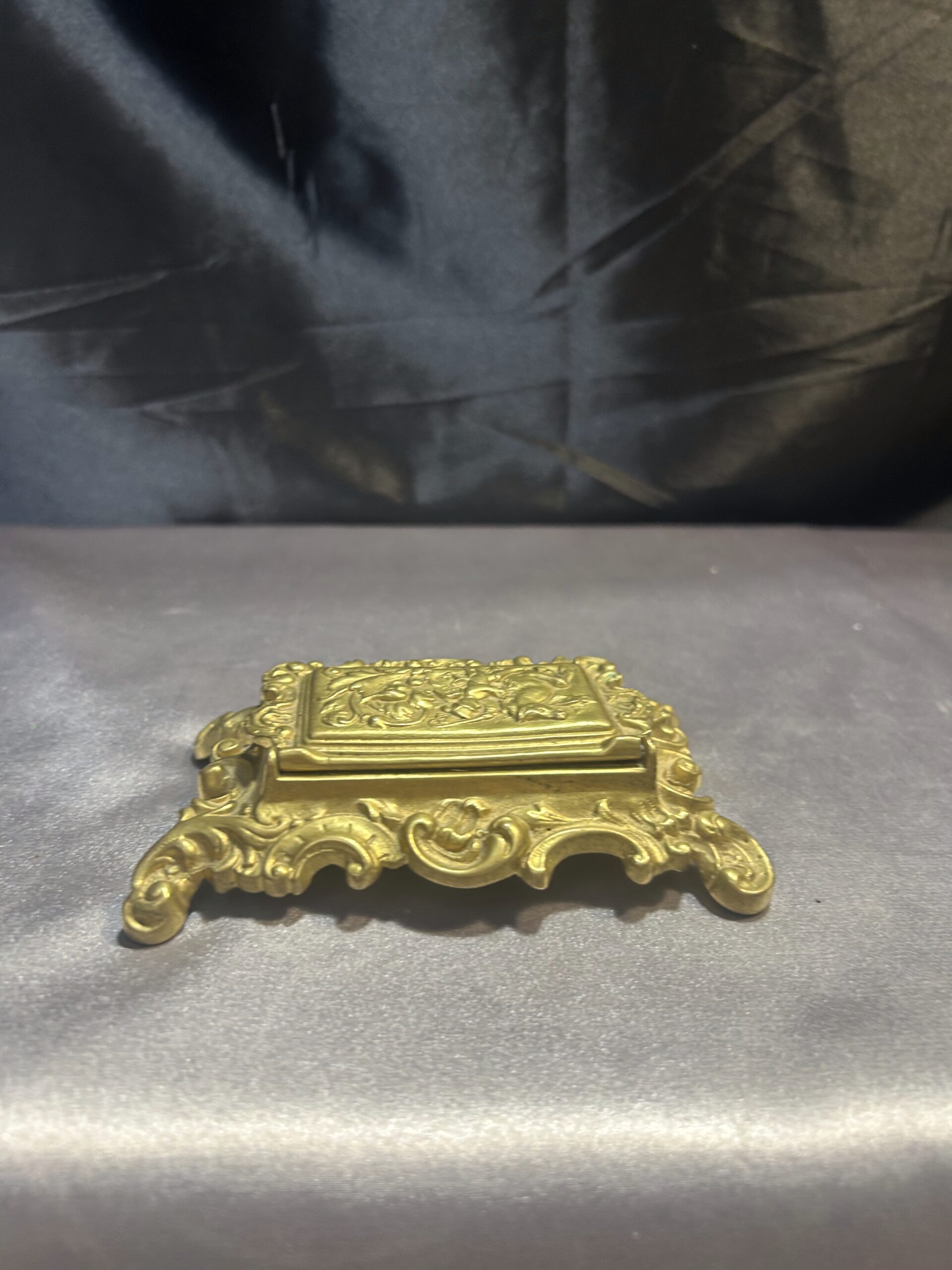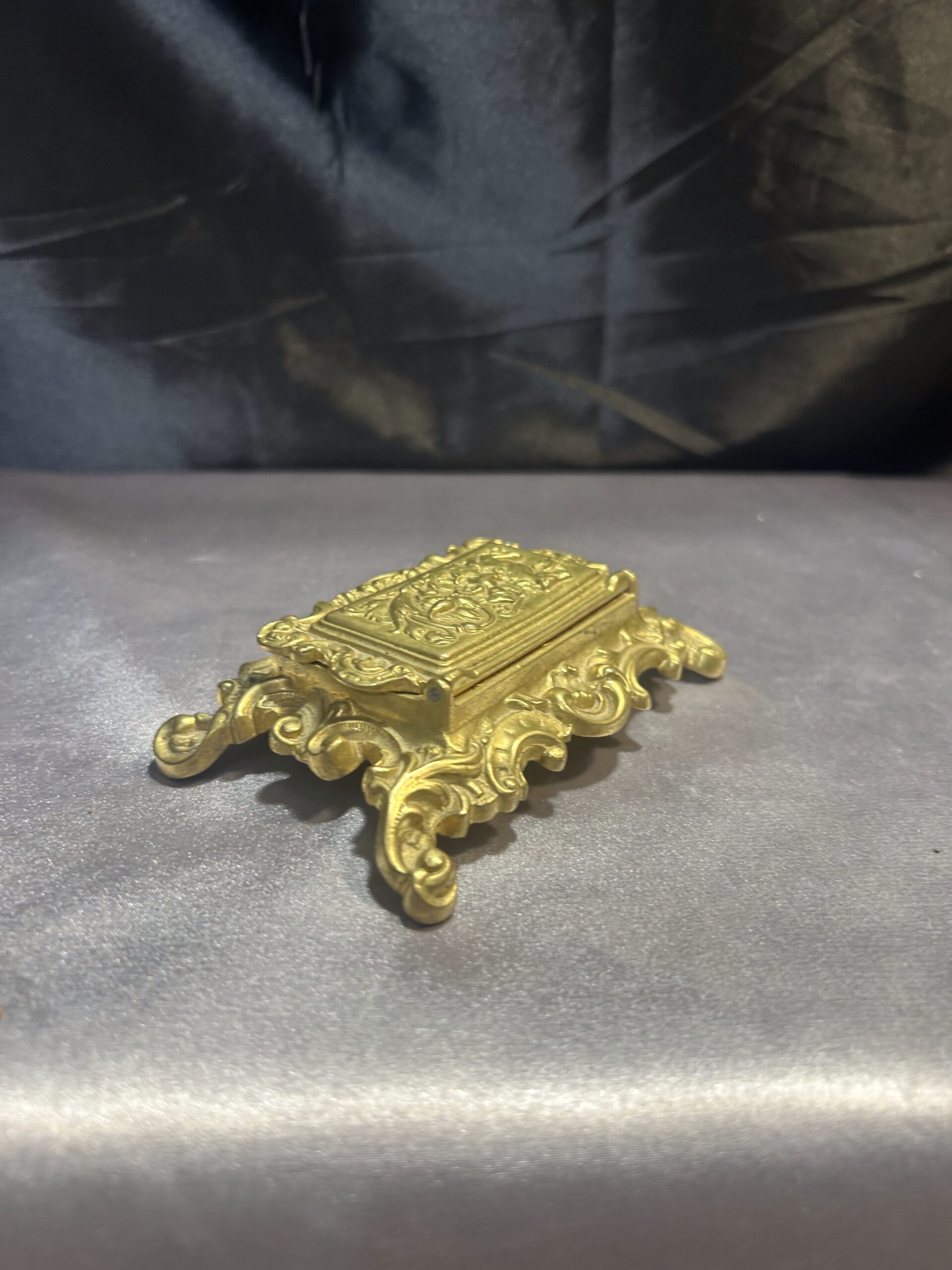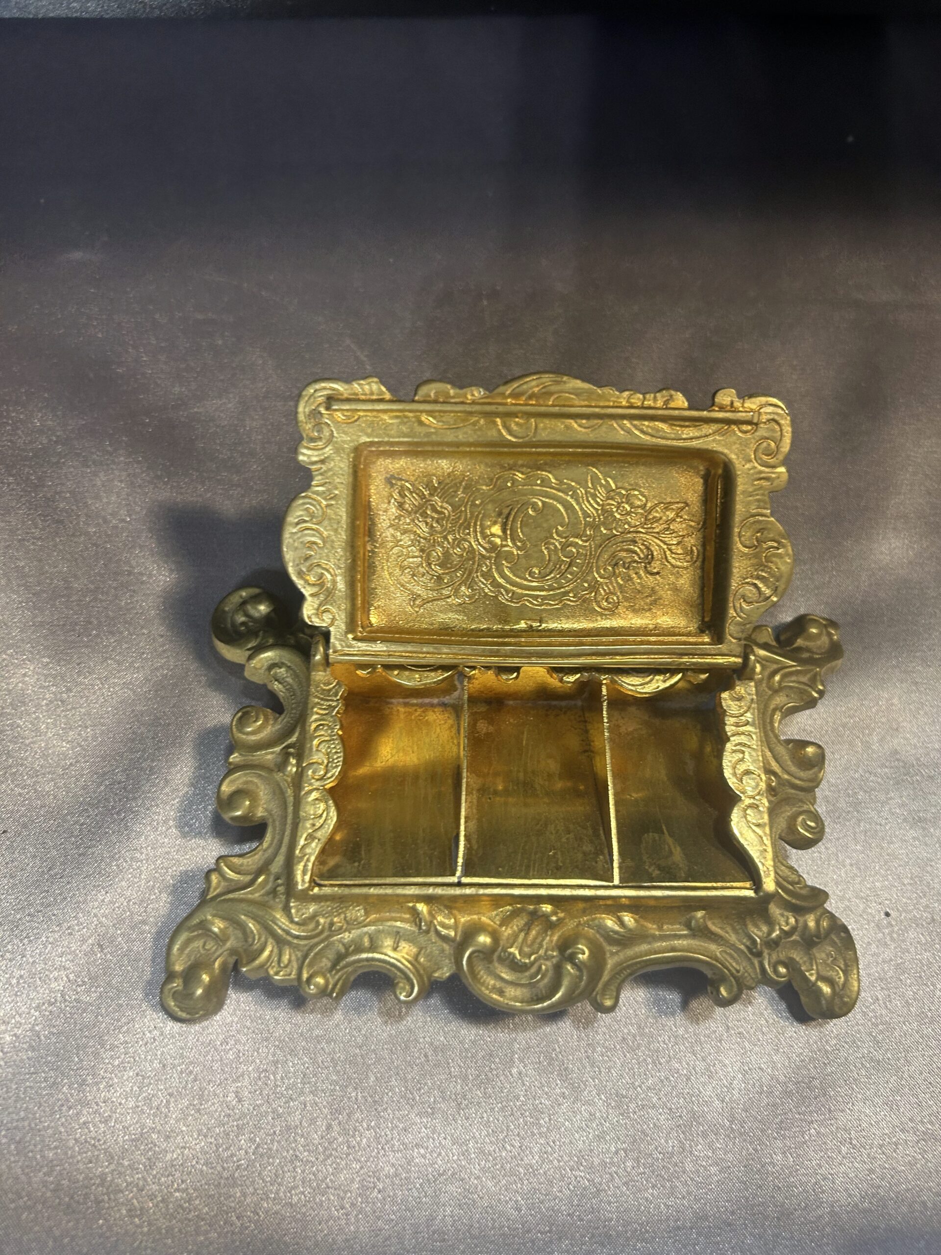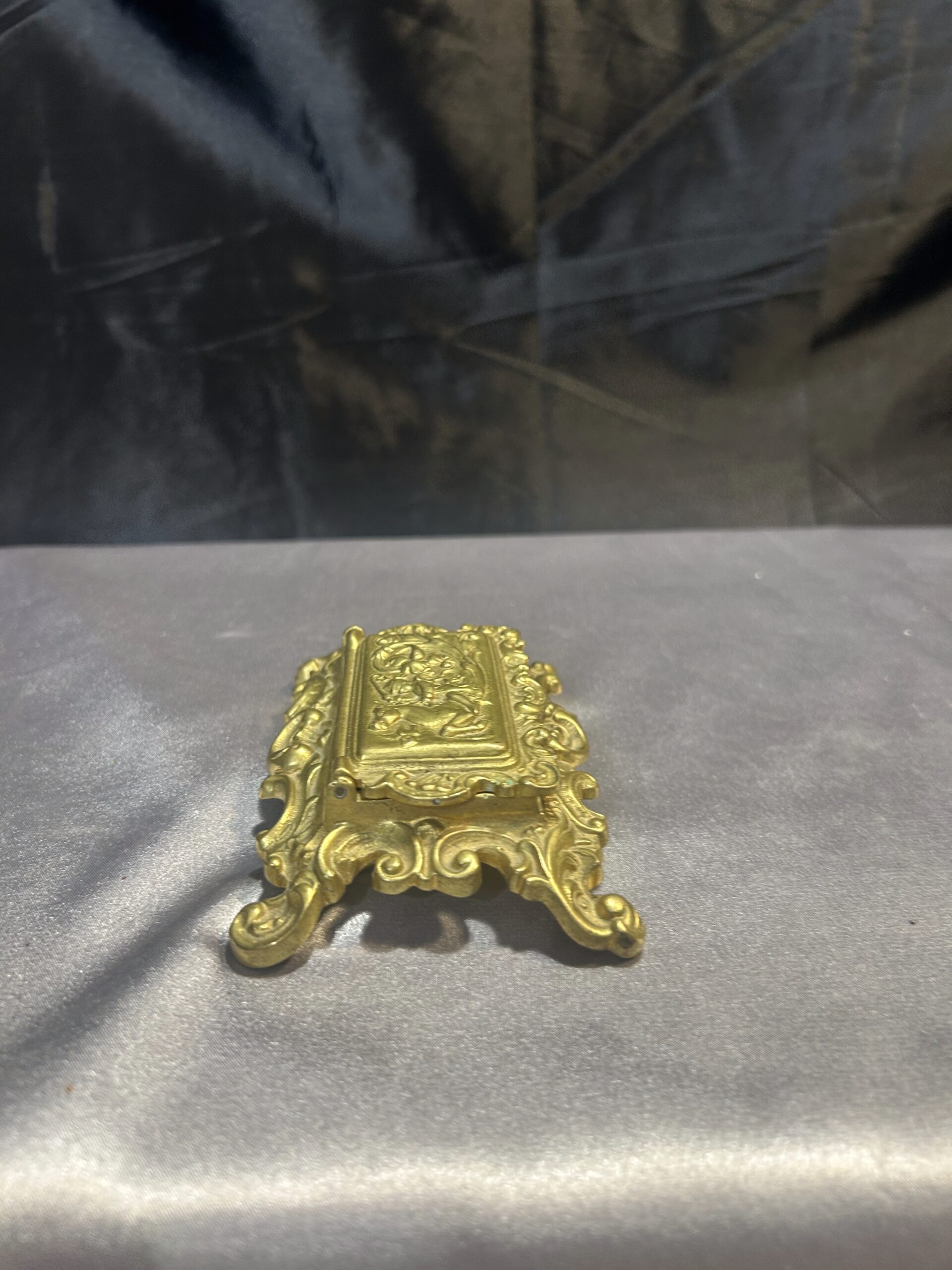 Przedstawiamy elegancką szkatułkę z mosiądzu, ozdobioną motywem konia na wieczku. Szkatułka jest zamykana i posiada trzy przegródki ustawione pod kątem, co pierwotnie czyniło ją pojemnikiem na znaczki pocztowe. Dzięki starannemu wykonaniu oraz bogatym zdobieniom, jest to unikalna i stylowa dekoracja.