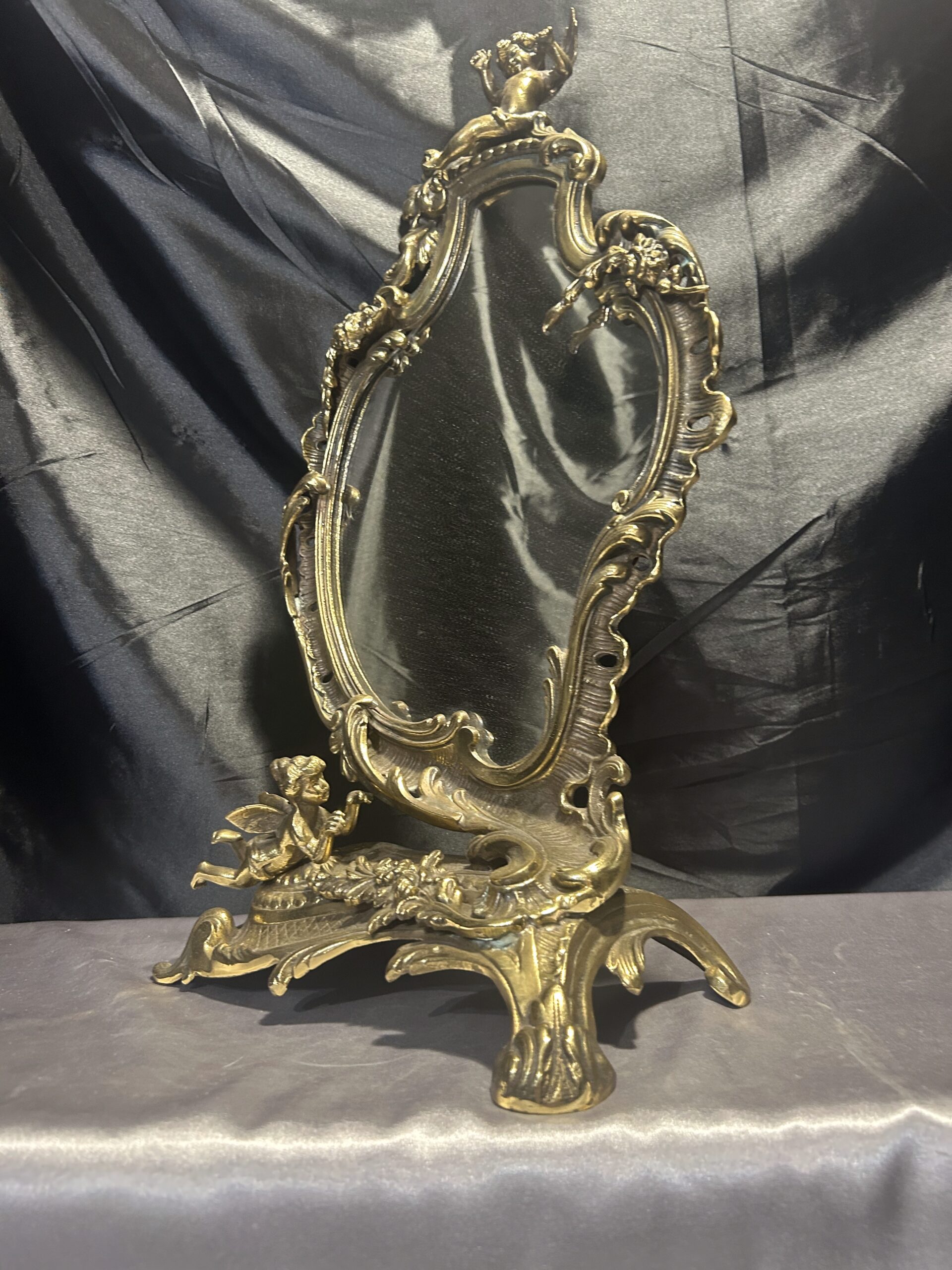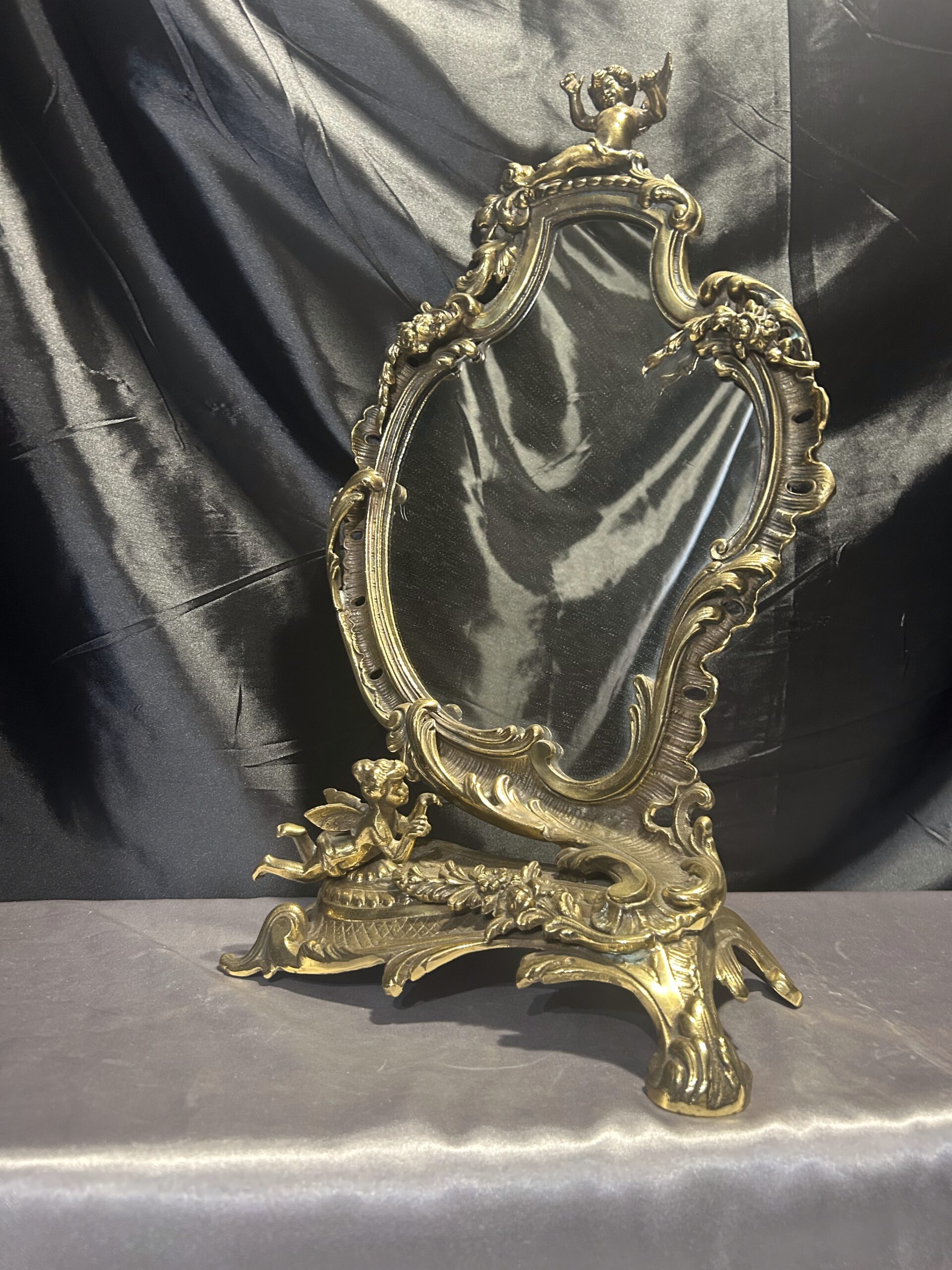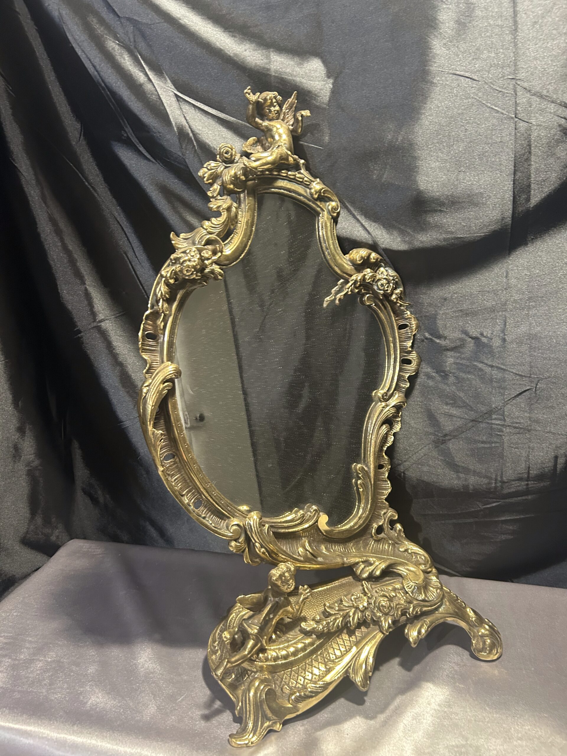 Wyjątkowe, bogato zdobione lustro z mosiądzu w stylu antycznym. Wyróżnia się nieregularnym kształtem oraz detalami w postaci aniołków i kwiatów, które dodają mu niezwykłego uroku. Idealne do postawienia na komodzie lub toaletce jako elegancka i ponadczasowa ozdoba wnętrza. Ciężkie, solidne wykonanie świadczy o wysokiej jakości tego przedmiotu.
