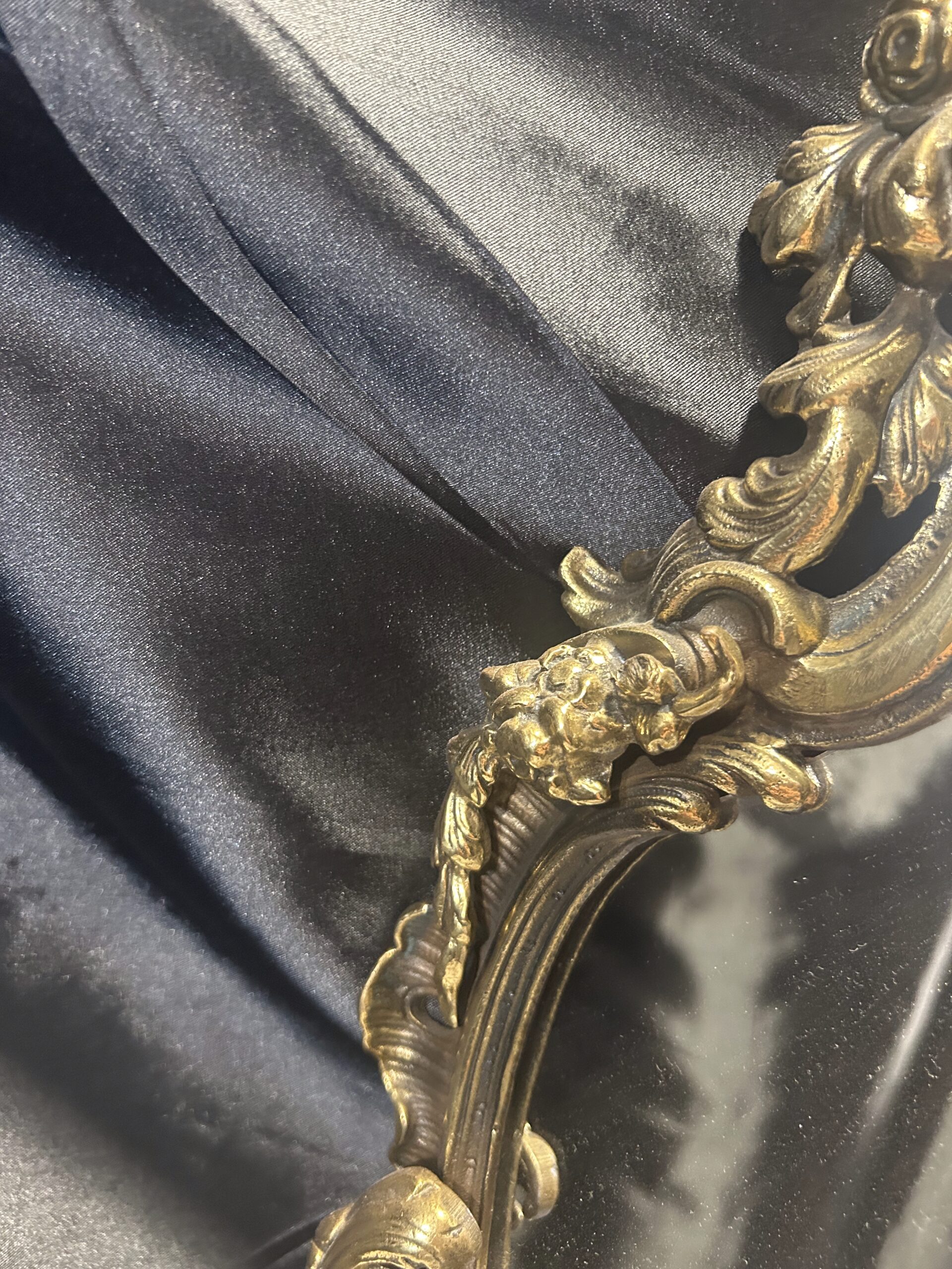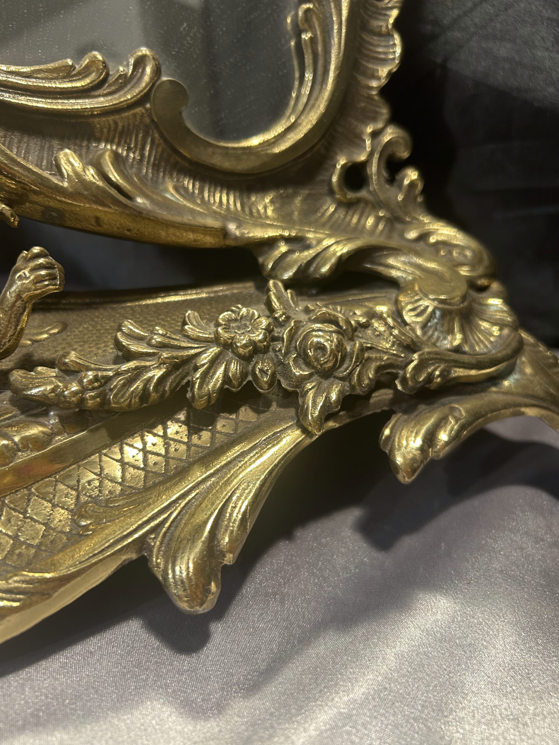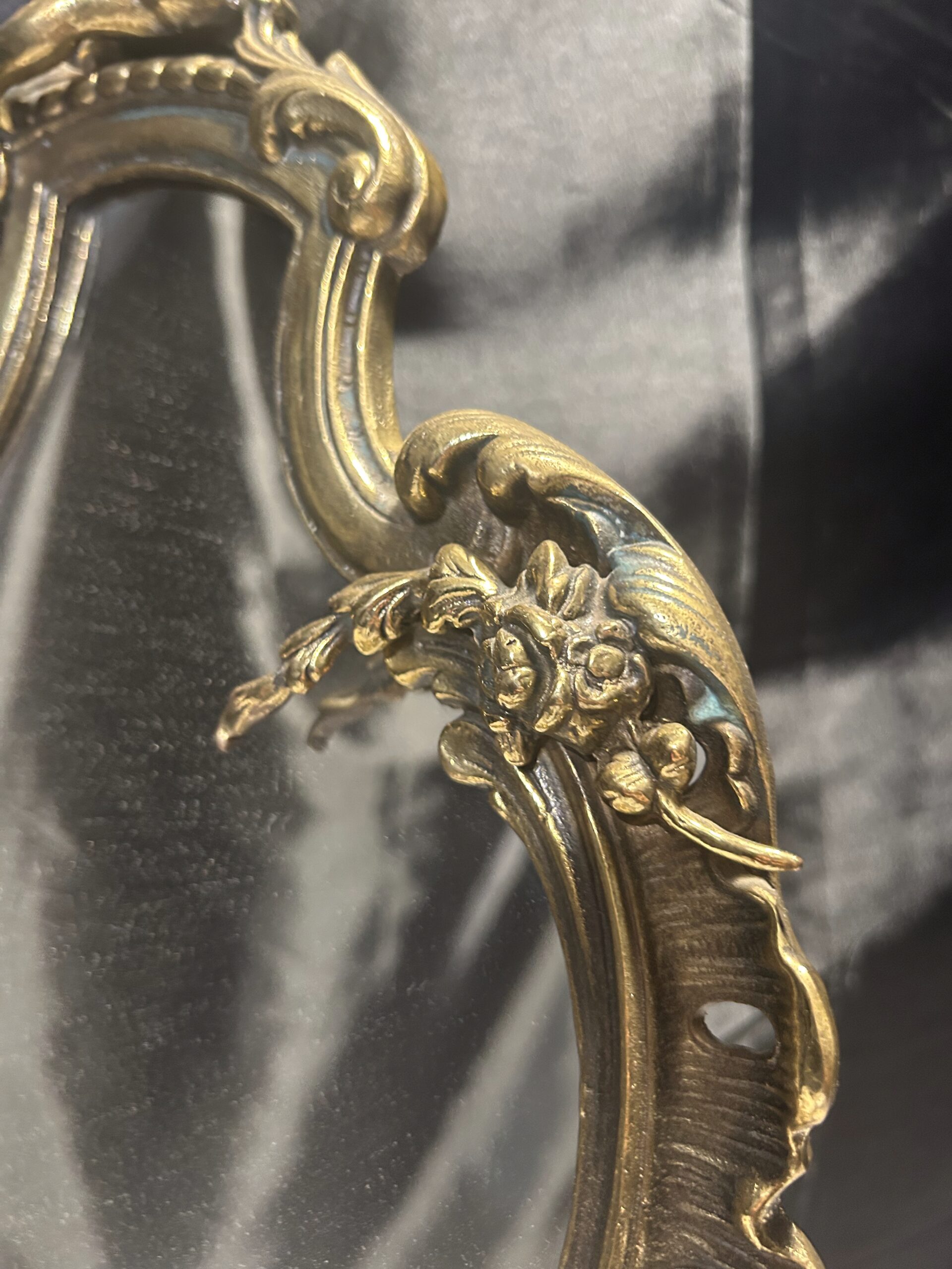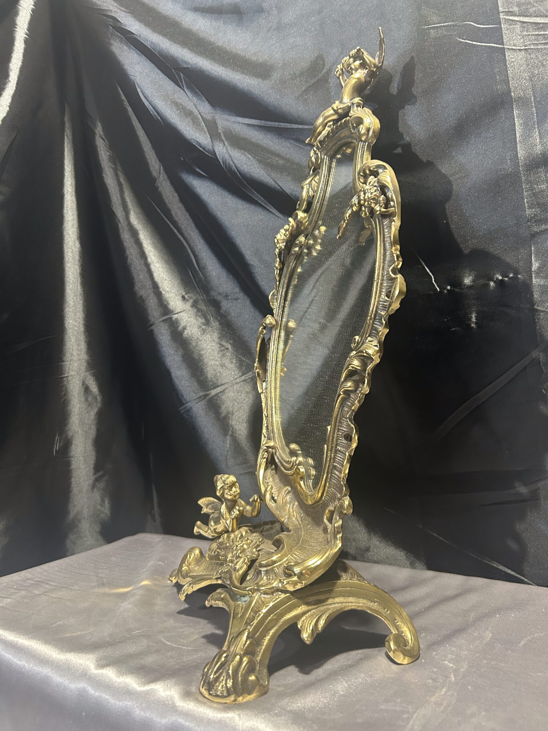 Wyjątkowe, bogato zdobione lustro z mosiądzu w stylu antycznym. Wyróżnia się nieregularnym kształtem oraz detalami w postaci aniołków i kwiatów, które dodają mu niezwykłego uroku. Idealne do postawienia na komodzie lub toaletce jako elegancka i ponadczasowa ozdoba wnętrza. Ciężkie, solidne wykonanie świadczy o wysokiej jakości tego przedmiotu.