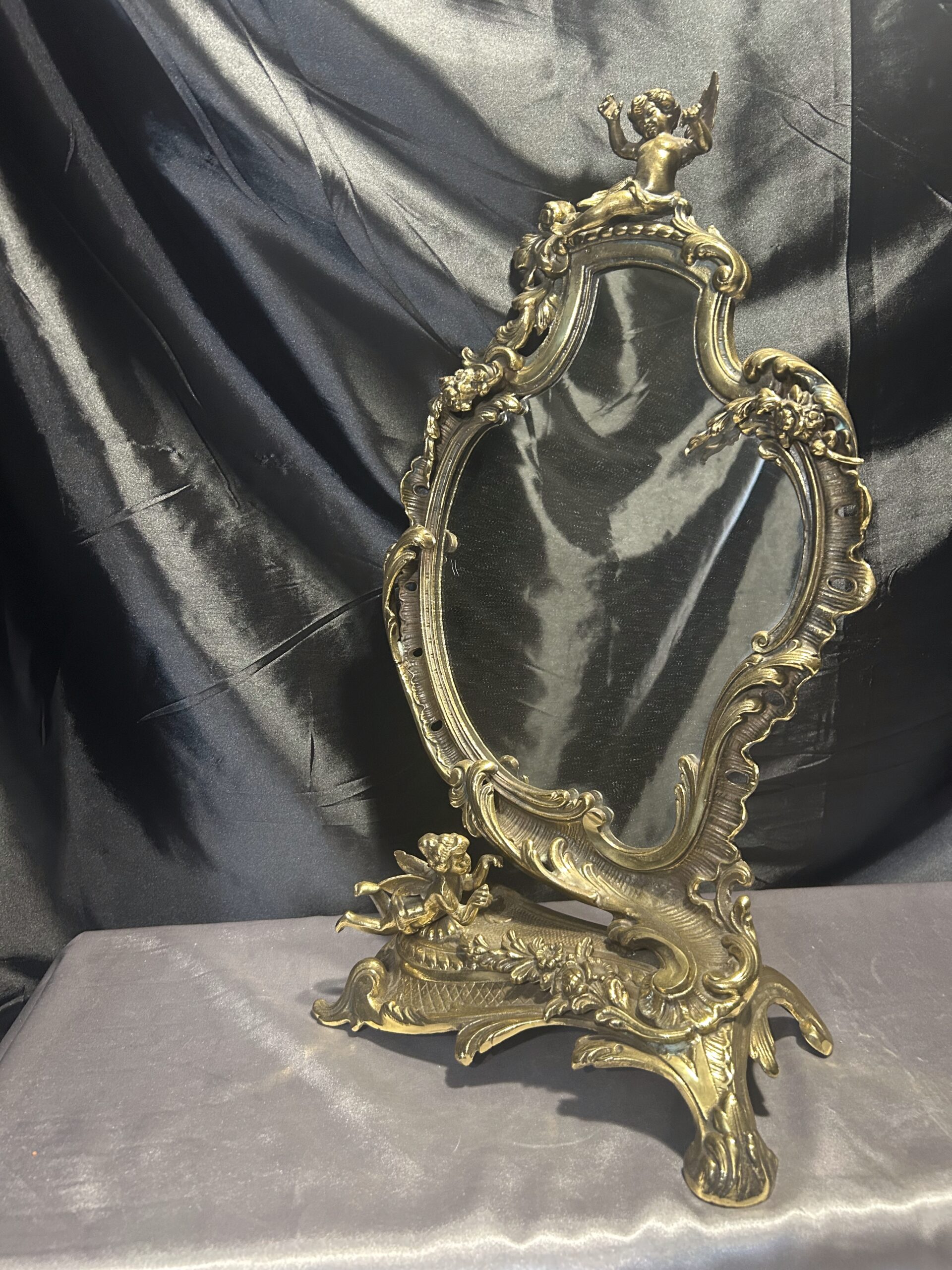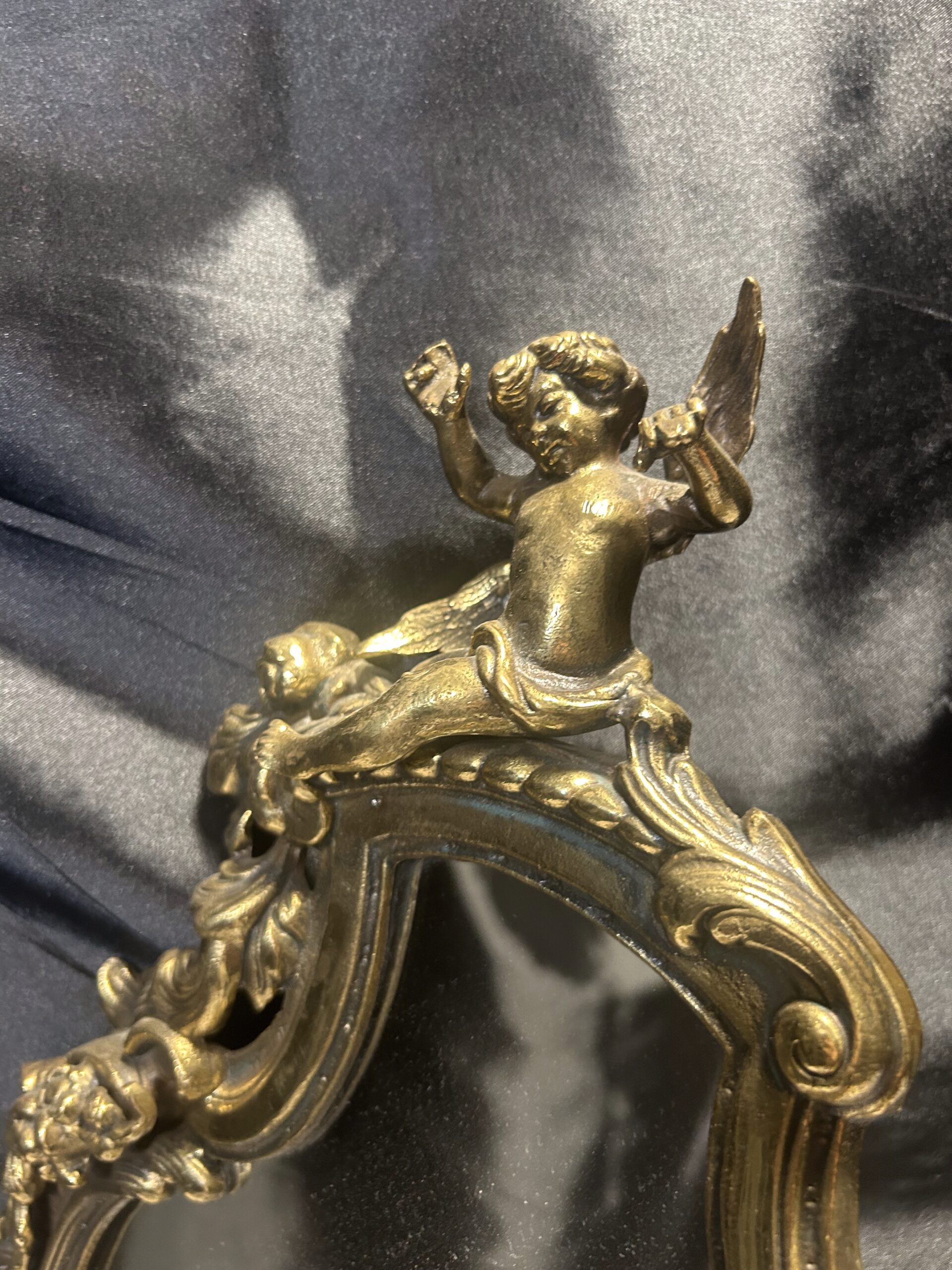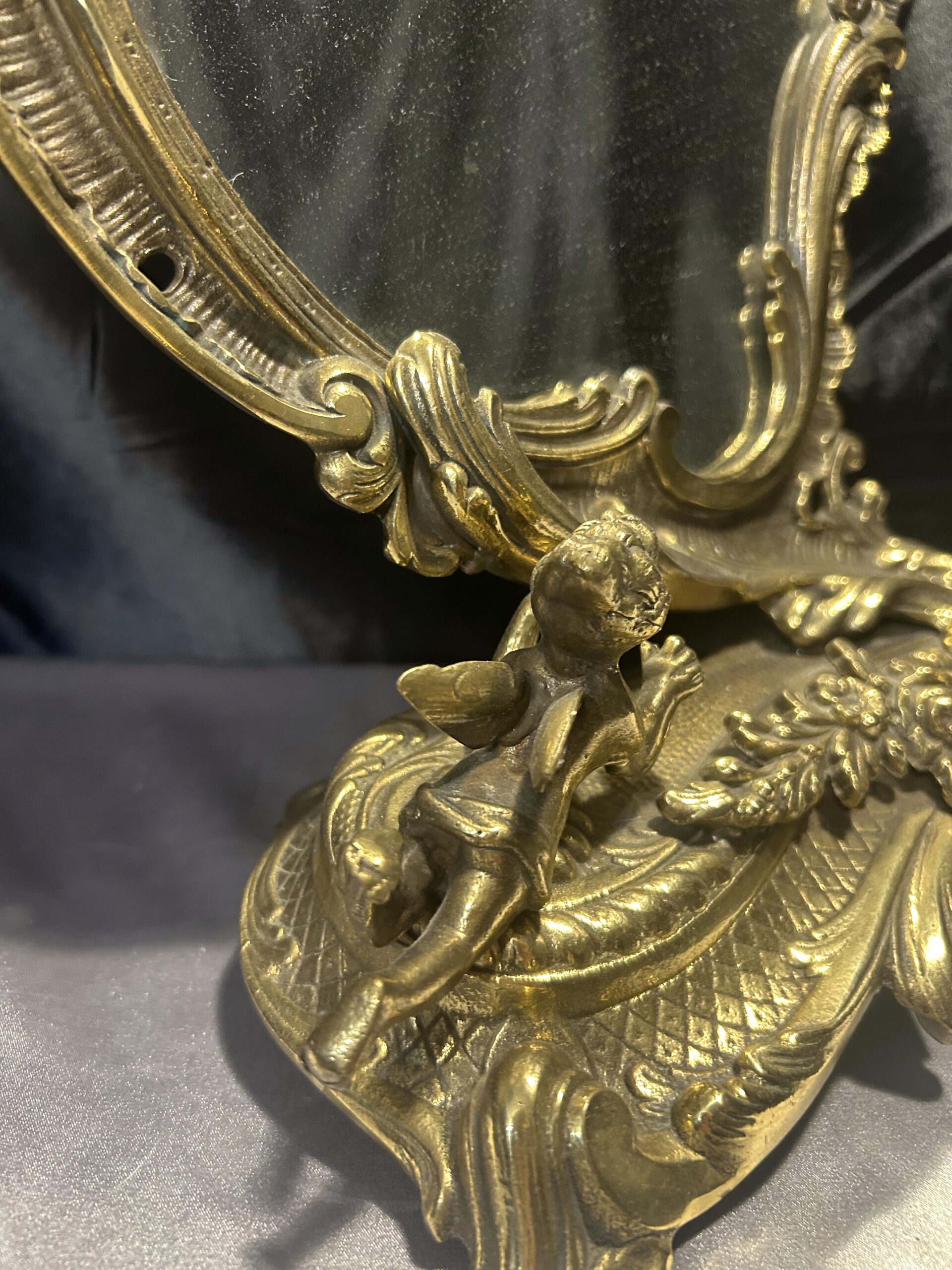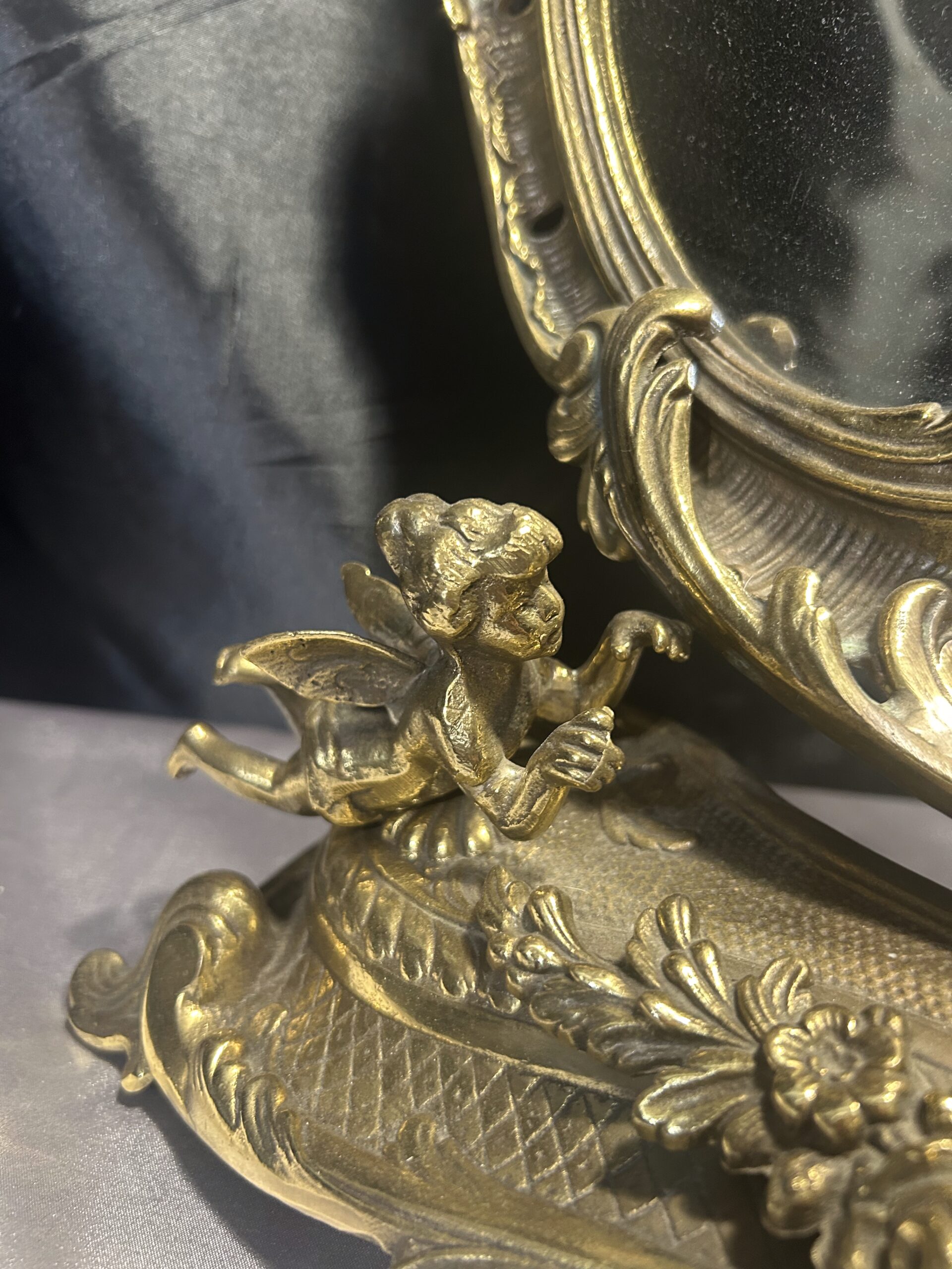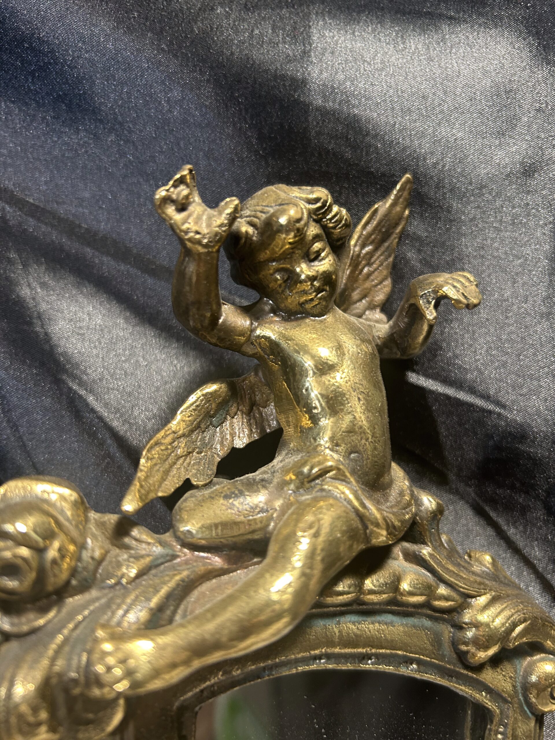 Zdobione Lustro z Mosiądzu – Antyk z Motywem Aniołków i Kwiatów