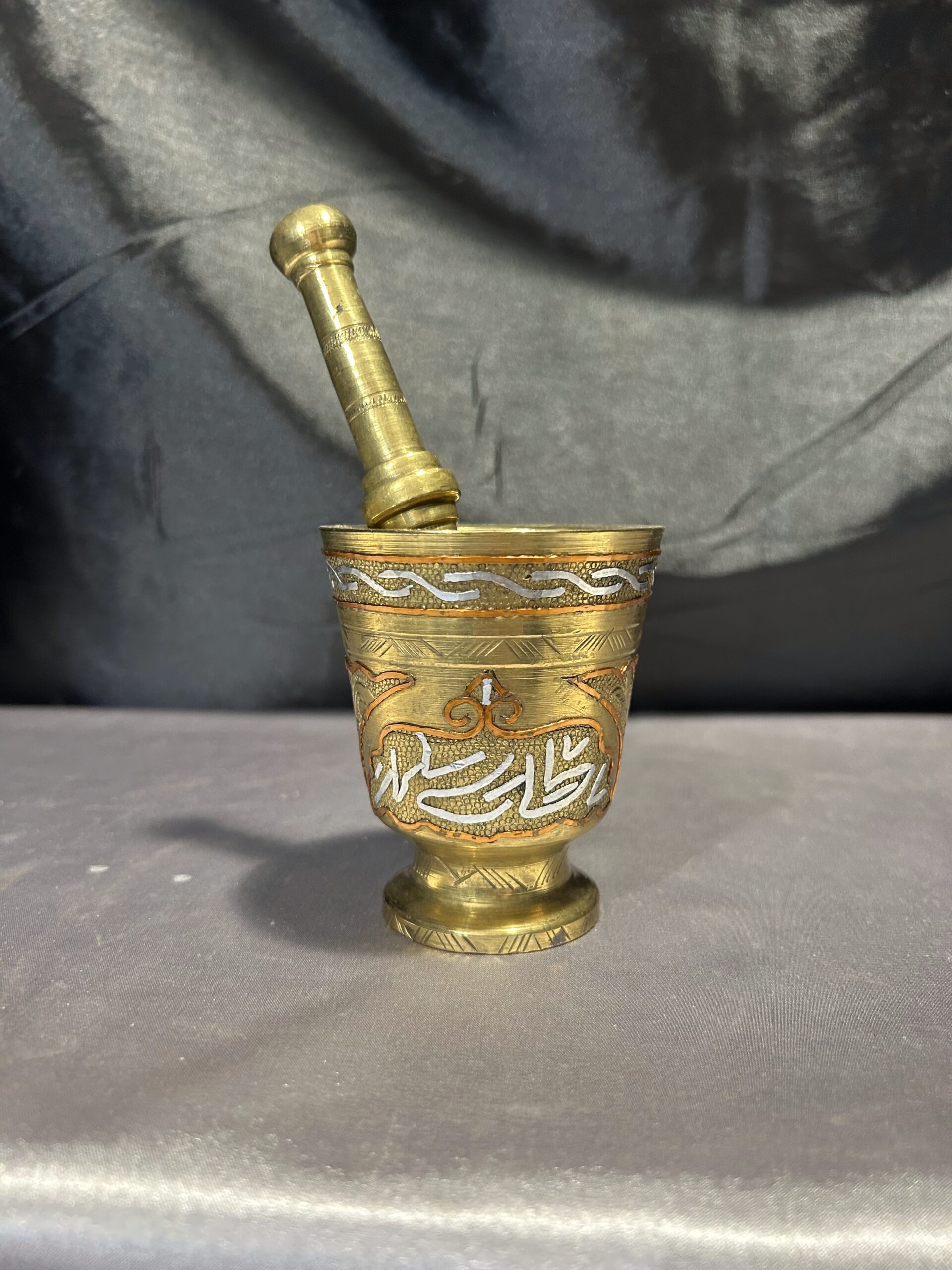 - Zdobiony moździerz z mosiądzu i miedzi – rzeźbiony, na nodze