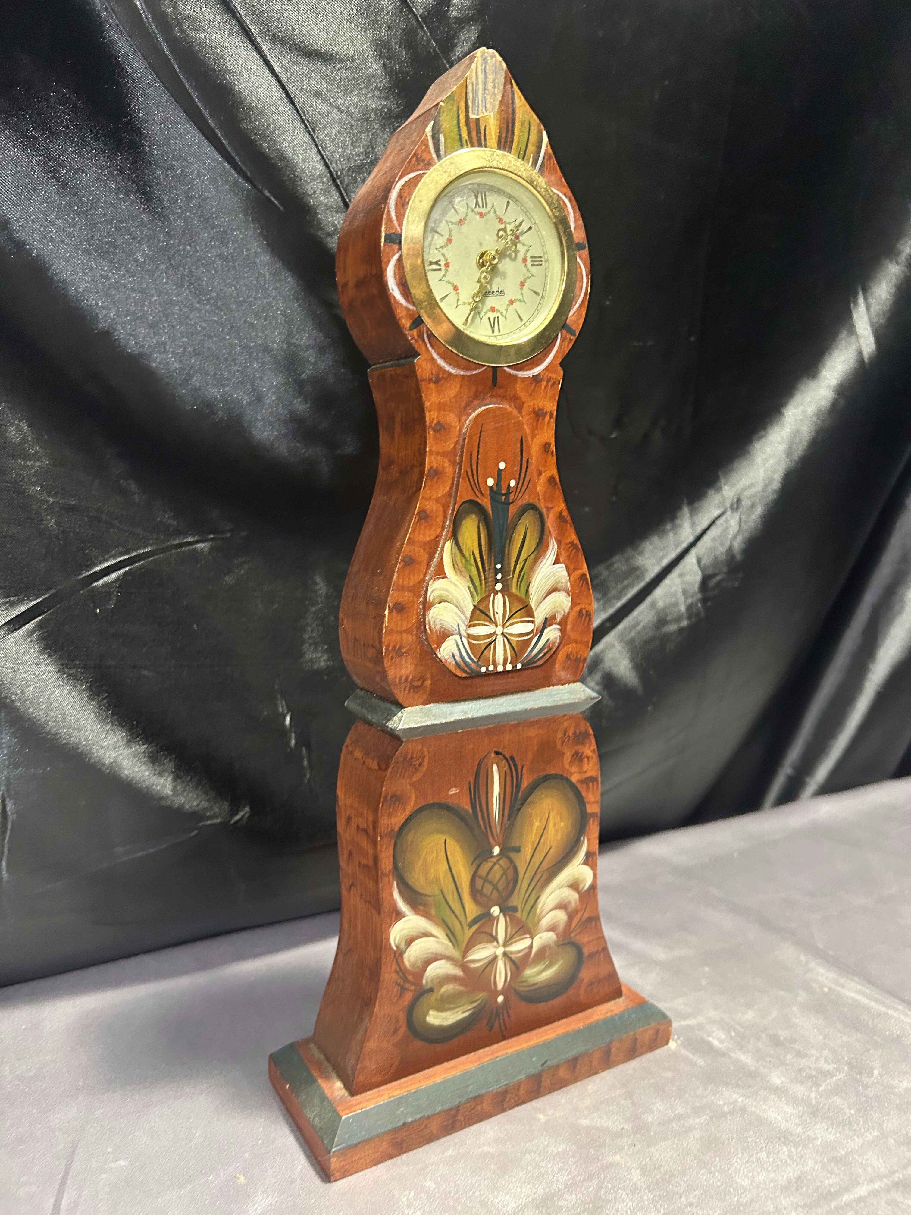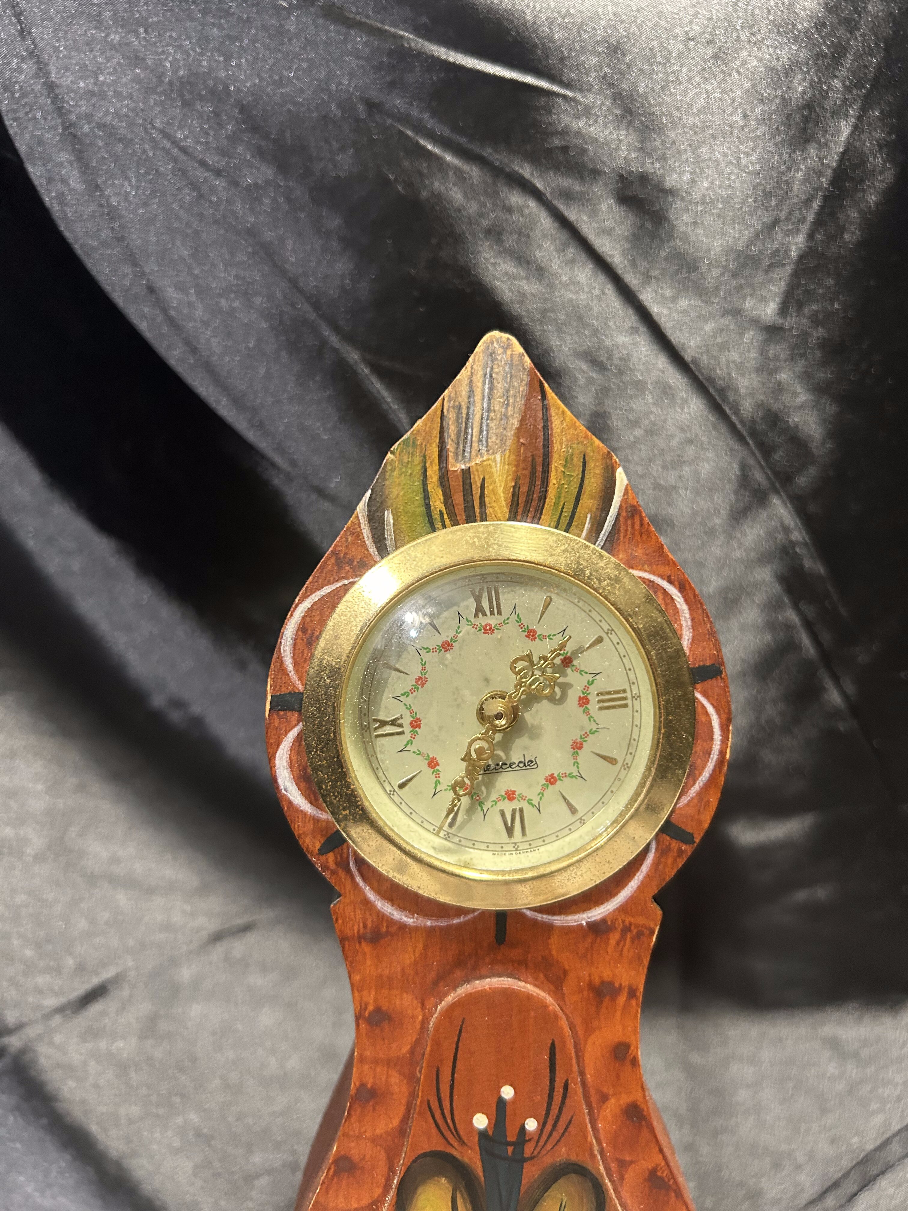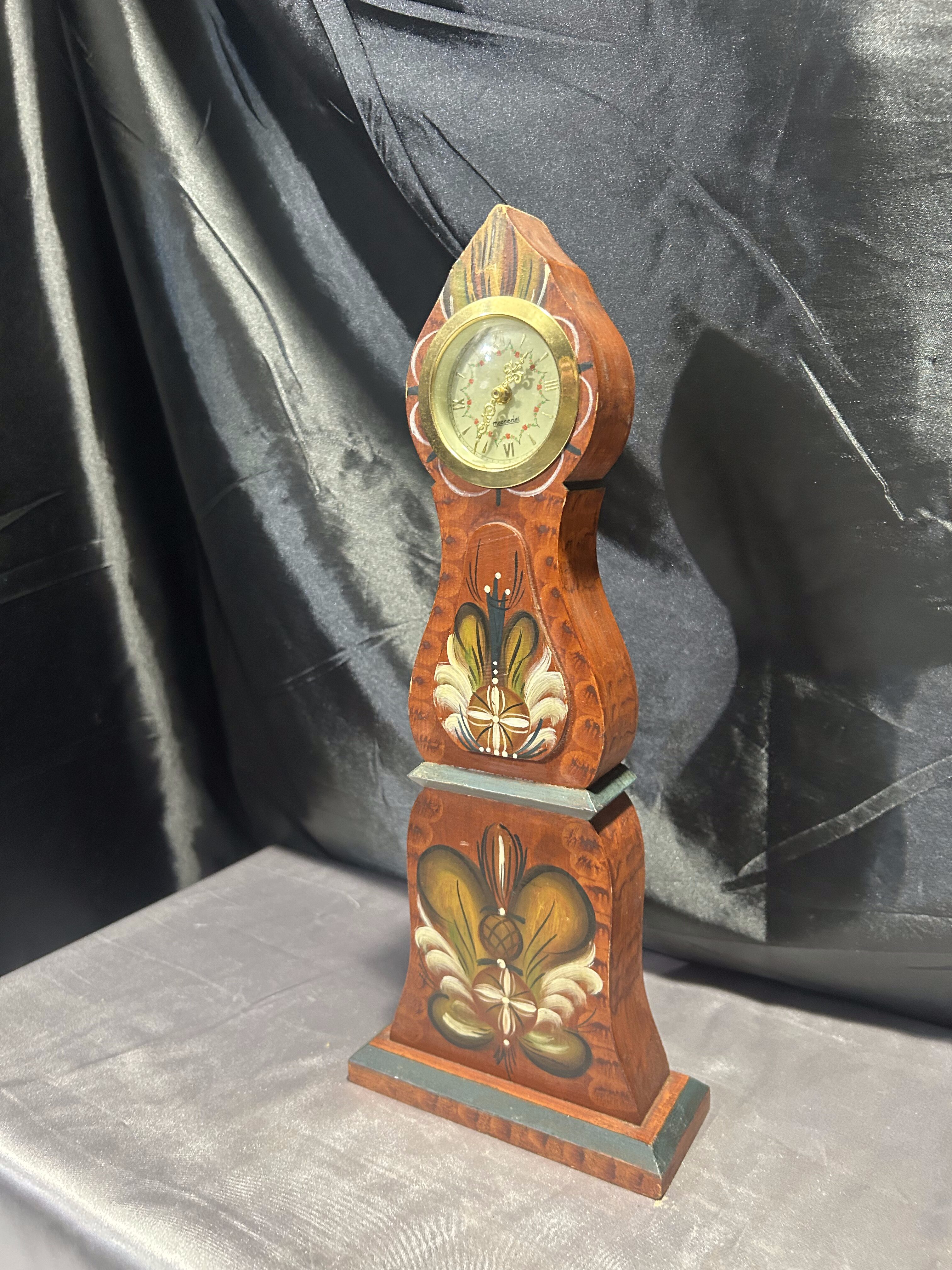 Oryginalny, ręcznie malowany zegar w stylu norweskiego rosemalingu, osadzony w drewnianej, stylizowanej obudowie przypominającej miniaturowy zegar stojący. Jego wyjątkowość podkreśla tradycyjny mechanizm nakręcany, co czyni go nie tylko dekoracyjnym, ale i kolekcjonerskim egzemplarzem.