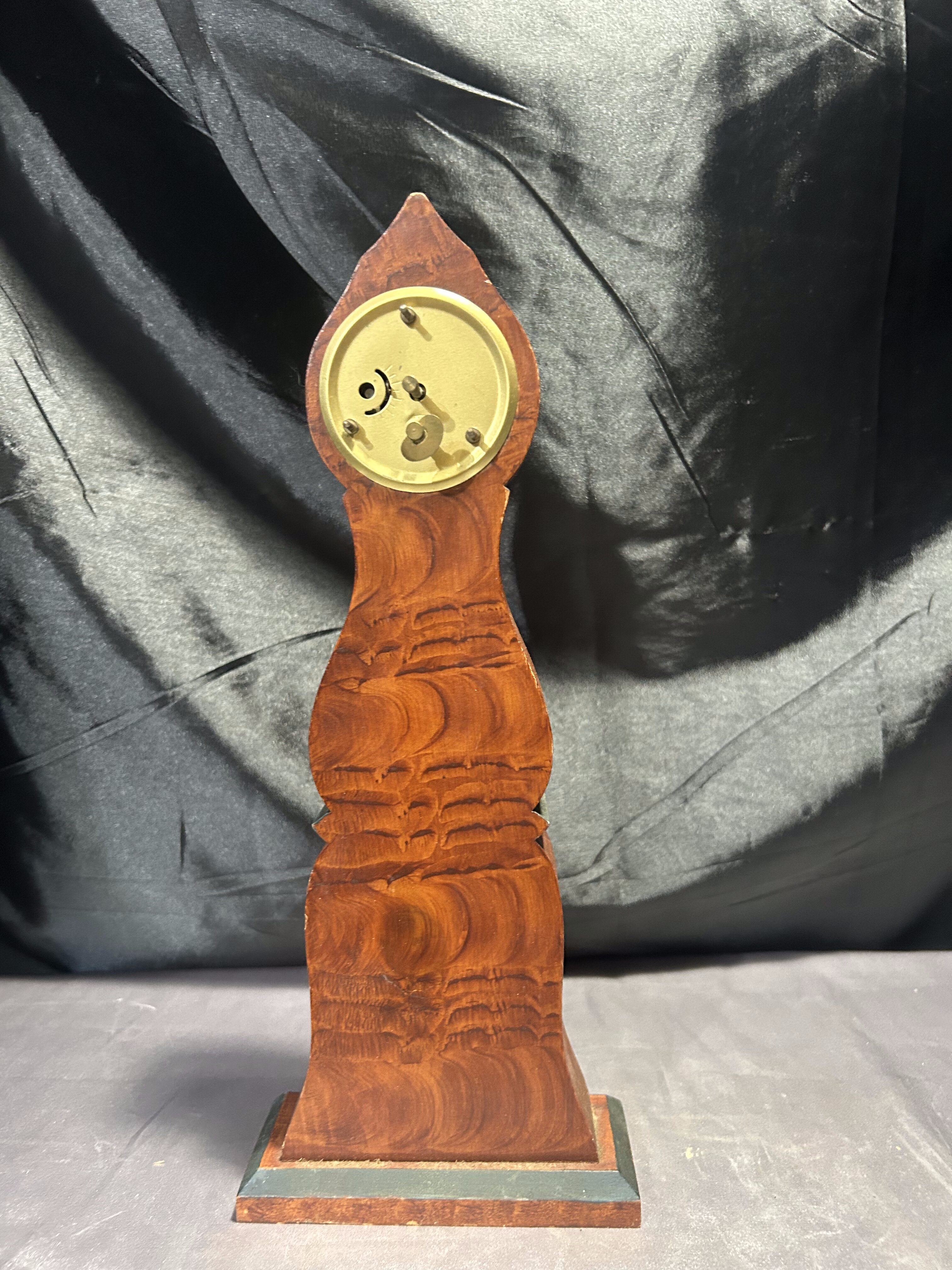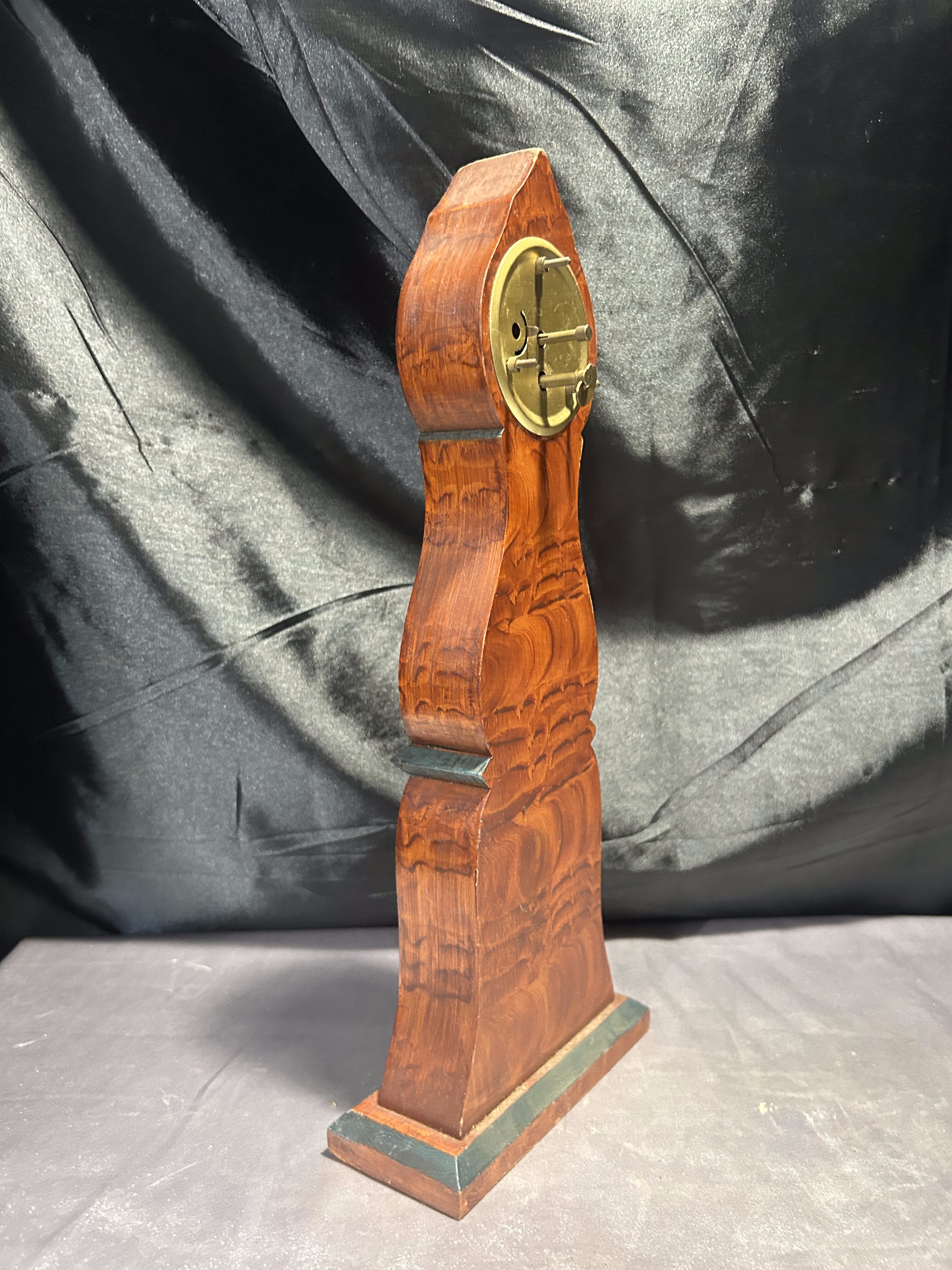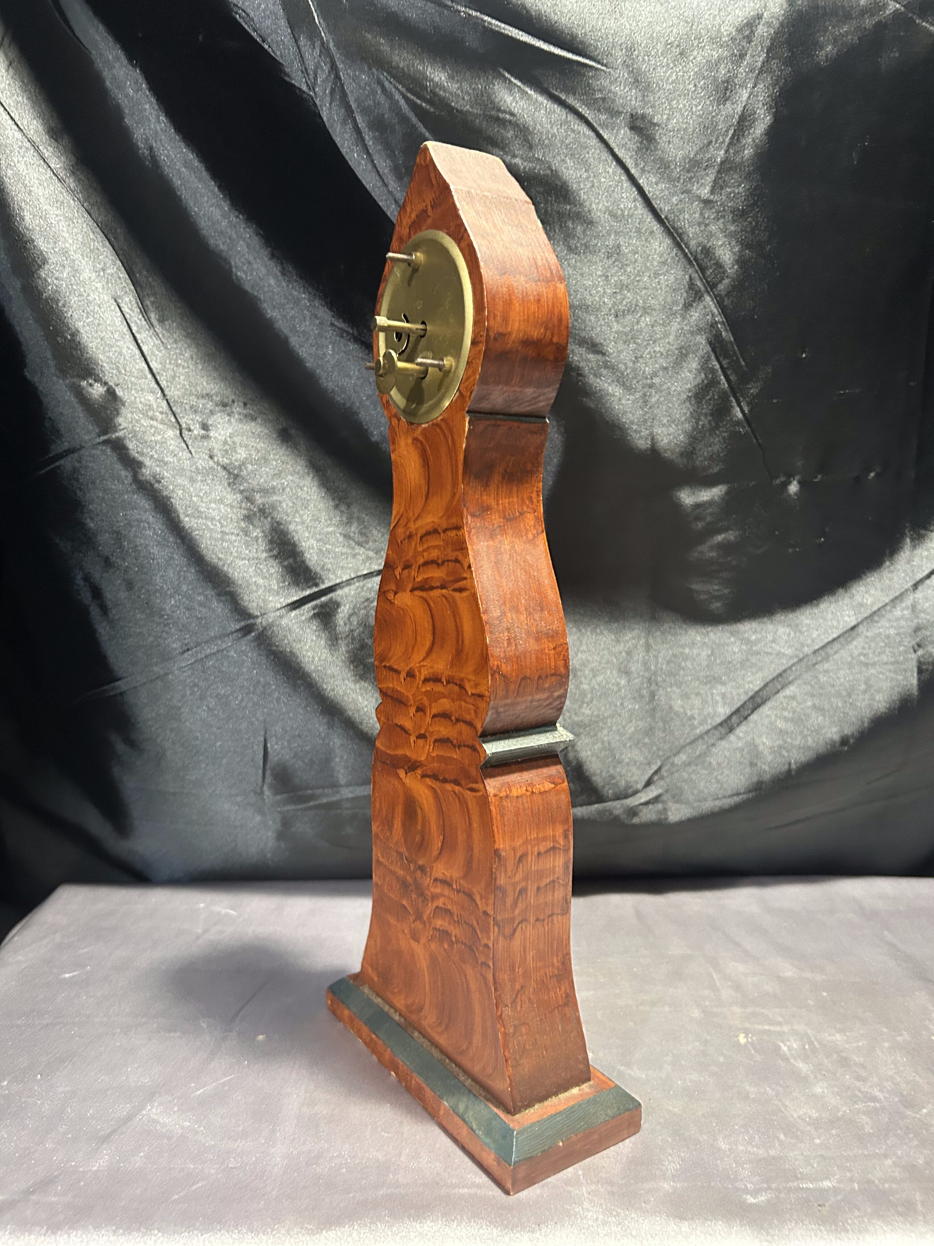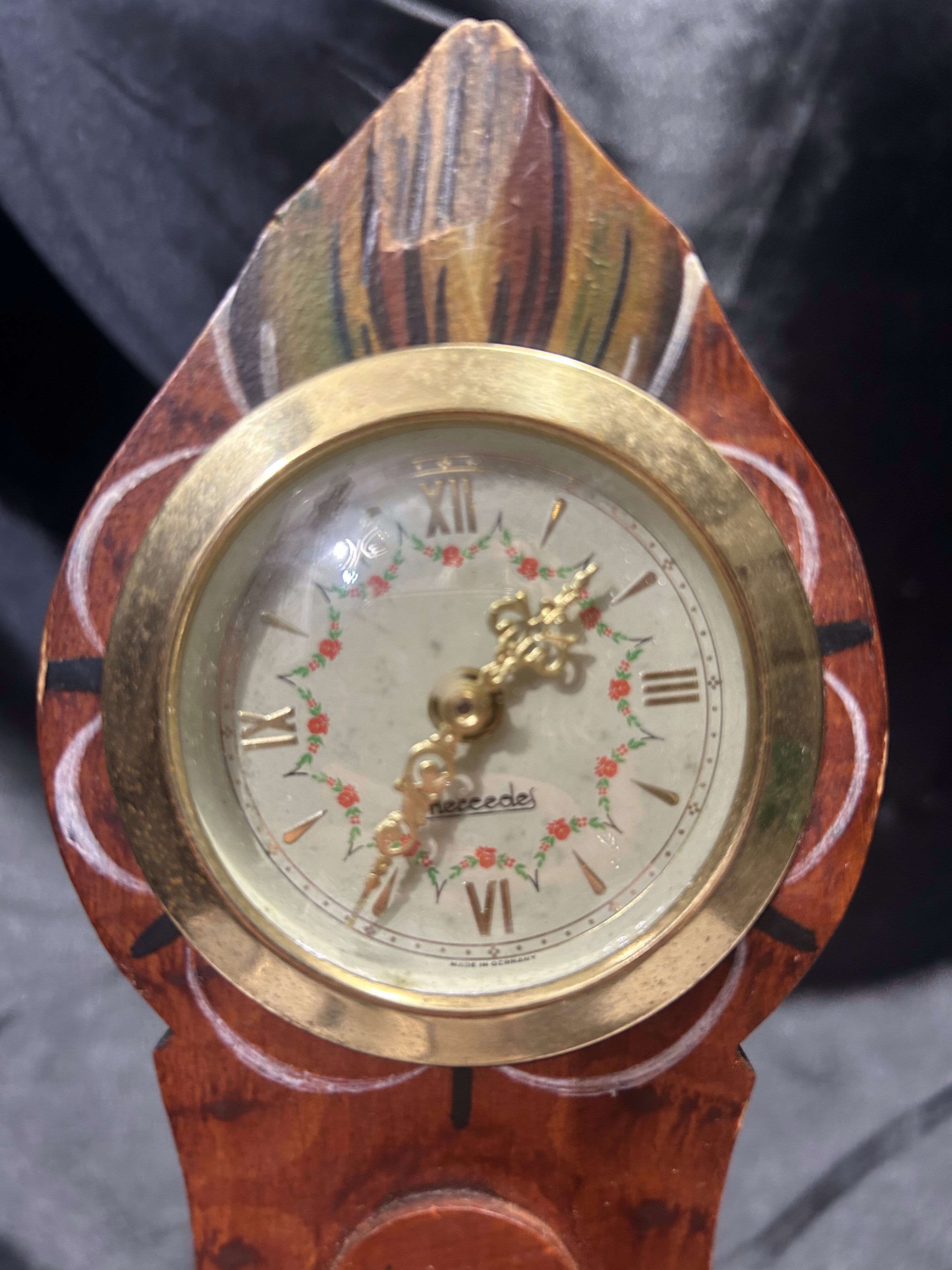 Oryginalny, ręcznie malowany zegar w stylu norweskiego rosemalingu, osadzony w drewnianej, stylizowanej obudowie przypominającej miniaturowy zegar stojący. Jego wyjątkowość podkreśla tradycyjny mechanizm nakręcany, co czyni go nie tylko dekoracyjnym, ale i kolekcjonerskim egzemplarzem.