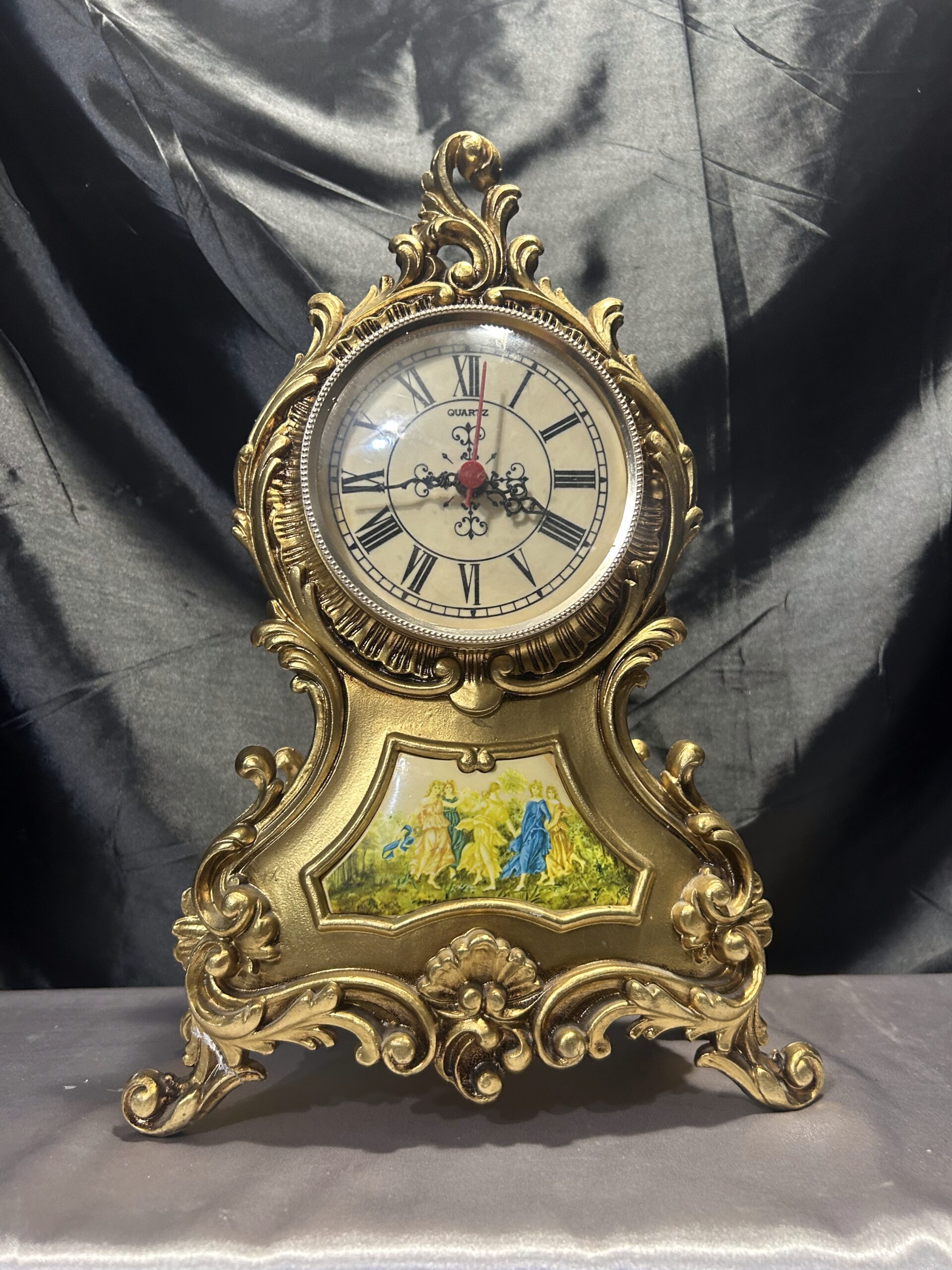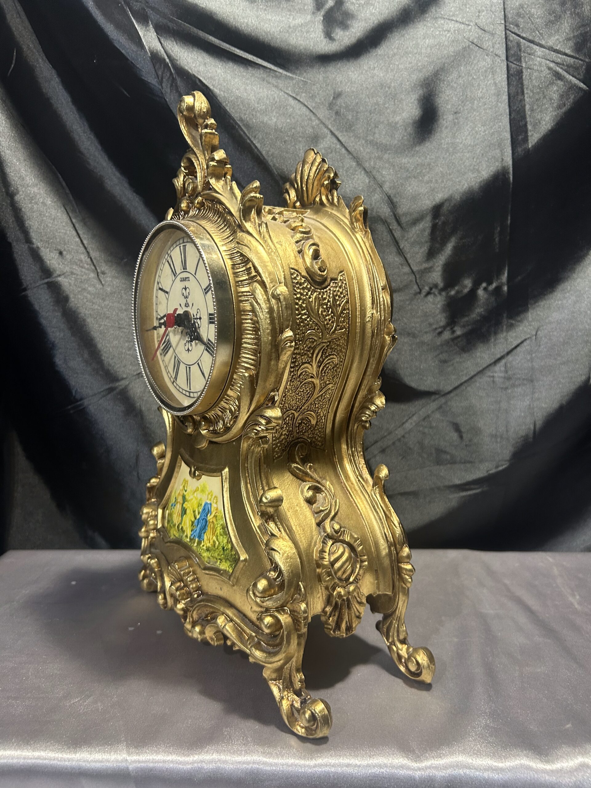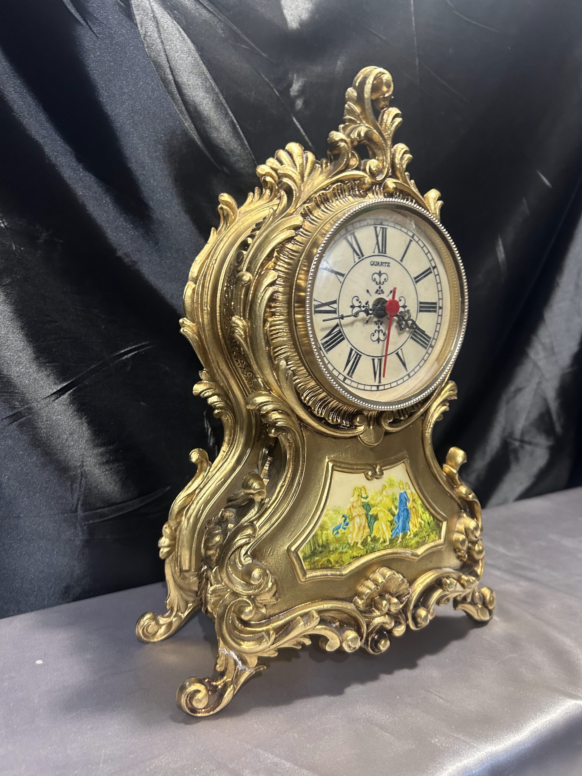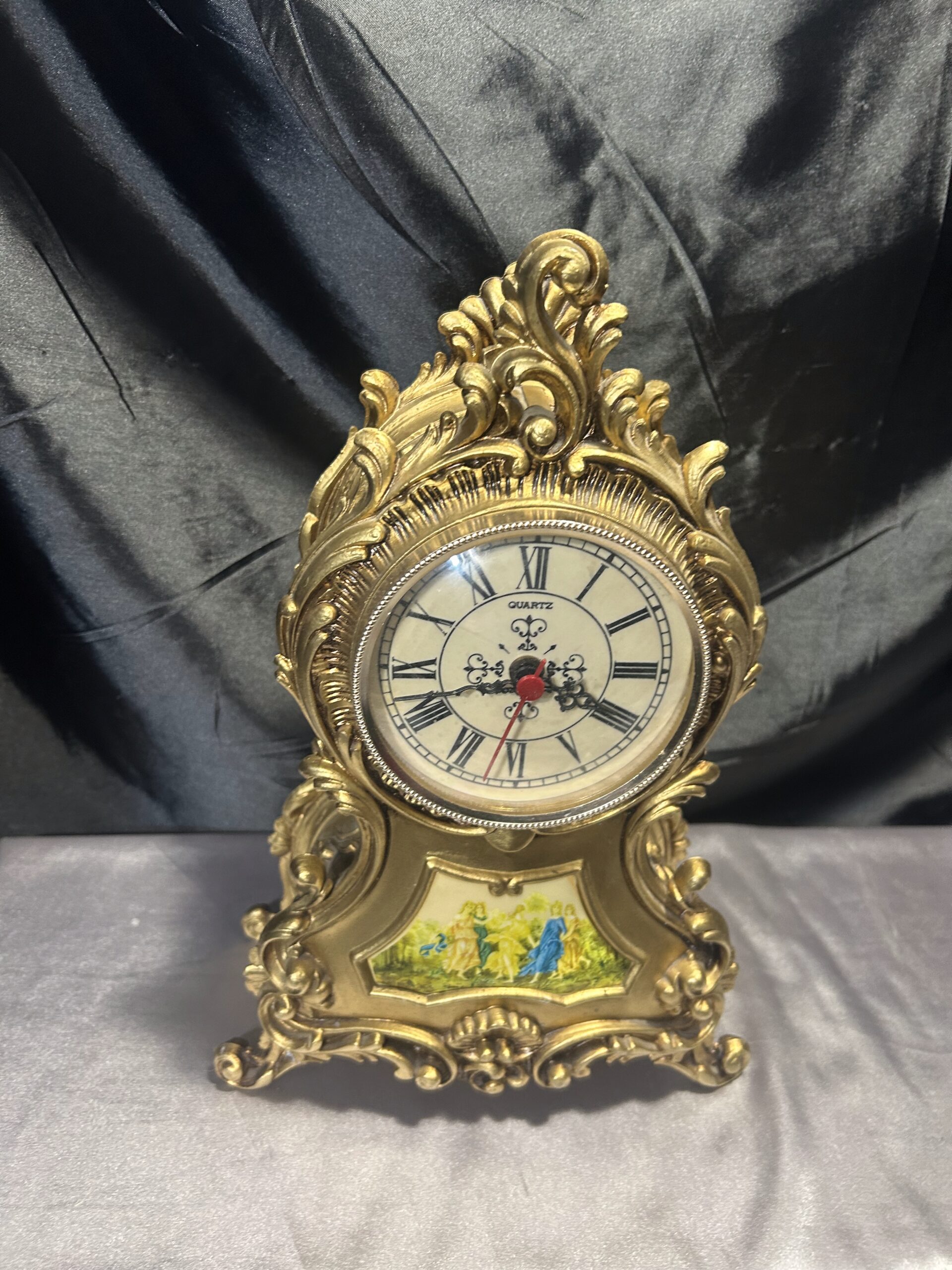 Dekoracyjny zegar kominkowy w stylu rokoko, wyróżniający się bogato zdobioną, złotą obudową, która doskonale imituje mosiądz. Jego efektowny kształt i misternie wykonane detale nadają mu wyjątkowy, antyczny charakter. U podstawy znajduje się ręcznie malowany motyw inspirowany klasycznym malarstwem, co dodaje zegarowi jeszcze większej unikalności.