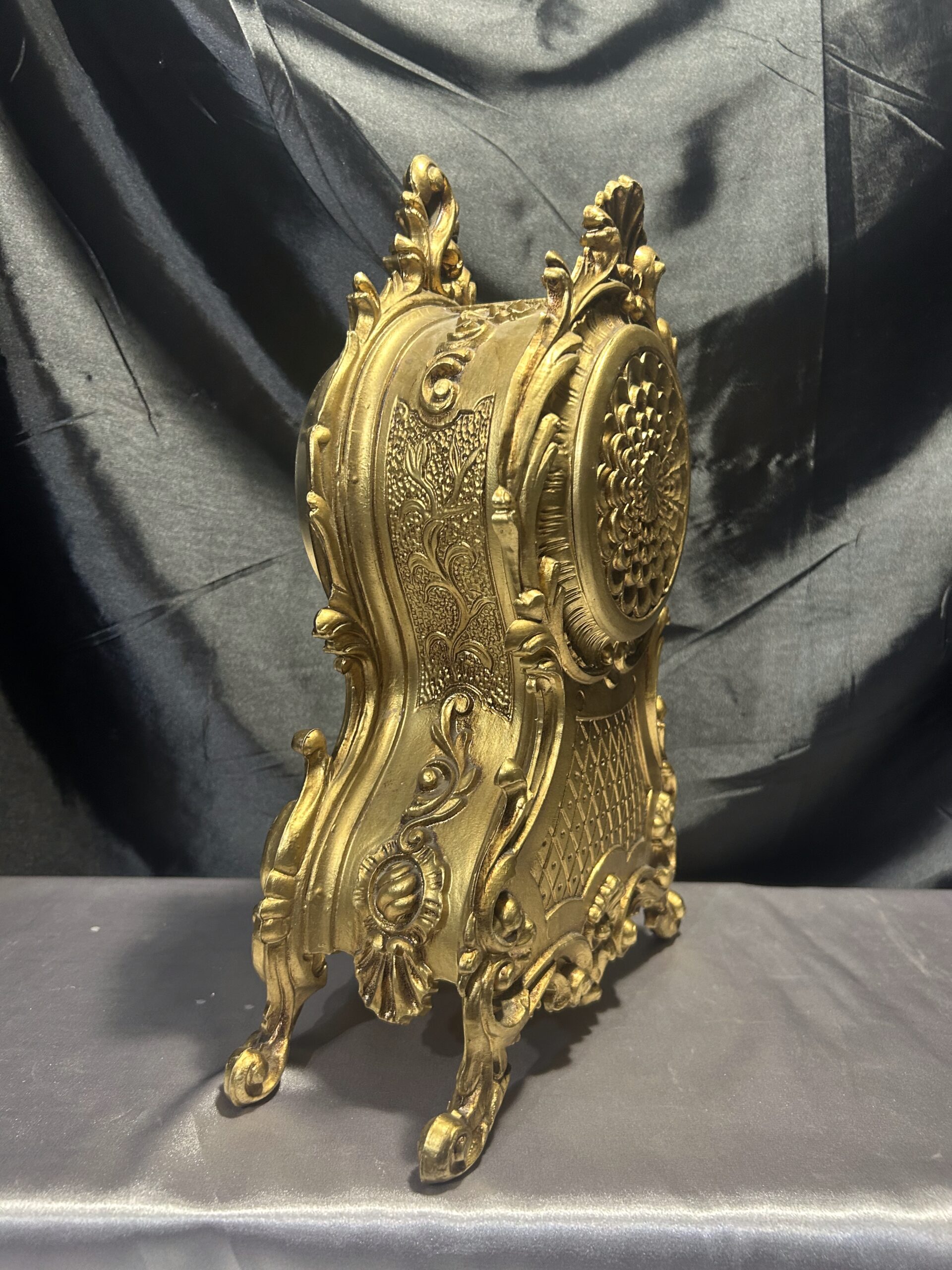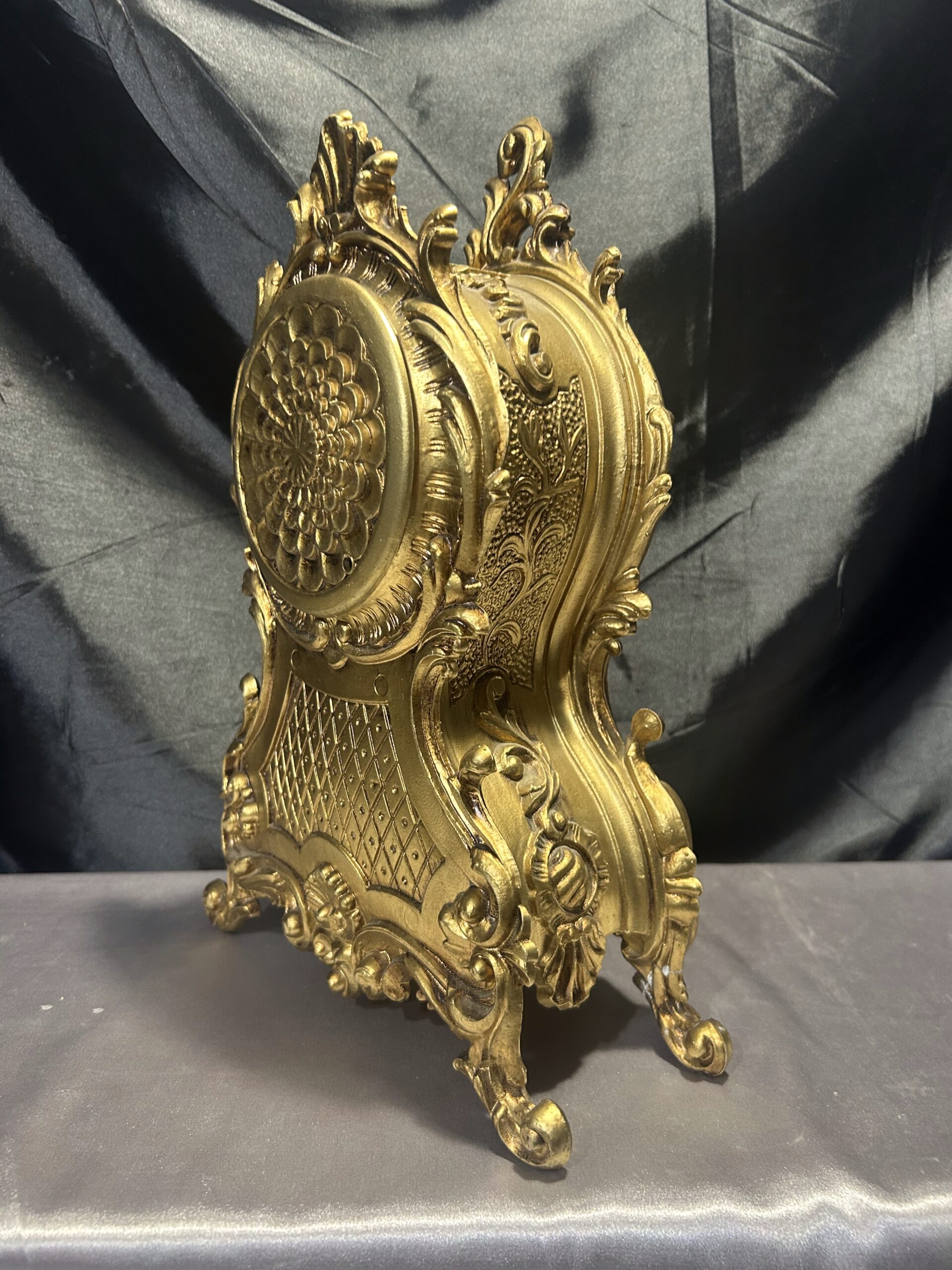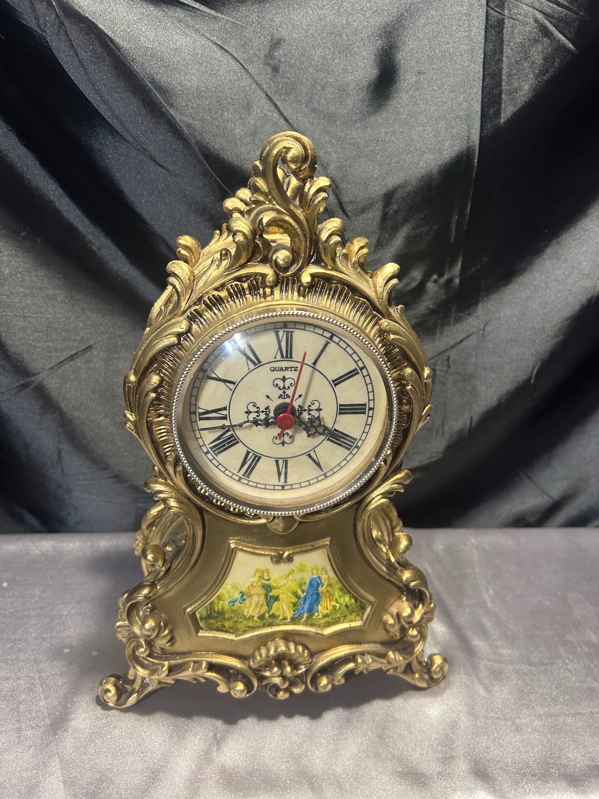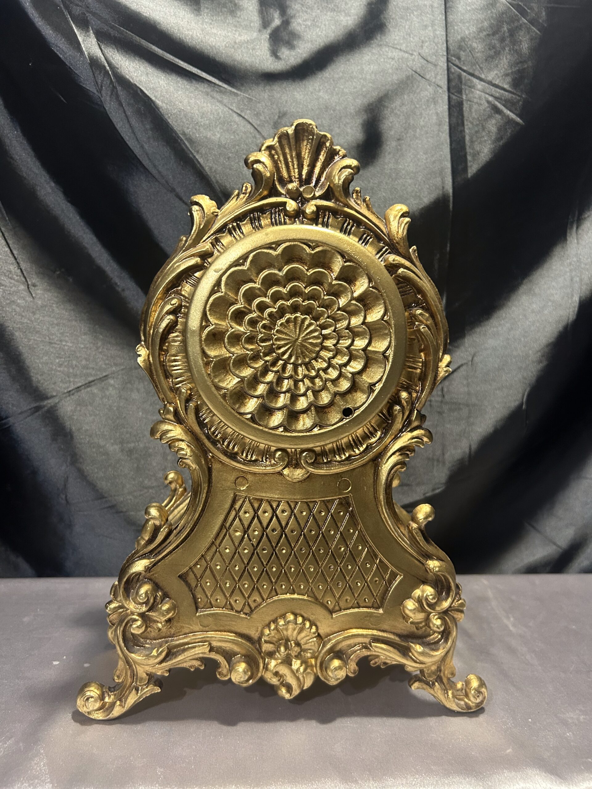 Dekoracyjny zegar kominkowy w stylu rokoko, wyróżniający się bogato zdobioną, złotą obudową, która doskonale imituje mosiądz. Jego efektowny kształt i misternie wykonane detale nadają mu wyjątkowy, antyczny charakter. U podstawy znajduje się ręcznie malowany motyw inspirowany klasycznym malarstwem, co dodaje zegarowi jeszcze większej unikalności.