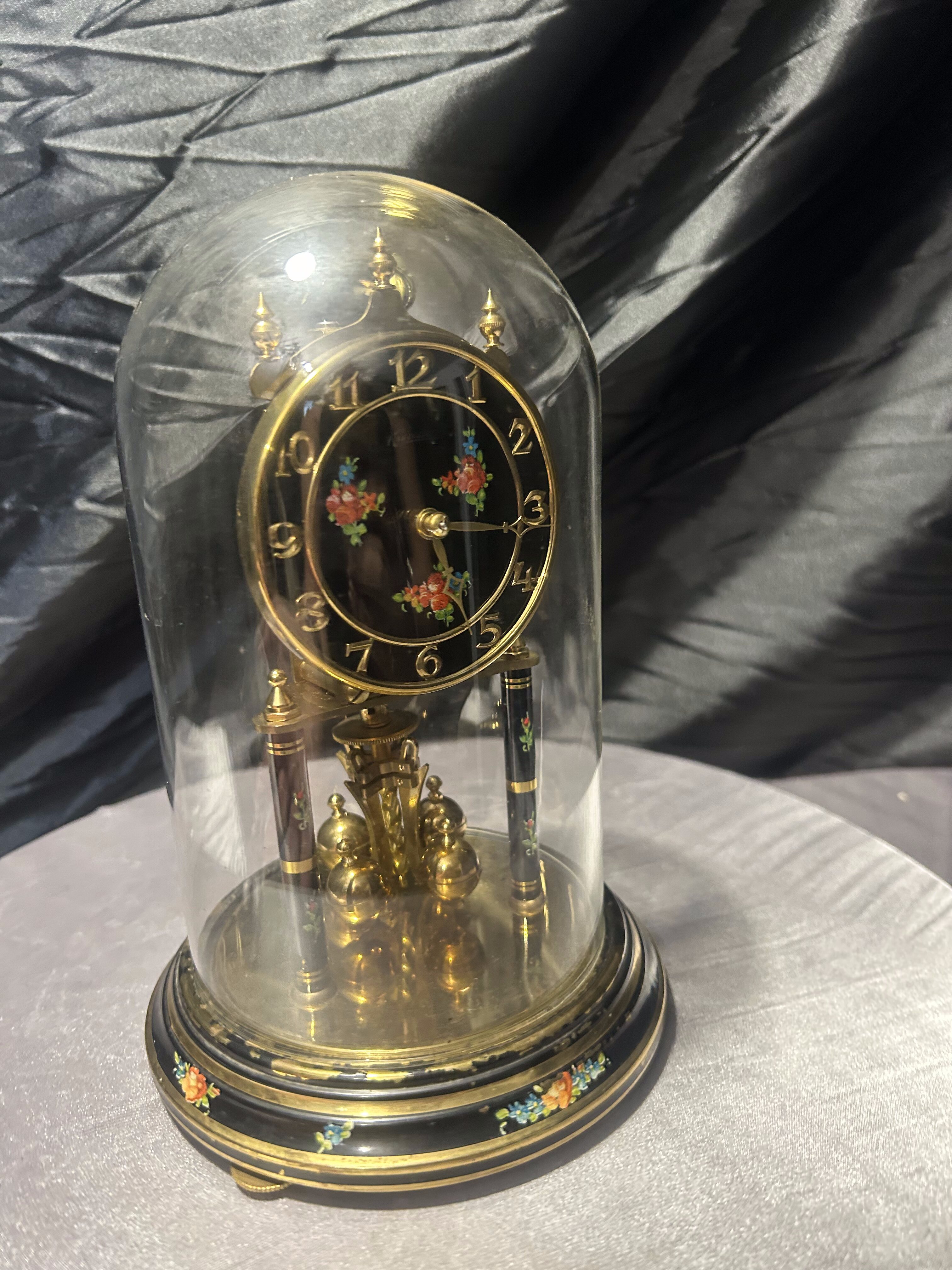 Tarcza w kolorze czarnym została ozdobiona barwnymi, kwiatowymi motywami, harmonizującymi z dekoracjami na podstawie i kolumnach zegara. Całość utrzymano w klasycznym złoto-czarnym zestawieniu, co nadaje mu wyszukany, stylowy charakter. Kule obrotowe wypadły z prowadnicy – wystarczy je ponownie osadzić, aby zegar prezentował się kompletnie. Idealny jako element dekoracyjny, kolekcjonerski lub do dalszego dopracowania.