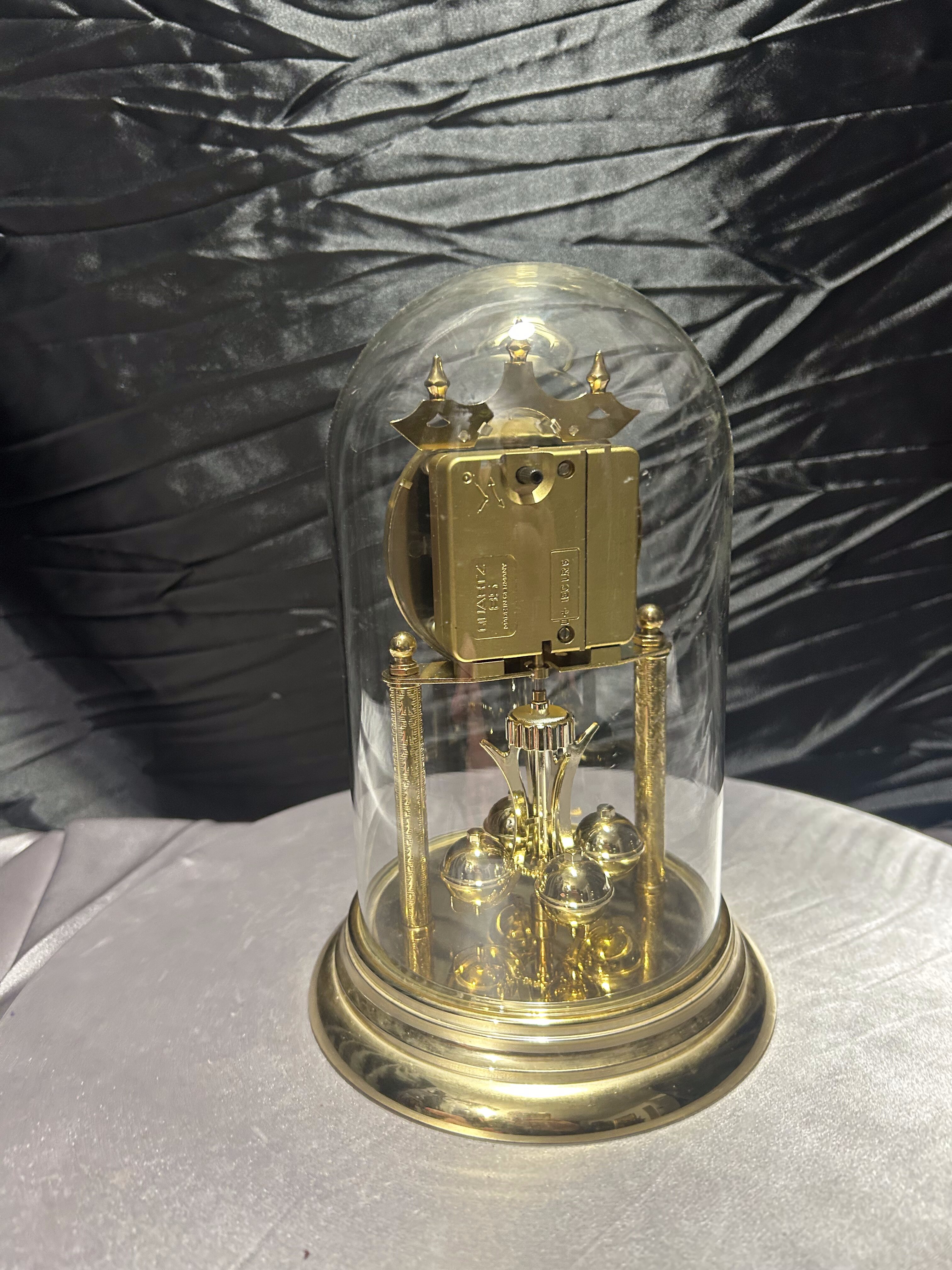 Oferuję elegancki zegar rocznik w szklanej kopule renomowanej firmy Junghans. Model kwarcowy, zasilany baterią, zachwyca złotymi detalami i klasycznym mechanizmem obrotowych kul dekoracyjnych. To wyjątkowa dekoracja wnętrza i praktyczny czasomierz w jednym.