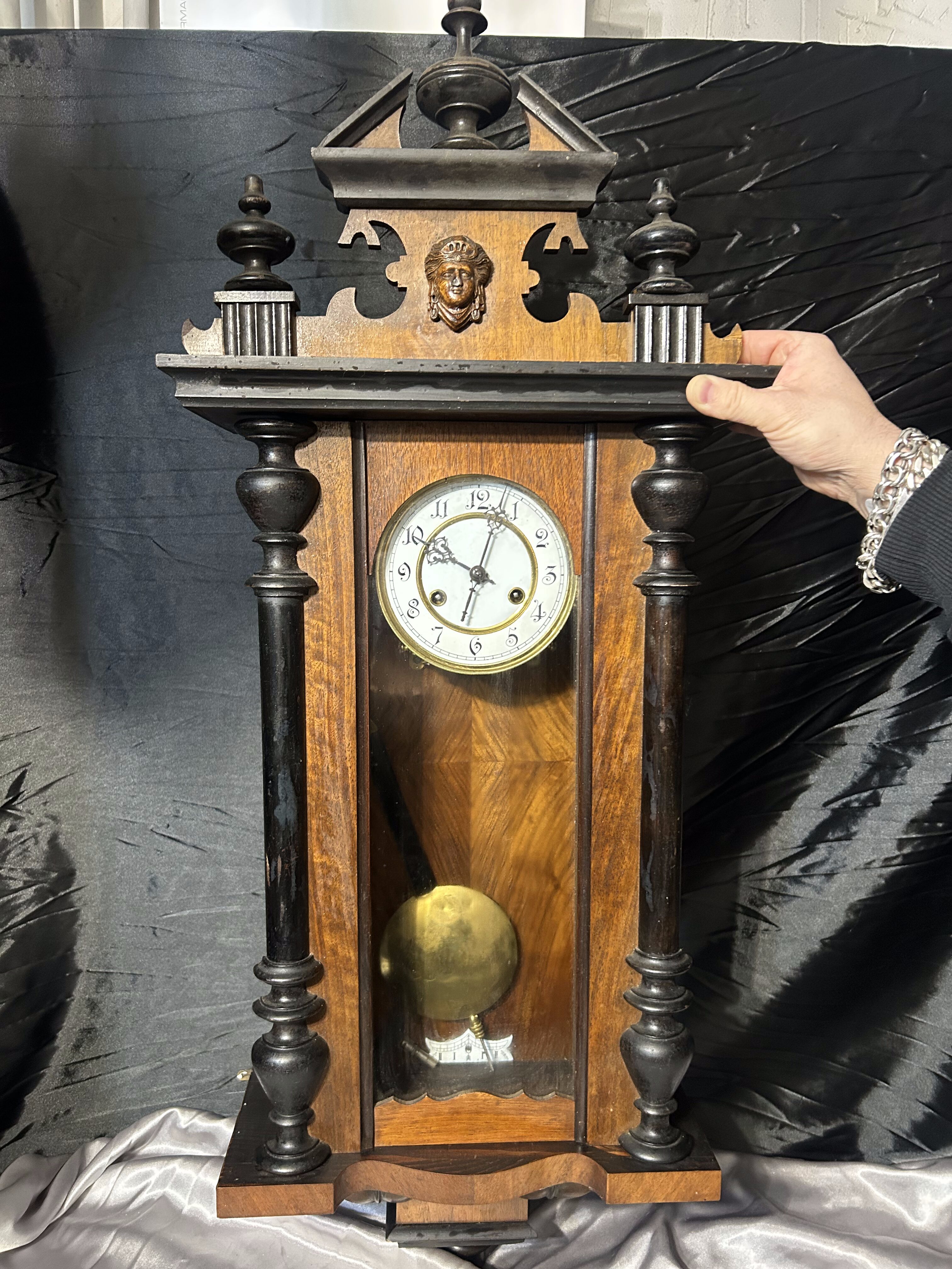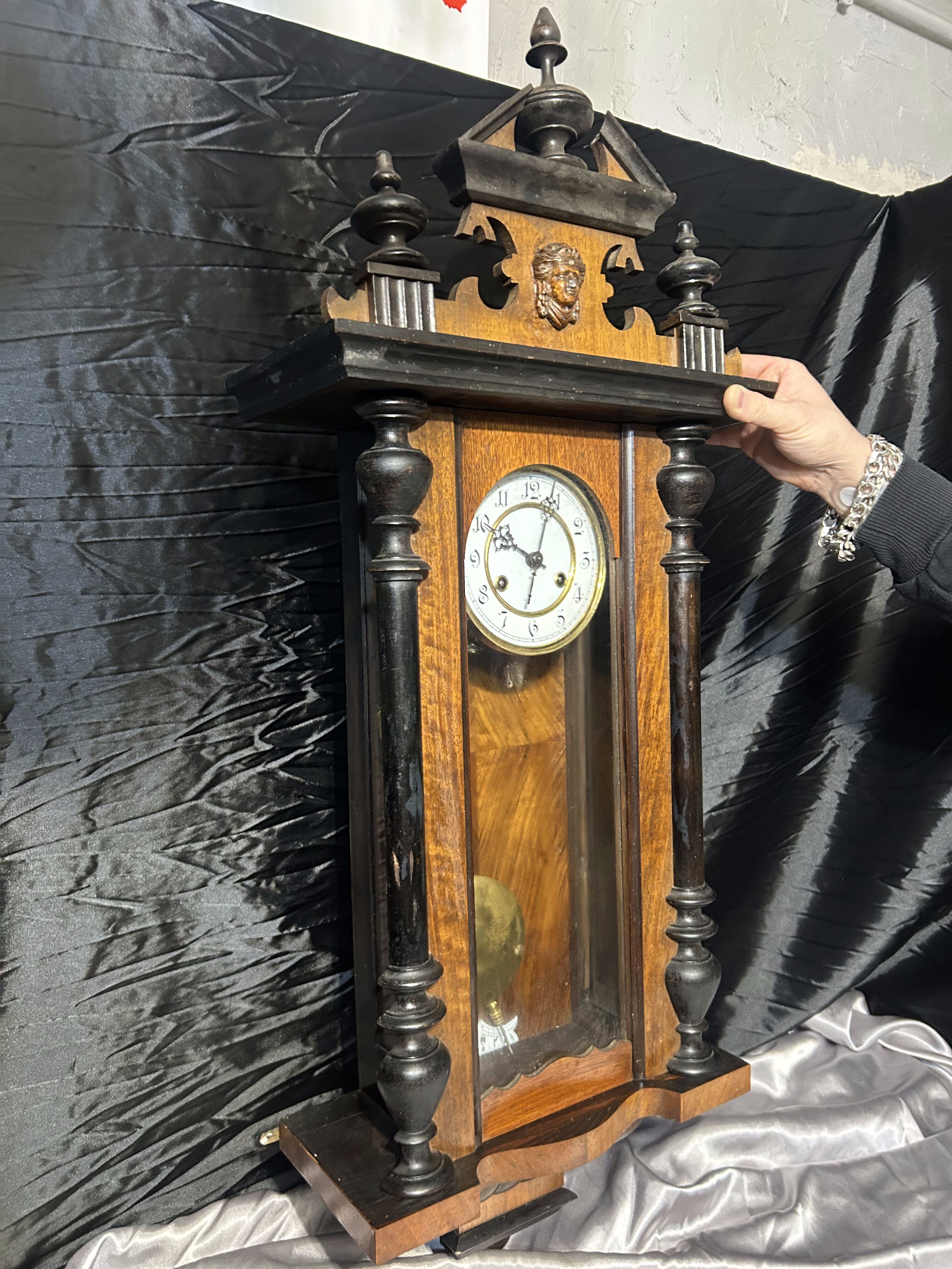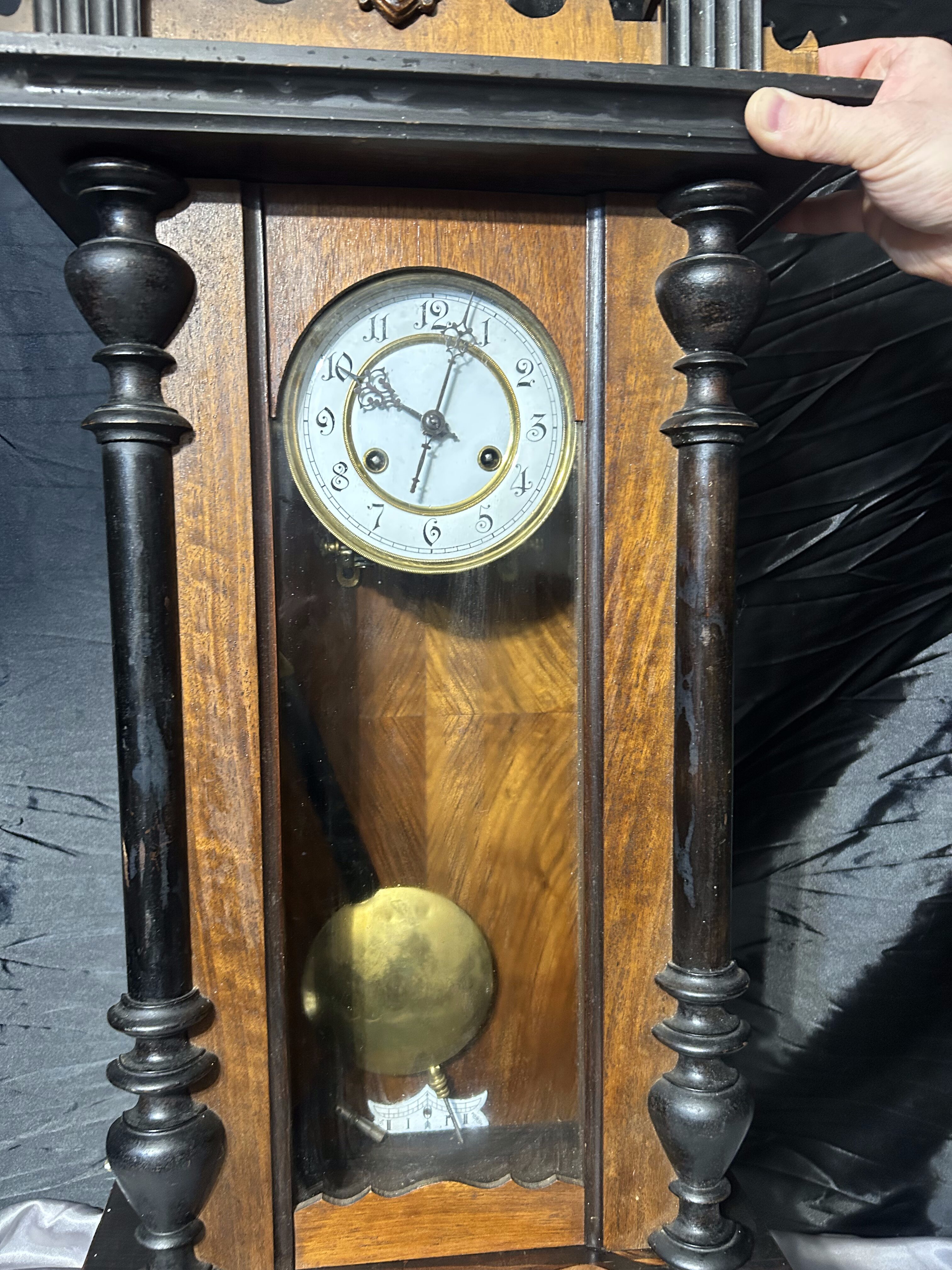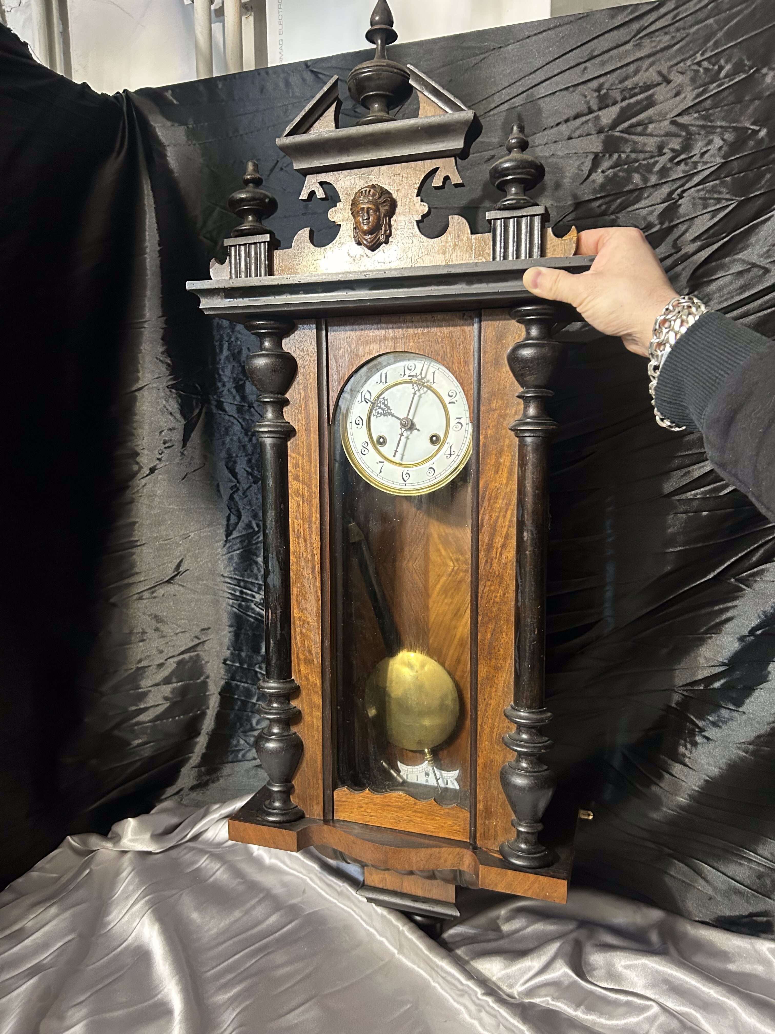 Elegancki, drewniany zegar ścienny z wahadłem, nakręcany kluczykiem. Bogato zdobiona forma, kolumnowe elementy oraz dekoracyjny detal w górnej części nadają mu reprezentacyjny, klasyczny charakter. Zegar stanowi wyrazisty akcent wnętrza i doskonale wpisuje się w stylistykę klasyczną, dworkową oraz vintage.