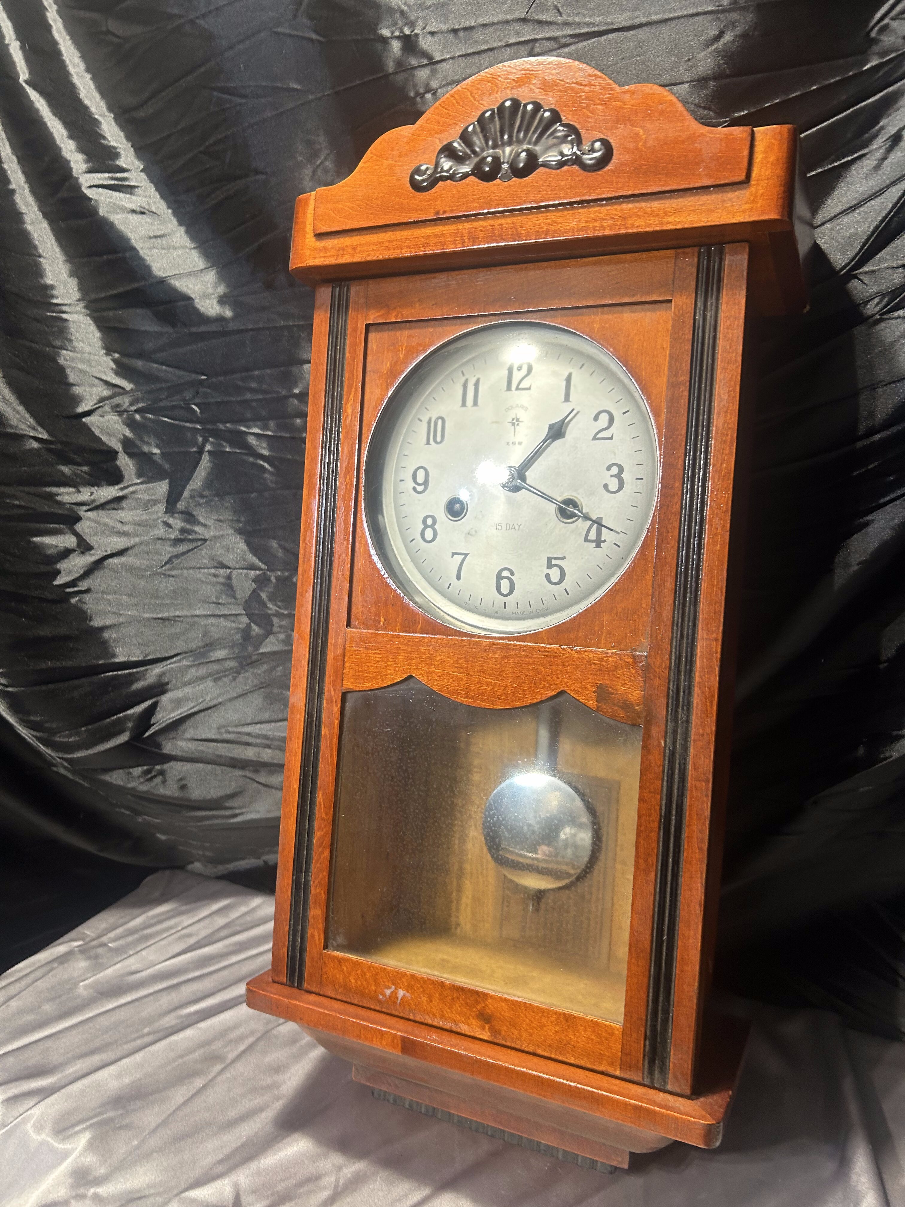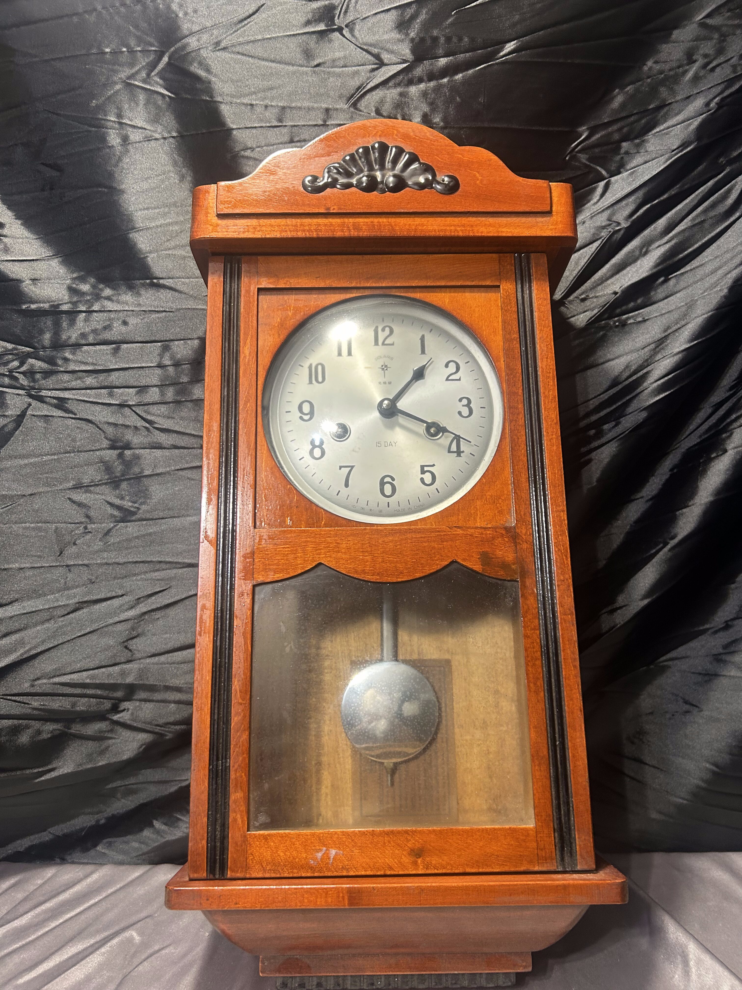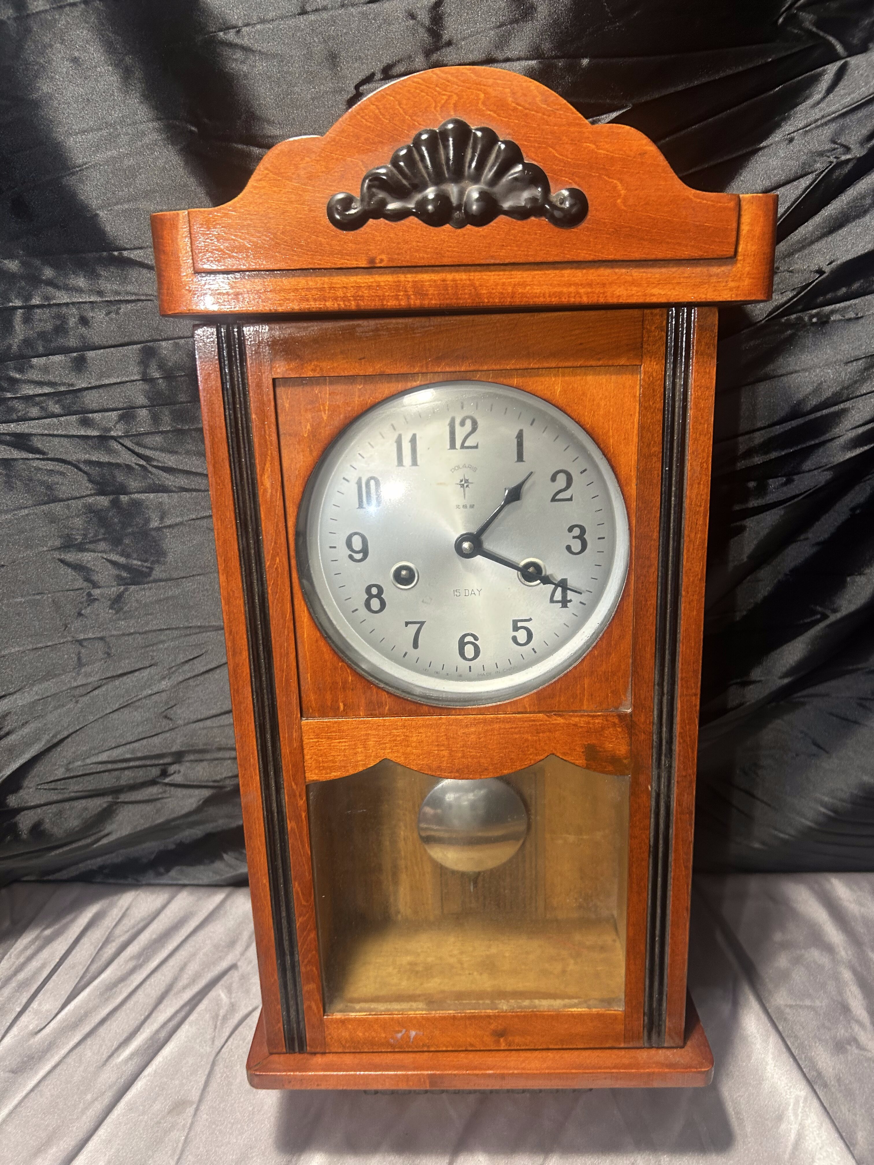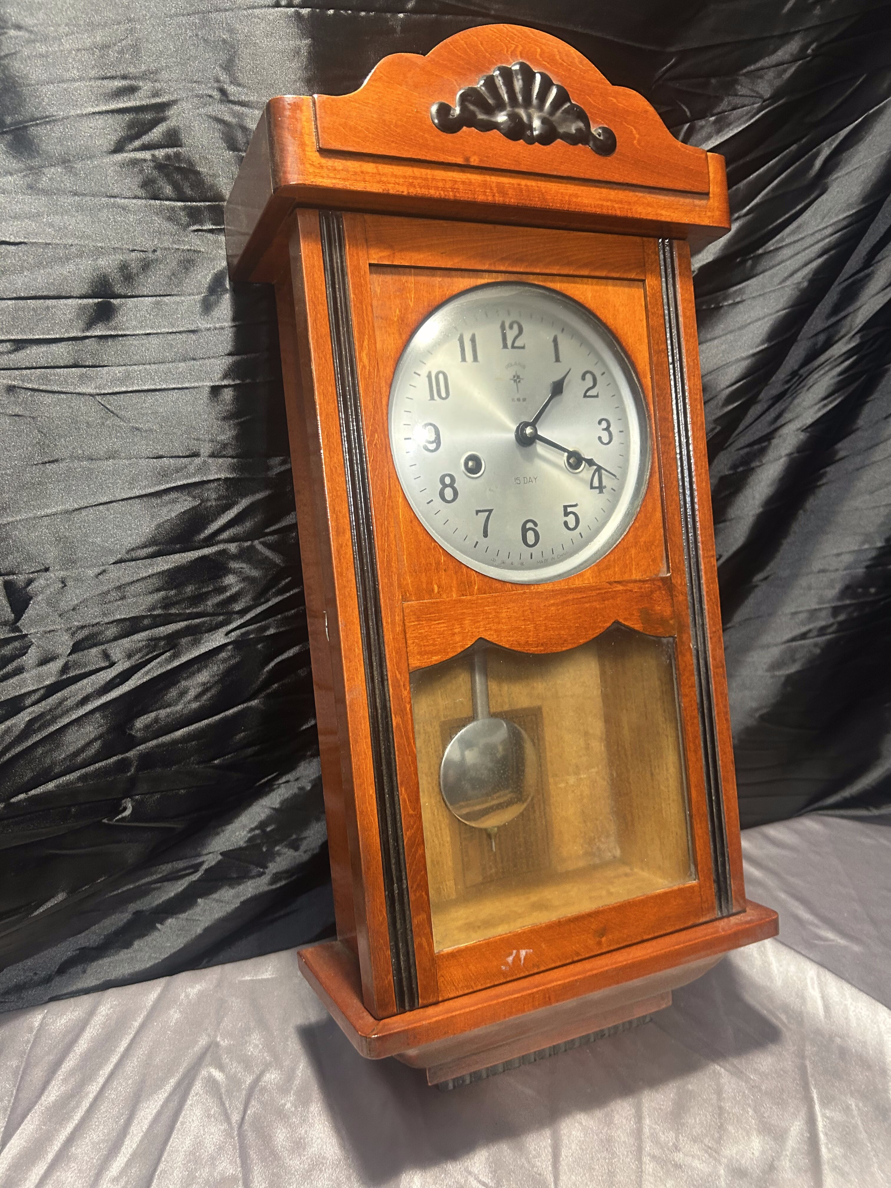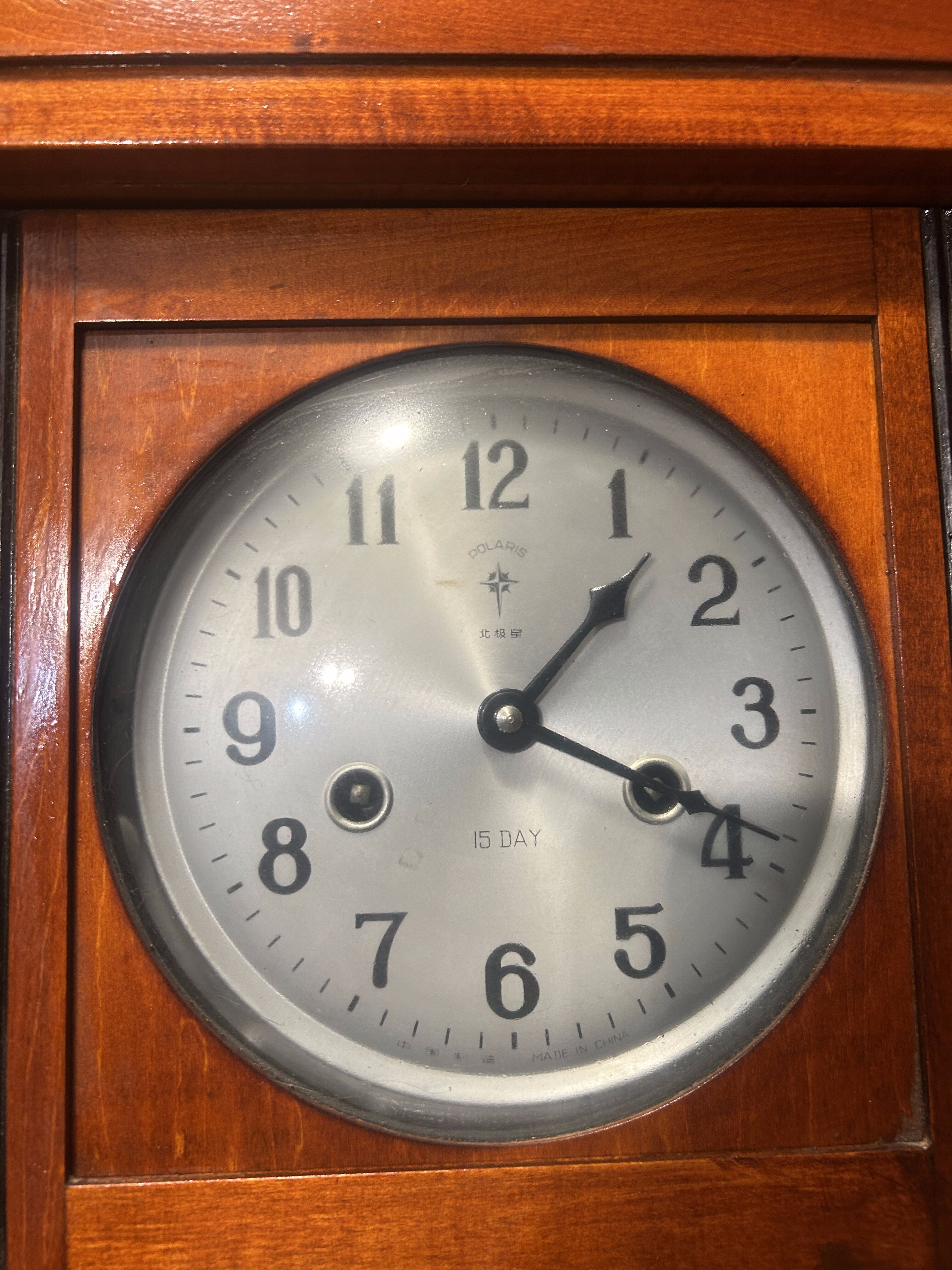 Klasyczny zegar ścienny marki Polaris, osadzony w drewnianej obudowie z delikatnym rzeźbieniem i przeszklonym frontem. Tarcza z wyraźnymi cyframi oraz oznaczeniem „15 DAY” wskazuje na mechanizm nakręcany z rezerwą chodu do 15 dni. Styl zegara harmonizuje z tradycyjnymi wnętrzami, a solidna, drewniana rama dodaje mu elegancji i ciepła.