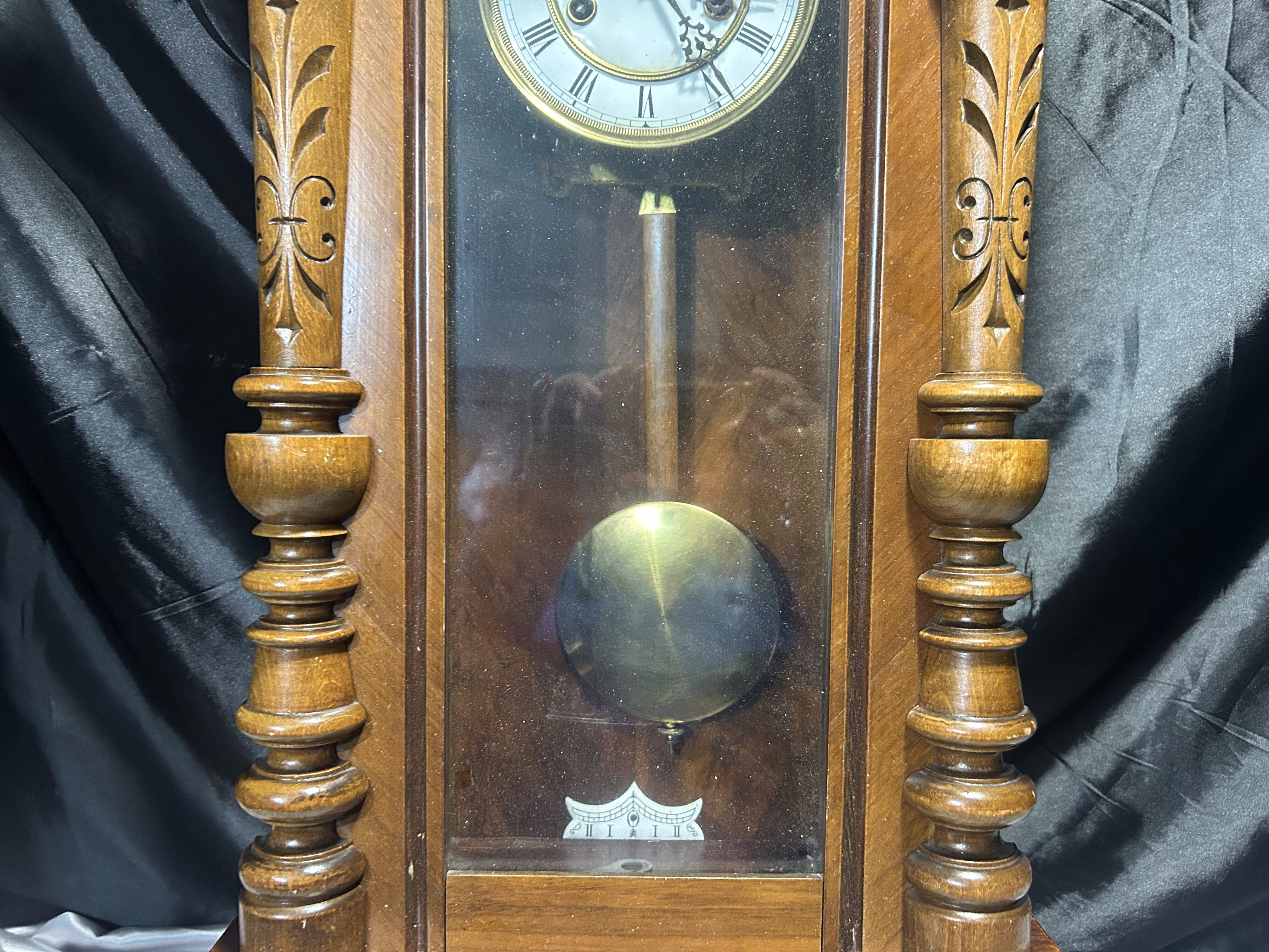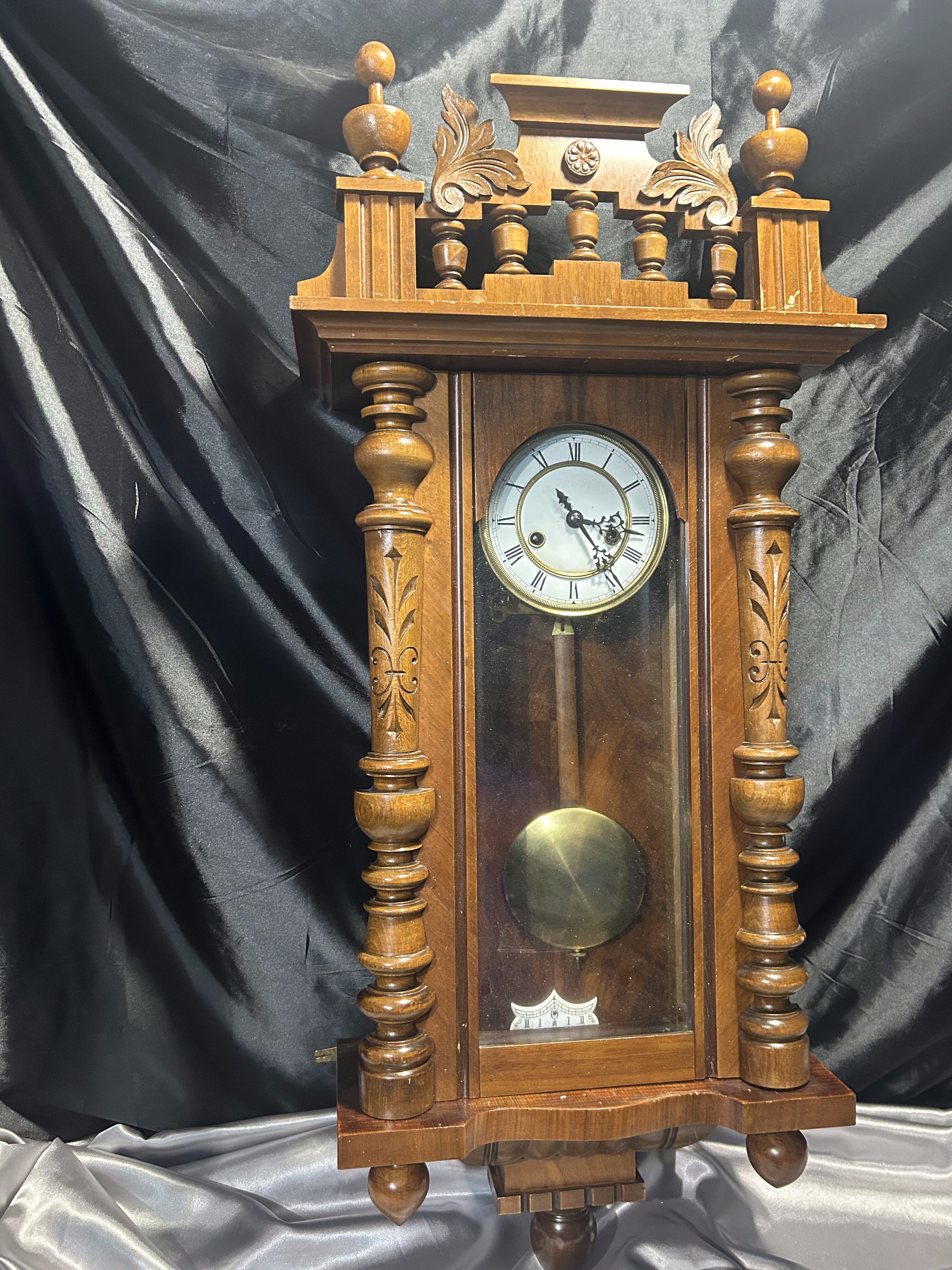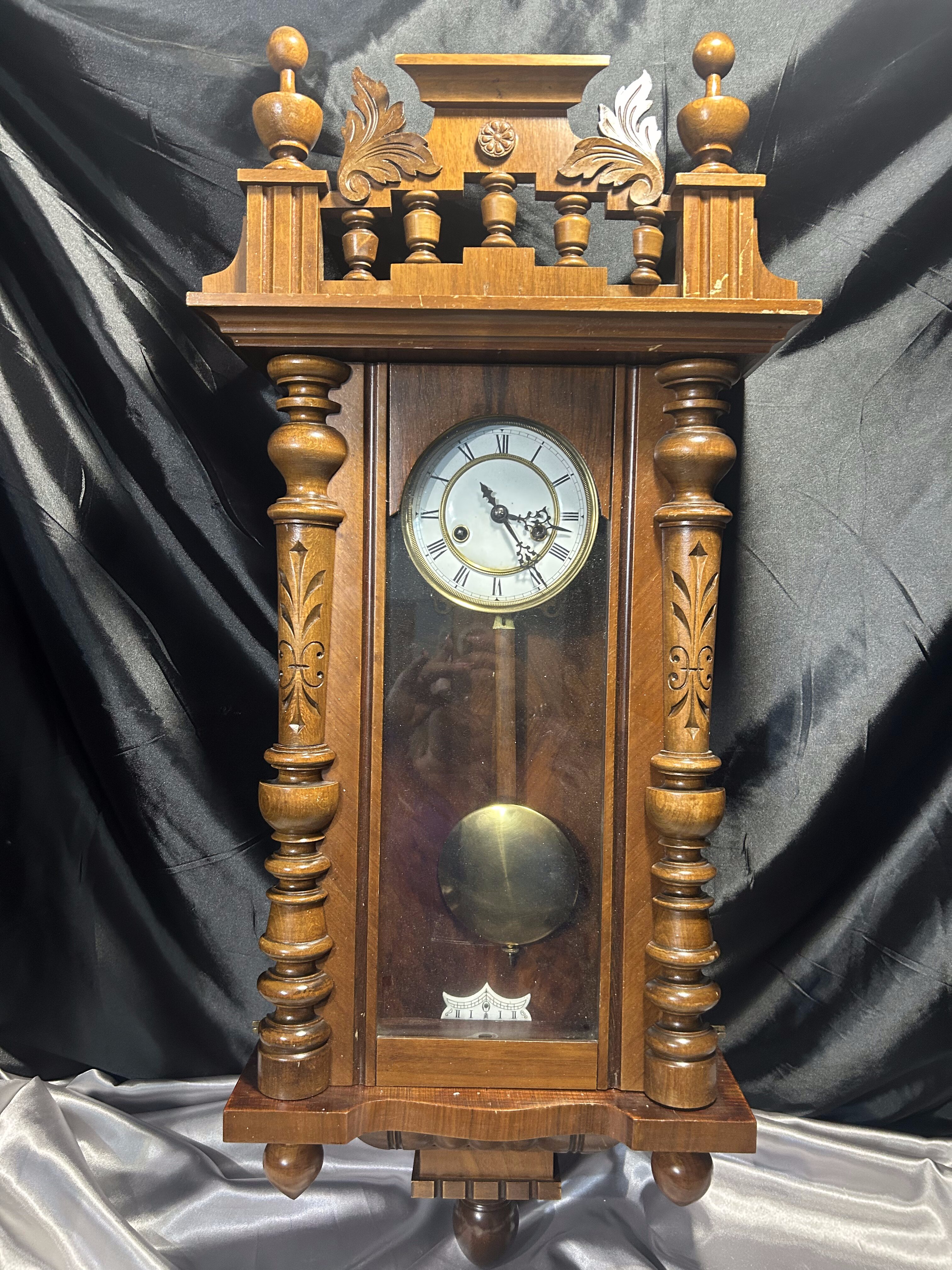 Imponujący zegar wiszący z drewnianą, bogato rzeźbioną obudową, która przyciąga wzrok swoją symetryczną kompozycją i finezyjnymi detalami. Tarcza w stylu retro z rzymskimi cyframi oraz wahadło widoczne za przeszklonym frontem dopełniają całości. Doskonały dodatek do wnętrz w stylu vintage, klasycznym czy rustykalnym.