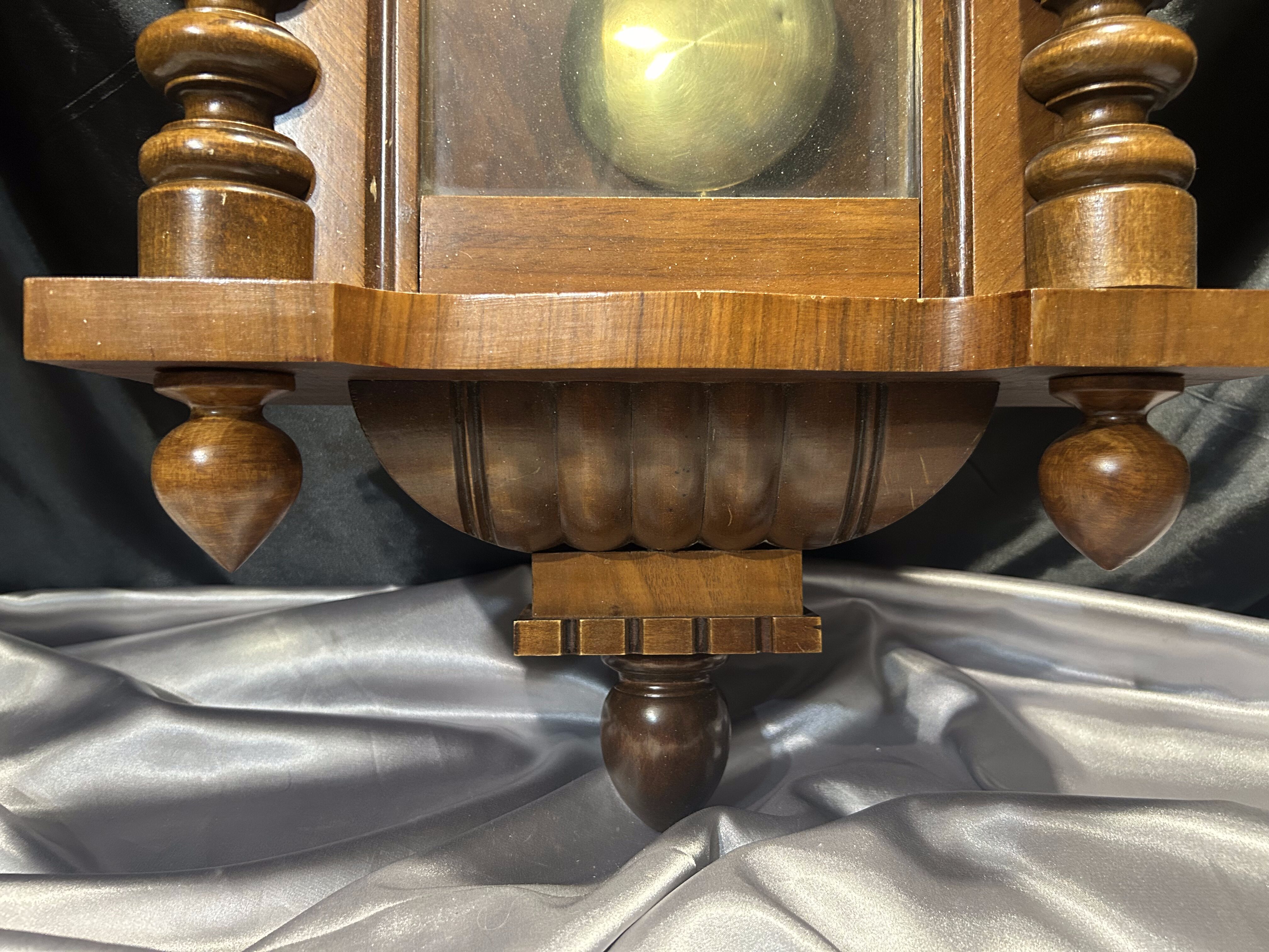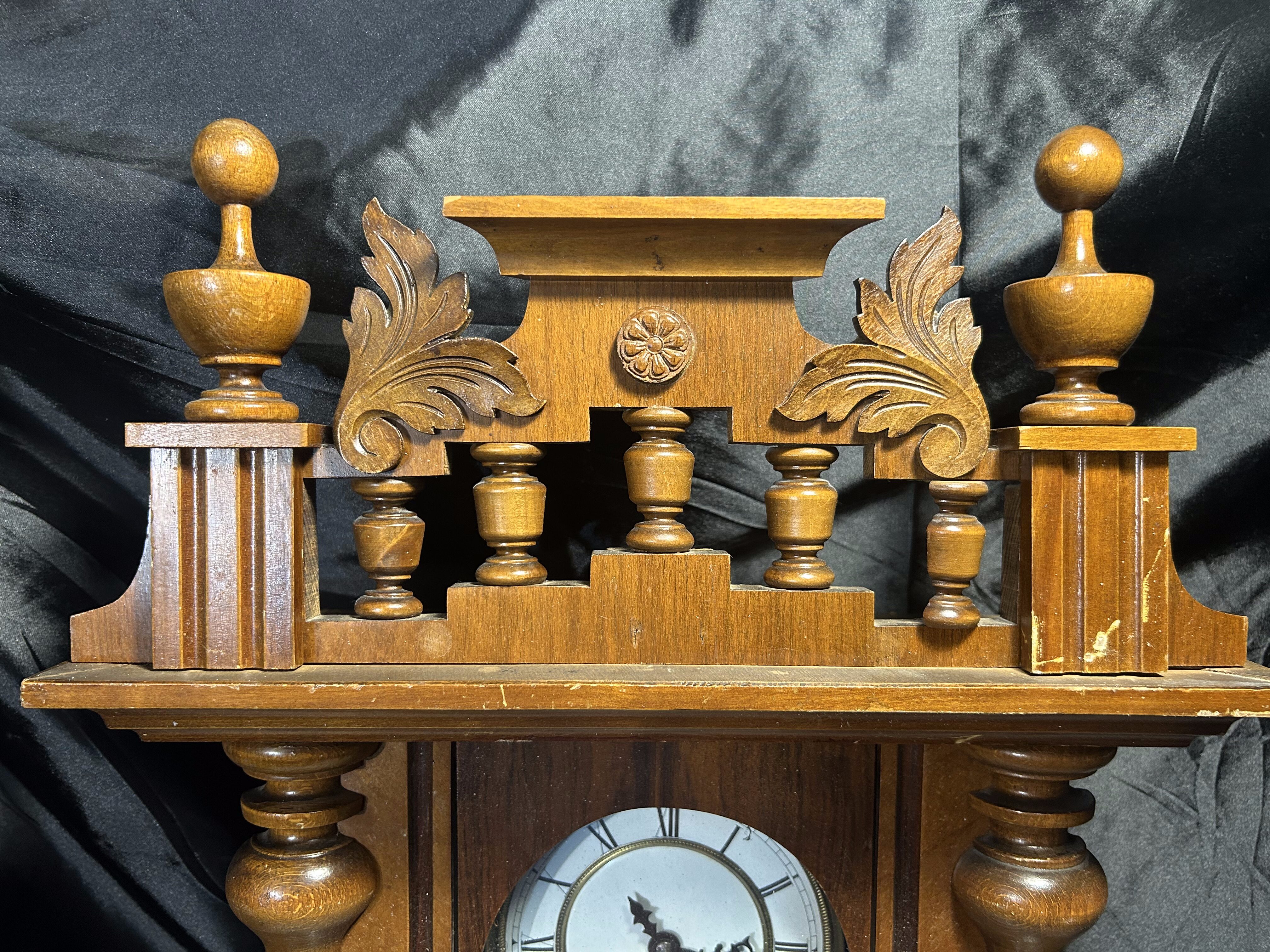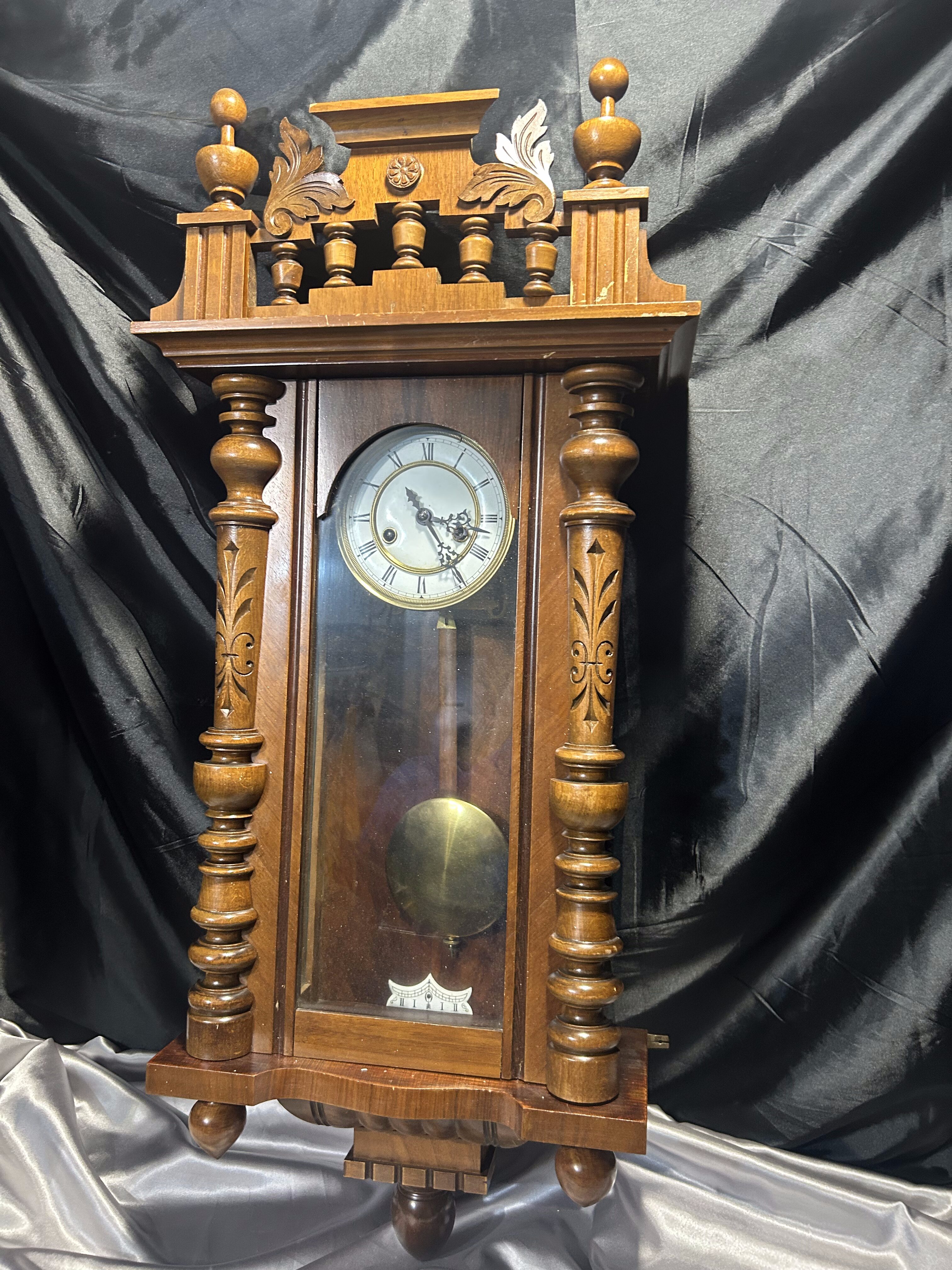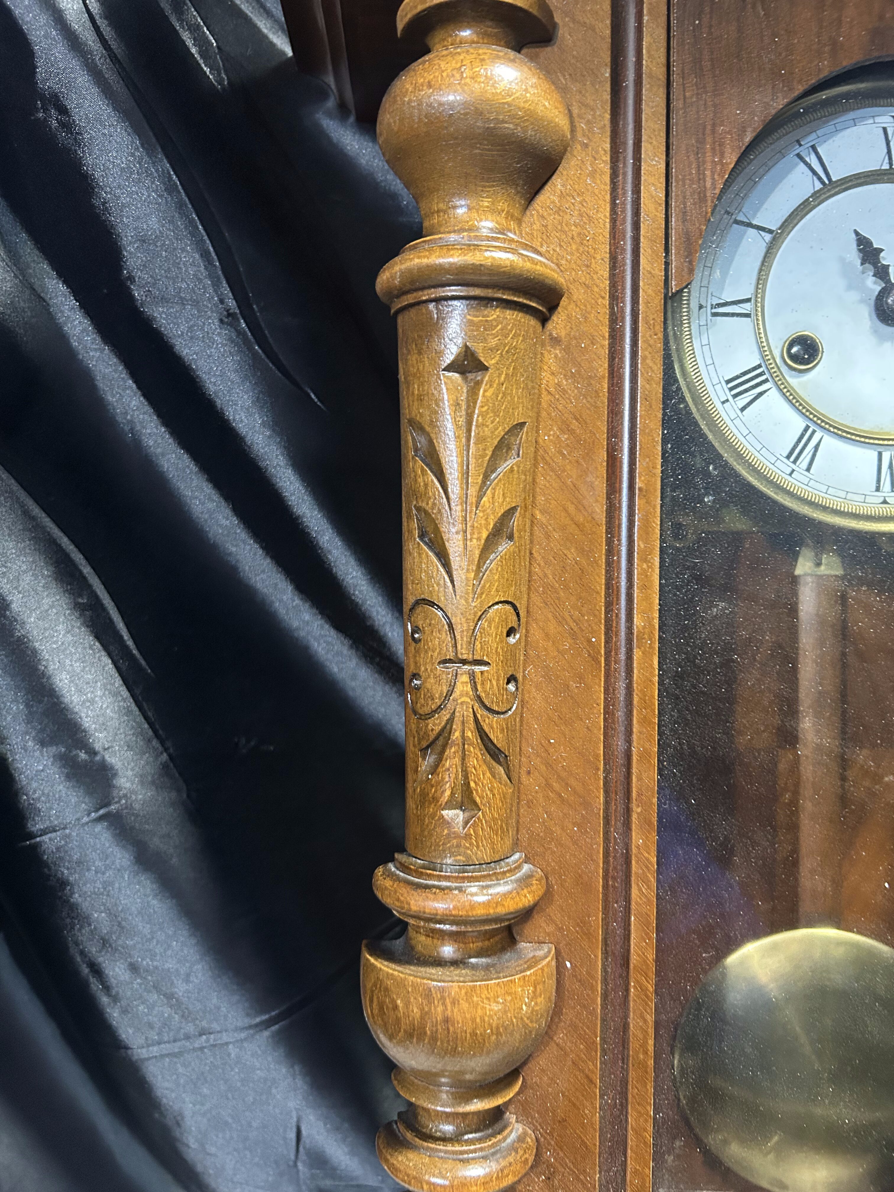 Imponujący zegar wiszący z drewnianą, bogato rzeźbioną obudową, która przyciąga wzrok swoją symetryczną kompozycją i finezyjnymi detalami. Tarcza w stylu retro z rzymskimi cyframi oraz wahadło widoczne za przeszklonym frontem dopełniają całości. Doskonały dodatek do wnętrz w stylu vintage, klasycznym czy rustykalnym.