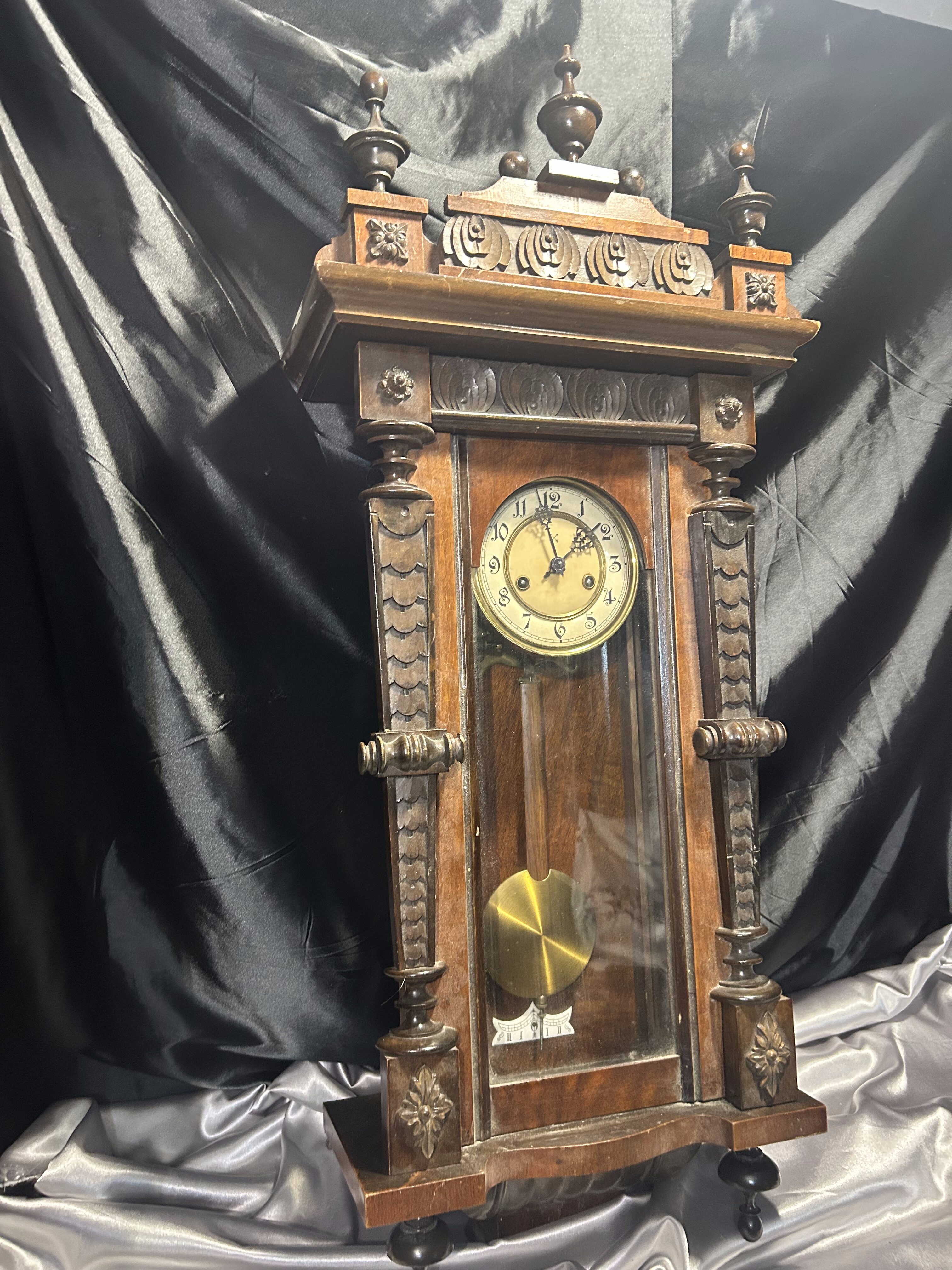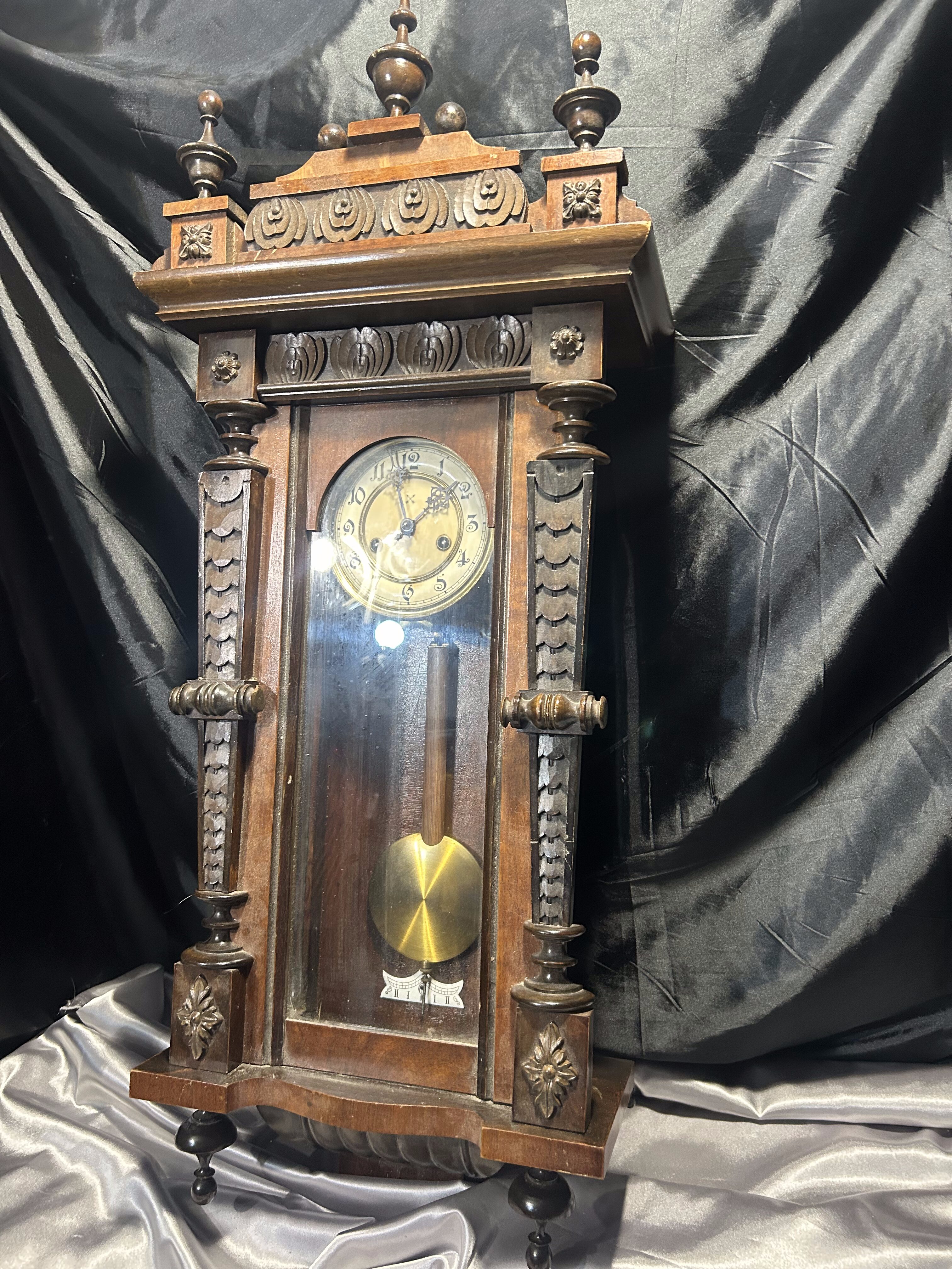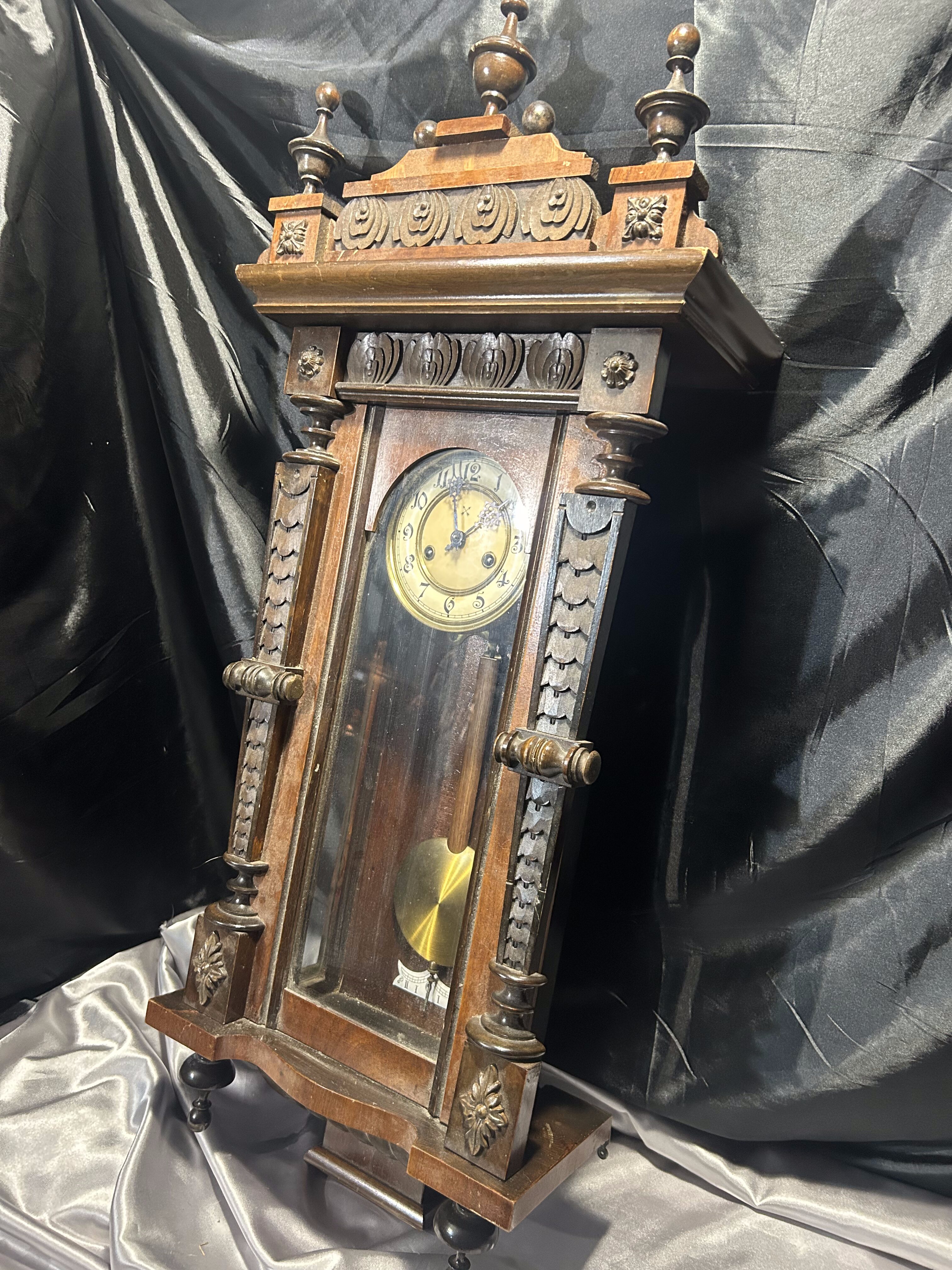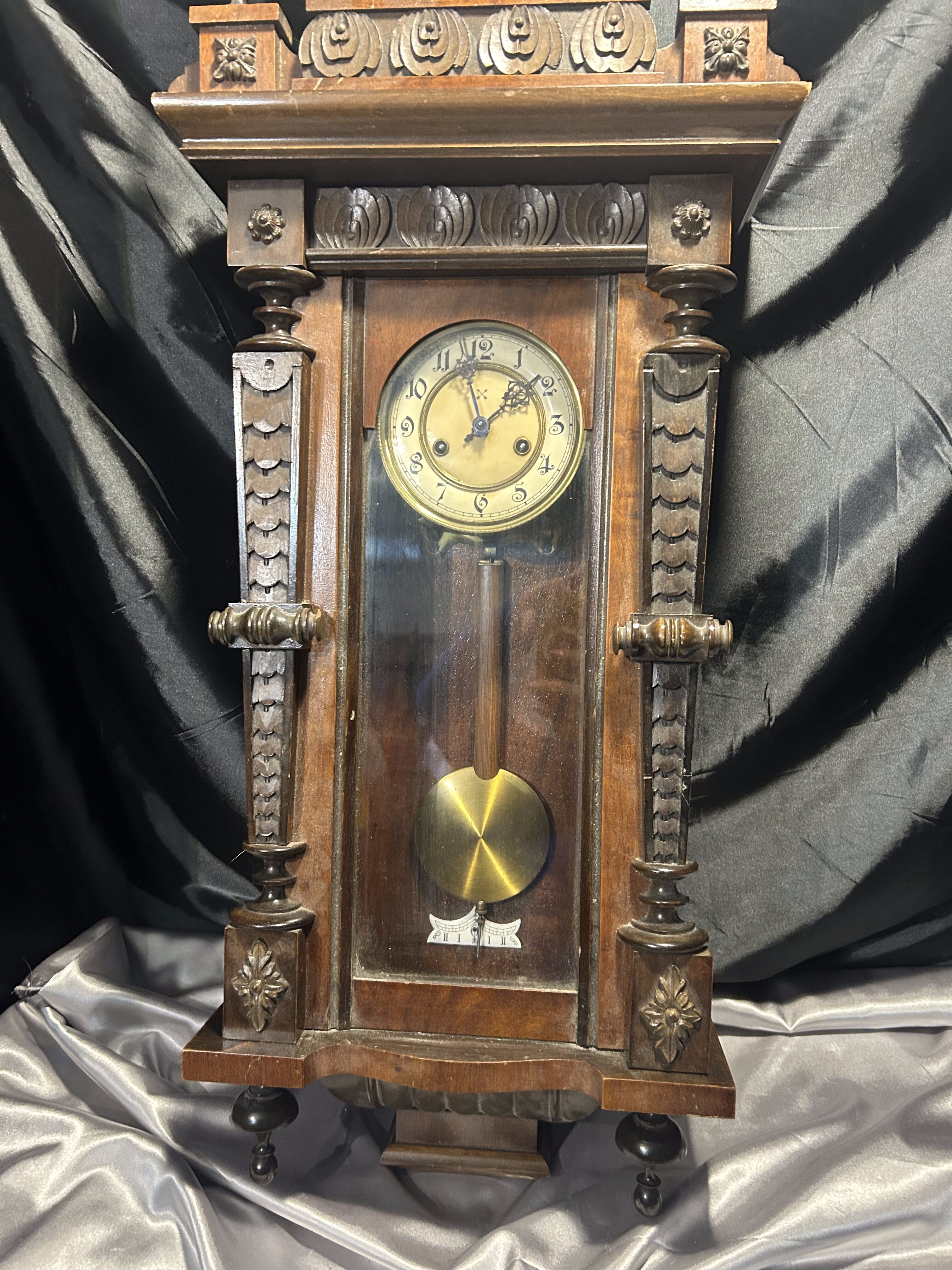 Elegancki zegar ścienny renomowanej marki Gustav Becker, znanej z precyzyjnego rzemiosła i ponadczasowej estetyki. Model w drewnianej, bogato rzeźbionej obudowie z dekoracyjnymi kolumienkami i zwieńczeniami. Zegar zachowany w bardzo dobrym stanie, z charakterystycznym dla Beckera mechanizmem oraz klasyczną tarczą z ozdobnymi wskazówkami. Idealny do wnętrz w stylu retro, vintage lub klasycznym.