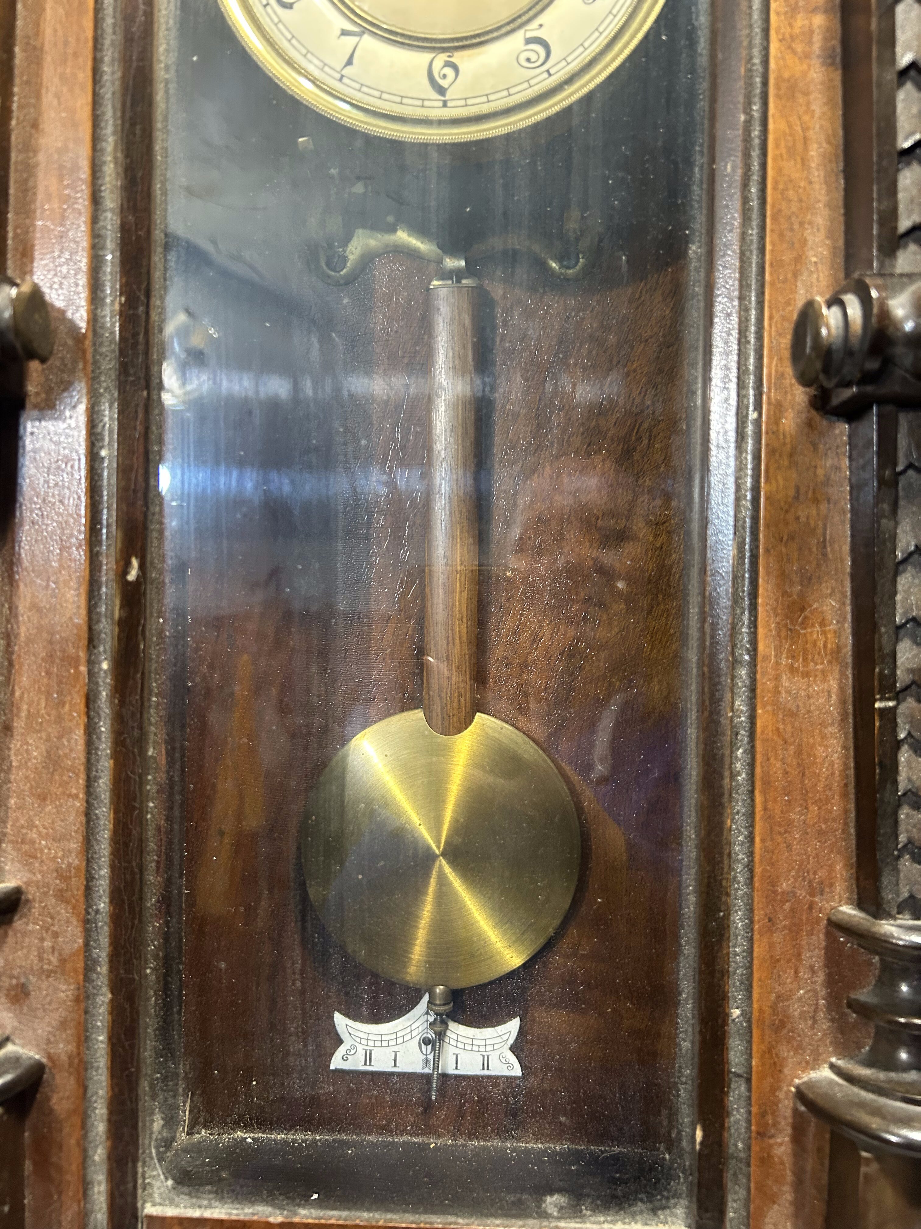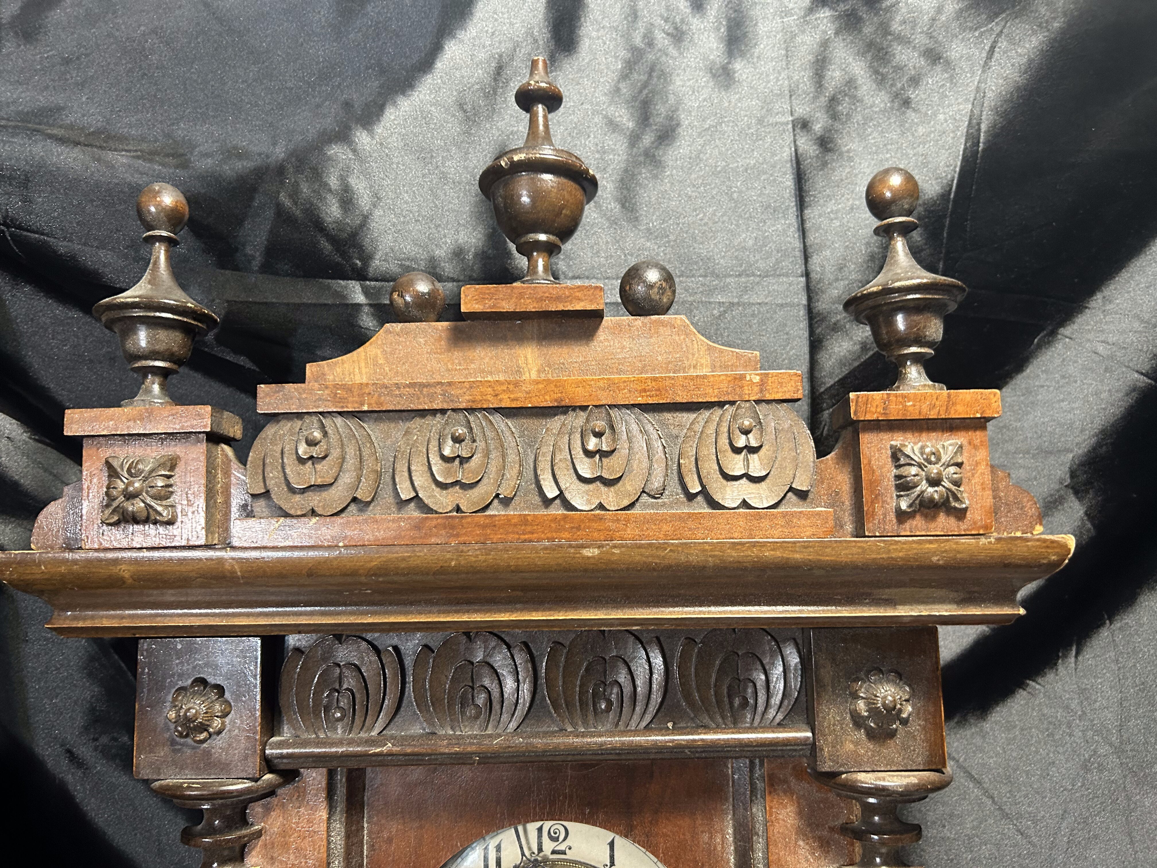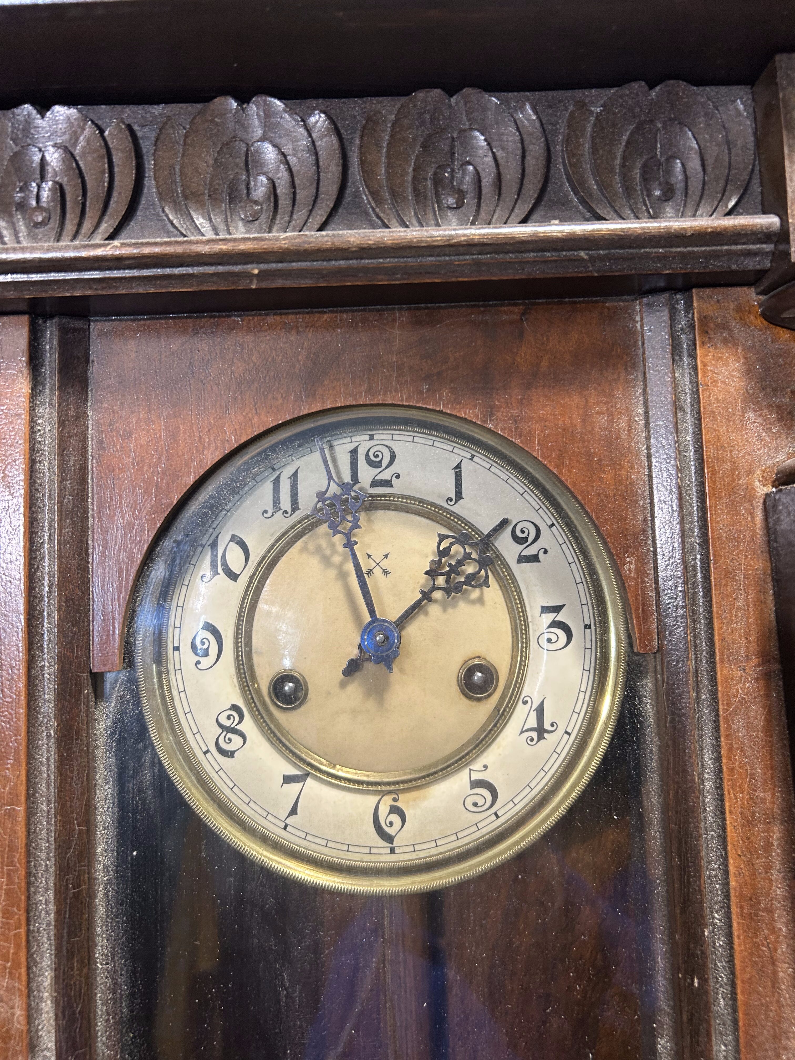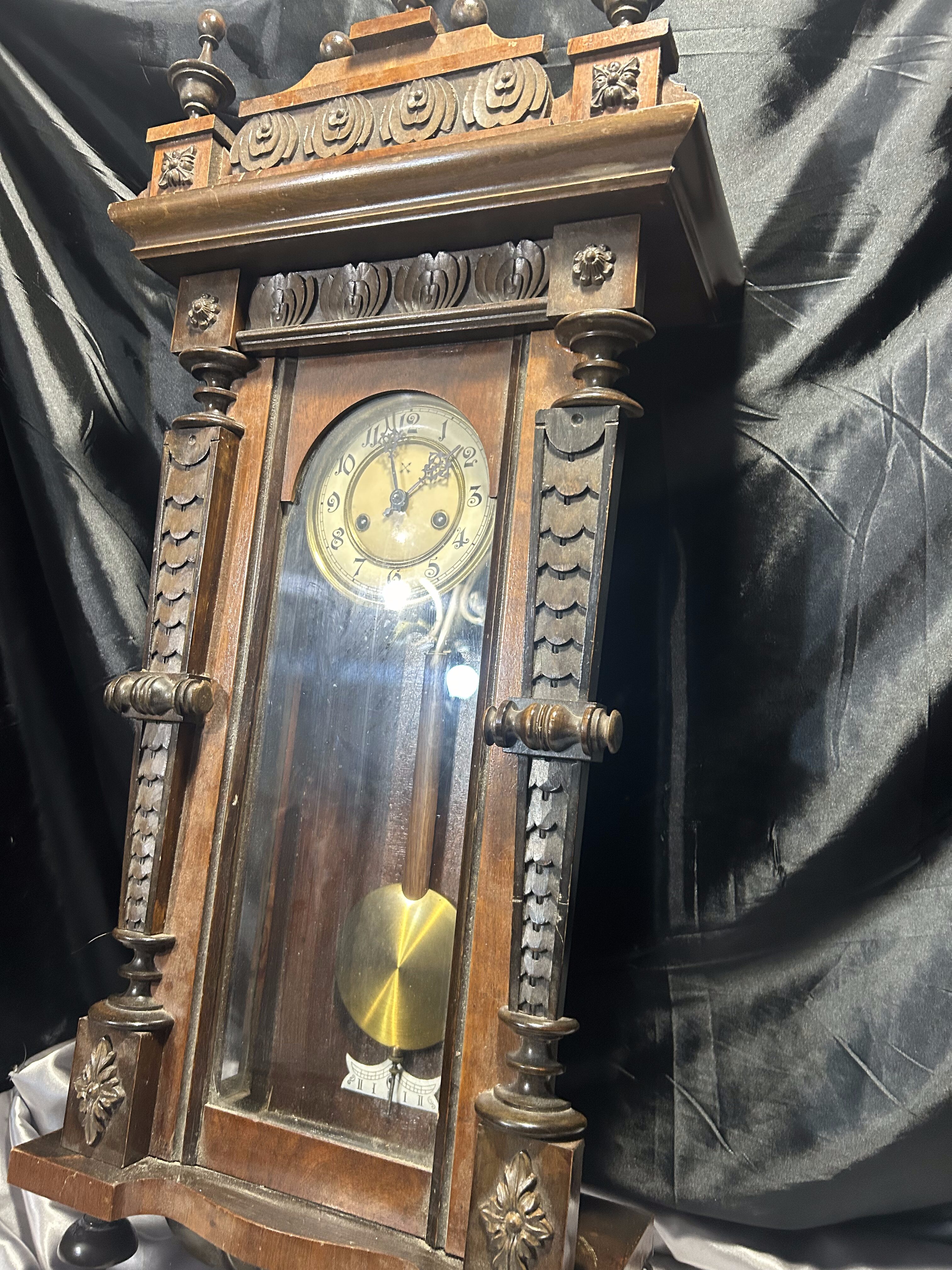 Elegancki zegar ścienny renomowanej marki Gustav Becker, znanej z precyzyjnego rzemiosła i ponadczasowej estetyki. Model w drewnianej, bogato rzeźbionej obudowie z dekoracyjnymi kolumienkami i zwieńczeniami. Zegar zachowany w bardzo dobrym stanie, z charakterystycznym dla Beckera mechanizmem oraz klasyczną tarczą z ozdobnymi wskazówkami. Idealny do wnętrz w stylu retro, vintage lub klasycznym.
