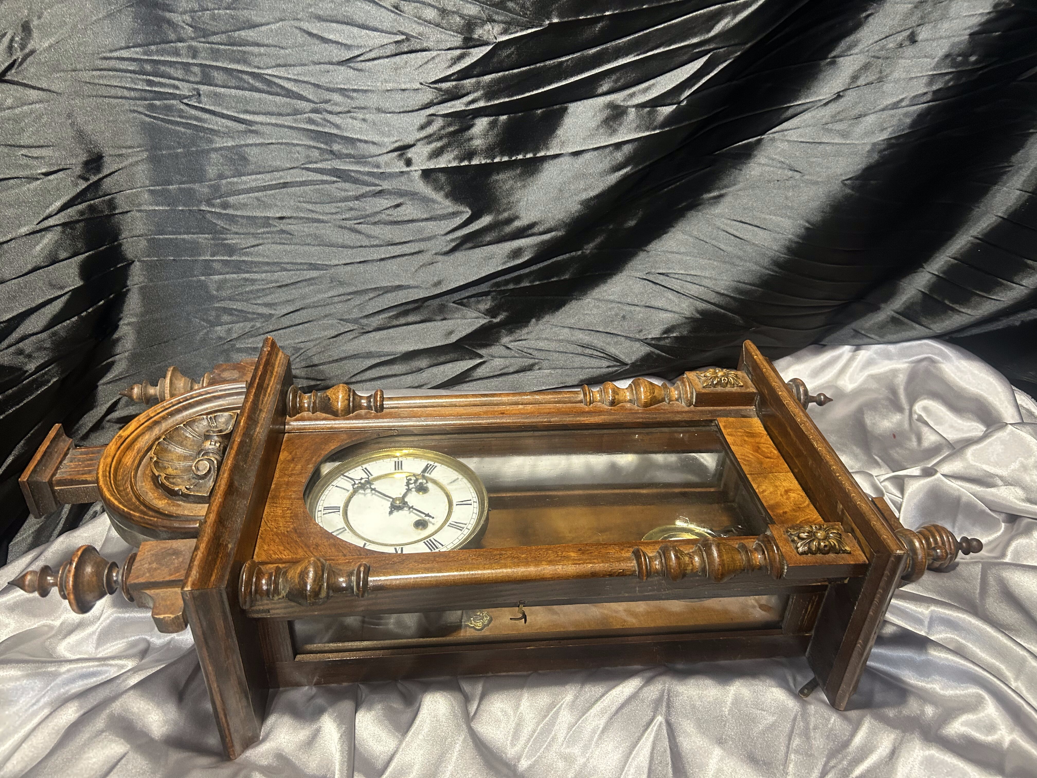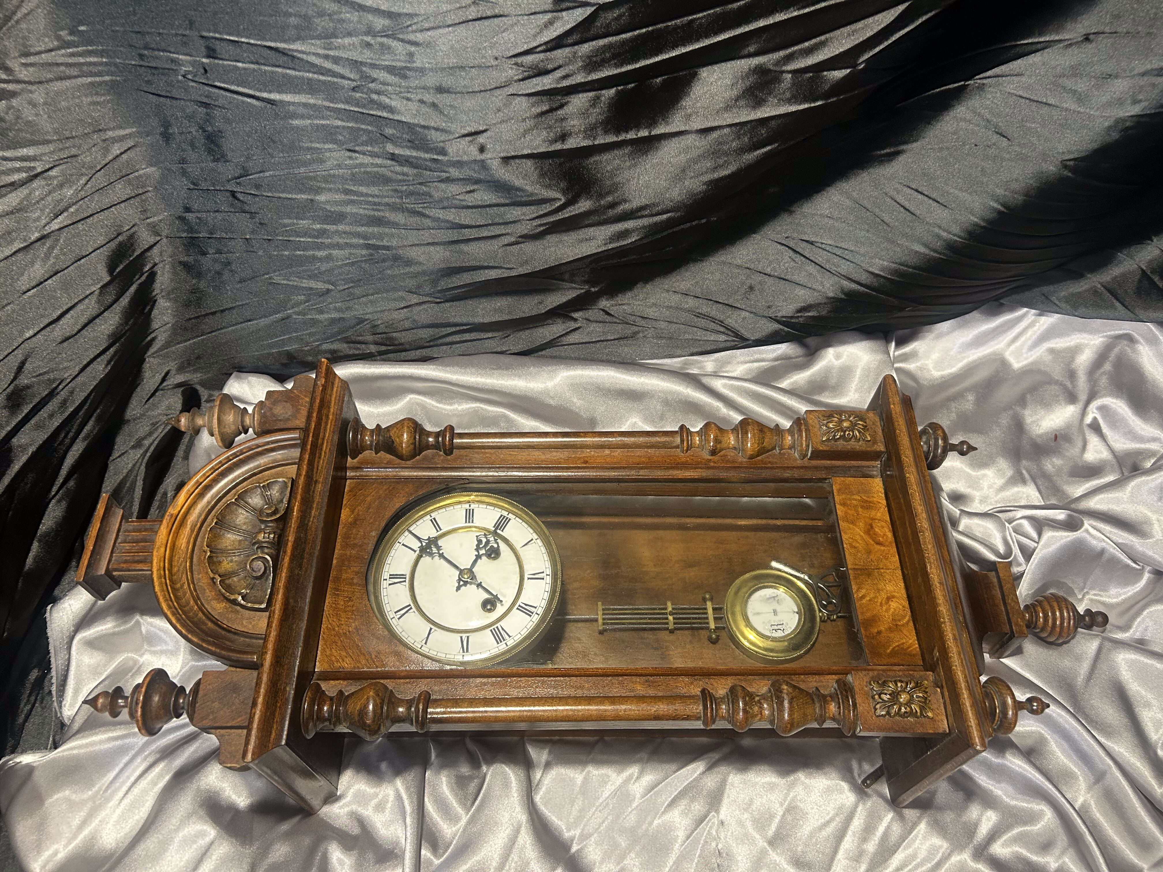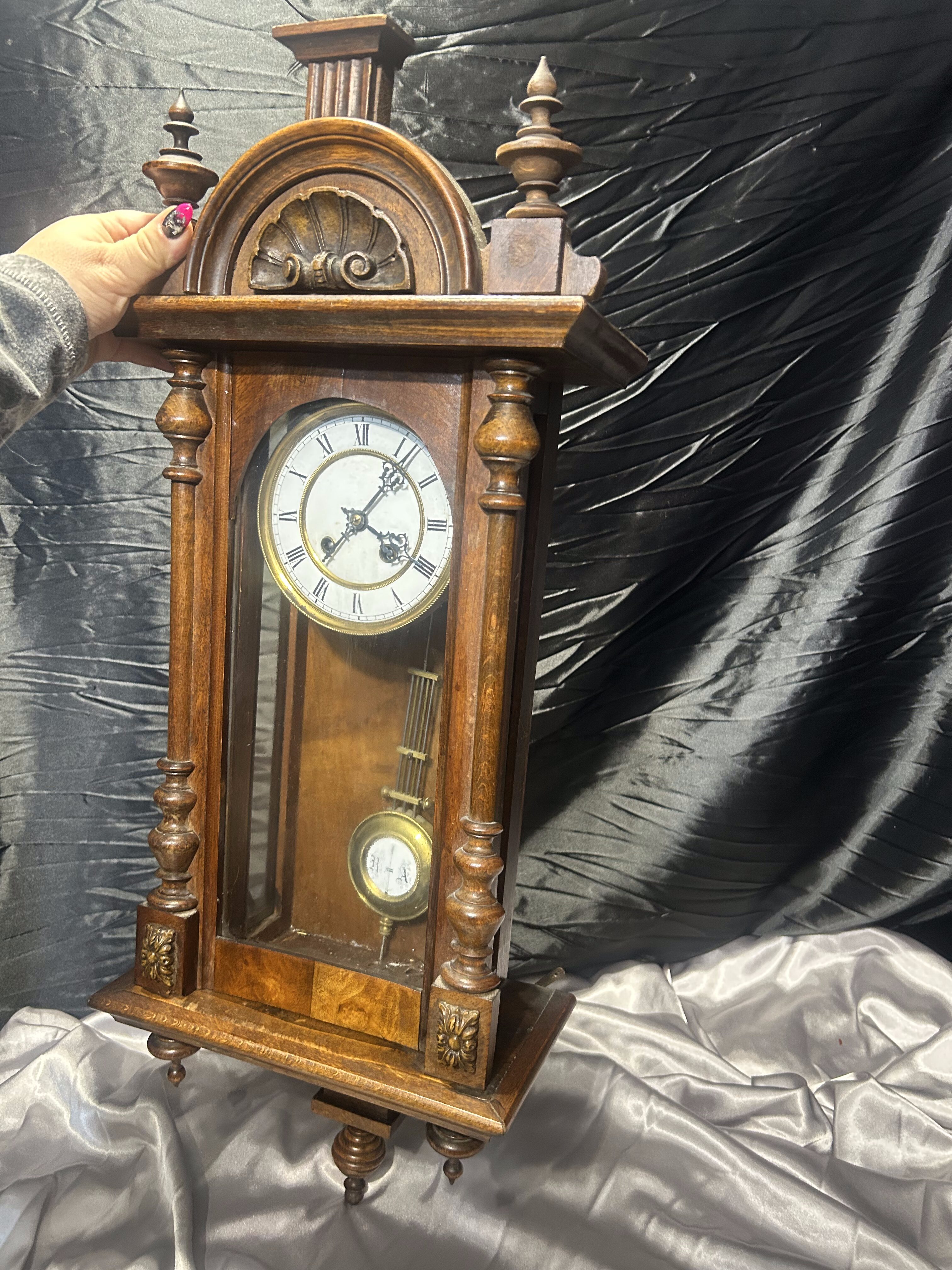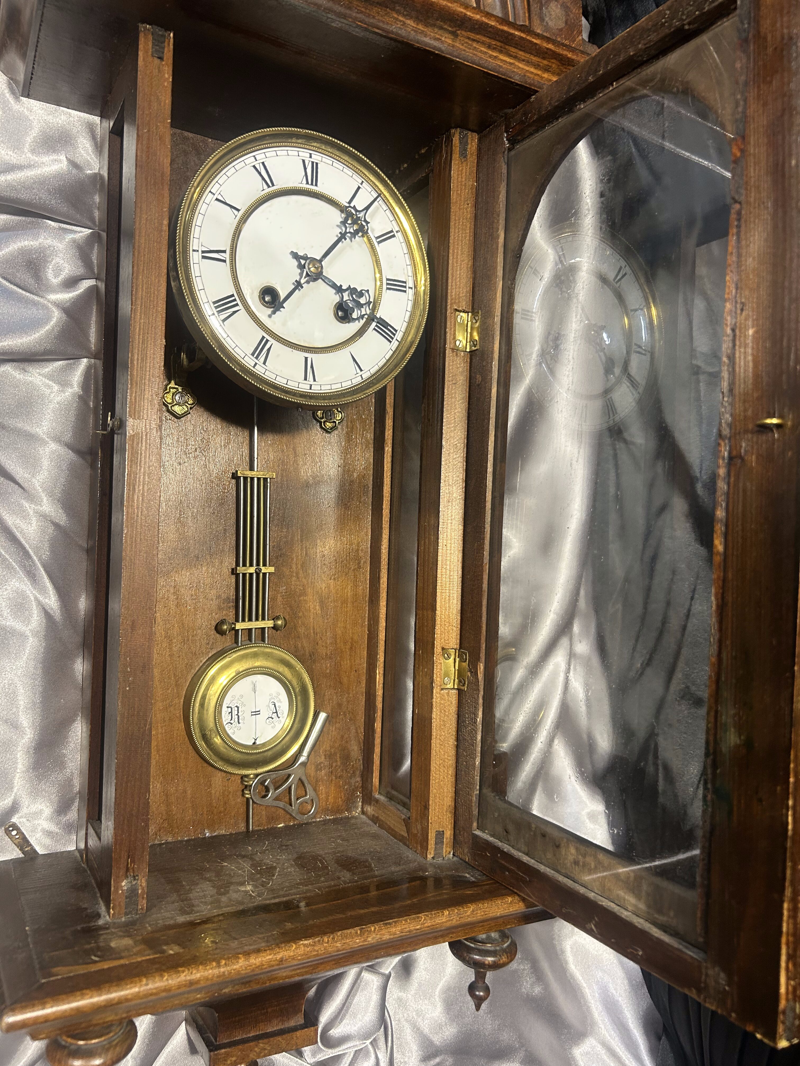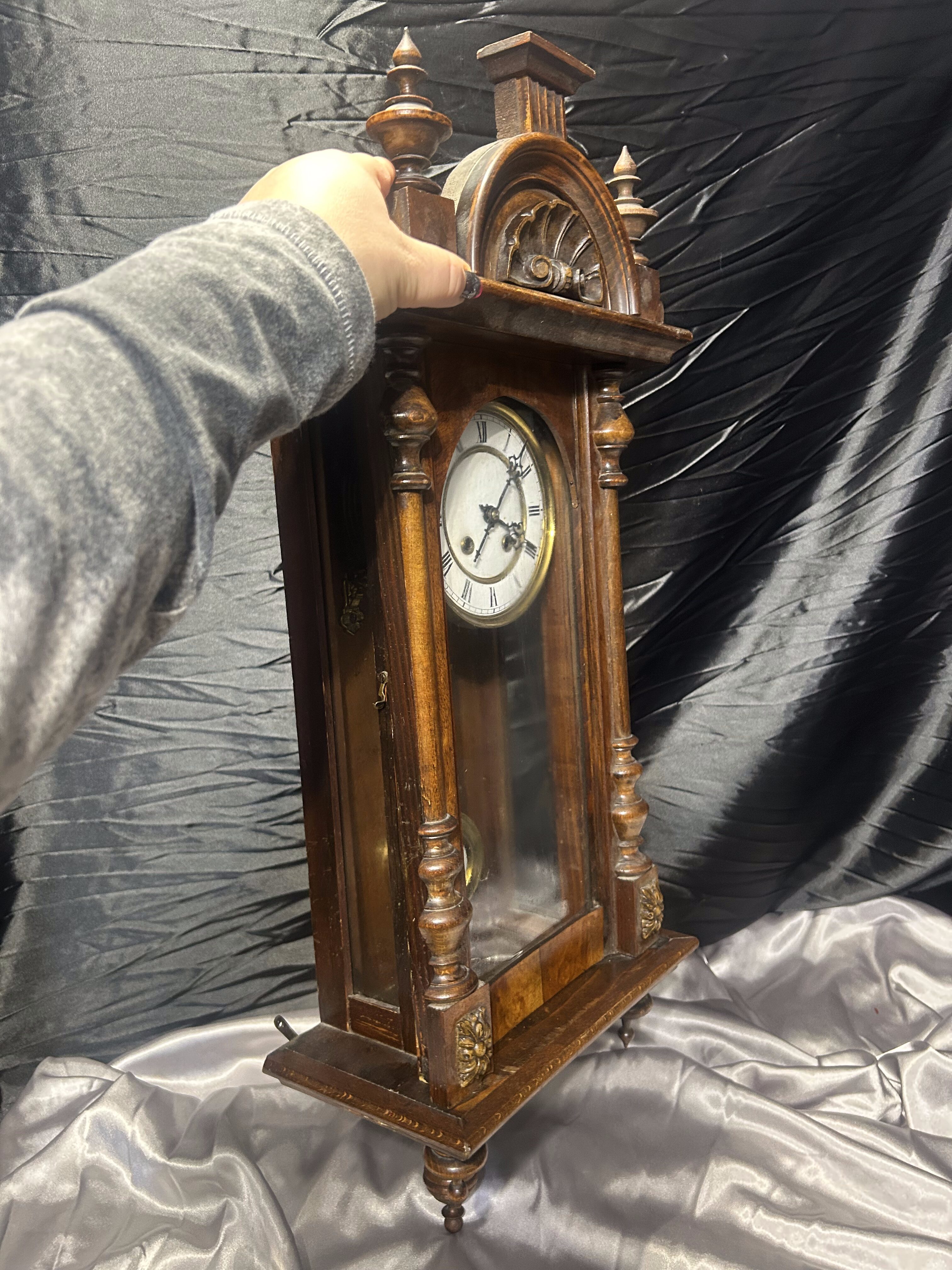 Okazały zegar wiszący w solidnej, drewnianej oprawie, bogato rzeźbionej i starannie wykończonej. Klasyczna forma z wyraźnymi elementami dekoracyjnymi sprawia, że zegar prezentuje się bardzo reprezentacyjnie i przyciąga wzrok. Przeszklone drzwiczki eksponują tarczę z rzymskimi cyframi oraz wahadło, nadając całości elegancki, ponadczasowy charakter.