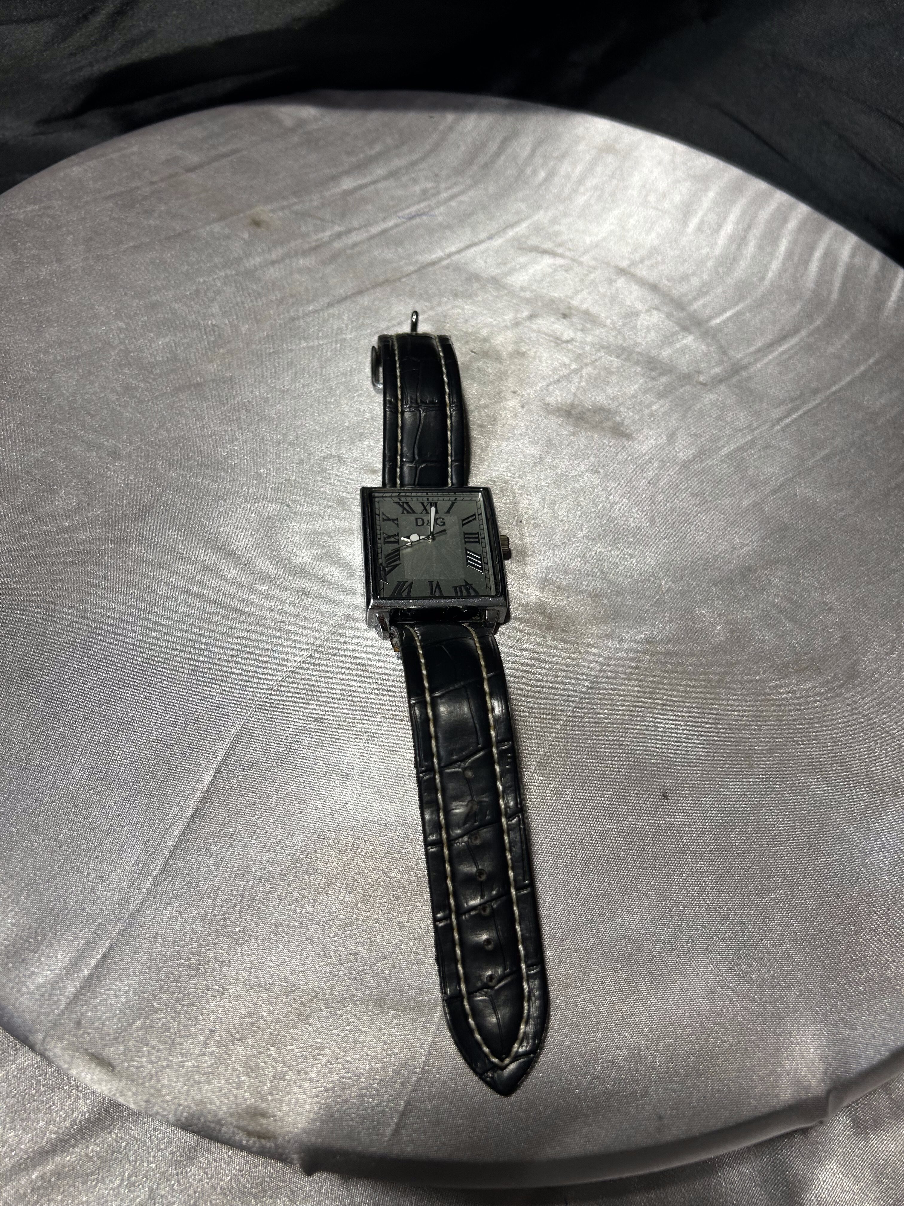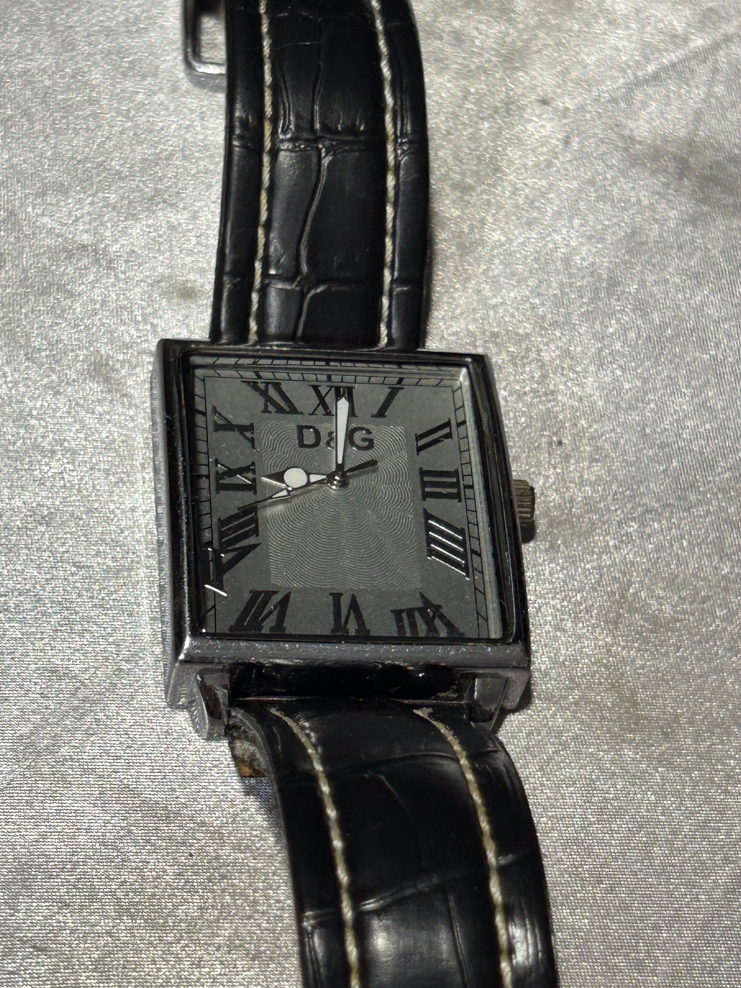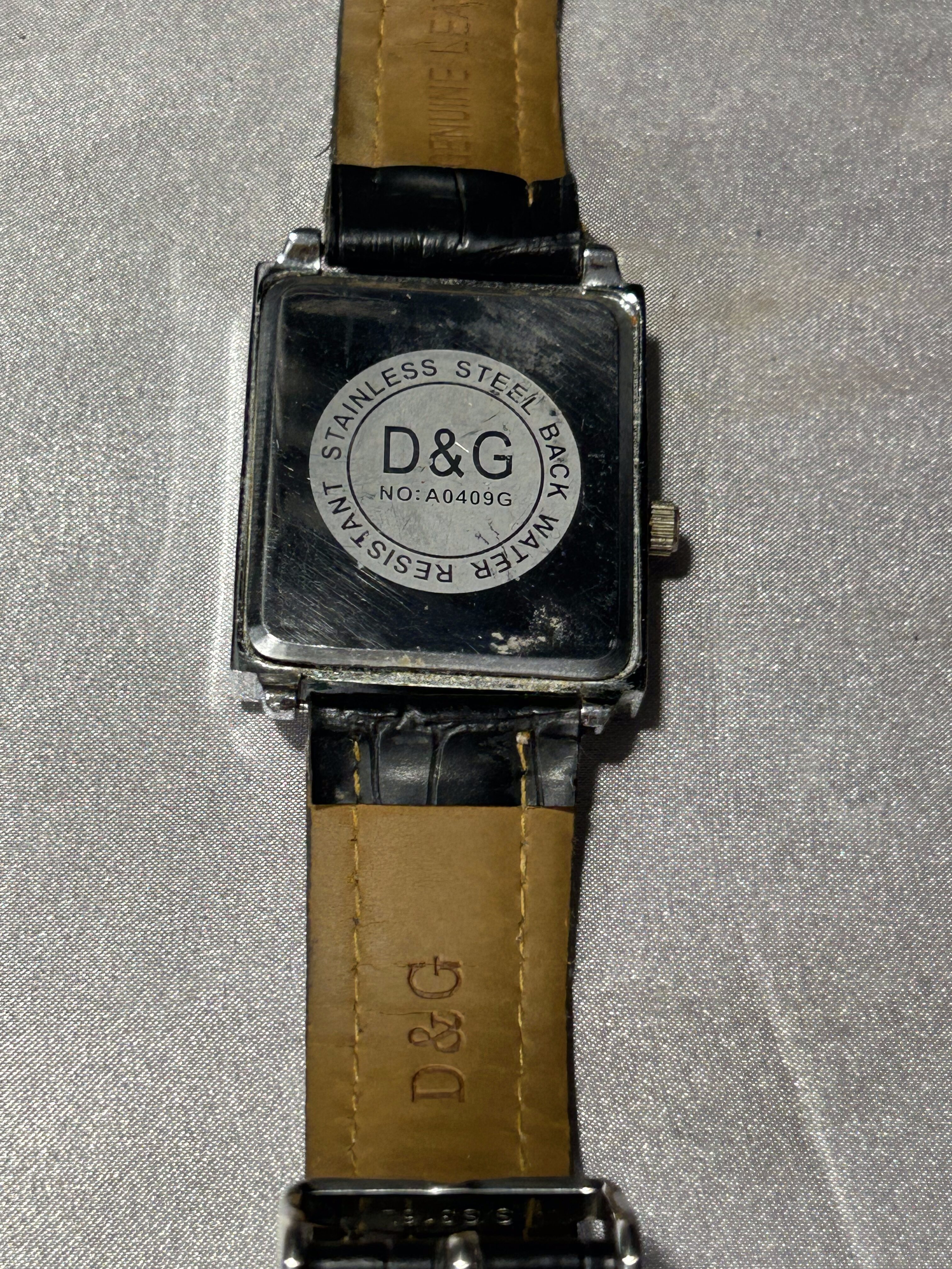 Elegancki zegarek naręczny sygnowany D&G, zakupiony z drugiej ręki w Norwegii. Z uwagi na brak dokumentów oraz zakupu w oficjalnym butiku nie ma możliwości potwierdzenia autentyczności – zegarek oferowany jest jako egzemplarz z drugiej ręki, sygnowany D&G.