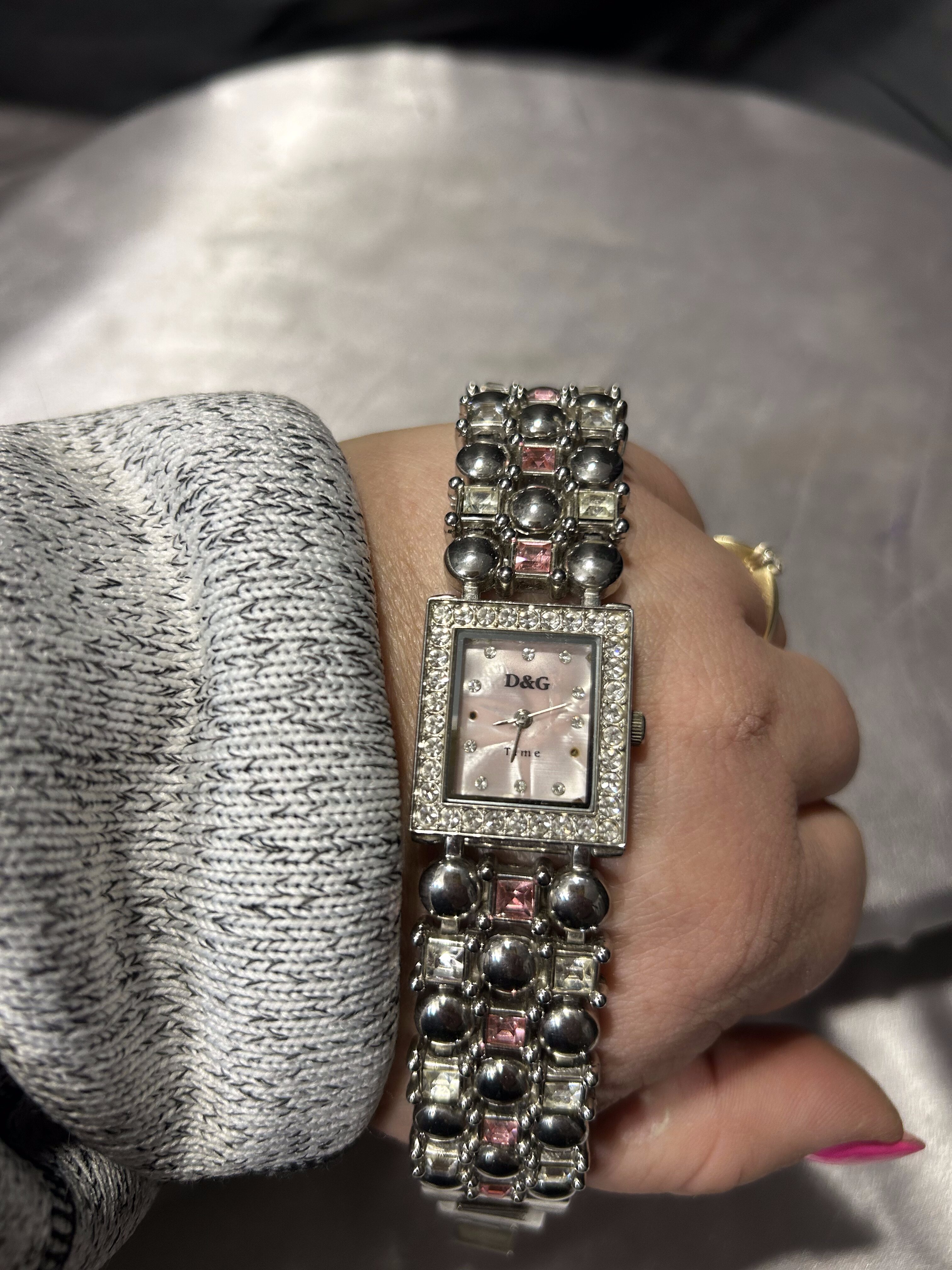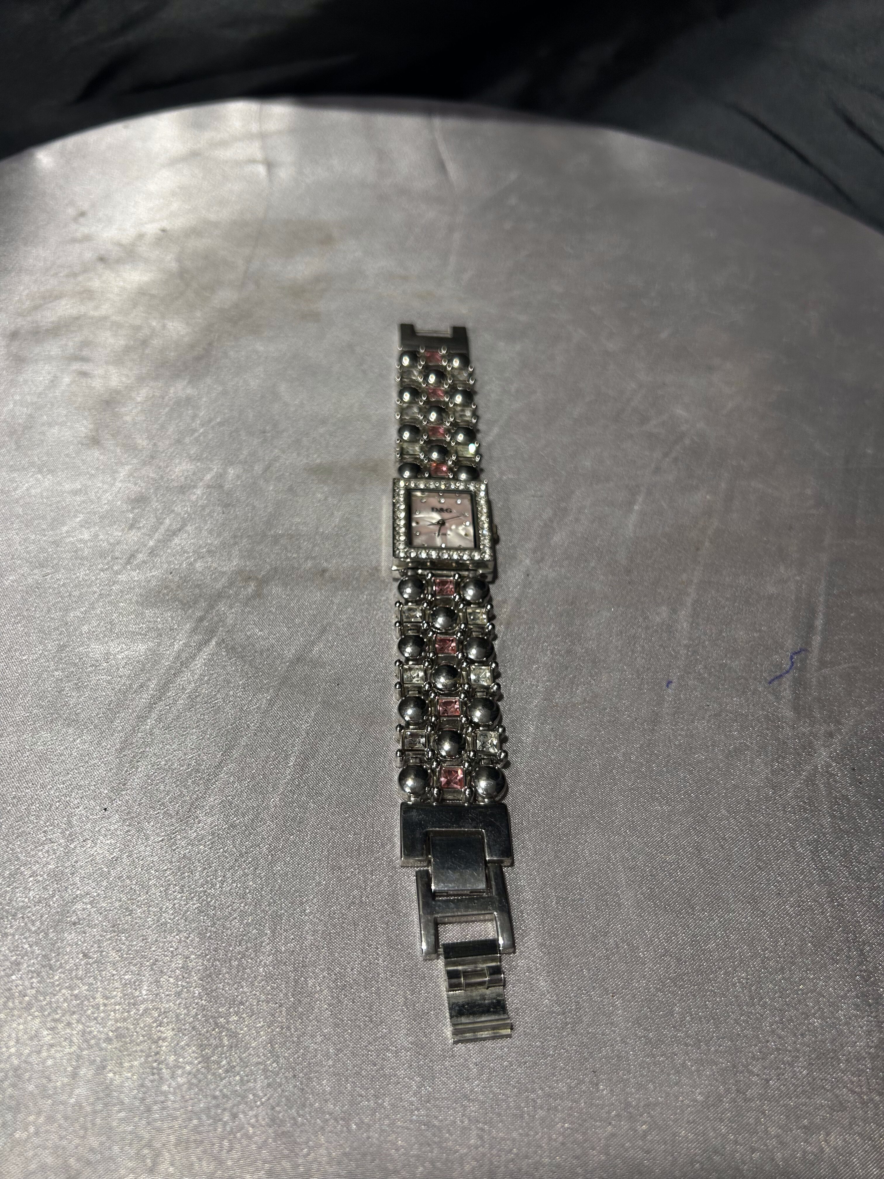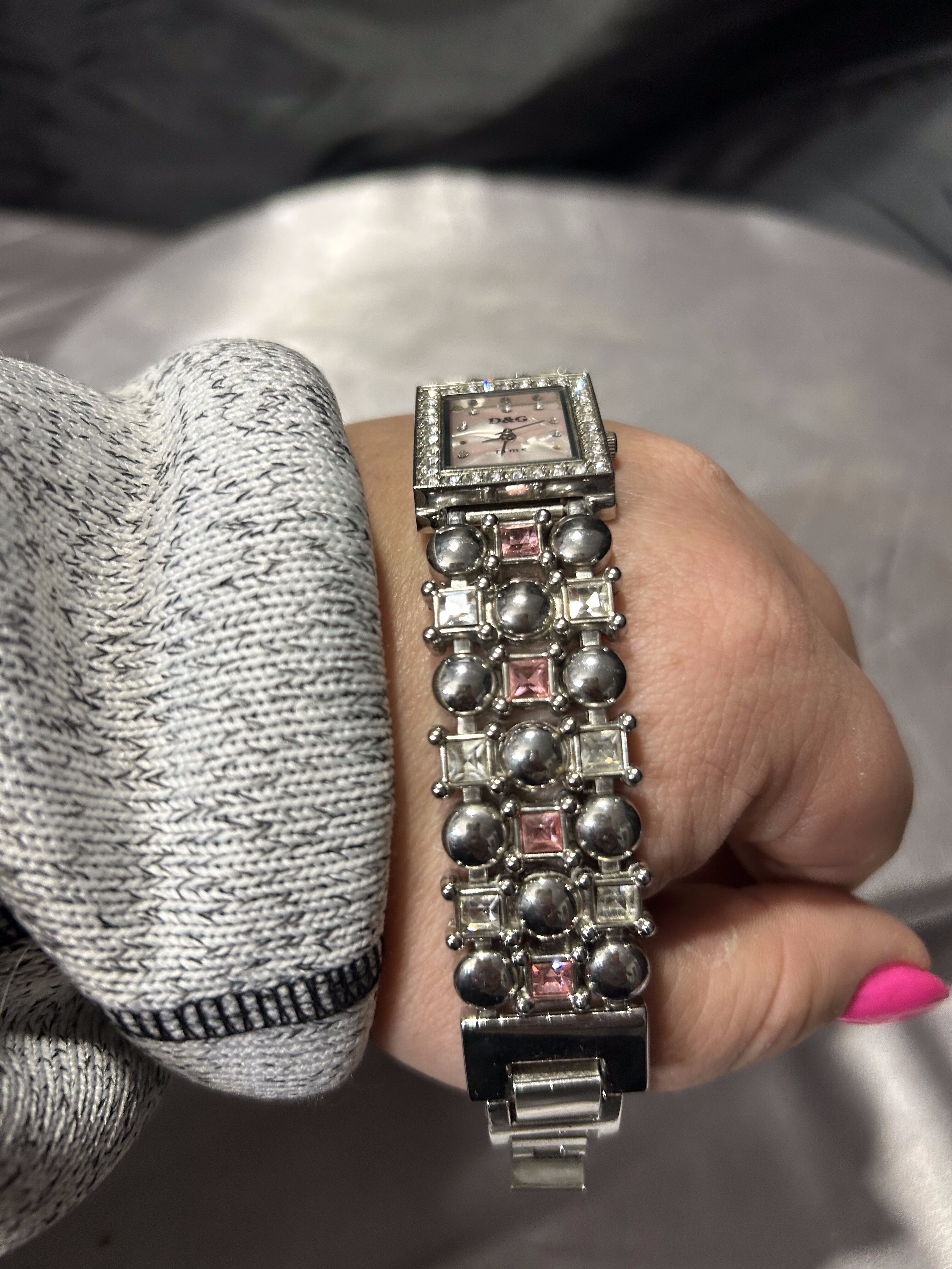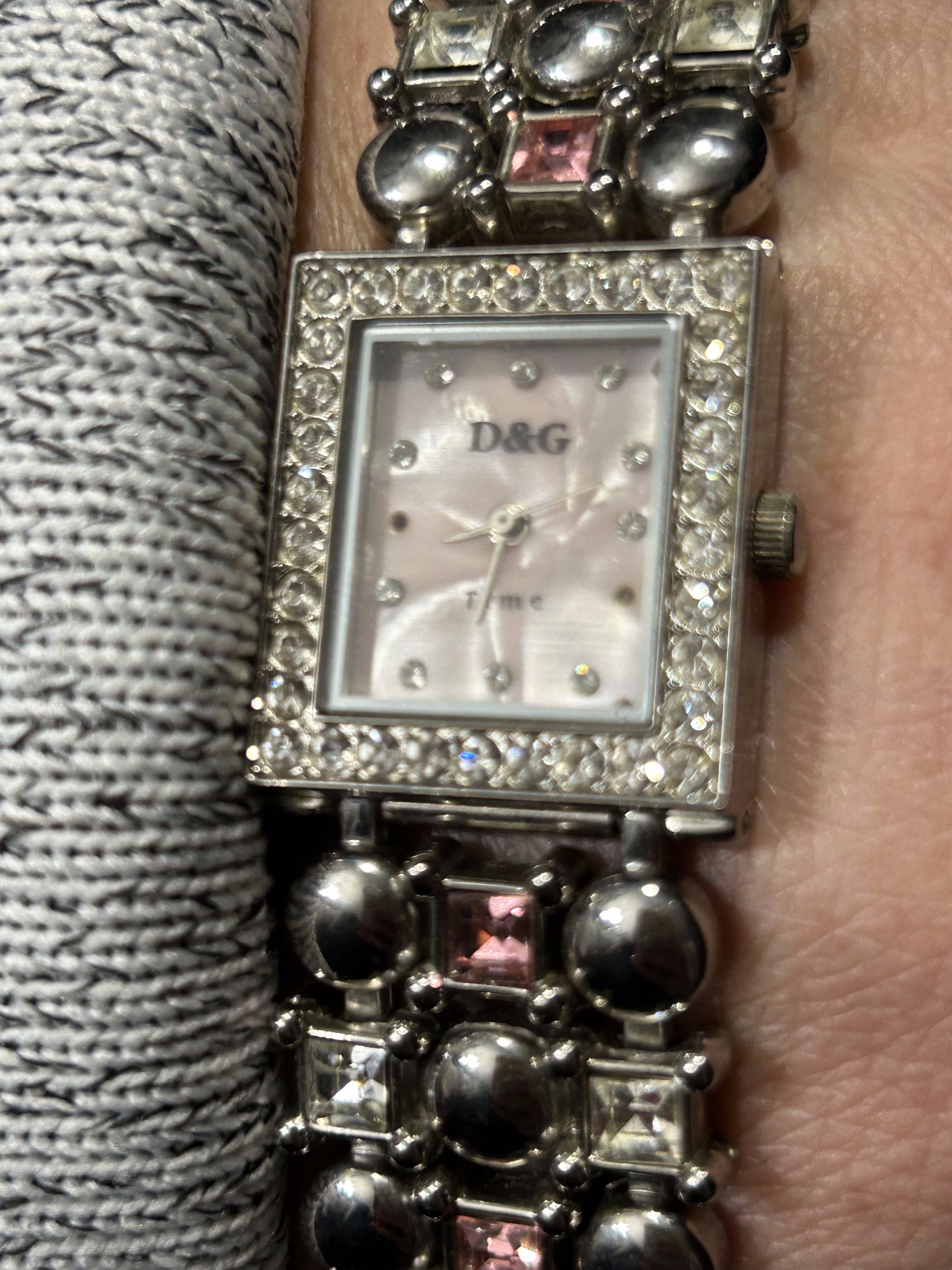 Elegancki zegarek naręczny o wyraźnie biżuteryjnym charakterze, sygnowany Dolce & Gabbana. Model z prostokątną tarczą, bogato zdobioną kryształkami, przyciąga uwagę i pełni nie tylko funkcję użytkową, ale również dekoracyjną. Zegarek zakupiony z drugiej ręki – brak dokumentów potwierdzających autentyczność.