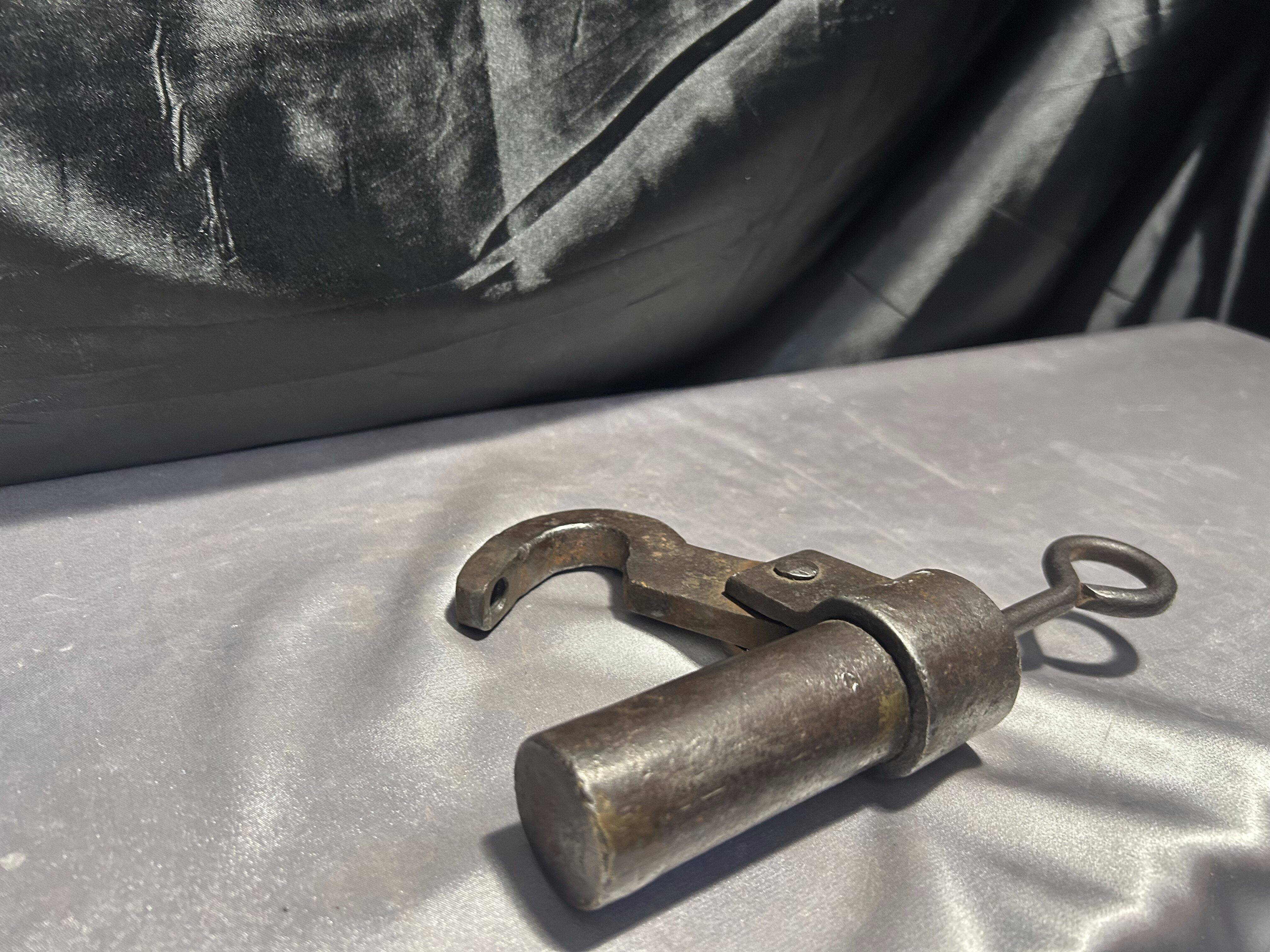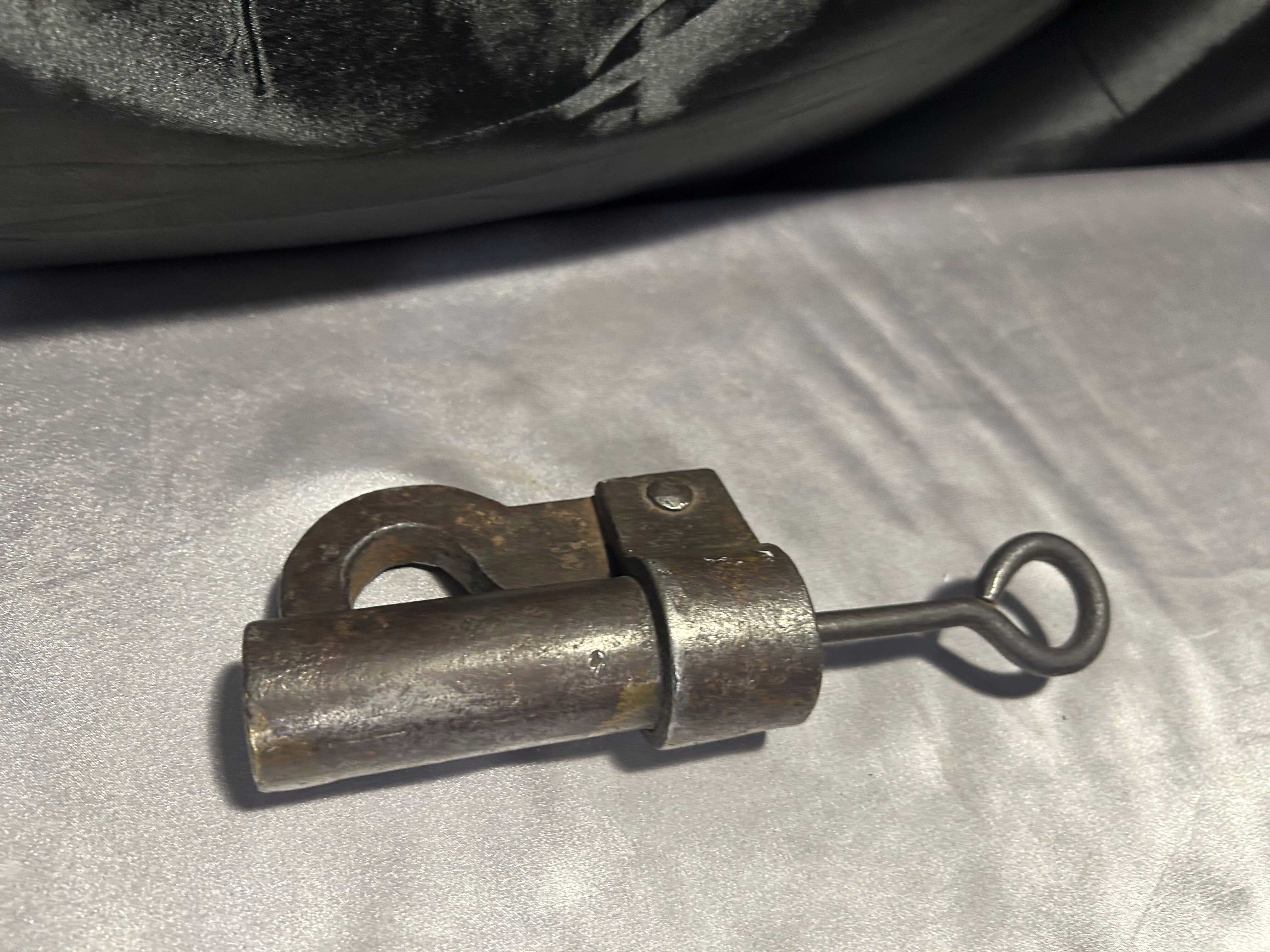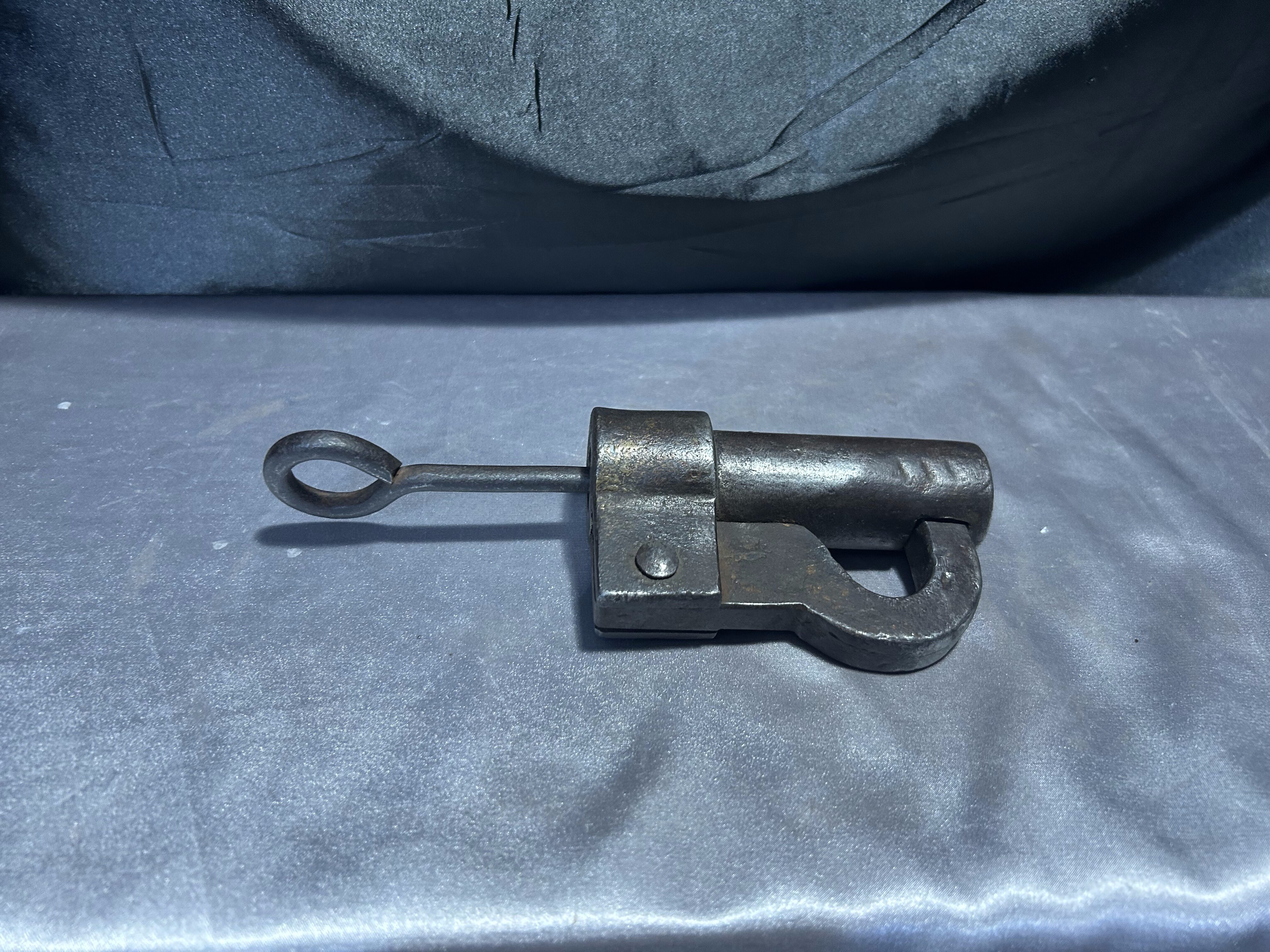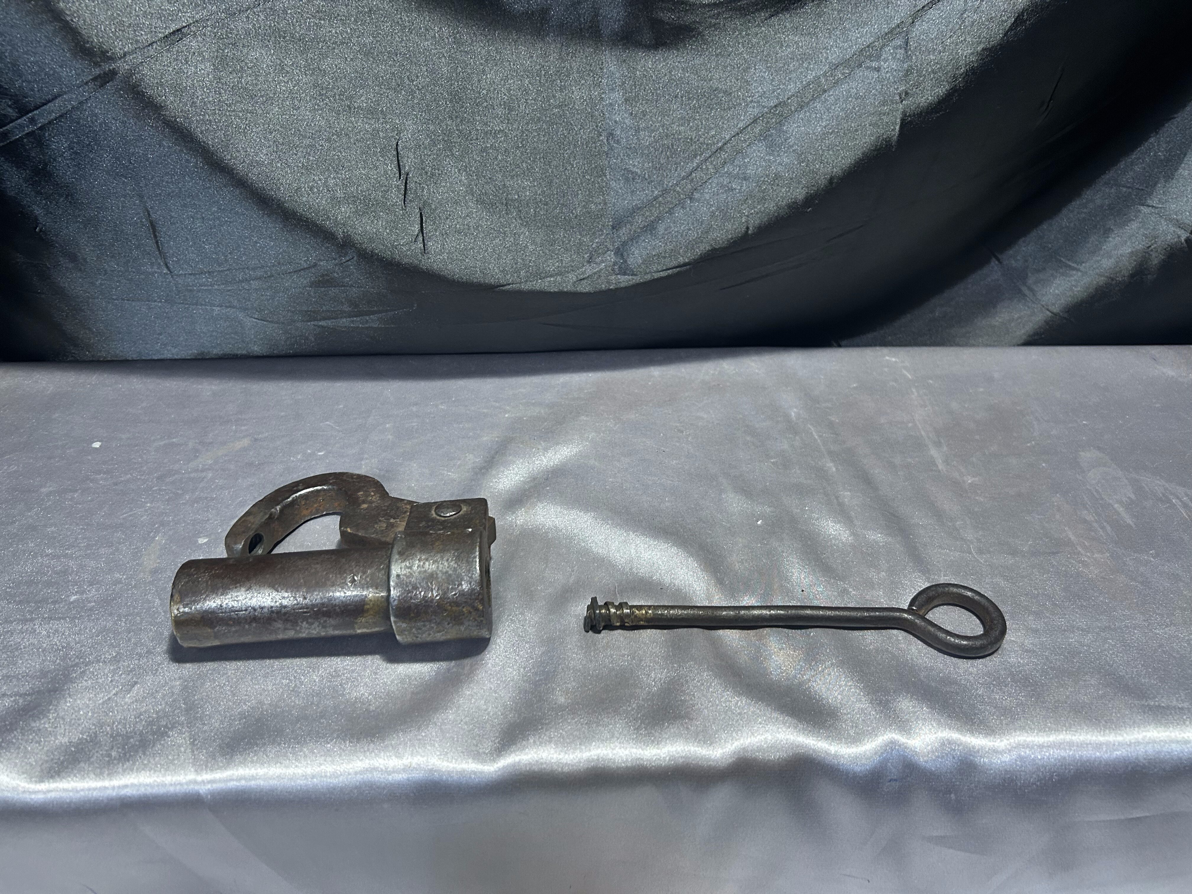 Na sprzedaż unikalna żeliwna kłódka ze spiralnym kluczem, w pełni sprawna. Kształtem przypomina kłódkę kowalską, jednak według informacji uzyskanych od poprzedniego właściciela, podobne modele były używane do zabezpieczania więźniów na statkach. Solidna i ciężka konstrukcja świadczy o jej autentyczności i dawnym zastosowaniu.