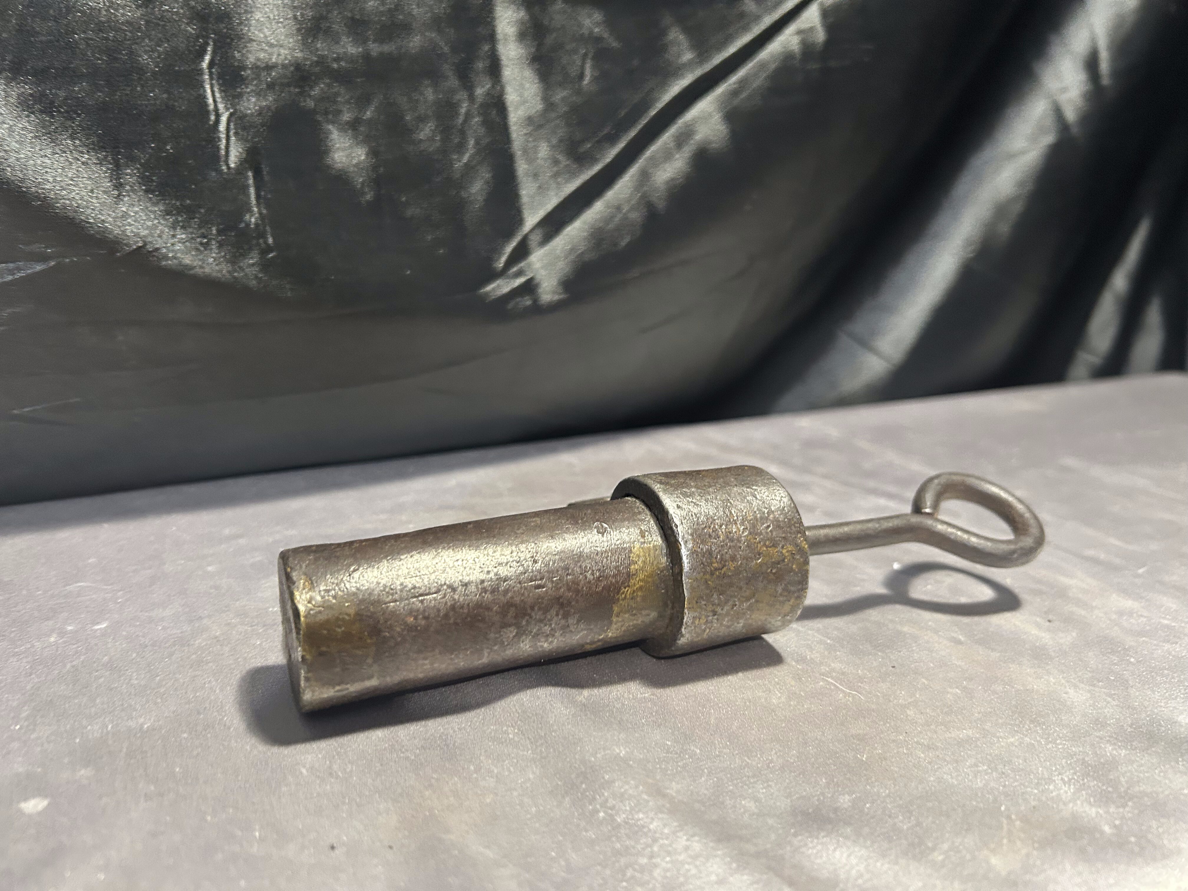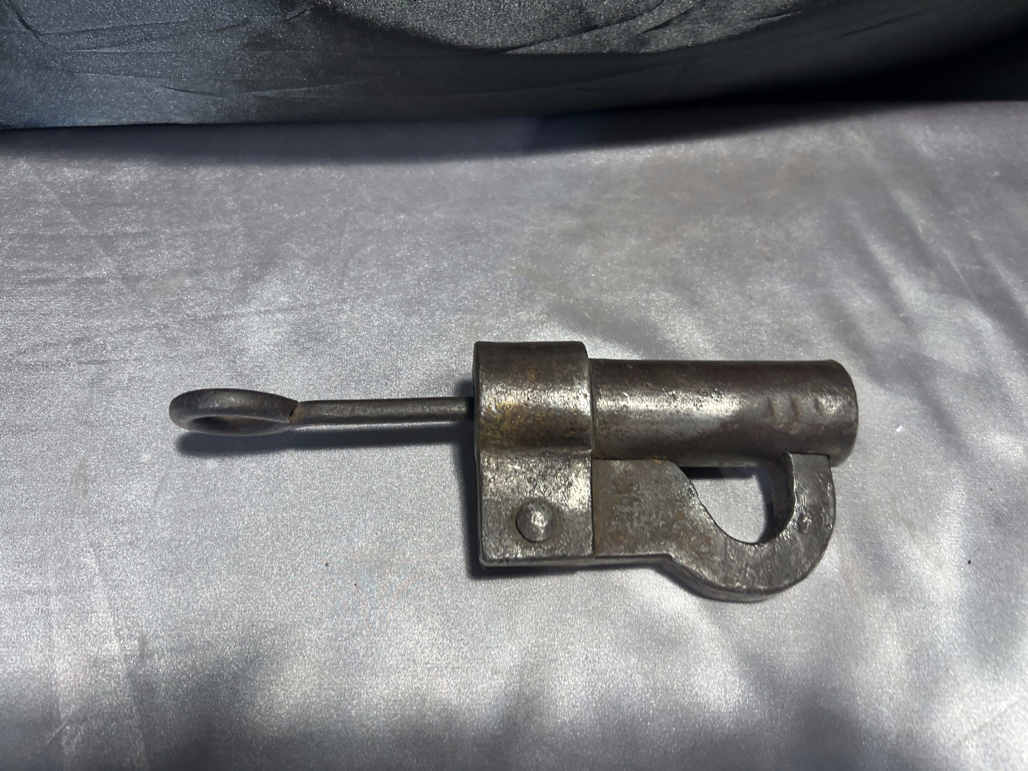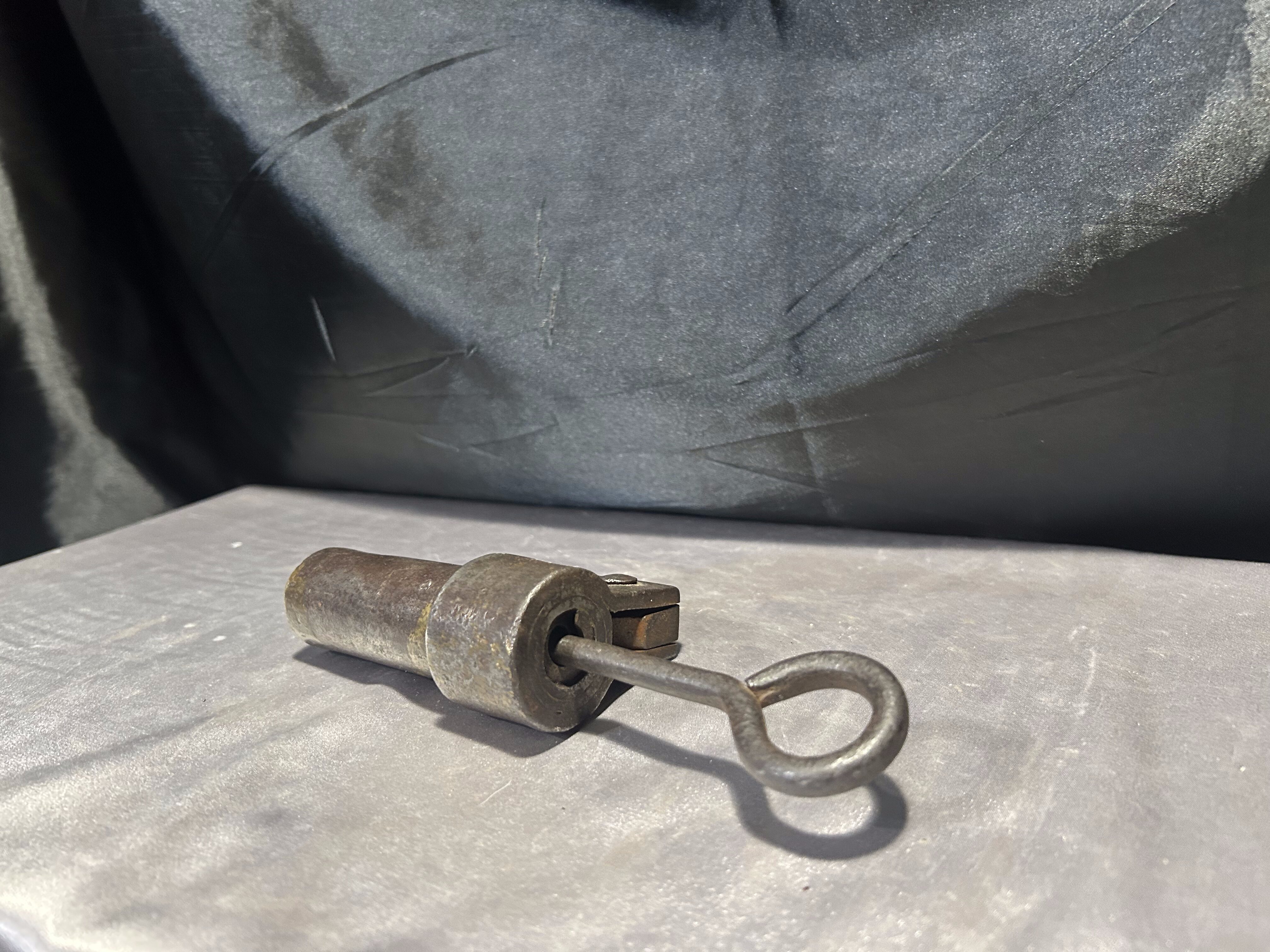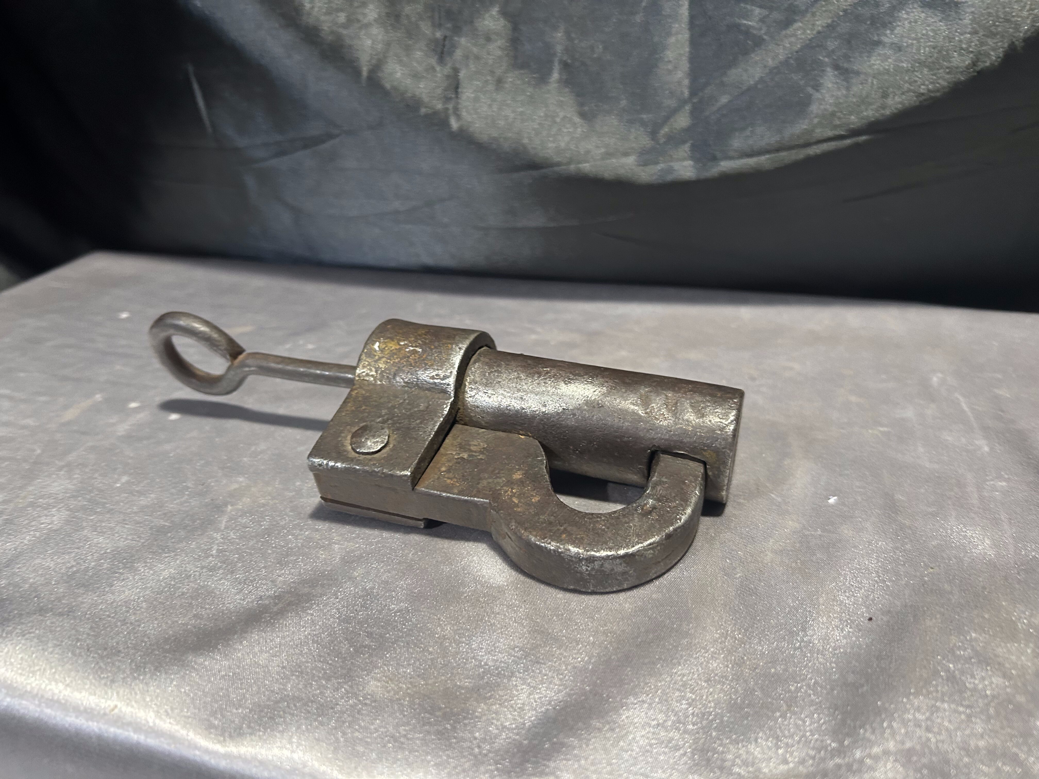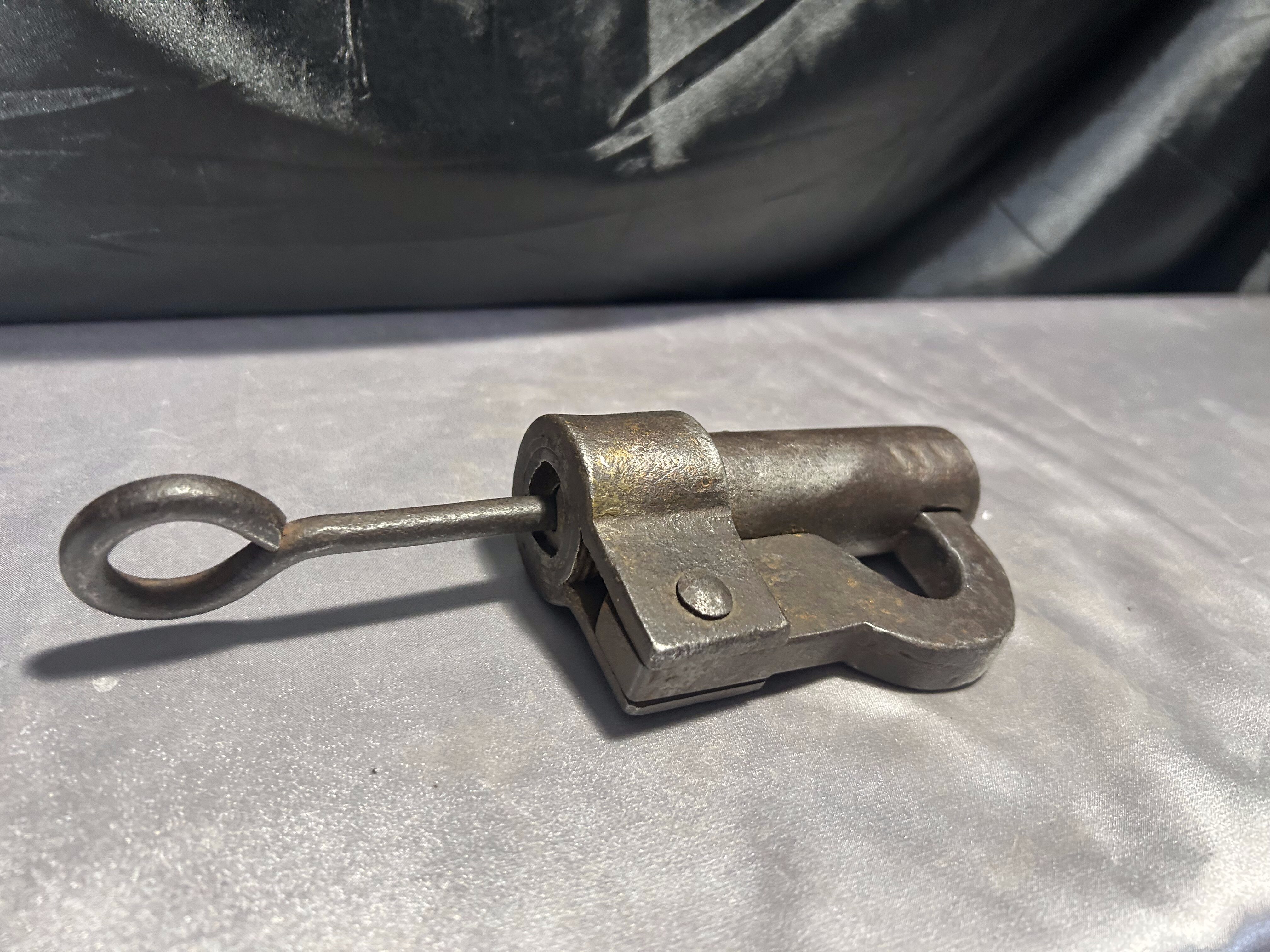 Na sprzedaż unikalna żeliwna kłódka ze spiralnym kluczem, w pełni sprawna. Kształtem przypomina kłódkę kowalską, jednak według informacji uzyskanych od poprzedniego właściciela, podobne modele były używane do zabezpieczania więźniów na statkach. Solidna i ciężka konstrukcja świadczy o jej autentyczności i dawnym zastosowaniu.