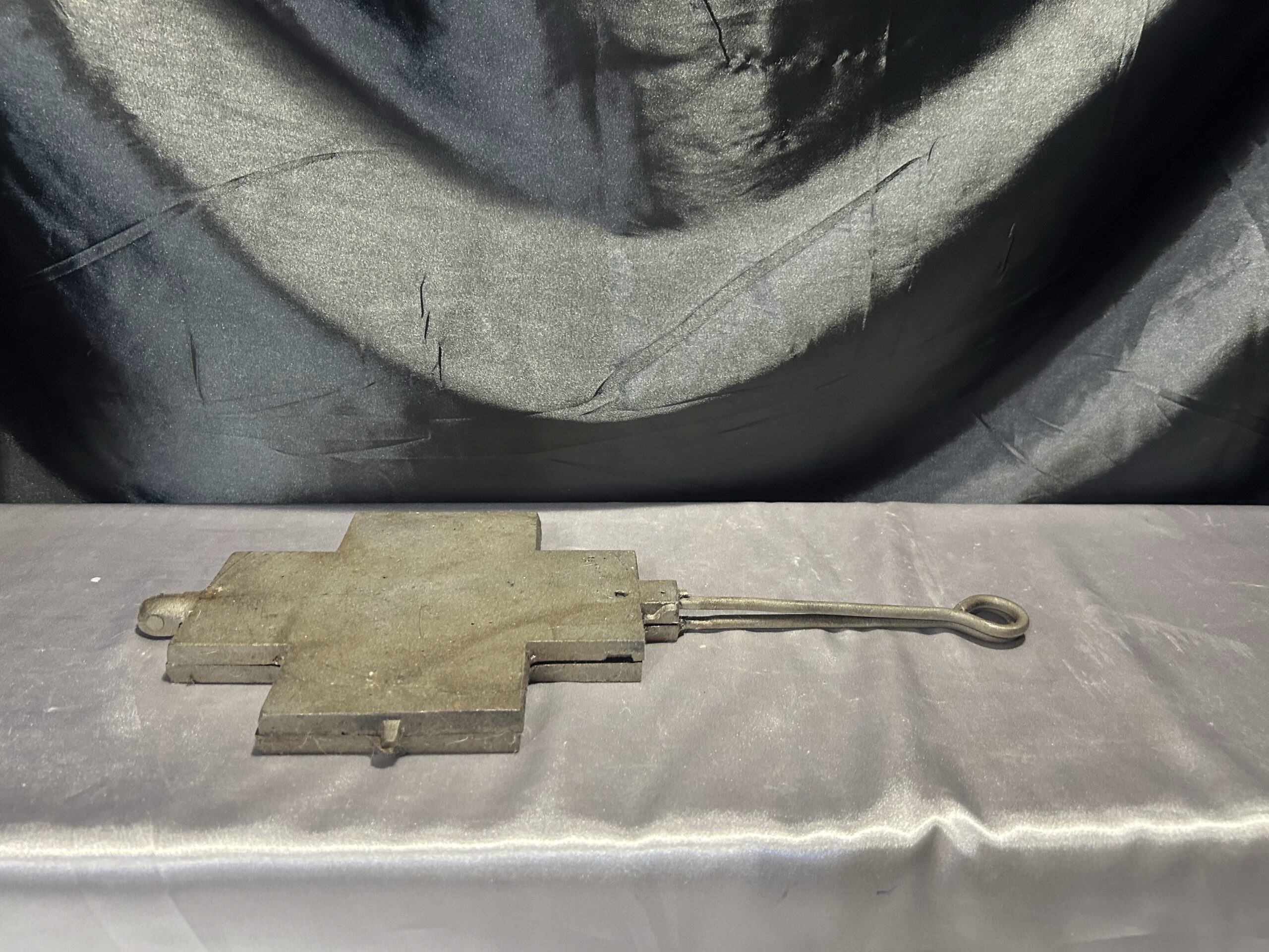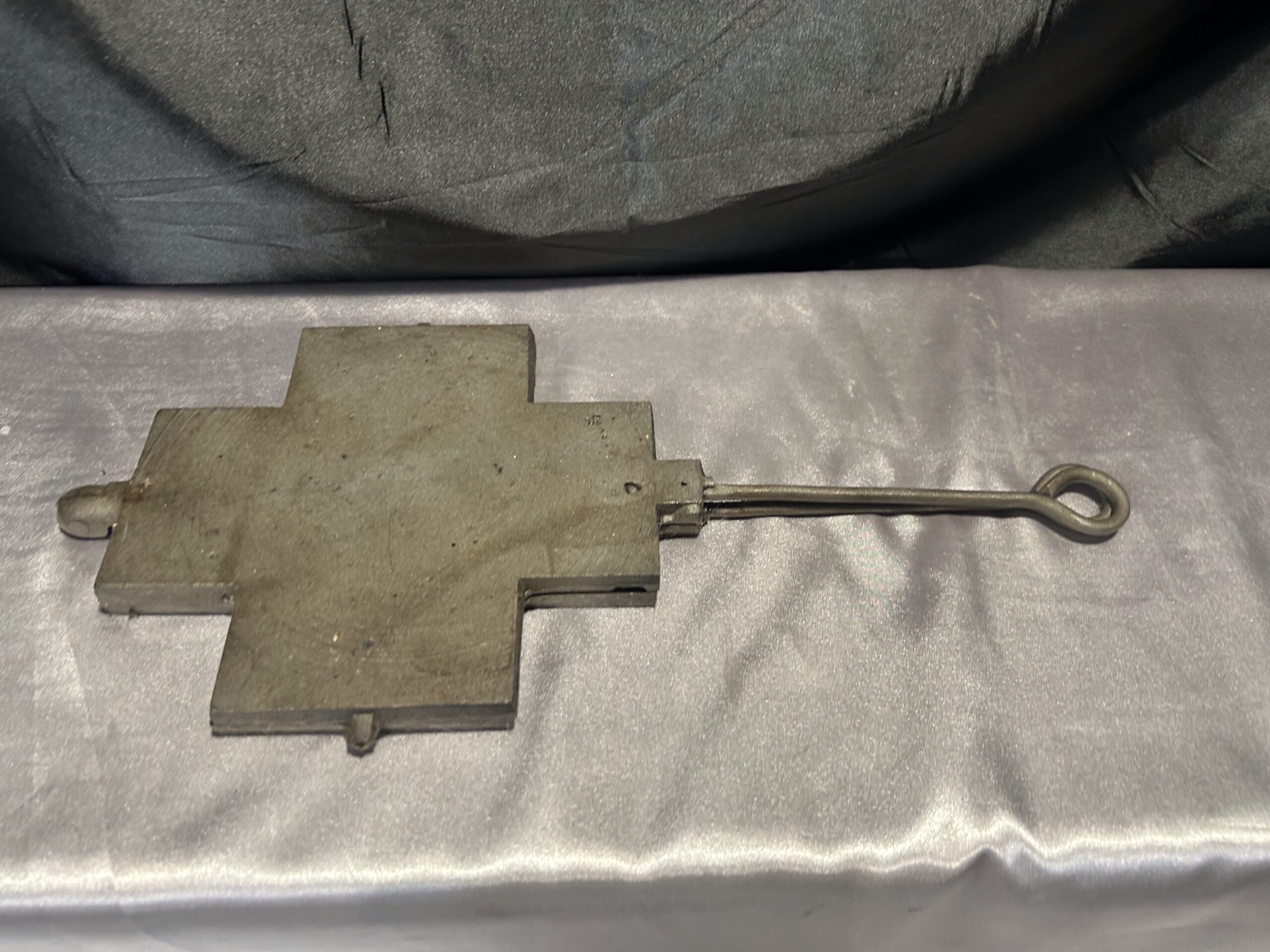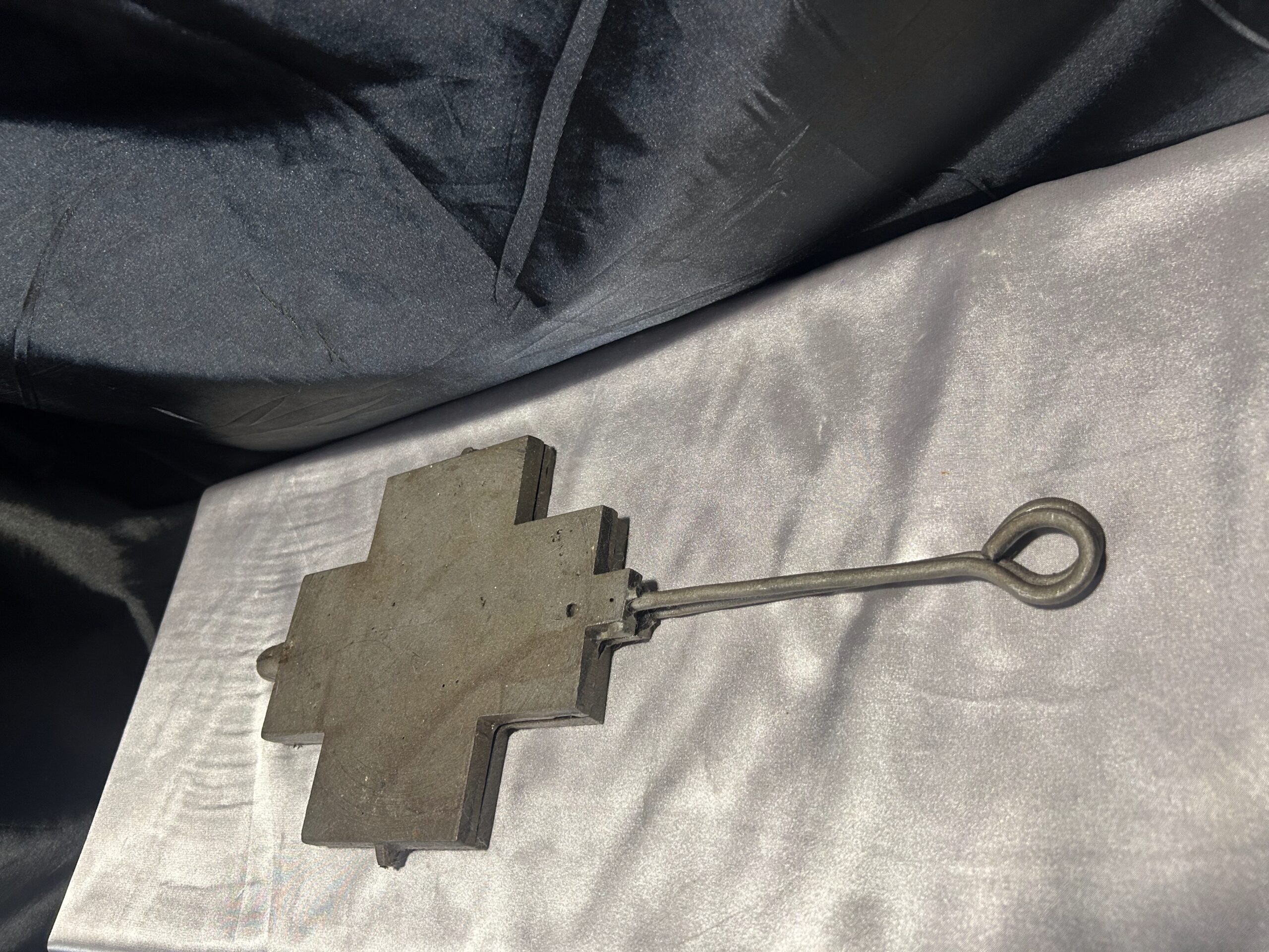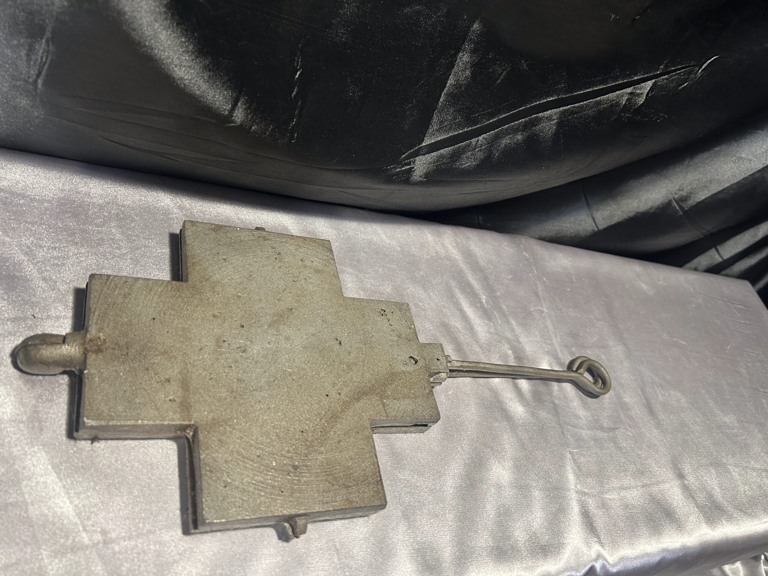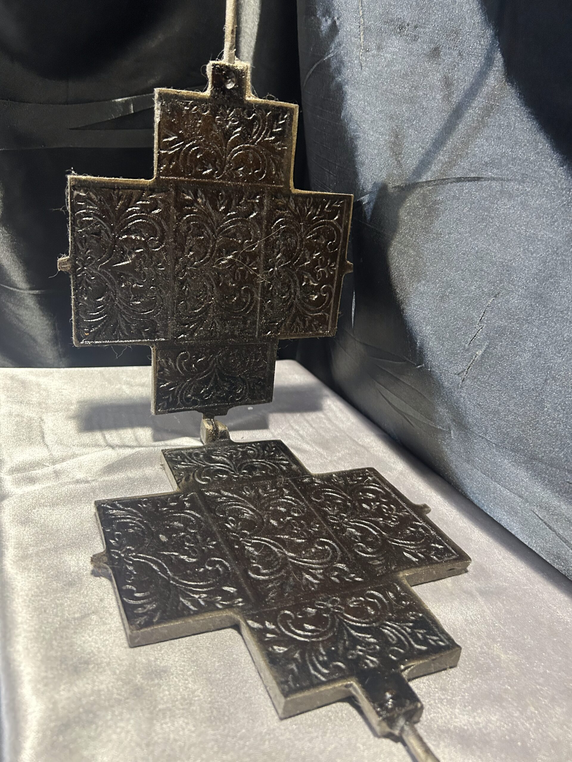 Unikalna, żeliwna wafelnica w kształcie krzyża, przeznaczona do wypieku cienkich wafli w stylu oblatów. Solidnie wykonana, wypiaskowana i zabezpieczona olejem spożywczym, gotowa do użytku. Idealna do przygotowywania tradycyjnych wafli nad ogniem – świetna zarówno na biwaki, ogniska, jak i do użytku domowego. Wafelnica została przywieziona z Norwegii, co czyni ją wyjątkowym przedmiotem dla miłośników tradycyjnych wypieków.
