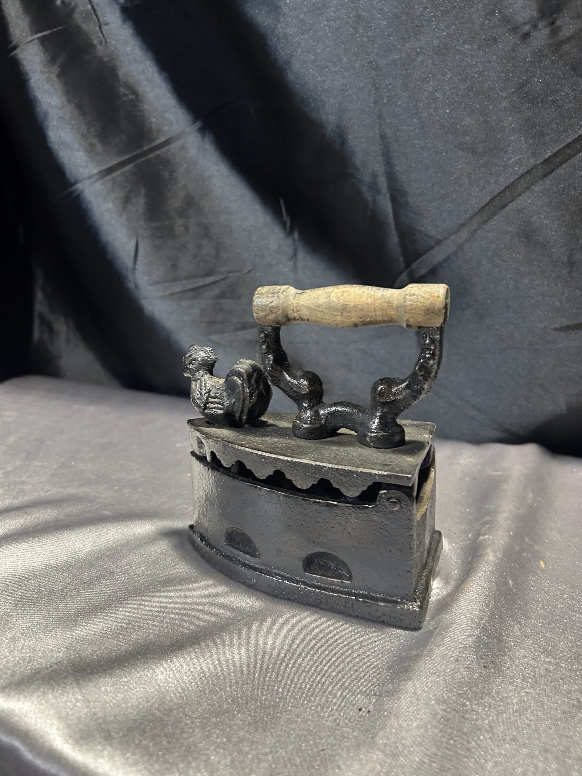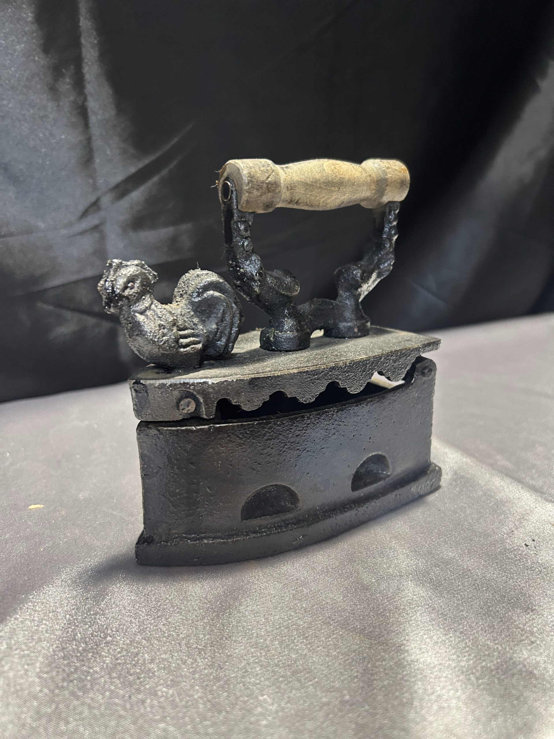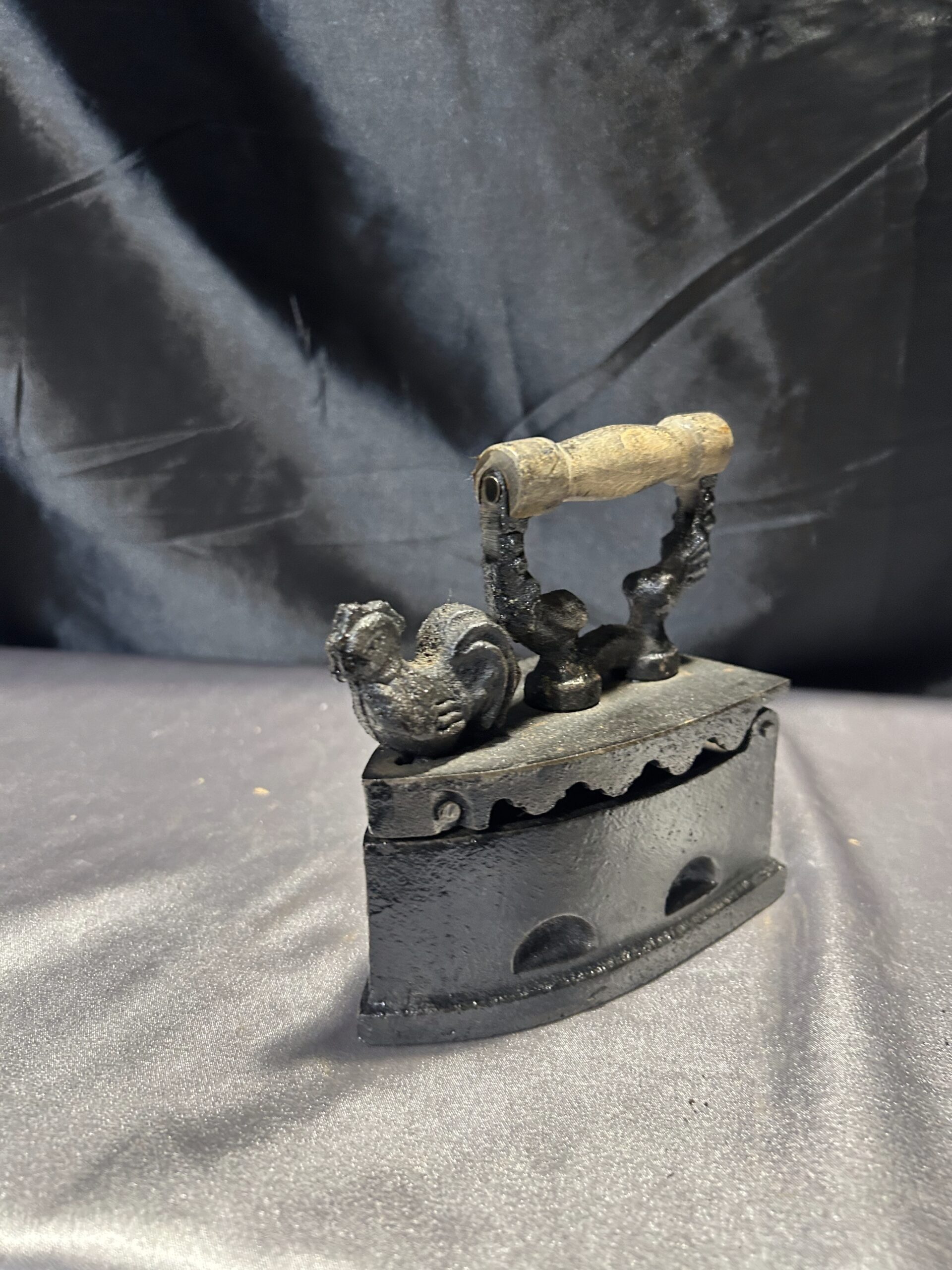 Urokliwe żeliwne żelazko z motywem koguta, zdobione w klasycznym stylu. Przeznaczone na węgielki, wyposażone w drewnianą rączkę dla wygody i elegancji. Sygnatura OTS podkreśla jego autentyczność i kolekcjonerską wartość.