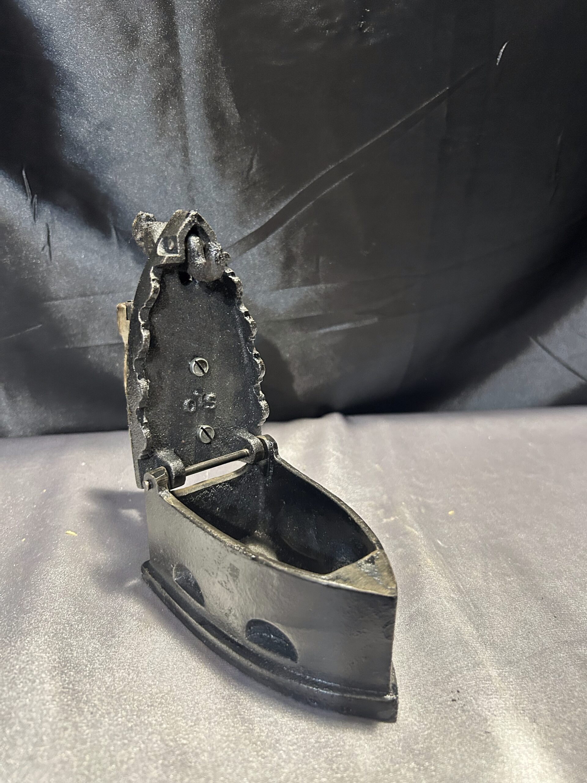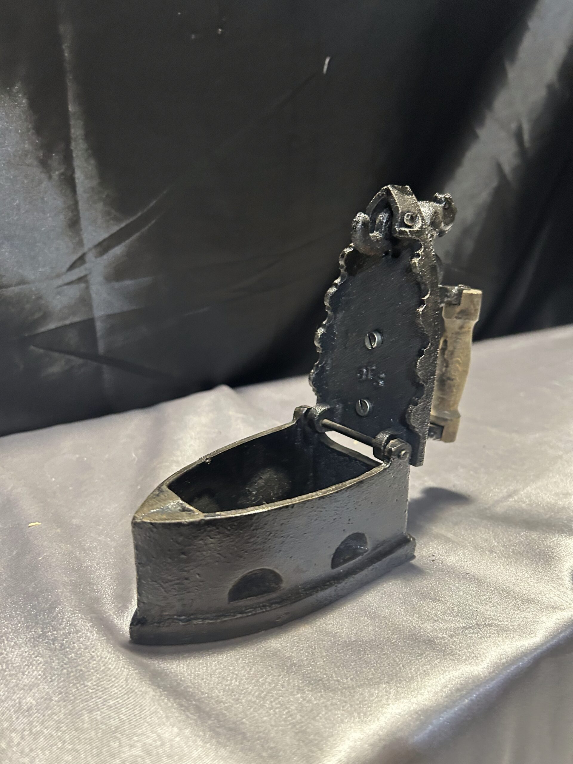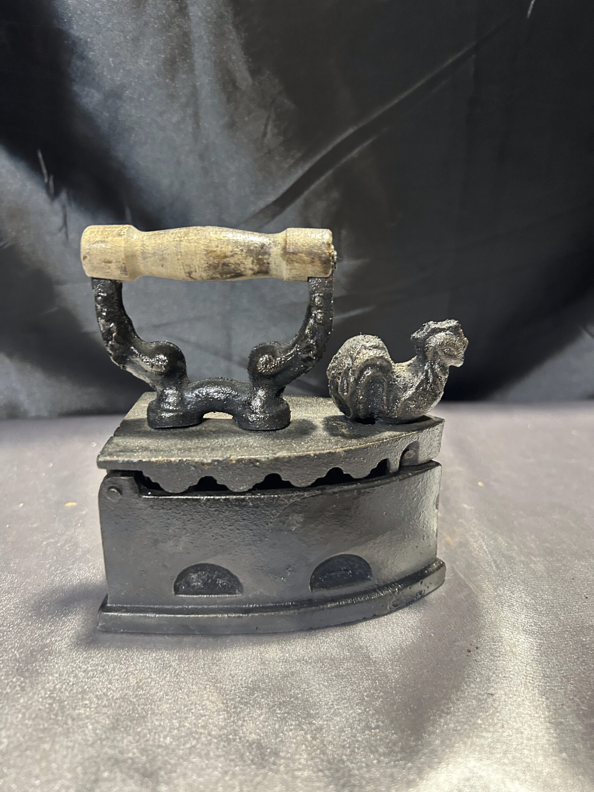 Urokliwe żeliwne żelazko z motywem koguta, zdobione w klasycznym stylu. Przeznaczone na węgielki, wyposażone w drewnianą rączkę dla wygody i elegancji. Sygnatura OTS podkreśla jego autentyczność i kolekcjonerską wartość.