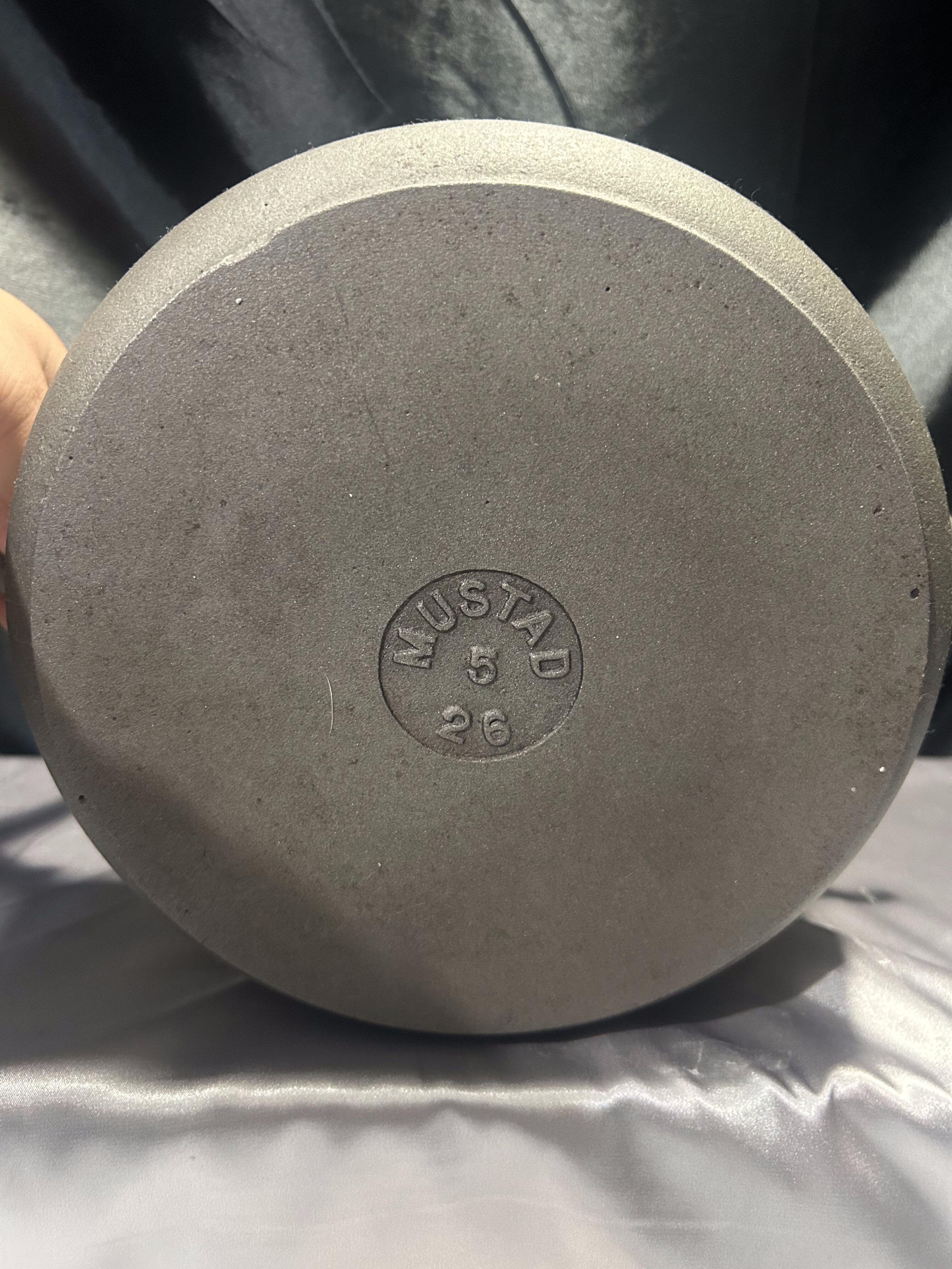 Solidny, klasyczny garnek żeliwny sygnowany MUSTAD 5 26 – oznaczenie wskazuje na przybliżoną pojemność 5 litrów oraz średnicę 26 cm. Garnek został wypiaskowany i zabezpieczony olejem spożywczym, co czyni go gotowym do bezpośredniego użytku.