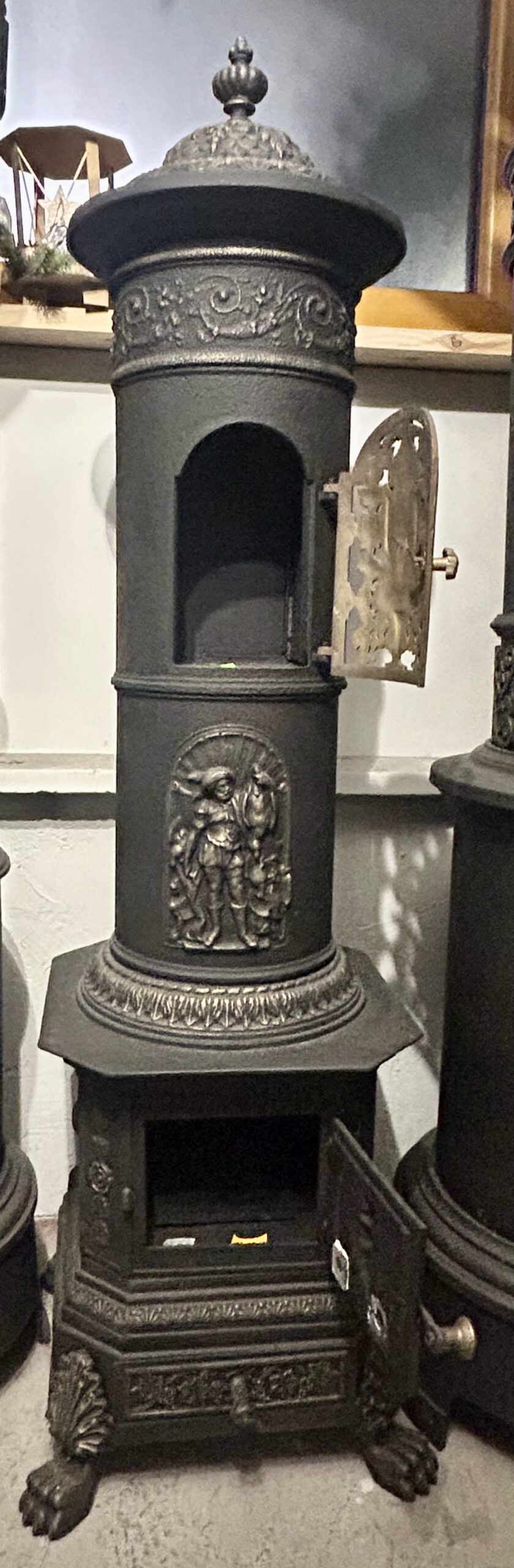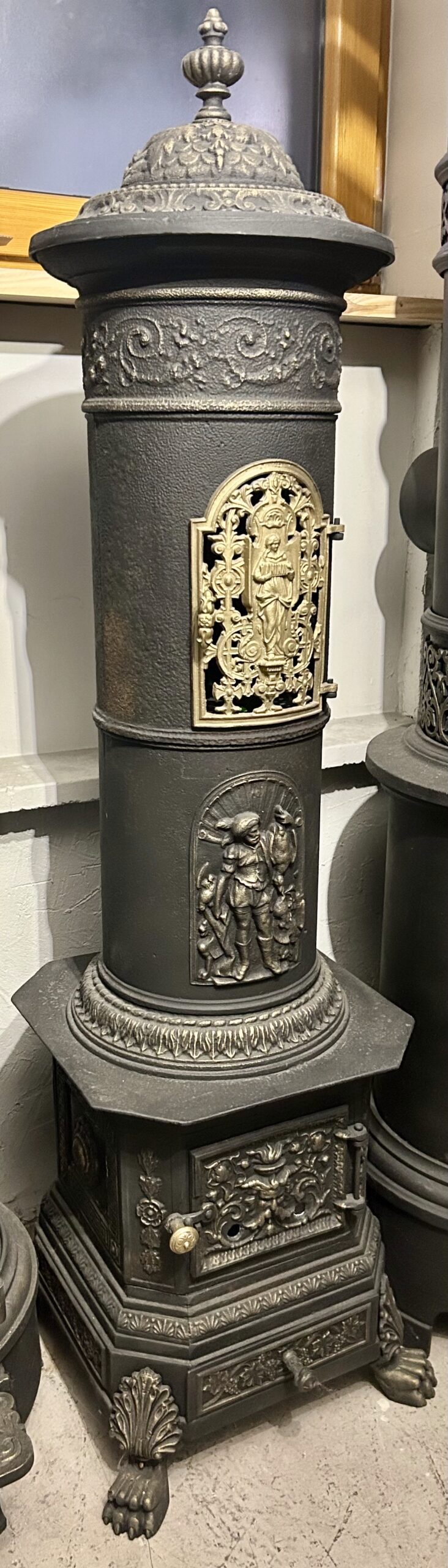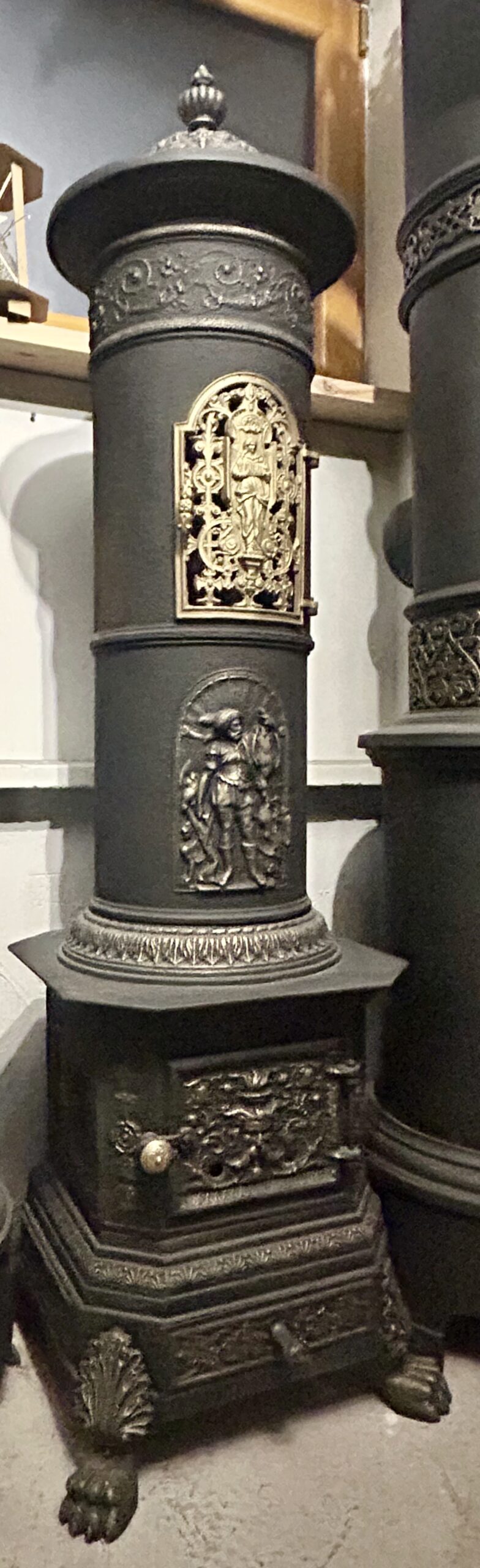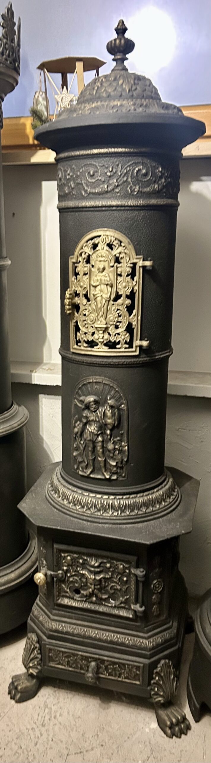 Wyjątkowy, zabytkowy piec żeliwny firmy ANINA pochodzący z Austrii. Piec zachwyca bogatym zdobieniem oraz niezwykłą konstrukcją, w której dolna część jest kwadratowa, a górna owalna. Posiada charakterystyczne nogi w kształcie łap lwa, które dodają mu majestatycznego wyglądu.
