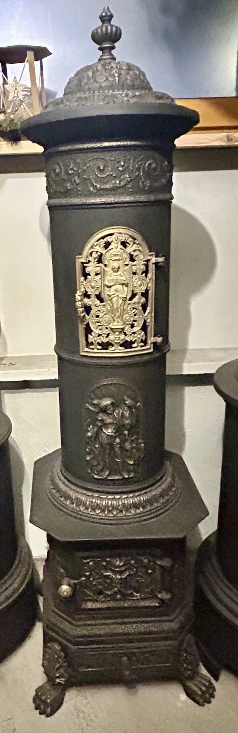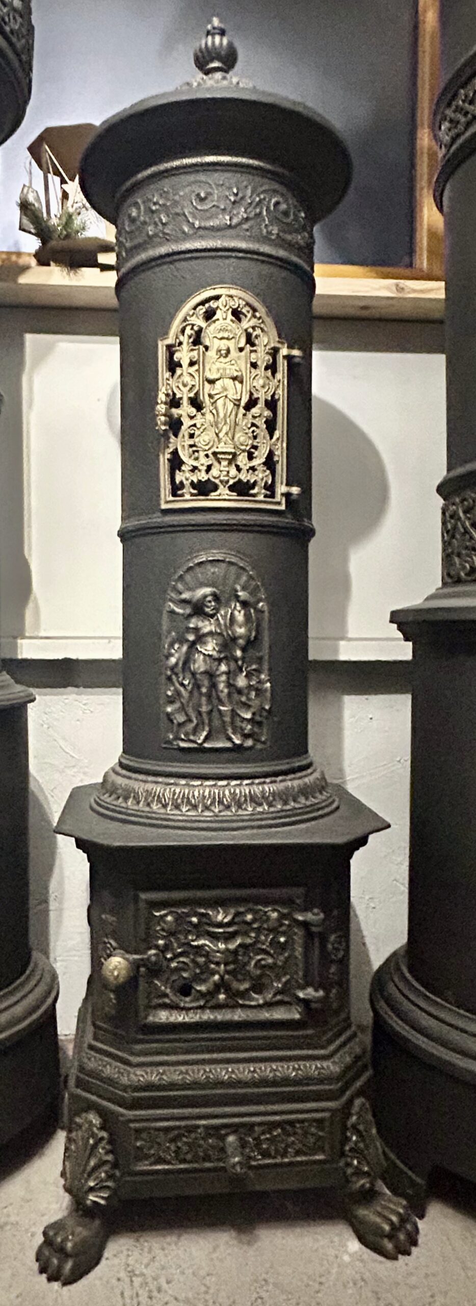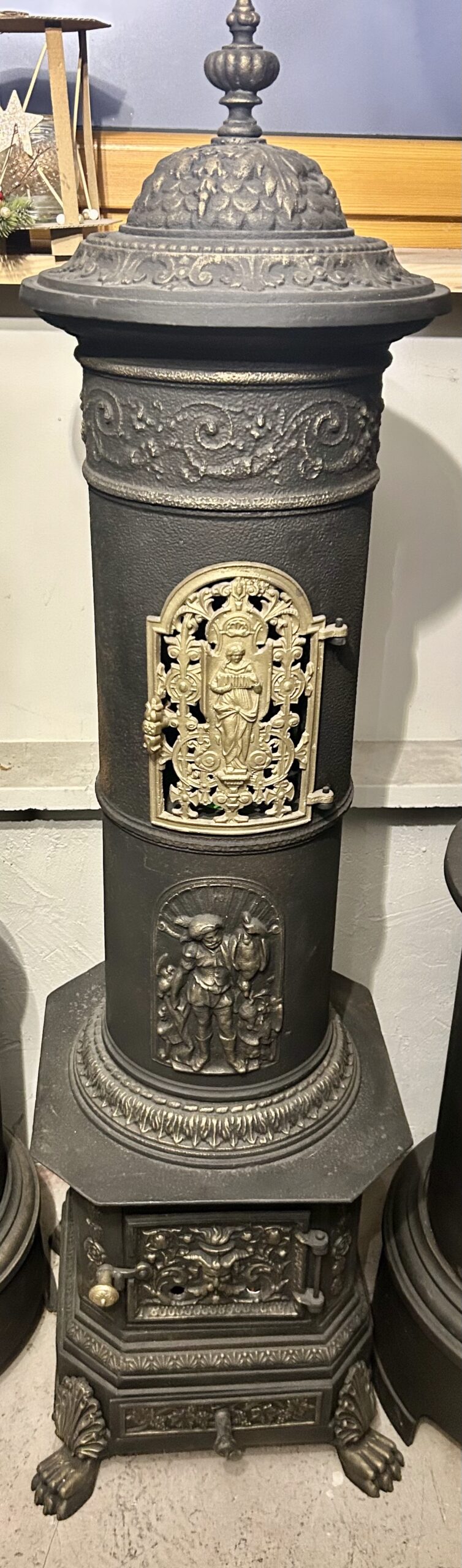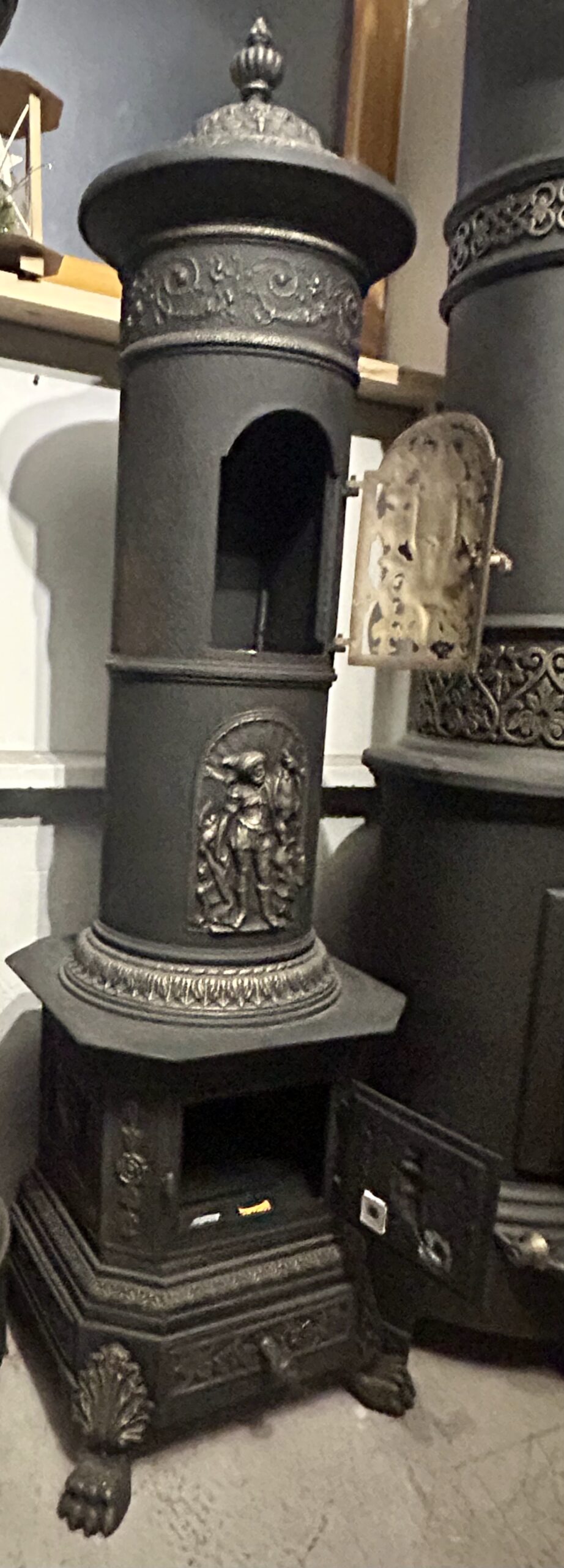 Wyjątkowy, zabytkowy piec żeliwny firmy ANINA pochodzący z Austrii. Piec zachwyca bogatym zdobieniem oraz niezwykłą konstrukcją, w której dolna część jest kwadratowa, a górna owalna. Posiada charakterystyczne nogi w kształcie łap lwa, które dodają mu majestatycznego wyglądu.