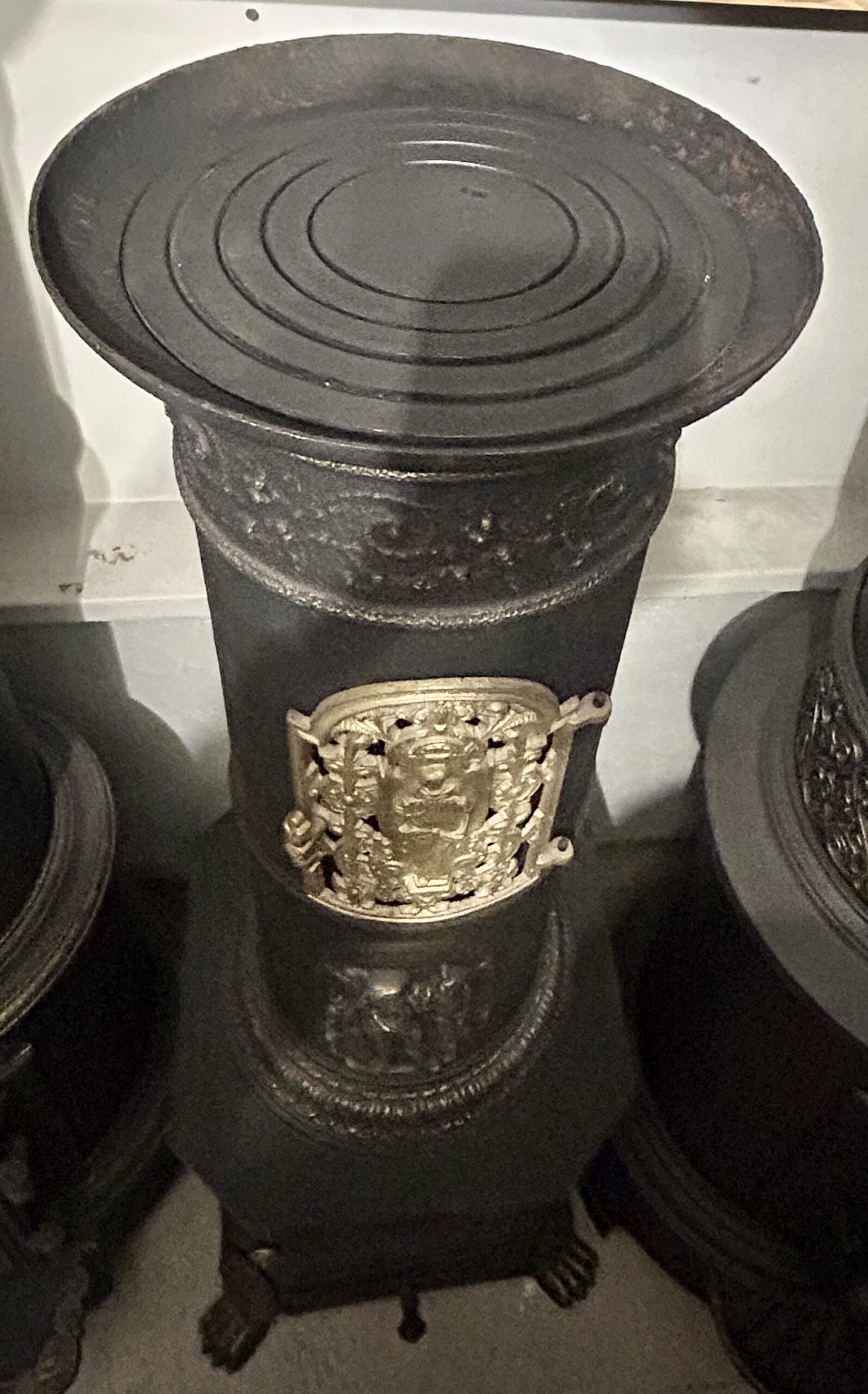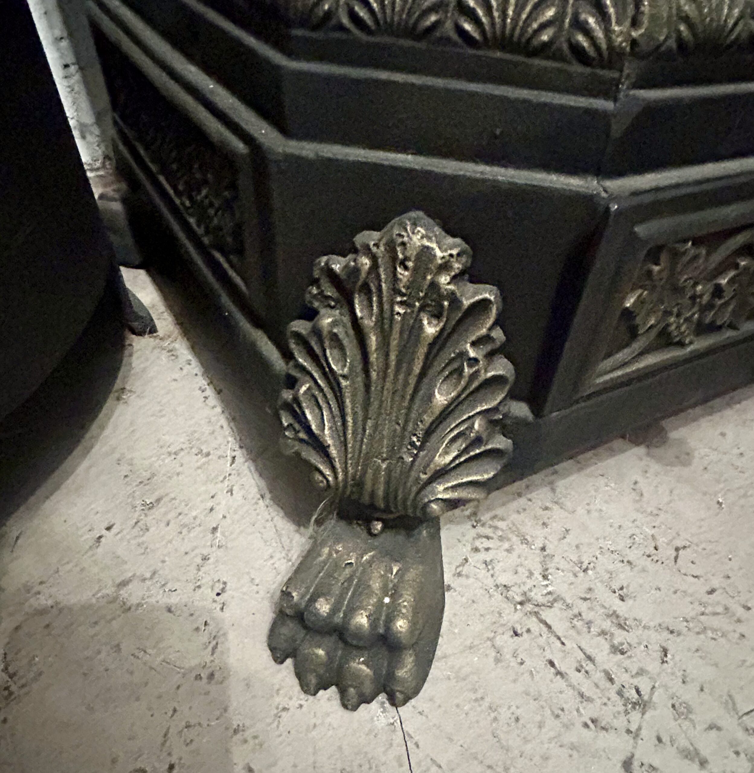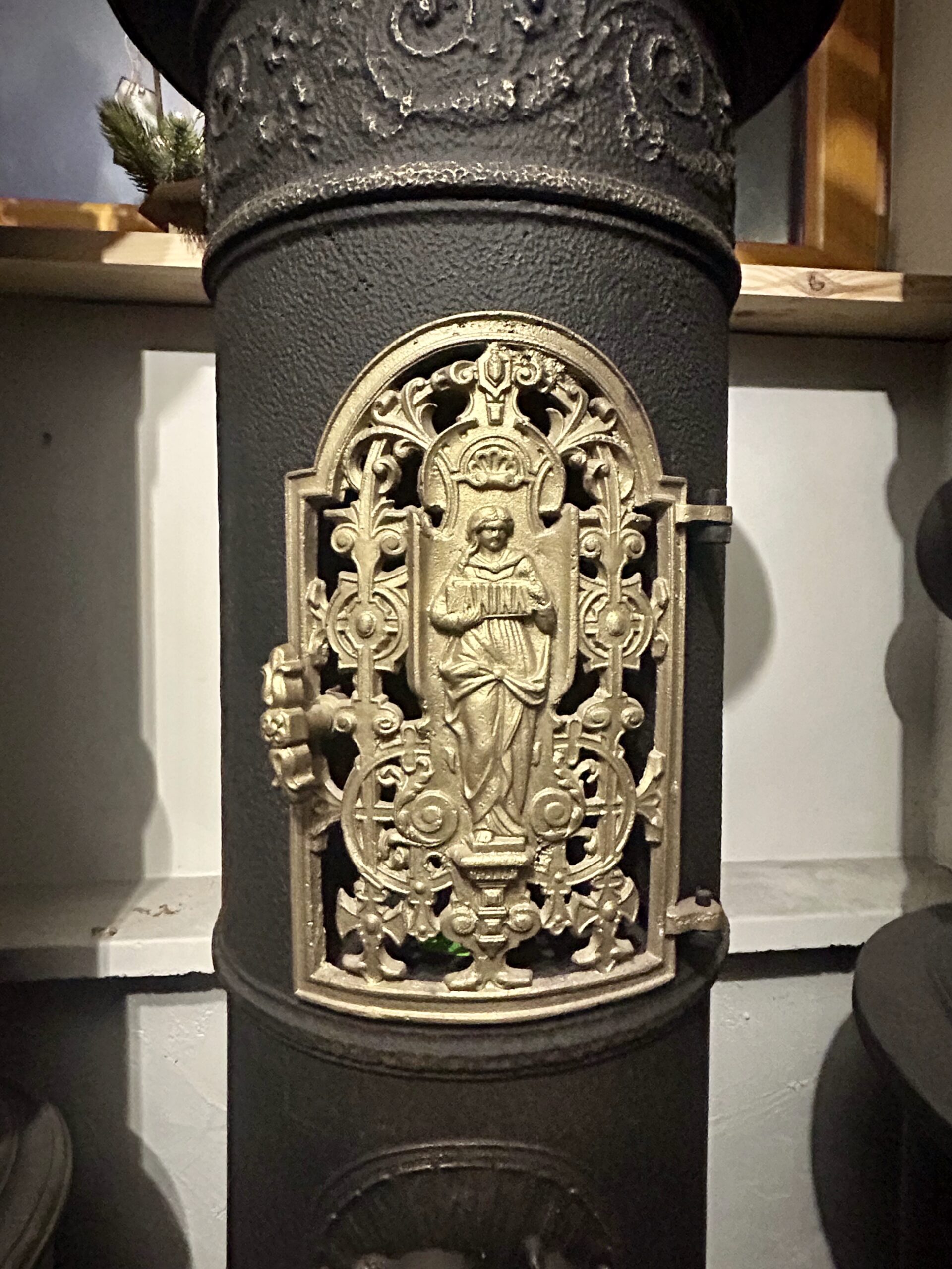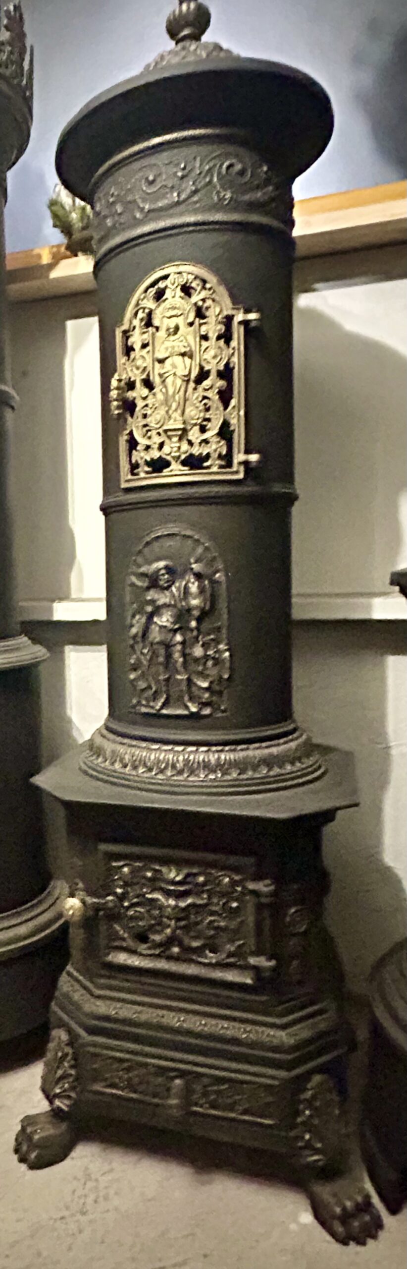 Wyjątkowy, zabytkowy piec żeliwny firmy ANINA pochodzący z Austrii. Piec zachwyca bogatym zdobieniem oraz niezwykłą konstrukcją, w której dolna część jest kwadratowa, a górna owalna. Posiada charakterystyczne nogi w kształcie łap lwa, które dodają mu majestatycznego wyglądu.