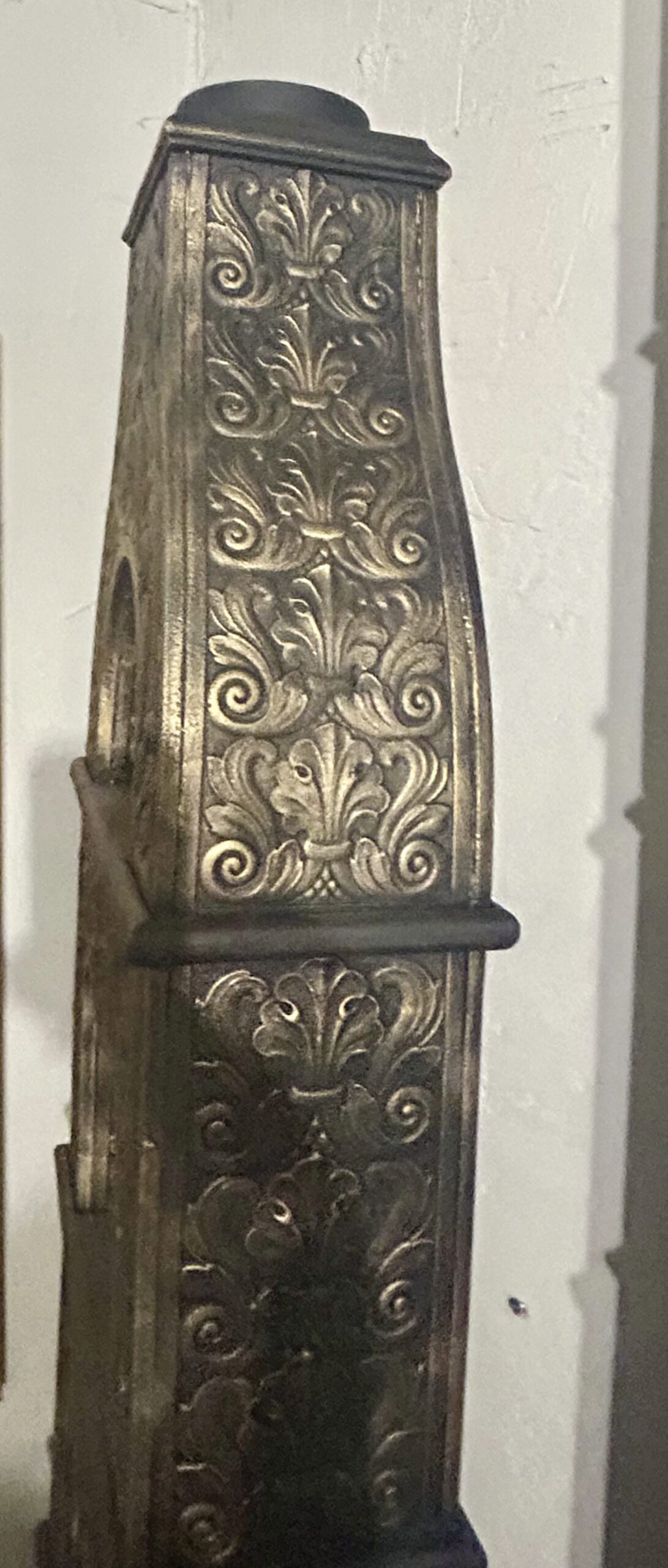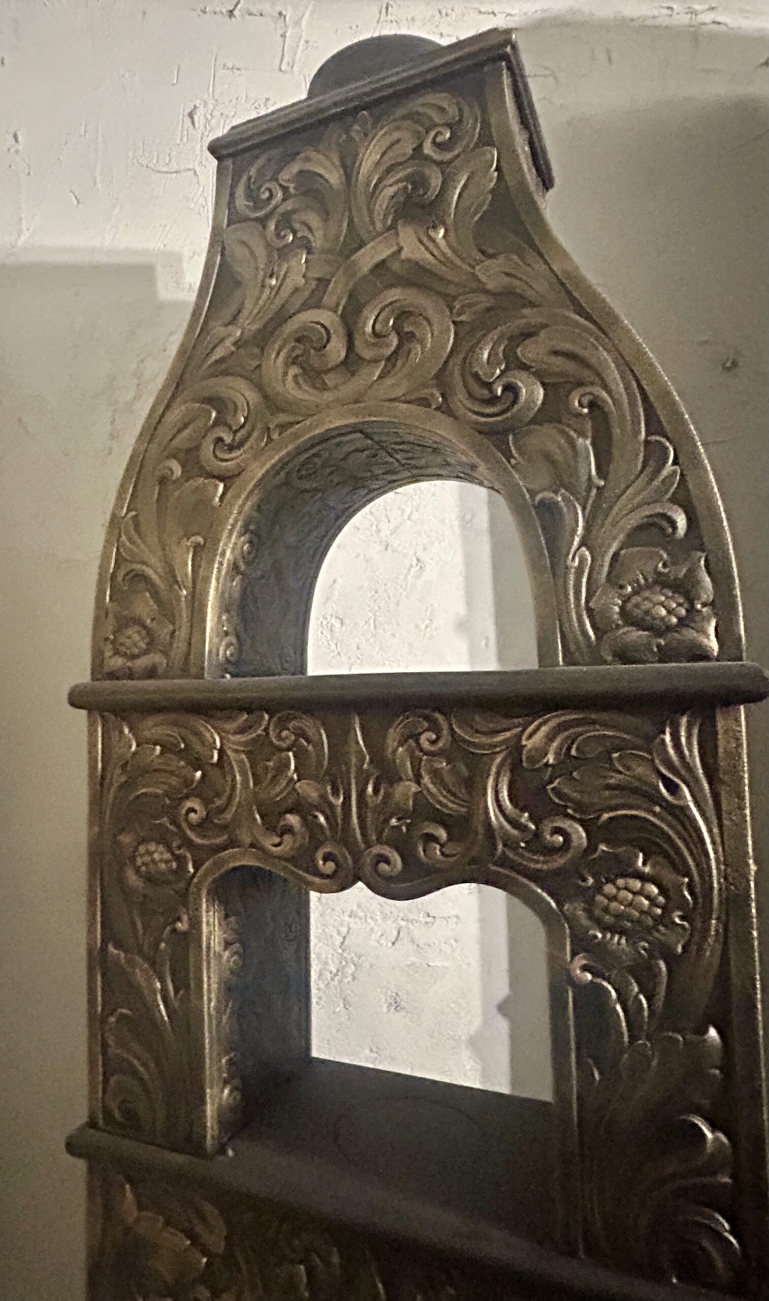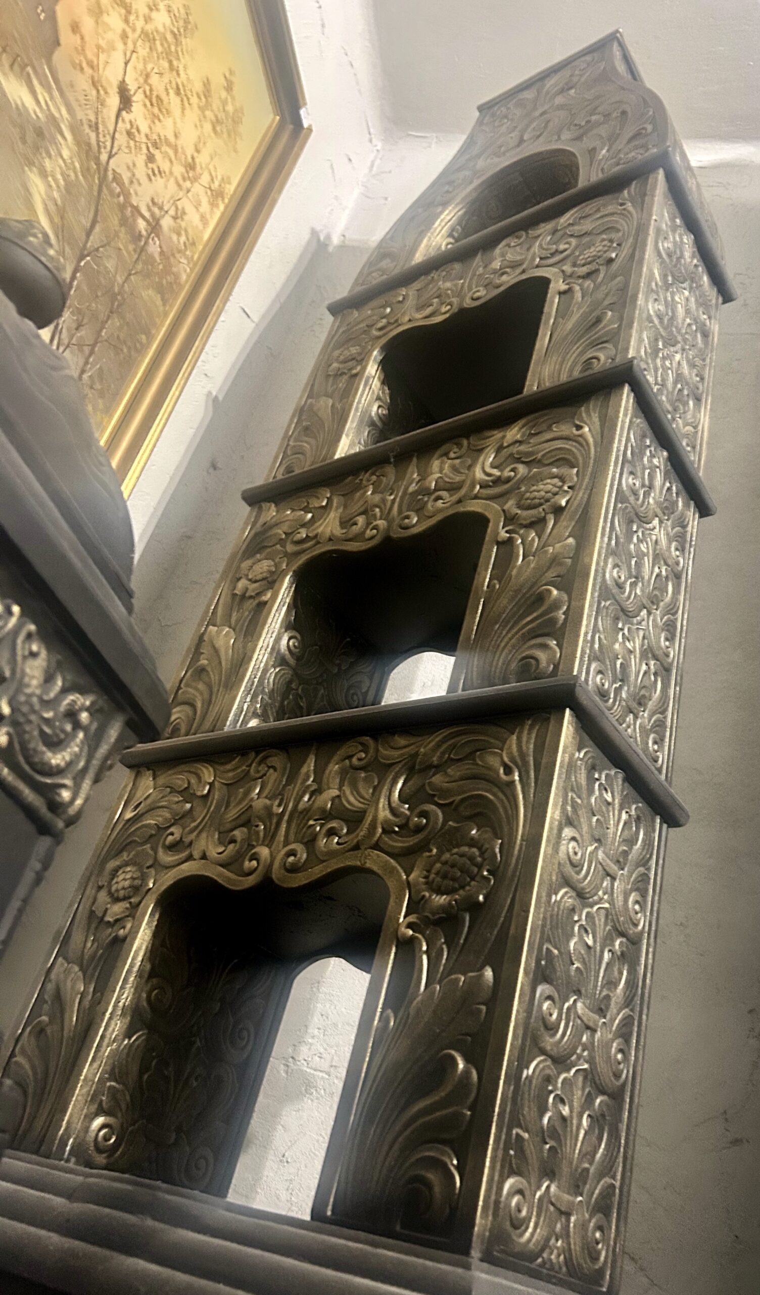 Piec został wypiaskowany, trzykrotnie pomalowany czarną farbą żaroodporną oraz bogato ozdobiony złotą farbą żaroodporną, co nadaje mu wyjątkowy charakter.