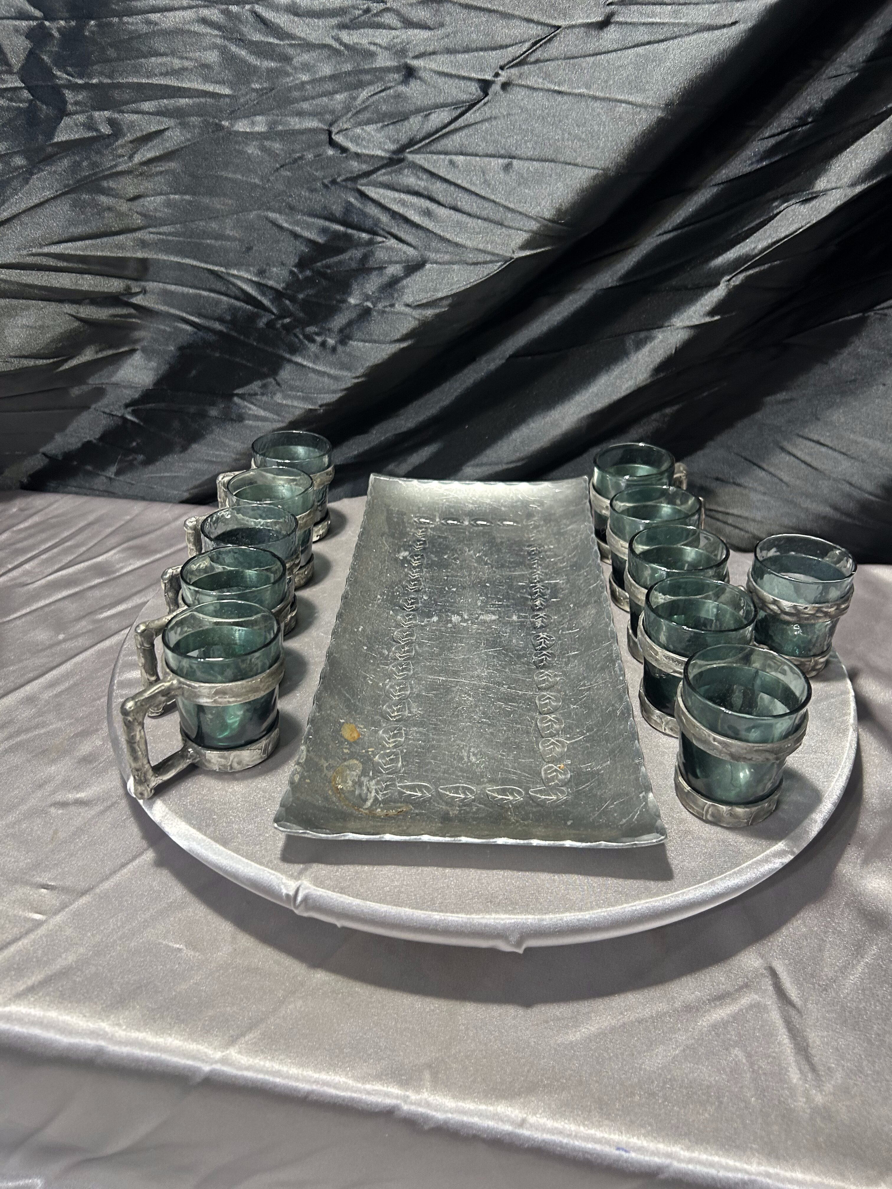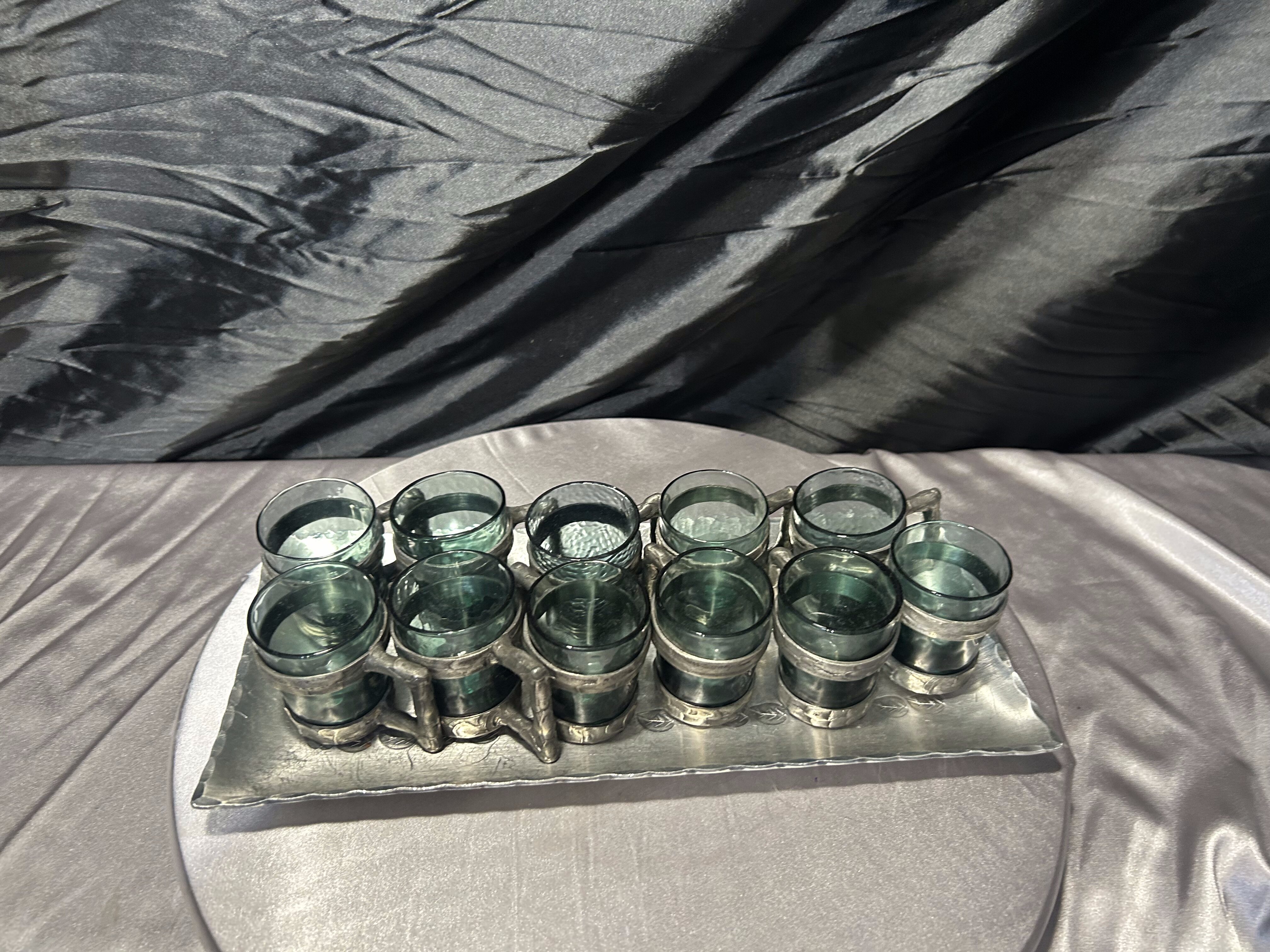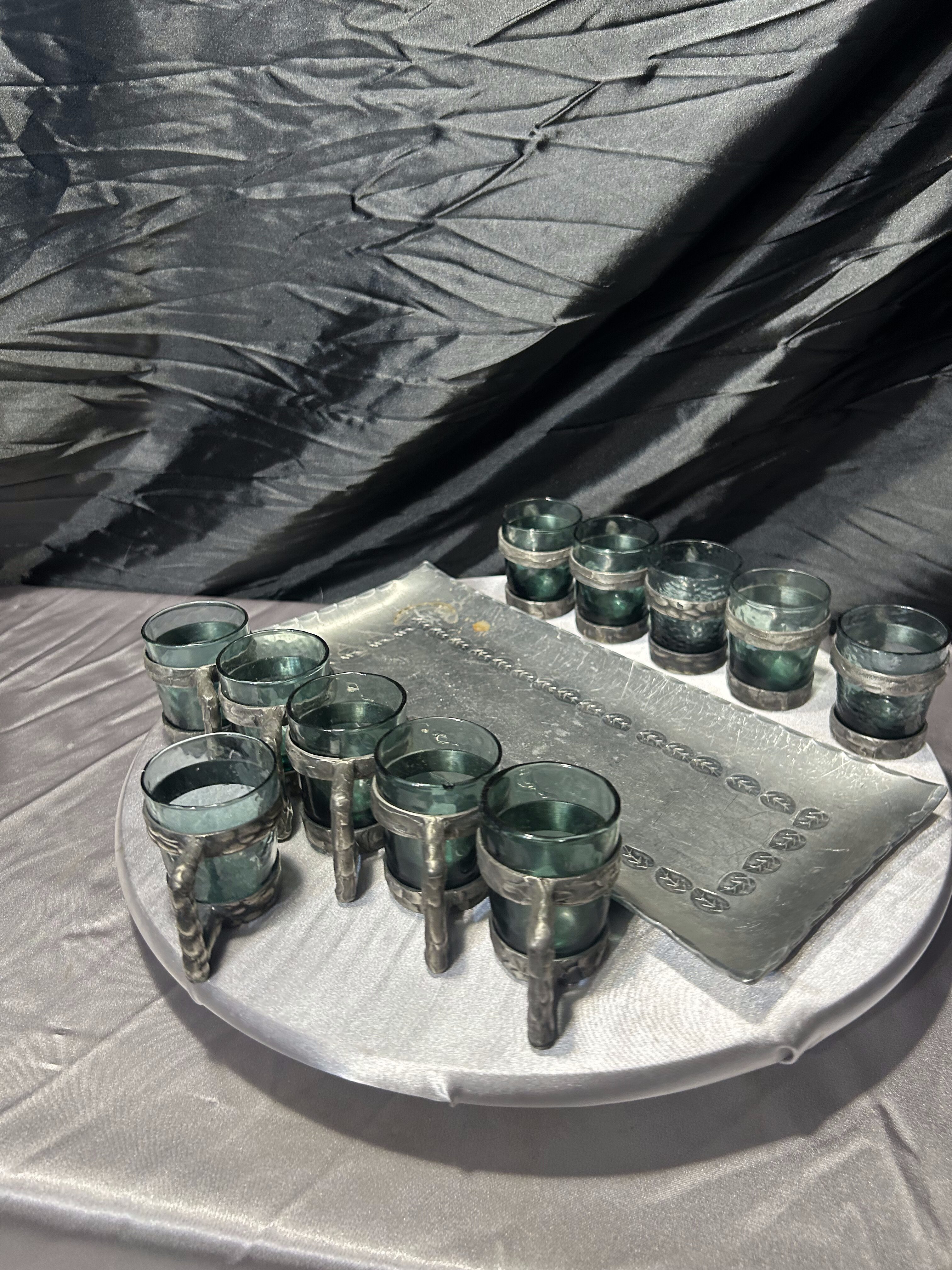 Zestaw 10 kieliszków w cynowych oprawach z tacą – sygnowany komplet